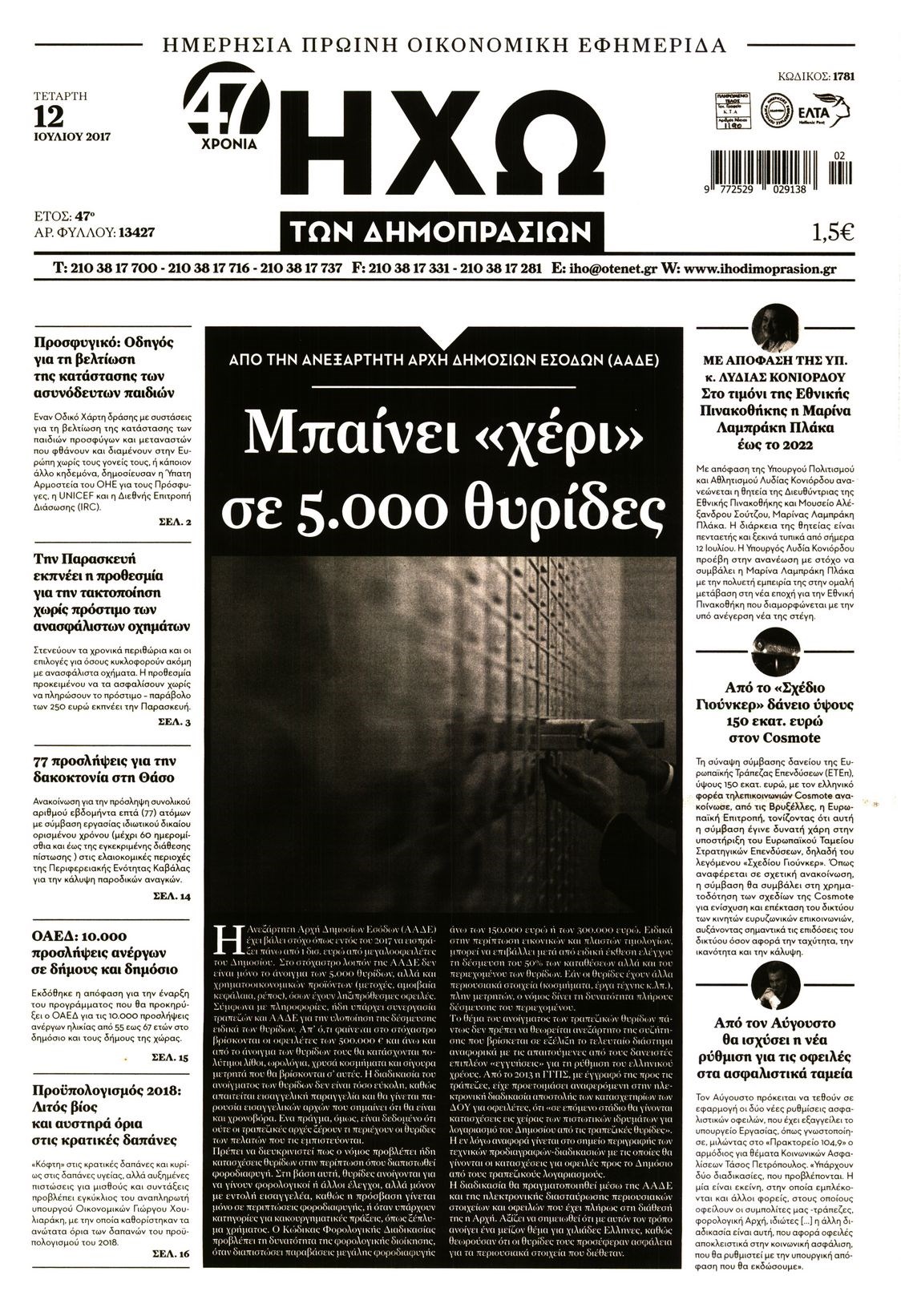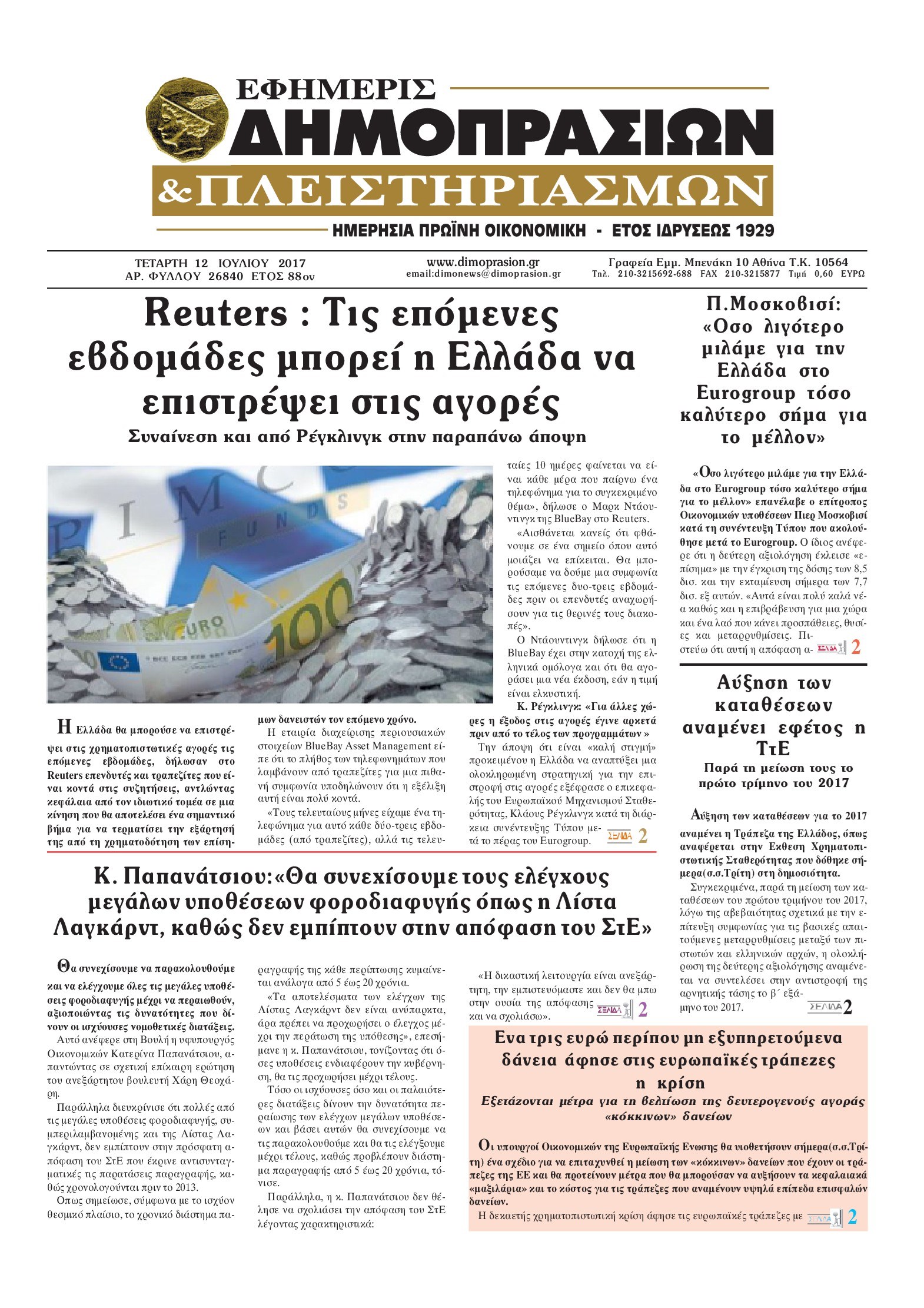 Οι οικονομικές εφημερίδες 12/7/2017 Enikos Newsroom 07:14, Τετάρτη 12 Ιουλίου 2017 Media Διαβάστε τα σημερινά πρωτοσέλιδα των οικονομικών εφημερίδων: ΟΙΚΟΝΟΜΙΚΕΣ ΕΦΗΜΕΡΙΔΕΣ ΠΡΩΤΟΣΕΛΙΔΑ Μοιράσου το: σχολίασε κι εσύ (0 σχόλια) Ακολουθήστε το enikos.gr στο Google News και μάθετε πρώτοι όλες τις ειδήσεις Δείτε όλες τις τελευταίες ειδήσεις από την Ελλάδα και τον Κόσμο στο enikos.gr Ειδήσεις Ροή Ειδήσεων 17 λεπτά πριν Τσιάρας προς αγρότες: Τα μπλόκα και τα πείσματα δεν ωφελούν – Οι λύσεις περνούν μέσα από τον διάλογο 1 ώρα πριν Αρχεία Έπσταϊν: Οι συγκλονιστικές φωτογραφίες – Ο Μάικλ Τζάκσον, ο Μικ Τζάγκερ και ο Κέβιν Σπέισι ανάμεσα στους διάσημους που απεικονίζονται 2 ώρες πριν Νέες ταυτότητες: Μεγάλη αναμονή για ραντεβού στην Αττική – Τέλος τα ταξίδια εκτός Ελλάδος από τον Αύγουστο για όσους δεν έχουν αλλάξει 2 ώρες πριν Ινδία: Επτά ελέφαντες σκοτώθηκαν κατά τη σύγκρουση επιβατικού τρένου με κοπάδι 3 ώρες πριν Συνελήφθη οδηγός μηχανής που έτρεχε με 161 χλμ στη Συγγρού – Τον έπιασε το ραντάρ της Τροχαίας 3 ώρες πριν Μία νέα «χρυσή» περίοδος αρχίζει για 3 ζώδια από σήμερα – «Μία αναπάντεχη ευκαιρία οδηγεί στην επιτυχία» 4 ώρες πριν Αγχώνεται για το χριστουγεννιάτικο δώρο που πήρε στην πλούσια σύντροφό του – «Φοβάμαι πως θα το βρει φθηνιάρικο, φοράει βραχιόλια Cartier» 2 ώρες πριν Διαιτολόγος αποκαλύπτει 9 πρωινές συνήθειες που «λιώνουν» το κοιλιακό λίπος – «Υποστηρίζουν την υγιεινή απώλεια βάρους» 3 ώρες πριν Οι 7 φράσεις που δεν λένε ποτέ οι συναισθηματικά έξυπνοι άνθρωποι κατά τη διάρκεια ενός καβγά 8 λεπτά πριν «Μεγάλη Χίμαιρα»: Πότε κάνει πρεμιέρα η σειρά 16 λεπτά πριν Καλλιθέα: Έφοδος του «ελληνικού FBI» σε δύο καταστήματα stripshow – 5 συλλήψεις – Βίντεο 17 λεπτά πριν Τσιάρας προς αγρότες: Τα μπλόκα και τα πείσματα δεν ωφελούν – Οι λύσεις περνούν μέσα από τον διάλογο 23 λεπτά πριν Μεσσηνία: Μαχαιριές έπειτα από καβγά για οικονομικές διαφορές στον Πολύλοφο – Συνελήφθη 40χρονος 31 λεπτά πριν Αμαλιάδα: Συνελήφθη ο «εγκέφαλος» της κινηματογραφικής διάρρηξης κοσμηματοπωλείου ENIKOS NETWORK Γήρανση του εγκεφάλου: Νευροεπιστήμονες ανακάλυψαν τη 10λεπτη δραστηριότητα που μπορεί να τη σταματήσει Είστε μόνιμα απρόσεκτοι; 3 σημάδια που δείχνουν ότι μπορεί να είναι σύμπτωμα πάθησης Χειμερινές εκπτώσεις 2026: Πρεμιέρα στις 12 Ιανουαρίου – Πόσο θα διαρκέσουν και τι πρέπει να γνωρίζουν οι καταναλωτές Χρήστος Δήμας: Στα 2,5 εκατ. ευρώ την ημέρα το κόστος από το άνοιγμα των διοδίων από τους αγρότες – Θα αξιώσουν αποζημίωση ... Χαρτογραφώντας το «σημείο χωρίς επιστροφή»: Για πρώτη φορά αποκαλύπτεται με λεπτομέρεια το ακανθώδες όριο της ατμόσφαιρας τ... Η Google καταργεί τη λειτουργία «dark web report» – Πώς θα μπορούν οι χρήστες να διαγράφουν τα δεδομένα τους περισσότερα 12:53 , Σάββατο 20 Δεκεμβρίου 2025 Να μ’ αγαπάς: Το παρελθόν έρχεται στο φως – Καταιγιστικές εξελίξεις στα τελευταία επεισόδια του 2025 Ο Άγγελος αποκαλύπτεται, η Φωτεινή ανησυχεί για τον Λευτέρη και η Ζωή έρχεται αντιμέτωπη με το... 11:41 , Σάββατο 20 Δεκεμβρίου 2025 «Η αγάπη δεν χάνεται ποτέ»: Η μικρού μήκους ταινία κινουμένων σχεδίων που θέτει ερωτήματα για τη ζωή και τον θάνατο Ο θάνατος είναι ένα από τα πιο σκληρά θέματα που καλείται να διαχειριστεί κάποιος στη διάρκεια... 09:30 , Σάββατο 20 Δεκεμβρίου 2025 «Porto Leone: Στη γειτονιά με τα κόκκινα φανάρια» – Ο Χρόνης αποκαλύπτει στην Αλεξάνδρα το μυστικό για το παιδί της Λένας Η μεγάλη δραματική σειρά του Apha «Porto Leone: Στη
