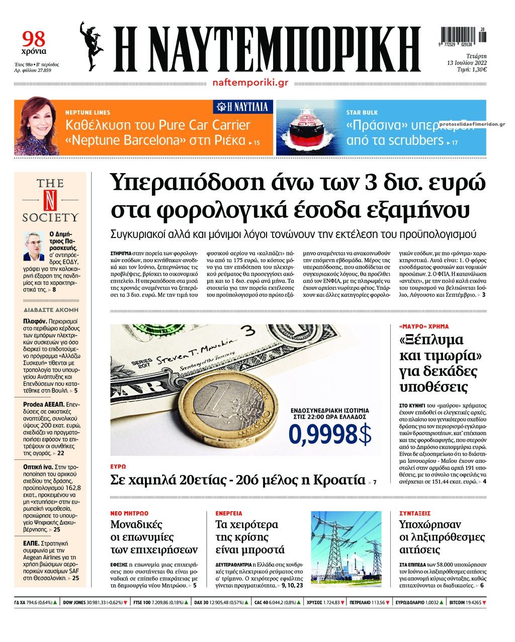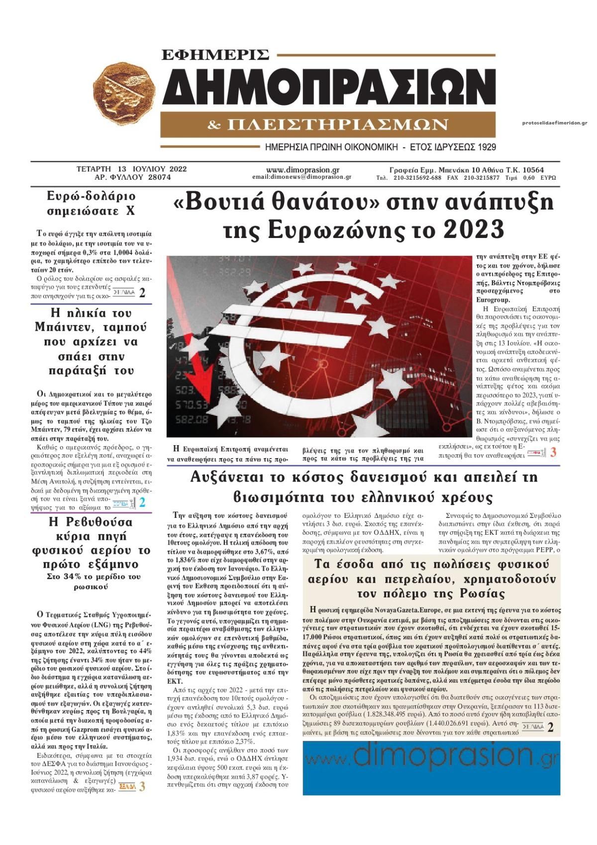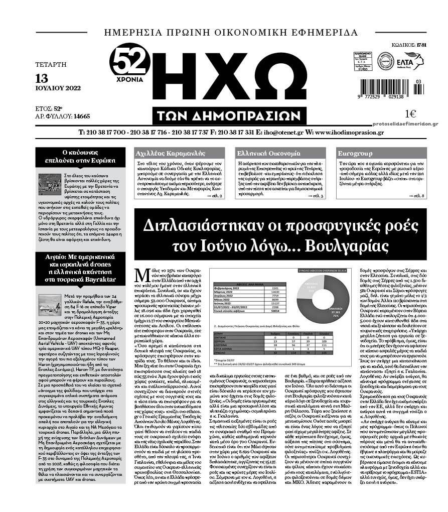 Οι οικονομικές εφημερίδες 13/7/2022 Σταύρος Ιωακείμ 06:46, Τετάρτη 13 Ιουλίου 2022 Media Διαβάστε τα πρωτοσέλιδα από τις οικονομικές εφημερίδες, σήμερα 13/07/2022. ΕΦΗΜΕΡΙΔΕΣ ΟΙΚΟΝΟΜΙΚΕΣ ΕΦΗΜΕΡΙΔΕΣ ΠΡΩΤΟΣΕΛΙΔΑ Μοιράσου το: Οι αθλητικές εφημερίδες 13/7/2022 Οι πολιτικές εφημερίδες 13/7/2022 Νέες φωτογραφίες από τη φωτιά στις εγκαταστάσεις του Realfm στο Μαρούσι σχολίασε κι εσύ (0 σχόλια) Ακολουθήστε το enikos.gr στο Google News και μάθετε πρώτοι όλες τις ειδήσεις Δείτε όλες τις τελευταίες ειδήσεις από την Ελλάδα και τον Κόσμο στο enikos.gr Ειδήσεις Ροή Ειδήσεων 1 ώρα πριν Πούτιν: «Ανοησίες» και «υστερίες» οι ισχυρισμοί της Ευρώπης για πιθανή σύγκρουση με τη Ρωσία – «Κάνουν πλύση εγκεφάλου» 5 ώρες πριν Έρευνα MRB: Η πρόθεση ψήφου και τα σημαντικότερα προβλήματα – Οι «λέξεις» που εκφράζουν τους πολίτες 2 ώρες πριν Αμοργός: «Θα προσπαθήσω να το κάνω κάθε μέρα» – Ποιος είναι ο αγρότης που έστησε μόνος του το πρώτο μπλόκο στο νησί 10 λεπτά πριν Τραγωδία στην Αλεξανδρούπολη: Παιδάκι 3 ετών μεταφέρθηκε νεκρό από τη μητέρα του στο νοσοκομείο 50 λεπτά πριν Συνάντηση Μητσοτάκη με την Κ.Ο. της ΝΔ: Οι αφίξεις των βουλευτών, τα γλυκά και τα «πηγαδάκια» 5 ώρες πριν Τα 4 ζώδια που ξαναβρίσκουν τον εαυτό τους – «Μπαίνετε επιτέλους στην ουσία των πραγμάτων» 6 ώρες πριν 20 χρόνια τα Χριστούγεννα ξεκινούν στα Public με μεγάλη ποικιλία σε δώρα! 4 ώρες πριν «Δεν είχα κλάψει από τότε που διαγνώστηκα με καρκίνο, ώσπου ένα τηλεφώνημα με έκανε να λυγίσω» – Η συγκλονιστική εξομολόγηση ενός άνδρα 3 ώρες πριν Τα 7 σπάνια χαρακτηριστικά που κάνουν κάποιους ανθρώπους ακαταμάχητους 3 λεπτά πριν Φον ντερ Λάιεν: Επιστολή για το μεταναστευτικό ενόψει της Συνόδου Κορυφής – «Υπήρξε πρόοδος, αλλά έχουμε σημαντική δουλειά μπροστά μας» 8 λεπτά πριν Χριστουγεννιάτικη γιορτή με τον Σάκη Ρούβα στον ξενώνα «Μαριάννα Β. Βαρδινογιάννη-ΕΛΠΙΔΑ» 10 λεπτά πριν Τραγωδία στην Αλεξανδρούπολη: Παιδάκι 3 ετών μεταφέρθηκε νεκρό από τη μητέρα του στο νοσοκομείο 10 λεπτά πριν Βουλή: Άρση της ασυλίας της Ζωής Κωνσταντοπούλου για μήνυση συκοφαντικής δυσφήμισης 16 λεπτά πριν Ο σπάνιος σεισμός που έλυσε τα χέρια των επιστημόνων – Αποκάλυψε ακριβώς όσα αναζητούσαν ENIKOS NETWORK 5 πράγματα που αποφεύγει γαστρεντερολόγος για να μειώσει τον κίνδυνο καρκίνου του εντέρου Ανησυχητική αύξηση της υπέρτασης στα παιδιά – Πώς θα τα προστατέψουμε; ΕΛΕΤΑΕΝ: Πόσα χρήματα θα δοθούν σε δήμους και νοικοκυριά από τις ΑΠΕ «IRIS Παντού»: Στην κορυφή της Ευρώπης η Ελλάδα με 120 εκατ. ευρώ συναλλαγές το 2025 – Η σύγκριση με τις άλλες χώρες της Ευ... Σύγχρονος Νοστράδαμος: Προειδοποιεί για «μεγάλο γεγονός» τους επόμενους μήνες που θα συγκλονίσει τη Βρετανία και τον κόσμο Τεστ παρατηρητικότητας: Μπορείτε να βρείτε τις 3 διαφορές στις εικόνες με έναν πιγκουίνο σε 14 δευτερόλεπτα περισσότερα 12:35 , Τετάρτη 17 Δεκεμβρίου 2025 Μίρκα Παπακωνσταντίνου: «Δεν ήμουν αισιόδοξη για τα νούμερα – Είμαι ρεαλίστρια» Στα γυρίσματα του εορταστικού επεισοδίου της αγαπημένης σειράς “Το Σόι Σου”, βρέθηκε η κάμερα ... 12:12 , Τετάρτη 17 Δεκεμβρίου 2025 Ακούστε την εκπομπή του Νίκου Χατζηνικολάου 17/12/2025 Ακούστε την εκπομπή του Νίκου Χατζηνικολάου στον ραδιοφωνικό σταθμό RealFm 97,8, την Τετάρτη 1... 11:35 , Τετάρτη 17 Δεκεμβρίου 2025 Home Alone: Το σπίτι της ταινίας θα ανακαινιστεί – Επιστροφή στην αισθητική της δεκαετίας του ’90 Οι νέοι ιδιοκτήτες του πραγματικού σπιτιού που παρουσιάζεται στην κλασική ταινία του 1990 «Hom... 11:25 ,