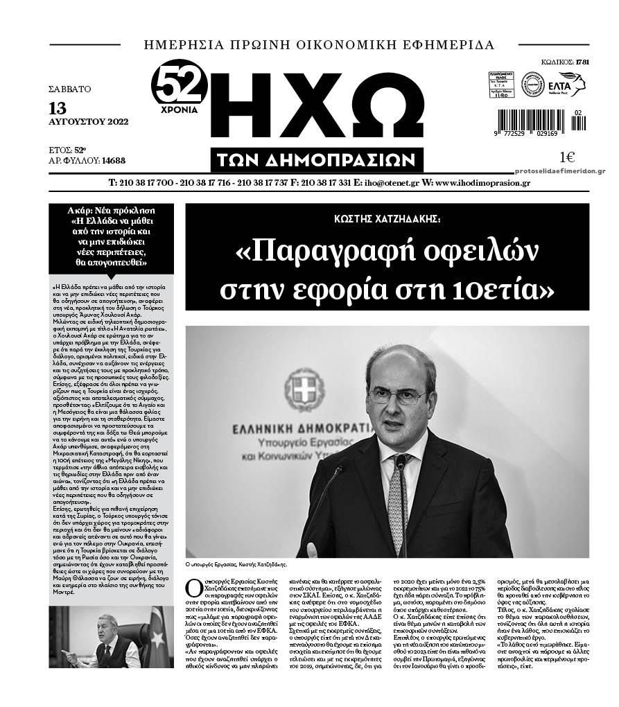 Οι οικονομικές εφημερίδες 13/8/2022 Σταύρος Ιωακείμ 07:23, Σάββατο 13 Αυγούστου 2022 Media Διαβάστε τα πρωτοσέλιδα από τις οικονομικές εφημερίδες, σήμερα 13/08/2022. ΕΦΗΜΕΡΙΔΕΣ ΟΙΚΟΝΟΜΙΚΕΣ ΕΦΗΜΕΡΙΔΕΣ ΠΡΩΤΟΣΕΛΙΔΑ Μοιράσου το: ΗΠΑ: Ο Τζο Μπάιντεν θα υπογράψει το νομοσχέδιο για το κλίμα και την υγεία την επόμενη εβδομάδα Σαν σήμερα 13 Αυγούστου: Τα σημαντικότερα γεγονότα της ημέρας ΔΕΔΔΗΕ: Σε ποιες περιοχές της Αττικής θα γίνουν διακοπές ρεύματος σήμερα (13/8) σχολίασε κι εσύ (0 σχόλια) Ακολουθήστε το enikos.gr στο Google News και μάθετε πρώτοι όλες τις ειδήσεις Δείτε όλες τις τελευταίες ειδήσεις από την Ελλάδα και τον Κόσμο στο enikos.gr Ειδήσεις Ροή Ειδήσεων 3 ώρες πριν Αγρότες: Πολύωροι αποκλεισμοί στα τελωνεία Προμαχώνα, Εξοχής, Ευζώνων και Νίκης – Κλείνουν τον κόμβο Φιλώτα οι παραγωγοί στη Δυτική Μακεδονία 2 ώρες πριν Νίκος Παππάς: Ζητώ συγγνώμη για αυτό το επεισόδιο – Δεν τον γρονθοκόπησα 1 ώρα πριν Πούτιν: Η Ουκρανία δεν είναι έτοιμη για ειρηνευτικές συνομιλίες – ο ρωσικός στρατός προελαύνει σε όλα τα μέτωπα 1 ώρα πριν Κρήτη: Στο Ρέθυμνο μεταφέρονται οι εκατοντάδες μετανάστες που διασώθηκαν ανοιχτά της Γαύδου 2 ώρες πριν Τρομακτικό βίντεο: Η στιγμή της έκρηξης στο τζετ που μετέφερε τον οδηγό του NASCAR, Γκρεγκ Μπιφλ και την οικογένειά του 3 ώρες πριν Αλλαγή σελίδας για 3 ζώδια – «Μία δύσκολη περίοδος φτάνει στο τέλος της» 2 ημέρες πριν 20 χρόνια τα Χριστούγεννα ξεκινούν στα Public με μεγάλη ποικιλία σε δώρα! 2 ώρες πριν Γεμάτος νεροχύτης; 5 σοβαρές ευθύνες που «φοβίζουν» όσους αφήνουν άπλυτα πιάτα 1 ώρα πριν Ειδικός μοιράζεται 6 κόλπα για να διατηρείστε σε φόρμα με πάνω από 40 ώρες εργασίας την εβδομάδα: «Προπονηθείτε πριν από τη δουλειά, όχι μετά» 5 λεπτά πριν Πούτιν: Η χρήση των ρωσικών παγωμένων περιουσιακών στοιχείων για τη χρηματοδότηση της Ουκρανίας είναι ληστεία – Θα είχε σοβαρές επιπτώσεις” 10 λεπτά πριν ΑΑΔΕ: QR Code και Barcode για εύκολες και γρήγορες πληρωμές οφειλών 15 λεπτά πριν Νέα Φιλαδέλφεια: Βίντεο ντοκουμέντο από το θανατηφόρο τροχαίο 20 λεπτά πριν Παπαθανάσης: «Η Ελλάδα αλλάζει με μεταρρυθμίσεις και έργα – Το 2026 χρονιά μεγάλης ανάπτυξης, νέων θέσεων εργασίας, καλύτερων αμοιβών» 26 λεπτά πριν Αγρότες: Παραμένουν στα μπλόκα και ενισχύουν τις δράσεις τους σε Ημαθία, Πέλλα, Πιερία και Καβάλα ENIKOS NETWORK Κίνδυνος παραπλάνησης από διαφημίσεις οδοντικών εμφυτευμάτων Καρκίνος του πνεύμονα: Έως 8.000 ζωές μπορούν να σωθούν με την έγκαιρη διάγνωση Αγορά πολυτελών κατοικιών: Αυτές είναι οι προτεραιότητες των αγοραστών – Σε ποιες περιοχές στρέφονται και τι επιλέγουν ΕΥΔΑΠ: Στο τραπέζι αλλαγές στους λογαριασμούς του νερού – Τι θα ισχύσει για ευάλωτα νοικοκυριά και επιχειρήσεις Χαρτογραφώντας το «σημείο χωρίς επιστροφή»: Για πρώτη φορά αποκαλύπτεται με λεπτομέρεια το ακανθώδες όριο της ατμόσφαιρας τ... Η Google καταργεί τη λειτουργία «dark web report» – Πώς θα μπορούν οι χρήστες να διαγράφουν τα δεδομένα τους περισσότερα 08:00 , Παρασκευή 19 Δεκεμβρίου 2025 Την Κυριακή με τη Realnews: Δωροεπιταγή 10€ Δωροεπιταγή αξίας 10€ για αγορές άνω των 60€ από τα πολυκαταστήματα FactoryOutlet H προσφορά ι... 05:48 , Παρασκευή 19 Δεκεμβρίου 2025 Οι οικονομικές εφημερίδες 19/12/2025 Διαβάστε τα πρωτοσέλιδα από τις οικονομικές εφημερίδες, σήμερα 19/12/2025. 05:43 , Παρασκευή 19 Δεκεμβρίου 2025 Οι αθλητικές εφημερίδες 19/12/2025 Διαβάστε τα πρωτοσέλιδα από τις αθλητικές εφημερίδες, σήμερα 19/12/2025. 05:38 , Παρασκευή 19 Δεκεμβρίου 2025 Οι πολιτικές εφημε