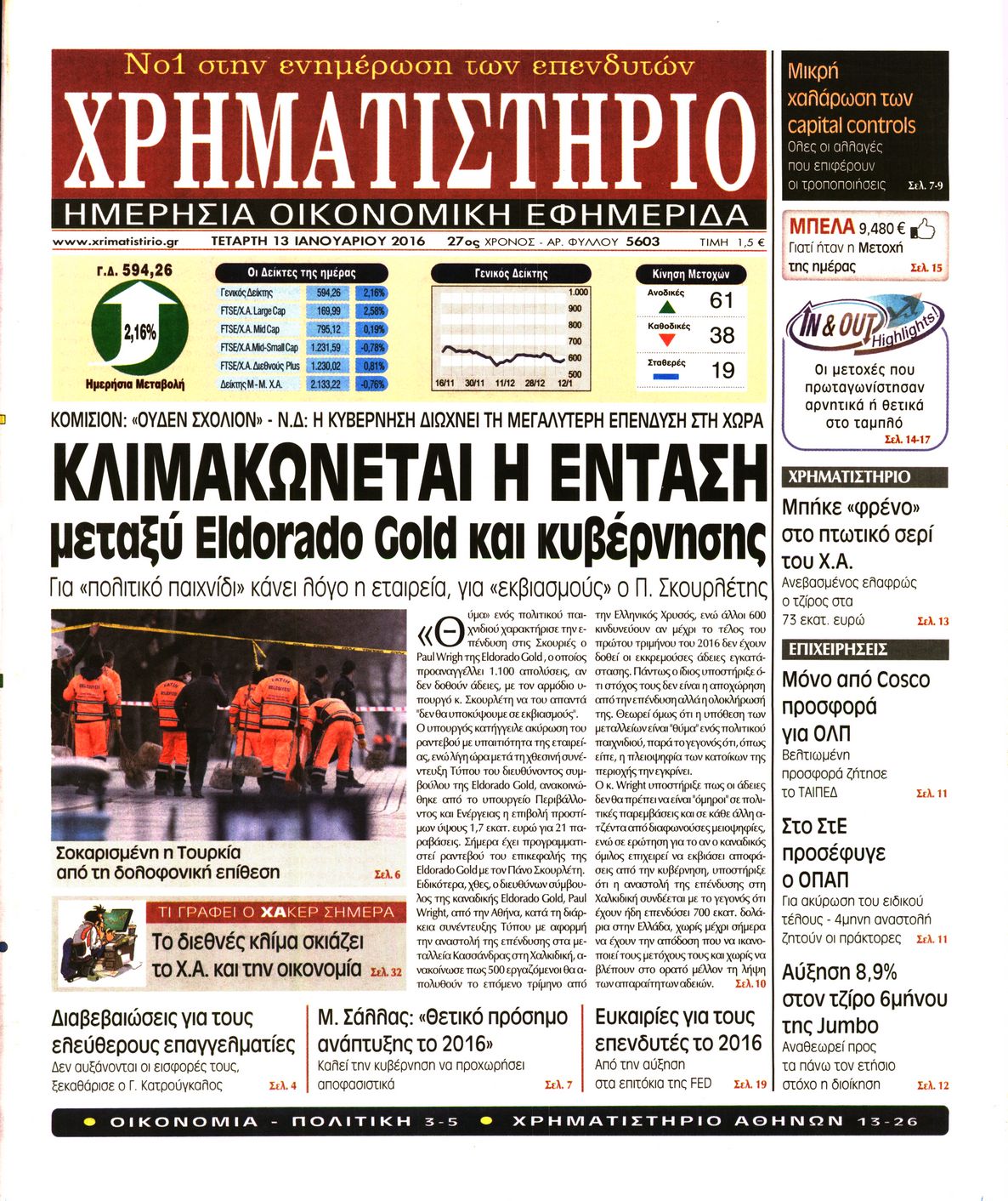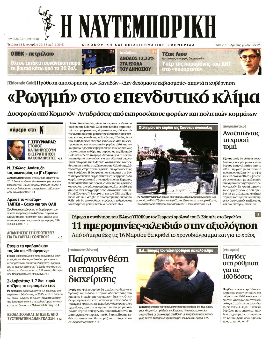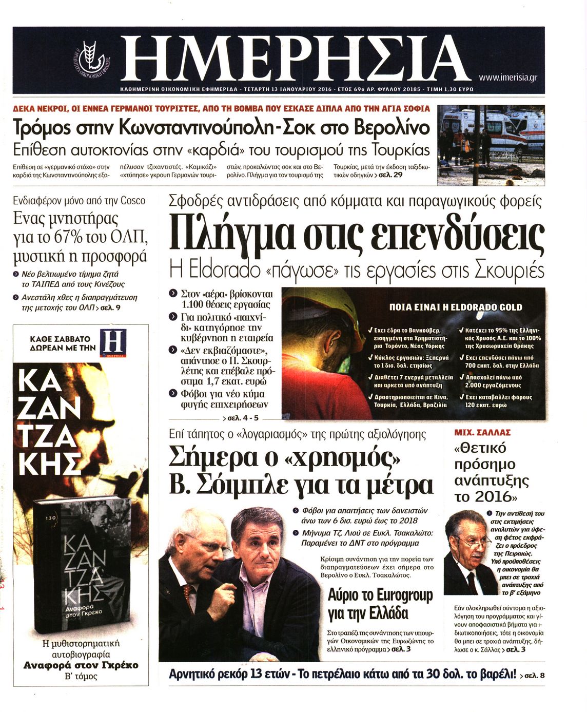 Oι οικονομικές εφημερίδες 13/1/2016 Enikos Newsroom 05:39, Τετάρτη 13 Ιανουαρίου 2016 Media Διαβάστε τα σημερινά πρωτοσέλιδα των οικονομικών εφημερίδων: ΟΙΚΟΝΟΜΙΚΕΣ ΕΦΗΜΕΡΙΔΕΣ ΠΡΩΤΟΣΕΛΙΔΑ Μοιράσου το: σχολίασε κι εσύ (0 σχόλια) Ακολουθήστε το enikos.gr στο Google News και μάθετε πρώτοι όλες τις ειδήσεις Δείτε όλες τις τελευταίες ειδήσεις από την Ελλάδα και τον Κόσμο στο enikos.gr Ειδήσεις Ροή Ειδήσεων 2 ώρες πριν Εκτός ευρωομάδας ΣΥΡΙΖΑ ο Νίκος Παππάς μετά την επίθεση στον δημοσιογράφο Νίκο Γιαννόπουλο – Η μήνυση και οι νέες δηλώσεις 2 ώρες πριν «Αγριεύουν» οι αγρότες: «Δεν συντρέχει λόγος συνάντησης με τον πρωθυπουργό» – Ώρα αποφάσεων στη σύσκεψη της Πέμπτης 2 ώρες πριν Κυψέλη: Χωρίς την οικογένειά της δίπλα της απολογήθηκε η 16χρονη – «Της είχε επιτεθεί κάποιος για να την βιάσει, φοβήθηκε και κυκλοφορούσε με μαχαίρι» 2 ώρες πριν Politico: Το πρόβλημα της Ευρώπης δεν είναι το Βέλγιο αλλά ο Ντόναλντ Τραμπ 4 ώρες πριν Αλεξανδρούπολη: Πολυοργανική ανεπάρκεια λόγω υποσιτισμού η αιτία θανάτου του 3χρονου αγοριού 2 ώρες πριν Μυστήριο με τεράστιες κυκλικές πέτρες 200 κιλών – Ανακαλύφθηκαν τυχαία κατά τη διάρκεια οδικών έργων και κανείς δεν ξέρει από πού προέρχονται 3 ώρες πριν Ύπνος: Ειδικός εξηγεί τον πραγματικό λόγο που ξυπνάτε στις 4 τα ξημερώματα – Ο ρόλος των ορμονών και του κιρκάδιου ρυθμού 4 ώρες πριν Αριθμολογία: Οι άνθρωποι που έχουν γεννηθεί αυτές τις 4 ημερομηνίες, είναι τρυφεροί και αγαπούν ανιδιοτελώς 16 ώρες πριν 20 χρόνια τα Χριστούγεννα ξεκινούν στα Public με μεγάλη ποικιλία σε δώρα! 2 λεπτά πριν Σάρα Εσκενάζυ: Η πρώτη ανάρτηση για το θάνατο του πατέρα της, Αλμπέρτο Εσκενάζυ και η επιθυμία της οικογένειας 18 λεπτά πριν Παρί Σεν Ζερμέν – Φλαμένγκο 2-1 πεν. (1-1 κ.δ.): Οι Γάλλοι σήκωσαν και το Διηπειρωτικό με ήρωα τον Σαφόνοφ που έπιασε 4 πέναλτι 33 λεπτά πριν Βέλγους πολιτικούς και επικεφαλής χρηματοπιστωτικών ιδρυμάτων στοχοποιεί η Μόσχα για τα κατασχεθέντα περιουσιακά στοιχεία 48 λεπτά πριν ΗΠΑ: Αναζητείται δεύτερος ύποπτος για την επίθεση στο πανεπιστήμιο Μπράουν 1 ώρα πριν Λεωφόρος Αλεξάνδρας: Δεν εντοπίστηκε βόμβα έξω από το κολλέγιο – Προσήχθη άνδρας για το προειδοποιητικό σημείωμα ENIKOS NETWORK Αϋπνία: Το κόλπο που θα σας βοηθήσει να κοιμηθείτε απόψε – Είναι απλό και έχει αποτέλεσμα 2,6 εκατομμύρια πολίτες έχουν ήδη εμβολιαστεί κατά της γρίπης ΕΛΣΤΑΤ: Τι δείχνουν τα νέα στοιχεία για τις ηλεκτρονικές παραγγελίες των επιχειρήσεων ΚΕΠΕ: Οι 3 διακριτές συμβολές των ΜμΕ και της μεταποίησης στην ελληνική οικονομία Χαρτογραφώντας το «σημείο χωρίς επιστροφή»: Για πρώτη φορά αποκαλύπτεται με λεπτομέρεια το ακανθώδες όριο της ατμόσφαιρας τ... Η Google καταργεί τη λειτουργία «dark web report» – Πώς θα μπορούν οι χρήστες να διαγράφουν τα δεδομένα τους περισσότερα 22:24 , Τετάρτη 17 Δεκεμβρίου 2025 Το Σπίτι Δίπλα Στο Ποτάμι: Σε κίνδυνο η υγεία του Απόστολου – Τι θα δούμε απόψε “Το Σπίτι Δίπλα στο Ποτάμι” ξετυλίγει το νήμα της ζωής των πέντε αδελφών με καταισ... 21:14 , Τετάρτη 17 Δεκεμβρίου 2025 Παιχνίδια Εκδίκησης: Θα καταφέρει ο Χρήστος να κλονίσει την εμπιστοσύνη της Μάγιας απέναντι στον Άγη; Τα «Παιχνίδια Εκδίκησης» έρχονται απόψε στις 22:30, στον Αντ1, με το τελευταίο επεισόδιο της χ... 20:57 , Τετάρτη 17 Δεκεμβρίου 2025 Άγιος Έρωτας: Η Χλόη καταθέτει εναντίον του πατέρα της και ο Χάρης αποκαλύπτει στον Κλεάνθη ότι δεν είναι ο βιολογικός του πατέρας. Γεμάτο αποκαλύψεις είναι το νέο επεισόδιο της σειράς “Άγιος 