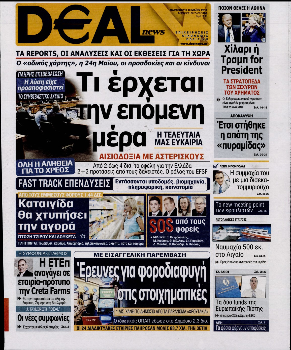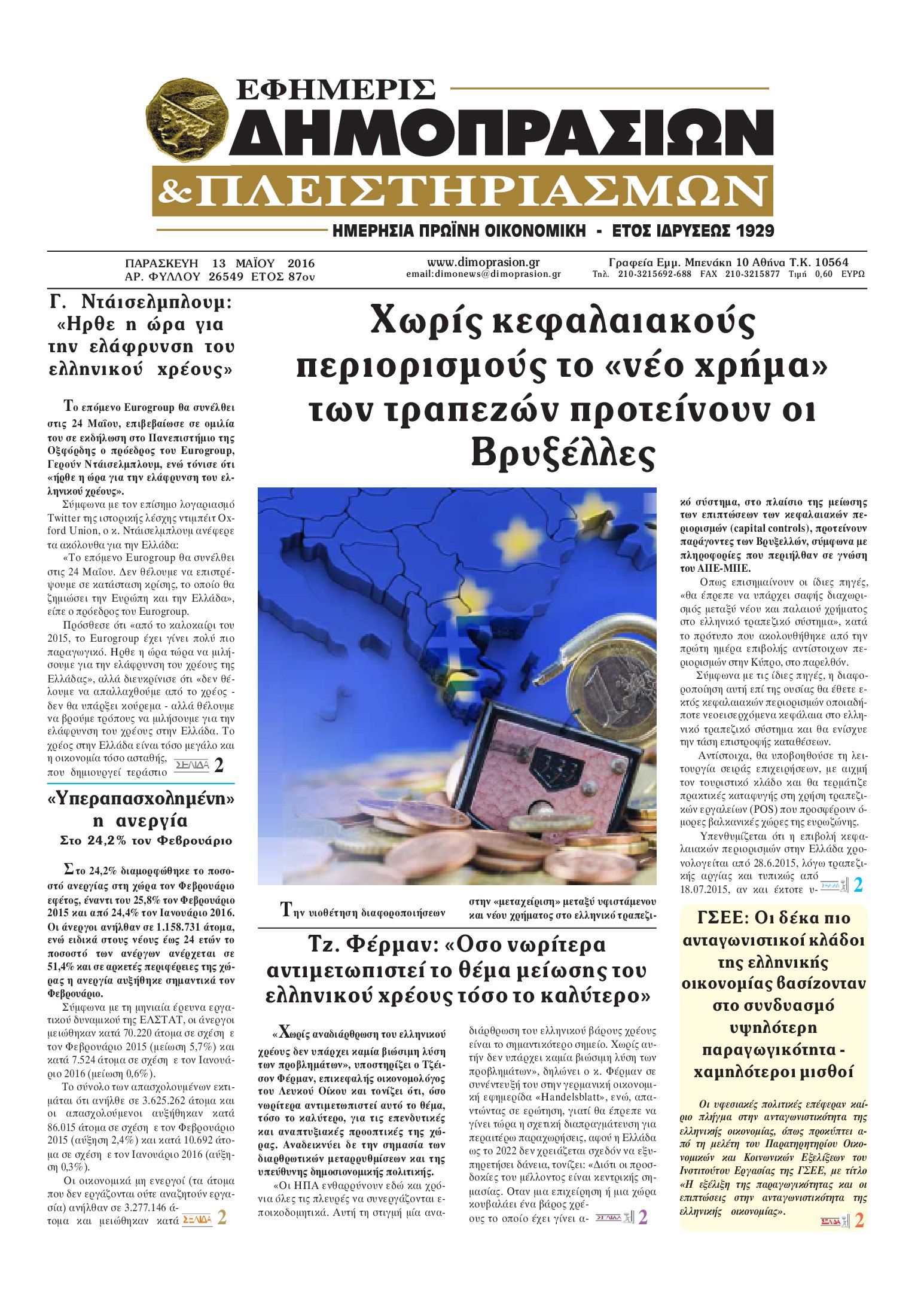 Oι οικονομικές εφημερίδες 13/5/2016 Enikos Newsroom 05:18, Παρασκευή 13 Μαΐου 2016 Media Διαβάστε τα σημερινά πρωτοσέλιδα των οικονομικών εφημερίδων: ΟΙΚΟΝΟΜΙΚΕΣ ΕΦΗΜΕΡΙΔΕΣ ΠΡΩΤΟΣΕΛΙΔΑ Μοιράσου το: σχολίασε κι εσύ (0 σχόλια) Ακολουθήστε το enikos.gr στο Google News και μάθετε πρώτοι όλες τις ειδήσεις Δείτε όλες τις τελευταίες ειδήσεις από την Ελλάδα και τον Κόσμο στο enikos.gr Ειδήσεις Ροή Ειδήσεων 59 λεπτά πριν Υπόθεση Έπσταϊν: Το Υπουργείο Δικαιοσύνης δημοσιοποίησε μια σειρά από εξαιρετικά επεξεργασμένα αρχεία – «Λείπουν τα πιο σημαντικά έγγραφα», λένε οι Δημοκρατικοί 3 ώρες πριν Σαρωτικοί οι έλεγχοι στους δρόμους ενόψει εορτών – Μπλόκα της τροχαίας σε κεντρικές αρτηρίες της Αττικής 1 ώρα πριν ΟΝΕΧ – MEGATUGS: Ξεκίνησε η ναυπήγηση ρυμουλκών στην Ελλάδα – Προθάλαμος πολεμικών πλοίων – Δείτε φωτογραφίες και βίντεο 1 ώρα πριν Καιρός: Αλλαγή σκηνικού σήμερα με βροχές και πτώση της θερμοκρασίας – Οι προβλέψεις των μετεωρολόγων για τα Χριστούγεννα 10 ώρες πριν Χριστούγεννα στα μπλόκα: Επιμένουν στις κινητοποιήσεις τους οι αγρότες – Ανοίγουν τα διόδια το Σαββατοκύριακο 3 ώρες πριν Αυγά: Πόσα μπορείτε να τρώτε την ημέρα με ασφάλεια για μέγιστη πρόσληψη πρωτεΐνης 3 ώρες πριν Τα ζώδια σήμερα, Σάββατο 20 Δεκεμβρίου: Παρθένοι, το σύμπαν σας δίνει το κλειδί 2 ώρες πριν Οπτική ψευδαίσθηση: Μόνο αν είσαι ο Σέρλοκ Χολμς θα βρεις τον αριθμό «87» σε 7 δευτερόλεπτα 39 λεπτά πριν Αρχαιολόγοι ανακάλυψαν σε χωράφι απεικόνιση 600 ετών ενός Αγίου – Τα στοιχεία που δείχνουν ότι μαρτύρησε 8 λεπτά πριν Ο «χάρτης» με τις αυξήσεις και τις φοροελαφρύνσεις του 2026 – Ποιοι και πόσα κερδίζουν 16 λεπτά πριν Η τέλεια συνταγή για cookies με κομμάτια σοκολάτας 24 λεπτά πριν MyHealth App: Τα στοιχεία για τον Προσωπικό Βοηθό Υγείας Πολίτη – Τι ερωτήματα έγιναν μέσα σε 7 ημέρες 32 λεπτά πριν Τρομεροί γονείς: Η Μαρία Καβογιάννη εισβάλλει στο σπίτι της οικογένειας Στεφανίδη 39 λεπτά πριν Αρχαιολόγοι ανακάλυψαν σε χωράφι απεικόνιση 600 ετών ενός Αγίου – Τα στοιχεία που δείχνουν ότι μαρτύρησε ENIKOS NETWORK Το τεστ των 10 δευτερολέπτων που μπορεί να προβλέψει το προσδόκιμο ζωής σας – Τι λέει ειδικός του Cleveland Επιλέξτε καρέκλα για να μάθετε ποια είναι τα κρυφά χαρακτηριστικά σας – Τι αποκάλυψε για εσάς αυτό το τεστ προσωπικότητας; Mega χριστουγεννιάτικη φορολοταρία: «Κλείδωσε» η ημερομηνία για την κλήρωση – Ερωτήσεις και απαντήσεις Αναστολή μέτρων αναγκαστικής εκτέλεσης για κτηνοτρόφους που πλήττονται από την ευλογιά των αιγοπροβάτων Χαρτογραφώντας το «σημείο χωρίς επιστροφή»: Για πρώτη φορά αποκαλύπτεται με λεπτομέρεια το ακανθώδες όριο της ατμόσφαιρας τ... Η Google καταργεί τη λειτουργία «dark web report» – Πώς θα μπορούν οι χρήστες να διαγράφουν τα δεδομένα τους περισσότερα 08:14 , Σάββατο 20 Δεκεμβρίου 2025 Τρομεροί γονείς: Η Μαρία Καβογιάννη εισβάλλει στο σπίτι της οικογένειας Στεφανίδη Όσα θα δούμε στο νέο διπλό επεισόδιο της σειράς «Τρομεροί γονείς», σήμερα Σάββατο 20 Δεκεμβρίο... 05:48 , Σάββατο 20 Δεκεμβρίου 2025 Οι οικονομικές εφημερίδες 20/12/2025 Διαβάστε τα πρωτοσέλιδα από τις οικονομικές εφημερίδες, σήμερα 20/12/2025. 05:43 , Σάββατο 20 Δεκεμβρίου 2025 Οι αθλητικές εφημερίδες 20/12/2025 Διαβάστε τα πρωτοσέλιδα από τις αθλητικές εφημερίδες, σήμερα 20/12/2025. 05:38 , Σάββατο 20 Δεκεμβρίου 2025 Οι πολιτικές εφημερίδες 20/12/2025 Διαβάστε τα πρωτοσέλιδα από τις πολιτικές εφημερίδες, σήμερα 20/12/2025. ΤΕΛΕΥΤΑΙΕΣ ΕΙΔΗΣΕΙΣ 8 λεπτά πριν Ο «χάρτης» με τις αυξήσεις και τις φοροελαφρ