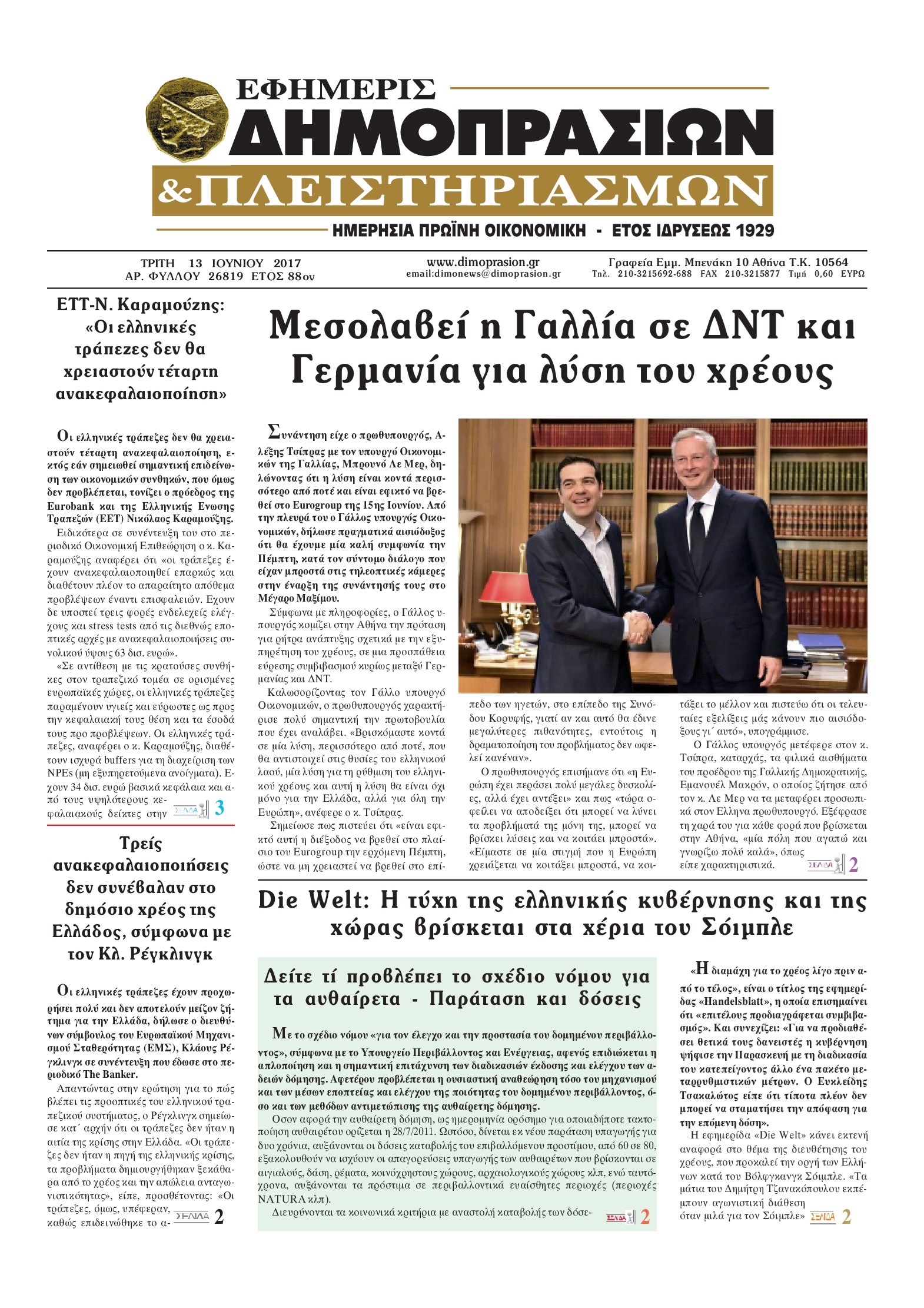 Οι οικονομικές εφημερίδες 13/6/2017 Enikos Newsroom 00:00, Δευτέρα 01 Ιανουαρίου 0001 Media Διαβάστε τα σημερινά πρωτοσέλιδα των οικονομικών εφημερίδων: ΟΙΚΟΝΟΜΙΚΕΣ ΕΦΗΜΕΡΙΔΕΣ ΠΡΩΤΟΣΕΛΙΔΑ Μοιράσου το: σχολίασε κι εσύ (0 σχόλια) Ακολουθήστε το enikos.gr στο Google News και μάθετε πρώτοι όλες τις ειδήσεις Δείτε όλες τις τελευταίες ειδήσεις από την Ελλάδα και τον Κόσμο στο enikos.gr Ειδήσεις Ροή Ειδήσεων 1 ώρα πριν Τρομοκρατική επίθεση στο Σίδνεϊ: Νεκροί 11 πολίτες και ένας δράστης – Εντοπίστηκε αυτοσχέδιος εκρηκτικός μηχανισμός 2 ώρες πριν ΟΠΕΚΕΠΕ: Ποινική δίωξη με βαρύτατες κατηγορίες για τους 15 συλληφθέντες στην Κρήτη για τις παράνομες επιδοτήσεις 4 ώρες πριν Σκληραίνουν τη στάση τους οι αγρότες: Αποφασίζουν τις δράσεις της εβδομάδας – Αύριο το συλλαλητήριο στα δικαστήρια της Λάρισας 6 ώρες πριν Κυριάκος Μητσοτάκης μετά το «όχι» των αγροτών: Διάλογος δεν γίνεται με τελεσίγραφα και οι λύσεις προκύπτουν μόνο από συζήτηση 43 λεπτά πριν Πανεπιστήμιο Μπράουν: Υπό κράτηση ένα «άτομο ενδιαφέροντος» για το μακελειό με τους 2 νεκρούς και τους 9 τραυματίες 57 λεπτά πριν Γεωλογική αποκάλυψη: Επιστήμονες εξηγούν πώς η Ιβηρική Χερσόνησος περιστρέφεται σαν… ρολόι 4 ώρες πριν Προπονήτρια ευεξίας που έχασε 24 κιλά αποκαλύπτει: «Αυτά είναι τα 6 ανησυχητικά σημάδια της υψηλής κορτιζόλης» 6 ώρες πριν Η ζωή γίνεται πολύ καλύτερη για 3 ζώδια – «Ίσως έχει έρθει η ώρα να κάνετε μια πραγματική και μόνιμη αλλαγή» 5 ώρες πριν Τα 8 πράγματα που τα ευτυχισμένα ζευγάρια δεν κάνουν ποτέ μπροστά στα παιδιά τους 3 λεπτά πριν ΟΠΕΚΕΠΕ-Κρήτη: Προθεσμία να απολογηθούν από την Τρίτη έως την Πέμπτη έλαβαν οι 16 συλληφθέντες 14 λεπτά πριν Βίντεο: Άνδρας αρπάζει κινητό από ράφι καταστήματος στο Ηράκλειο Κρήτης – Καρέ καρέ οι κινήσεις του 21 λεπτά πριν Τσιάρας: «Να ξανασκεφτούν τη στάση τους οι αγρότες και να καθίσουν στο τραπέζι του διαλόγου» – Ομαδικά πυρά από την αντιπολίτευση 29 λεπτά πριν Μερτς: Πρέπει να βάλουμε τέλος στον αντισημιτισμό – Είναι επίθεση στις κοινές μας αξίες 36 λεπτά πριν Θεσσαλονίκη: Έκκληση στους αγρότες να επανέλθουν στον θεσμικό διάλογο, απευθύνουν παραγωγικοί φορείς της βιομηχανίας και της βιοτεχνίας ENIKOS NETWORK Άσκηση ή περισσότερος ύπνος: Τι είναι πιο σημαντικό για την υγεία όταν δεν έχετε χρόνο και για τα δύο; Σπλαχνικό λίπος: 3 υδατάνθρακες που μπορεί να σας βοηθήσουν να το χάσετε, σύμφωνα με ειδικό ΕΚΤ: Τα οφέλη για νοικοκυριά και επιχειρήσεις από τα σταθερά επιτόκια για ολόκληρο το 2026 Βαρύς ο λογαριασμός για τους φορολογούμενους – Τι πρέπει να πληρώσετε έως το τέλος του μήνα Σύγχρονος Νοστράδαμος: Προειδοποιεί για «μεγάλο γεγονός» τους επόμενους μήνες που θα συγκλονίσει τη Βρετανία και τον κόσμο Τεστ παρατηρητικότητας: Μπορείτε να βρείτε τις 3 διαφορές στις εικόνες με έναν πιγκουίνο σε 14 δευτερόλεπτα περισσότερα 15:07 , Κυριακή 14 Δεκεμβρίου 2025 IQ160: Η Μαρίνα στέλνει το φούτερ του Τηλέμαχου για το τεστ πατρότητας Η Πηνελόπη αποφασίζει να κάνει αμνιοπαρακέντηση, για να βεβαιωθεί για την υγεία του μωρού της ... 12:46 , Κυριακή 14 Δεκεμβρίου 2025 Η Realnews στο www.pressreader.com Διαβάστε την ψηφιακή έκδοση της εφημερίδας στην οθόνη του κινητού, του tablet και του υπολογισ... 10:07 , Κυριακή 14 Δεκεμβρίου 2025 Η γη της ελιάς: Η αρχή του τέλους του Δημοσθένη πλησιάζει Η δραματική σειρά του MEGA «Η γη της ελιάς» επιφυλάσσει ακόμα μεγαλύτερες ανατροπές. Κάθε επει... 08:15 , Κυριακή 14 Δεκεμβρίου 2025 Σήμερα με τη Realnews: Food & Travel μαζ
