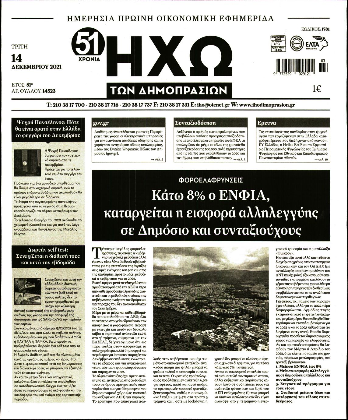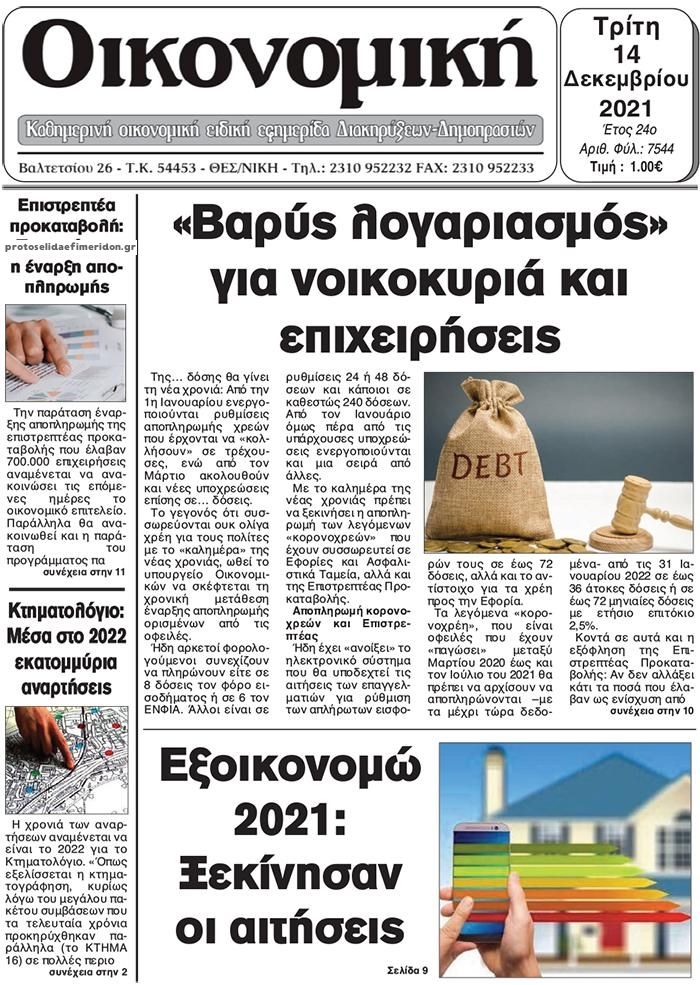 Οι οικονομικές εφημερίδες 14/12/2021 Διονύσης Νίκκας 06:50, Τρίτη 14 Δεκεμβρίου 2021 Media Διαβάστε τα πρωτοσέλιδα από τις οικονομικές εφημερίδες… ΟΙΚΟΝΟΜΙΚΕΣ ΕΦΗΜΕΡΙΔΕΣ Μοιράσου το: σχολίασε κι εσύ (0 σχόλια) Ακολουθήστε το enikos.gr στο Google News και μάθετε πρώτοι όλες τις ειδήσεις Δείτε όλες τις τελευταίες ειδήσεις από την Ελλάδα και τον Κόσμο στο enikos.gr Ειδήσεις Ροή Ειδήσεων 1 ώρα πριν Ευρωπαϊκή Ένωση: Συμφωνία για δάνειο 90 δισ. ευρώ στην Ουκρανία τη διετία 2026-2027 6 ώρες πριν ΟΠΕΚΕΠΕ: Προφυλακιστέος ο φερόμενος αρχηγός και ο λογιστής της εγκληματικής οργάνωσης 7 ώρες πριν Αυξάνουν την πίεση προς την κυβέρνηση οι αγρότες: Κλείνουν παρακαμπτήριους και ανοίγουν διόδια – Τι θα γίνει τις γιορτές 7 ώρες πριν Φοινικούντα: Το Σάββατο απολογείται ο 30χρονος γιος γνωστού επιχειρηματία της Πλάκας που παραδόθηκε – Όσα είπε στους αστυνομικούς και ο ρόλος του στο έγκλημα 5 ώρες πριν ΑΕΚ – Κραϊόβα 3-2: Επική ανατροπή και πρόκριση στους «16» του Conference League η Ένωση 6 ώρες πριν Αρχαιολόγοι ανακάλυψαν ρωμαϊκά τεχνουργήματα από μια πόλη που δεν υπήρξε ποτέ – Τα τρία εντυπωσιακά κτίρια και ο αμφορέας με τις… σαρδέλες 7 ώρες πριν Ύπνος: Η απλή βραδινή ρουτίνα για να προστατεύσετε τα μαλλιά σας από το κρύο κατά τη διάρκεια του χειμώνα 8 ώρες πριν Manifesting: Πώς να συναντήσετε τον σύντροφο της ζωής σας, ανάλογα με τον μήνα γέννησής σας 2 ημέρες πριν 20 χρόνια τα Χριστούγεννα ξεκινούν στα Public με μεγάλη ποικιλία σε δώρα! 7 λεπτά πριν Η TikTok στις ΗΠΑ πωλείται σε Oracle, Silver Lake και MGX – Οι λεπτομέρειες του «deal» 15 λεπτά πριν Αλεξάντερ Λουκασένκο: Η Λευκορωσία βρίσκεται κοντά στην αποκατάσταση των σχέσεών της με τις ΗΠΑ 31 λεπτά πριν Αυστραλία: Κήρυξε την Κυριακή (21/12) ημέρα εθνικού πένθους για τη φονική επίθεση στην παραλία Μπόνταϊ 41 λεπτά πριν Ρόδος: Δάσκαλος καράτε καταδικάστηκε για ασέλγεια σε ανήλικες αθλήτριες – Μαρτυρίες για αγγίγματα σε ευαίσθητα σημεία 55 λεπτά πριν Γουατεμάλα: Εξαρθρώθηκε κύκλωμα διακίνησης μεταναστών προς τις ΗΠΑ – Συνελήφθησαν 14 άτομα ENIKOS NETWORK Σε περίοδο αυξημένης δραστηριότητας η γρίπη στην Ελλάδα-Μέτρα προστασίας από τον ΕΟΔΥ Σκέφτεστε συνέχεια συζητήσεις που έχετε κάνει; Τι σημαίνει αυτό, σύμφωνα με ειδικό Στεγαστικό: Τι λέει η ΠΟΜΙΔΑ για τα νέα μέτρα που ανακοίνωσε ο Κυριάκος Μητσοτάκης Λαγκάρντ: Αισιόδοξη για την ανάπτυξη της Ευρωζώνης, αβέβαιη για τον πληθωρισμό Χαρτογραφώντας το «σημείο χωρίς επιστροφή»: Για πρώτη φορά αποκαλύπτεται με λεπτομέρεια το ακανθώδες όριο της ατμόσφαιρας τ... Η Google καταργεί τη λειτουργία «dark web report» – Πώς θα μπορούν οι χρήστες να διαγράφουν τα δεδομένα τους περισσότερα 02:50 , Παρασκευή 19 Δεκεμβρίου 2025 GNTM: «Κλείδωσαν» οι τέσσερις φιναλίστ – Μεγάλη ανατροπή στις τελευταίες αποχωρήσεις Για προτελευταία φορά εμφανίστηκαν στο πλατό του GNTM οι φιναλίστ του φετινού κύκλου, το βράδυ... 17:45 , Πέμπτη 18 Δεκεμβρίου 2025 ROUK ZOUK: Εορταστικό επεισόδιο με καλεσμένους τους πρωταγωνιστές του «Γιατί ρε πατέρα» Το Σάββατο 20 Δεκεμβρίου στις 21:00, η Ζέτα Μακρυπούλια υποδέχεται εκλεκτούς ηθοποιούς που όλο... 17:20 , Πέμπτη 18 Δεκεμβρίου 2025 Άγιος έρωτας: Η Χριστίνα εξομολογείται στον πατέρα Νικόλαο, απόψε στις 21:00 στον Alpha Η Νότα αποφασίζει να εκδικηθεί τον Πέτρο και τον Στέφανο, για χάρη του Λούη, όμως τα πράγματα ... 16:50 , Πέμπτη 18 Δεκεμβρίου 2025 Να μ’ αγαπάς: Ζωή και Φωτεινή συμφιλιώνονται ως μάνα με κόρη, απόψε στις 20:00 Η ταυτότητα του Άγγελου αποκαλύπτεται στο νέο επεισό