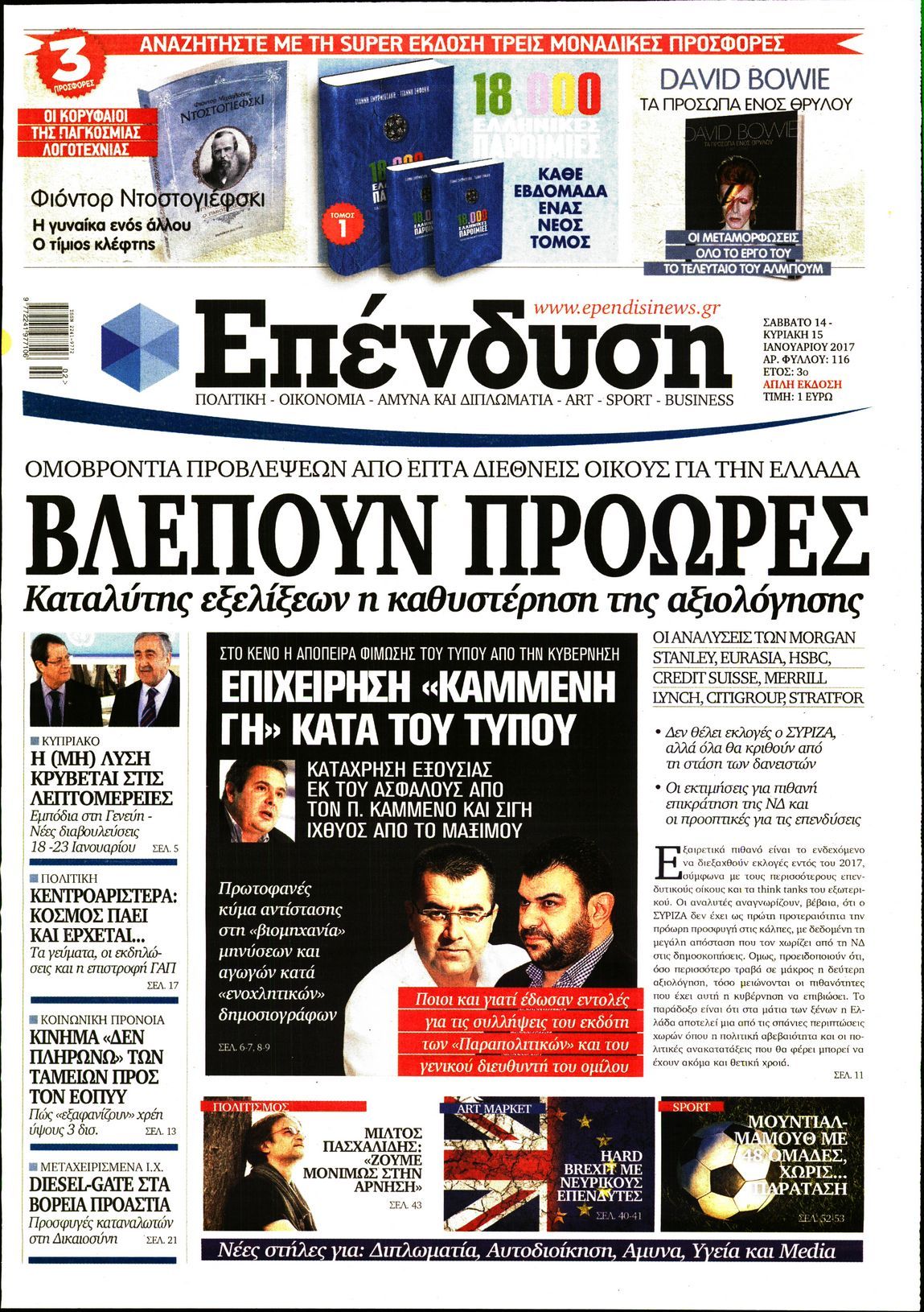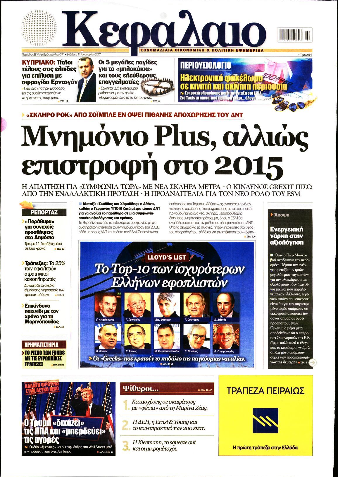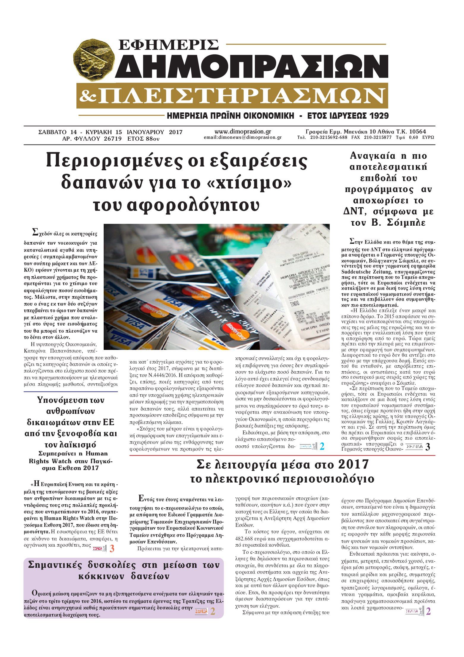 Οι οικονομικές εφημερίδες 14/01/2017 Enikos Newsroom 00:51, Σάββατο 14 Ιανουαρίου 2017 Media Διαβάστε τα σημερινά πρωτοσέλιδα των οικονομικών εφημερίδων: ΟΙΚΟΝΟΜΙΚΕΣ ΕΦΗΜΕΡΙΔΕΣ ΠΡΩΤΟΣΕΛΙΔΑ Μοιράσου το: σχολίασε κι εσύ (0 σχόλια) Ακολουθήστε το enikos.gr στο Google News και μάθετε πρώτοι όλες τις ειδήσεις Δείτε όλες τις τελευταίες ειδήσεις από την Ελλάδα και τον Κόσμο στο enikos.gr Ειδήσεις Ροή Ειδήσεων 5 ώρες πριν Μητσοτάκης: Αναγκαία η μεταρρύθμιση του πρωτογενούς τομέα – Τα 6 νέα μέτρα για το στεγαστικό και οι αναφορές σε «Ιθάκη» και «πολιτικούς του καναπέ» 5 ώρες πριν Δάνεια σε ελβετικό φράγκο: Τα βασικά σημεία της ρύθμισης – ανάσας για 40.000 δανειολήπτες – Αναλυτικός οδηγός με ερωτήσεις και απαντήσεις 4 ώρες πριν Κυψέλη: Εξιτήριο πήρε η 14χρονη μαθήτρια που μαχαιρώθηκε από την 16χρονη σε σχολείο – «Θέλω να βοηθήσω το παιδί, έχει μπλέξει με κακές παρέες» 4 ώρες πριν Τραμπ: Γιατί κατέθεσε τώρα την αγωγή κατά του BBC – Πώς η κίνησή του εξυπηρετεί το νέο δόγμα του για «αντίσταση» στην Ευρώπη, υπέρ των συντηρητικών 5 ώρες πριν ΟΠΕΚΕΠΕ – Παράνομες επιδοτήσεις: Ελεύθεροι με περιοριστικούς όρους και οι 7 κατηγορούμενοι που απολογήθηκαν σήμερα 4 ώρες πριν Ανακαλύφθηκε βυθισμένη πέτρινη κατασκευή ανοιχτά της Κριμαίας – Αποτελεί μέρος αρχαίας ελληνικής αποικίας 5 ώρες πριν Ύπνος: Αυτό μπορεί να είναι το χειρότερο λάθος για το βιολογικό ρολόι σας, σύμφωνα με ειδικό 6 ώρες πριν Αριθμολογία: Οι άνθρωποι που έχουν γεννηθεί αυτές τις 3 ημερομηνίες, προσελκύουν μεγάλη τύχη πριν από το τέλος του 2025 8 ώρες πριν Οι 7 συμπεριφορές που μαρτυρούν ότι ένας άνδρας επενδύει μακροπρόθεσμα σε μια σχέση 14 λεπτά πριν Νίκος Πλακιάς: Η Μαρία Καρυστιανού πλέον θα κρίνεται ως πολιτικός και όχι ως συγγενής 30 λεπτά πριν Ντόναλντ Τραμπ: Κάλυψε απόλυτα την προσωπάρχη του Λευκού Οίκου: «Ναι, έχω προσωπικότητα αλκοολικού» 44 λεπτά πριν ΗΠΑ: Στην αγορά δύο Boeing 747-8 προχωρά η Πολεμική Αεροπορία για την υποστήριξη του προεδρικού στόλου 59 λεπτά πριν Ιταλία: Λεωφορείο έπεσε πάνω σε βιτρίνα καταστήματος στο Τορίνο – Τρεις τραυματίες 1 ώρα πριν Χαλάνδρι: Καθηγητής έπιασε με κόφτη τα δάχτυλα μαθητή σε κατάληψη – «Μου έχεις πιάσει το χέρι» ENIKOS NETWORK Αίτημα ΙΣΑ για την εξαίρεση των προσωπικών γιατρών από τις κατ’ οίκον επισκέψεις Η σκανδιναβική μέθοδος στον ύπνο που μπορεί να σώσει έναν γάμο Πιερρακάκης: Ο προϋπολογισμός συμβάλλει ουσιαστικά στην ενίσχυση της αγοραστικής δύναμης της πλειονότητας των εργαζομένων e-ΕΦΚΑ: Παρατείνεται η προθεσμία για την υποβολή ΑΠΔ – Ποιους αφορά Σύγχρονος Νοστράδαμος: Προειδοποιεί για «μεγάλο γεγονός» τους επόμενους μήνες που θα συγκλονίσει τη Βρετανία και τον κόσμο Τεστ παρατηρητικότητας: Μπορείτε να βρείτε τις 3 διαφορές στις εικόνες με έναν πιγκουίνο σε 14 δευτερόλεπτα περισσότερα 20:06 , Τρίτη 16 Δεκεμβρίου 2025 Ο ΣΚΑΙ καταγγέλλει τον ΕΚΚΟΜΕΔ Επιστολή με την οποία καταγράφει την έντονη διαμαρτυρία του προς τον διευθύνοντα σύμβουλο του... 17:40 , Τρίτη 16 Δεκεμβρίου 2025 Eurovision: Στις 4 Ιανουαρίου αποκαλύπτονται τα 28 τραγούδια του ελληνικού τελικού Η αγωνία τελειώνει, η γιορτή της Eurovision αρχίζει στην ΕΡΤ από τις πρώτες ημέρες της νέας χρ... 17:09 , Τρίτη 16 Δεκεμβρίου 2025 Alter Ego Media: Βαθύτατη θλίψη και ειλικρινή συλλυπητήρια για την απώλεια της Ειρήνης Μαρινάκη Τη βαθύτατη θλίψη και τα ειλικρινή συλλυπητήριά της εκφράζει η Alter Ego Media για τον θάνατο ... 13:00 , Τρίτη 16 Δεκεμβρίου 2025 «Στο Παρά Πέντε – 20 Χρόνια 