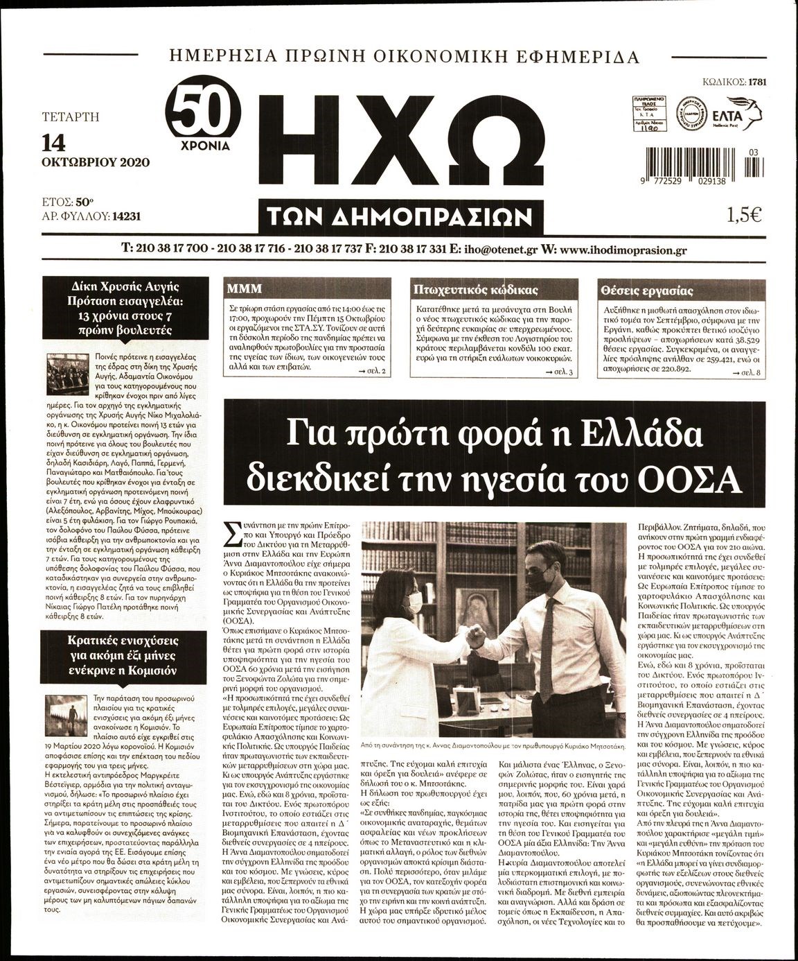 Οι οικονομικές εφημερίδες 14/10/2020 Διονύσης Νίκκας 06:30, Τετάρτη 14 Οκτωβρίου 2020 Media Διαβάστε τα πρωτοσέλιδα των οικονομικών εφημερίδων… ΟΙΚΟΝΟΜΙΚΕΣ ΕΦΗΜΕΡΙΔΕΣ Μοιράσου το: σχολίασε κι εσύ (0 σχόλια) Ακολουθήστε το enikos.gr στο Google News και μάθετε πρώτοι όλες τις ειδήσεις Δείτε όλες τις τελευταίες ειδήσεις από την Ελλάδα και τον Κόσμο στο enikos.gr Ειδήσεις Ροή Ειδήσεων 5 ώρες πριν Χριστούγεννα στα μπλόκα: Επιμένουν στις κινητοποιήσεις τους οι αγρότες – Ανοίγουν τα διόδια το Σαββατοκύριακο 5 ώρες πριν Ουκρανία: Η άνευ προηγουμένου επίθεση σε ρωσικό τάνκερ στη Μεσόγειο και το μήνυμα προς στον Πούτιν – Το «μακρύ χέρι» του Κιέβου 4 ώρες πριν Πούτιν: Τα μηνύματα σε Ευρώπη και ΝΑΤΟ από το μαραθώνιο «σόου» του – Η απαίτηση για «σεβασμό» και η ειρήνη «με τους όρους» της Μόσχας 5 ώρες πριν Τραμπ: Δεν αποκλείει την πιθανότητα ενός πολέμου στη Βενεζουέλα – «Ο Μαδούρο ξέρει καλύτερα από τον καθένα τι ακριβώς θέλω» 6 ώρες πριν Συνεχίζει να προκαλεί ο Μίτσκοσκι: «Για μένα το όνομα Μακεδονία είναι ιερό» 4 ώρες πριν Ανακαλύφθηκαν αρχαία χρυσά νομίσματα 2.200 ετών που απεικονίζουν τον θεό Απόλλωνα – Η άγνωστη σύνδεση με τον Φίλιππο Β΄ της Μακεδονίας 5 ώρες πριν Ύπνος: Μια κρυφή κατάσταση του εγκεφάλου πριν από τον ύπνο μπορεί να είναι το “κλειδί” για υψηλή ευφυΐα και δημιουργικότητα 6 ώρες πριν Αριθμολογία: Οι άνθρωποι που έχουν γεννηθεί αυτές τις 4 ημερομηνίες, συχνά παρεξηγούνται – «Η καλοσύνη τους κρύβει τεράστια δύναμη» 7 ώρες πριν Ξεχάστε το καθάρισμα το Σαββατοκύριακο: Ο «κανόνας των 20 λεπτών» που θα σας λύσει τα χέρια 9 λεπτά πριν Η Ελλάδα προσχωρεί στη Διεθνή Επιτροπή Αποζημιώσεων για την Ουκρανία 23 λεπτά πριν GNTM: Η Ξένια Τσίρκοβα αναδείχθηκε μεγάλη νικήτρια και πήρε τις 50.000 ευρώ – Ποιος βρέθηκε σε απόσταση αναπνοής; 38 λεπτά πριν Θεσσαλονίκη: Εξαφανίστηκε 13χρονος από χώρο φιλοξενίας ασυνόδευτων ανηλίκων στο Ωραιόκαστρο 49 λεπτά πριν Ντόναλντ Τραμπ: «Πολύ βαριά αντίποινα» στη Συρία – «Πλήττουμε πολύ δυνατά οχυρά του Ισλαμικού Κράτους» 1 ώρα πριν Εξάρχεια: Ένταση με μολότοφ, χημικά και κρότου λάμψης ENIKOS NETWORK Το ΕΚΑΒ τιμήθηκε από την Ακαδημία Αθηνών για τα 40 χρόνια προσφοράς του Έχετε πραγματικά μεγάλη καρδιά; 10 χαρακτηριστικά όσων έχουν καλοσύνη Αναστολή μέτρων αναγκαστικής εκτέλεσης για κτηνοτρόφους που πλήττονται από την ευλογιά των αιγοπροβάτων Πλήρης επάρκεια προϊόντων στις λαϊκές της Αττικής, παρά τις αγροτικές κινητοποιήσεις – Τι απαντούν οι πωλητές Χαρτογραφώντας το «σημείο χωρίς επιστροφή»: Για πρώτη φορά αποκαλύπτεται με λεπτομέρεια το ακανθώδες όριο της ατμόσφαιρας τ... Η Google καταργεί τη λειτουργία «dark web report» – Πώς θα μπορούν οι χρήστες να διαγράφουν τα δεδομένα τους περισσότερα 02:50 , Σάββατο 20 Δεκεμβρίου 2025 GNTM: Η Ξένια Τσίρκοβα αναδείχθηκε μεγάλη νικήτρια και πήρε τις 50.000 ευρώ – Ποιος βρέθηκε σε απόσταση αναπνοής; Με φαντασμαγορικό τρόπο ολοκληρώθηκε το βράδυ της Παρασκευής ο μεγάλος τελικός του GNTM, μέσα ... 22:42 , Παρασκευή 19 Δεκεμβρίου 2025 Γιώργος Γιαννόπουλος για “Το σόι σου”: “Είναι ευτυχία και ευλογία αυτή η σειρά” «Είναι ευτυχία και ευλογία η συγκυρία αυτής της σειράς», θα πει ο Γιώργος Γιαννόπουλος -ο αγαπ... 20:37 , Παρασκευή 19 Δεκεμβρίου 2025 Don’t Forget The Lyrics: Η Έλλη Κοκκίνου υποδέχεται 4 παίκτες που θα κάνουν τα πάντα για να μη χάσουν ούτε… μισή λέξη από τους στίχους Το «Don’t Forget The Lyrics» επιστρέφει απόψε, Παρασκευή 19 Δεκεμβρίου, στις 21:00 με νέο επ