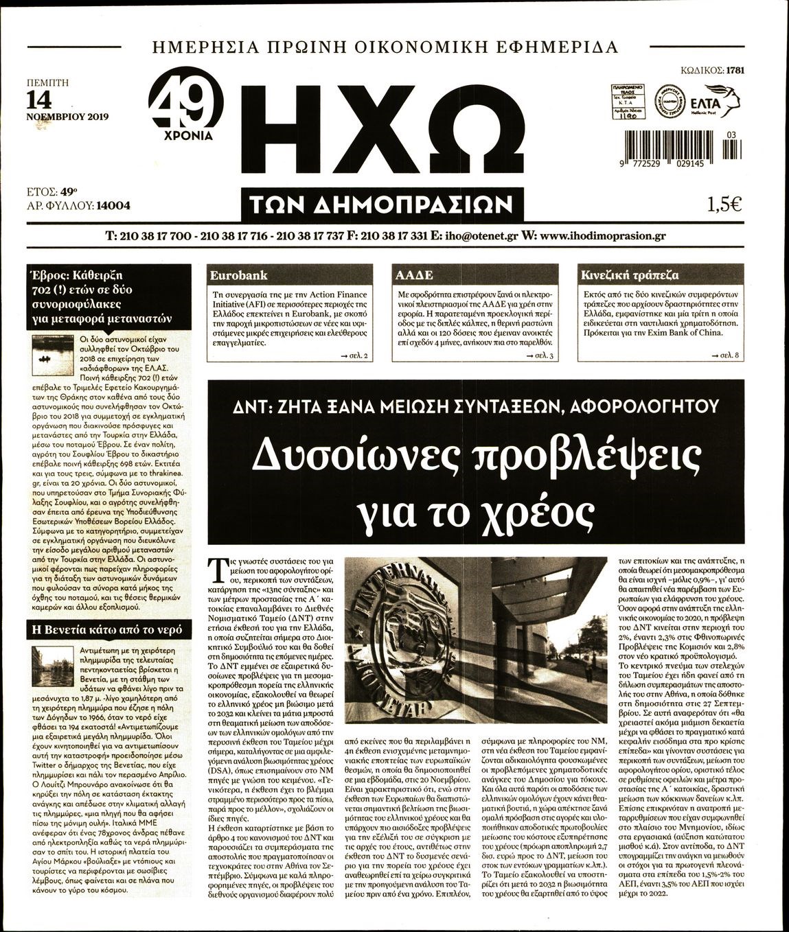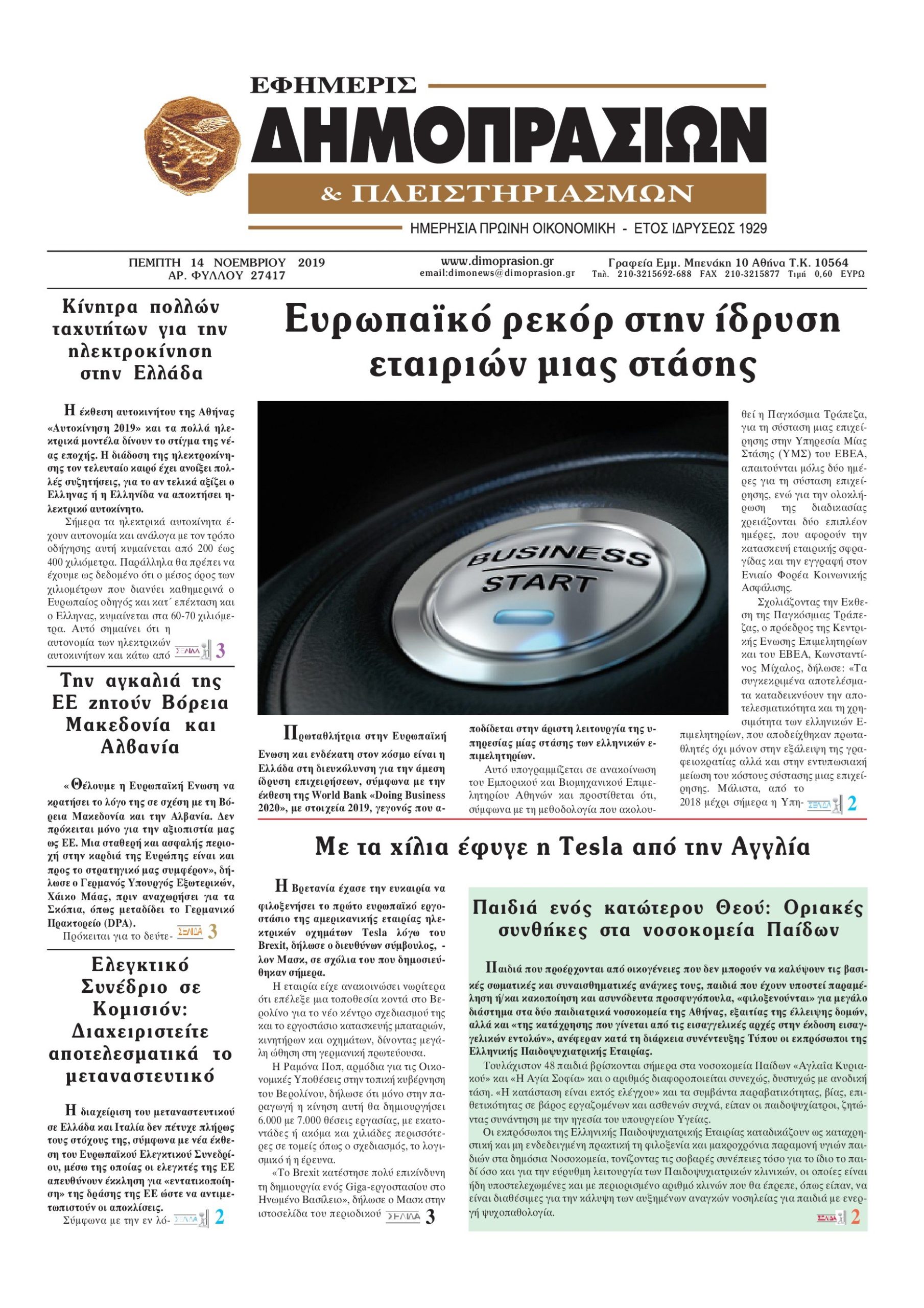 Οι οικονομικές εφημερίδες 14/11/19 Διονύσης Νίκκας 06:45, Πέμπτη 14 Νοεμβρίου 2019 Media Διαβάστε τα πρωτοσέλιδα των οικονομικών εφημερίδων… ΕΦΗΜΕΡΙΔΕΣ ΟΙΚΟΝΟΜΙΚΕΣ Μοιράσου το: σχολίασε κι εσύ (0 σχόλια) Ακολουθήστε το enikos.gr στο Google News και μάθετε πρώτοι όλες τις ειδήσεις Δείτε όλες τις τελευταίες ειδήσεις από την Ελλάδα και τον Κόσμο στο enikos.gr Ειδήσεις Ροή Ειδήσεων 7 ώρες πριν Μητσοτάκης: Αναγκαία η μεταρρύθμιση του πρωτογενούς τομέα – Τα 6 νέα μέτρα για το στεγαστικό και οι αναφορές σε «Ιθάκη» και «πολιτικούς του καναπέ» 6 ώρες πριν Δάνεια σε ελβετικό φράγκο: Τα βασικά σημεία της ρύθμισης – ανάσας για 40.000 δανειολήπτες – Αναλυτικός οδηγός με ερωτήσεις και απαντήσεις 6 ώρες πριν Κυψέλη: Εξιτήριο πήρε η 14χρονη μαθήτρια που μαχαιρώθηκε από την 16χρονη σε σχολείο – «Θέλω να βοηθήσω το παιδί, έχει μπλέξει με κακές παρέες» 6 ώρες πριν Τραμπ: Γιατί κατέθεσε τώρα την αγωγή κατά του BBC – Πώς η κίνησή του εξυπηρετεί το νέο δόγμα του για «αντίσταση» στην Ευρώπη, υπέρ των συντηρητικών 7 ώρες πριν ΟΠΕΚΕΠΕ – Παράνομες επιδοτήσεις: Ελεύθεροι με περιοριστικούς όρους και οι 7 κατηγορούμενοι που απολογήθηκαν σήμερα 6 ώρες πριν Ανακαλύφθηκε βυθισμένη πέτρινη κατασκευή ανοιχτά της Κριμαίας – Αποτελεί μέρος αρχαίας ελληνικής αποικίας 7 ώρες πριν Ύπνος: Αυτό μπορεί να είναι το χειρότερο λάθος για το βιολογικό ρολόι σας, σύμφωνα με ειδικό 8 ώρες πριν Αριθμολογία: Οι άνθρωποι που έχουν γεννηθεί αυτές τις 3 ημερομηνίες, προσελκύουν μεγάλη τύχη πριν από το τέλος του 2025 10 ώρες πριν Οι 7 συμπεριφορές που μαρτυρούν ότι ένας άνδρας επενδύει μακροπρόθεσμα σε μια σχέση 11 λεπτά πριν Ελένη Καρακάση: «Ένιωθα πολύ αδικημένη, δεν μπορούσα να ελέγξω τον εαυτό μου σε δύσκολες στιγμές» 19 λεπτά πριν Κλαούδια Σέινμπαουμ προς Ντόναλντ Τραμπ για φαιντανύλη: Να επιτεθούμε στα αίτια κατανάλωσης αντί να την κατατάσσουμε στα «όπλα μαζικής καταστροφής» 27 λεπτά πριν Ρωσία: Ουκρανική επίθεση με drones στο Κρασνοντάρ – Δύο τραυματίες, ζημιές σε σπίτια και διακοπή ρεύματος 35 λεπτά πριν Αντόνιο Ταγιάνι: Νομικά εμπόδια για τη χρήση των ρωσικών κεφαλαίων υπέρ της Ουκρανίας 43 λεπτά πριν Pornhub: «Χτυπήθηκε» από χάκερς -Υπέκλεψαν ευαίσθητα δεδομένα από premium χρήστες ENIKOS NETWORK Αίτημα ΙΣΑ για την εξαίρεση των προσωπικών γιατρών από τις κατ’ οίκον επισκέψεις Η σκανδιναβική μέθοδος στον ύπνο που μπορεί να σώσει έναν γάμο Πιερρακάκης: Ο προϋπολογισμός συμβάλλει ουσιαστικά στην ενίσχυση της αγοραστικής δύναμης της πλειονότητας των εργαζομένων e-ΕΦΚΑ: Παρατείνεται η προθεσμία για την υποβολή ΑΠΔ – Ποιους αφορά Σύγχρονος Νοστράδαμος: Προειδοποιεί για «μεγάλο γεγονός» τους επόμενους μήνες που θα συγκλονίσει τη Βρετανία και τον κόσμο Τεστ παρατηρητικότητας: Μπορείτε να βρείτε τις 3 διαφορές στις εικόνες με έναν πιγκουίνο σε 14 δευτερόλεπτα περισσότερα 20:06 , Τρίτη 16 Δεκεμβρίου 2025 Ο ΣΚΑΙ καταγγέλλει τον ΕΚΚΟΜΕΔ Επιστολή με την οποία καταγράφει την έντονη διαμαρτυρία του προς τον διευθύνοντα σύμβουλο του... 17:40 , Τρίτη 16 Δεκεμβρίου 2025 Eurovision: Στις 4 Ιανουαρίου αποκαλύπτονται τα 28 τραγούδια του ελληνικού τελικού Η αγωνία τελειώνει, η γιορτή της Eurovision αρχίζει στην ΕΡΤ από τις πρώτες ημέρες της νέας χρ... 17:09 , Τρίτη 16 Δεκεμβρίου 2025 Alter Ego Media: Βαθύτατη θλίψη και ειλικρινή συλλυπητήρια για την απώλεια της Ειρήνης Μαρινάκη Τη βαθύτατη θλίψη και τα ειλικρινή συλλυπητήριά της εκφράζει η Alter Ego Media για τον θάνατο ... 13:00 , Τρίτη 16 Δεκε