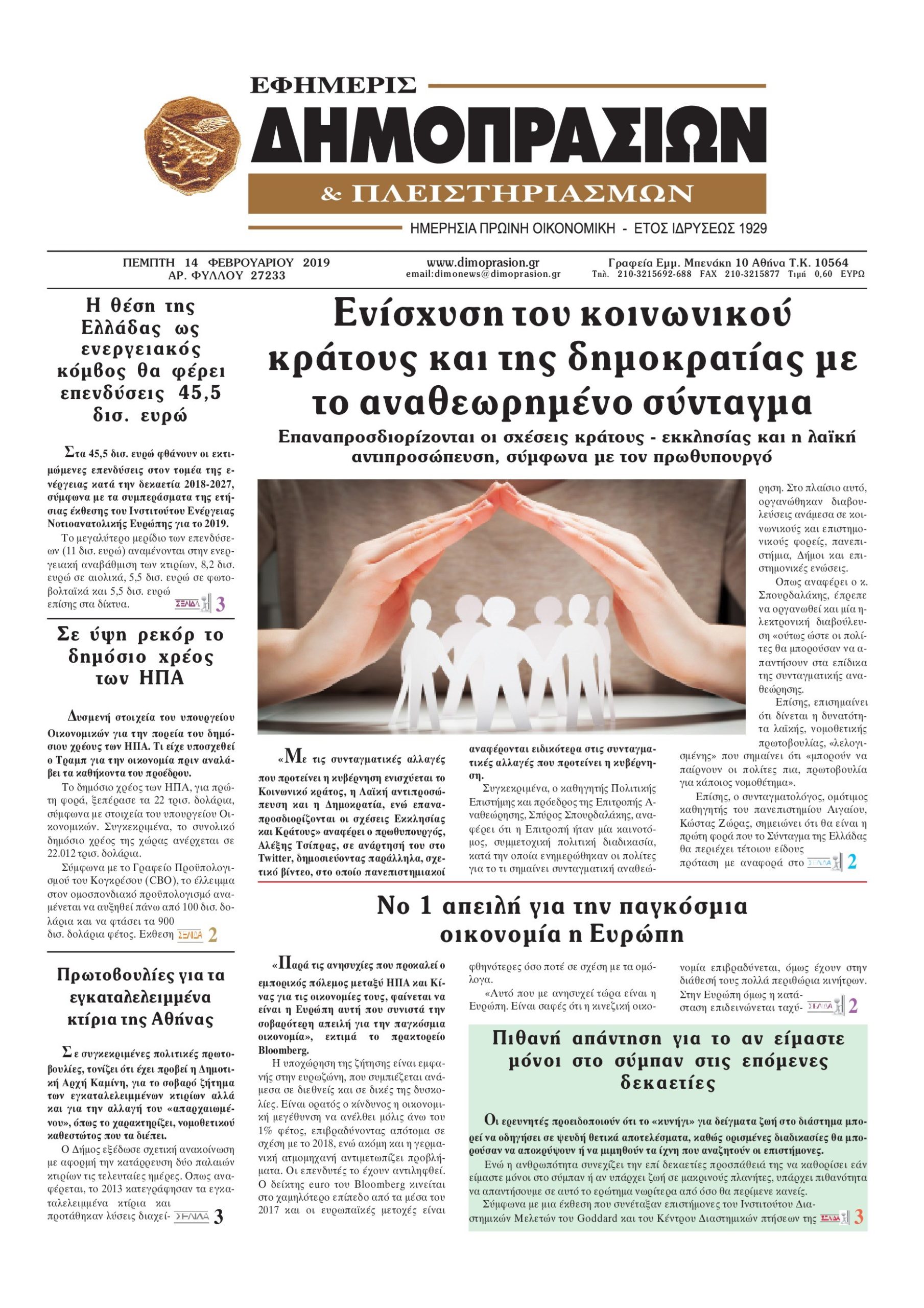 Οι οικονομικές εφημερίδες 14/2/19 Enikos Newsroom 06:49, Πέμπτη 14 Φεβρουαρίου 2019 Media Διαβάστε τα πρωτοσέλιδα των οικονομικών εφημερίδων: ΟΙΚΟΝΟΜΙΚΕΣ ΕΦΗΜΕΡΙΔΕΣ ΠΡΩΤΟΣΕΛΙΔΑ Μοιράσου το: σχολίασε κι εσύ (0 σχόλια) Ακολουθήστε το enikos.gr στο Google News και μάθετε πρώτοι όλες τις ειδήσεις Δείτε όλες τις τελευταίες ειδήσεις από την Ελλάδα και τον Κόσμο στο enikos.gr Ειδήσεις Ροή Ειδήσεων 1 ώρα πριν Ευρωπαϊκή Ένωση: Συμφωνία για δάνειο 90 δισ. ευρώ στην Ουκρανία τη διετία 2026-2027 6 ώρες πριν ΟΠΕΚΕΠΕ: Προφυλακιστέος ο φερόμενος αρχηγός και ο λογιστής της εγκληματικής οργάνωσης 7 ώρες πριν Αυξάνουν την πίεση προς την κυβέρνηση οι αγρότες: Κλείνουν παρακαμπτήριους και ανοίγουν διόδια – Τι θα γίνει τις γιορτές 7 ώρες πριν Φοινικούντα: Το Σάββατο απολογείται ο 30χρονος γιος γνωστού επιχειρηματία της Πλάκας που παραδόθηκε – Όσα είπε στους αστυνομικούς και ο ρόλος του στο έγκλημα 5 ώρες πριν ΑΕΚ – Κραϊόβα 3-2: Επική ανατροπή και πρόκριση στους «16» του Conference League η Ένωση 6 ώρες πριν Αρχαιολόγοι ανακάλυψαν ρωμαϊκά τεχνουργήματα από μια πόλη που δεν υπήρξε ποτέ – Τα τρία εντυπωσιακά κτίρια και ο αμφορέας με τις… σαρδέλες 7 ώρες πριν Ύπνος: Η απλή βραδινή ρουτίνα για να προστατεύσετε τα μαλλιά σας από το κρύο κατά τη διάρκεια του χειμώνα 8 ώρες πριν Manifesting: Πώς να συναντήσετε τον σύντροφο της ζωής σας, ανάλογα με τον μήνα γέννησής σας 2 ημέρες πριν 20 χρόνια τα Χριστούγεννα ξεκινούν στα Public με μεγάλη ποικιλία σε δώρα! 6 λεπτά πριν Η TikTok στις ΗΠΑ πωλείται σε Oracle, Silver Lake και MGX – Οι λεπτομέρειες του «deal» 14 λεπτά πριν Αλεξάντερ Λουκασένκο: Η Λευκορωσία βρίσκεται κοντά στην αποκατάσταση των σχέσεών της με τις ΗΠΑ 29 λεπτά πριν Αυστραλία: Κήρυξε την Κυριακή (21/12) ημέρα εθνικού πένθους για τη φονική επίθεση στην παραλία Μπόνταϊ 39 λεπτά πριν Ρόδος: Δάσκαλος καράτε καταδικάστηκε για ασέλγεια σε ανήλικες αθλήτριες – Μαρτυρίες για αγγίγματα σε ευαίσθητα σημεία 54 λεπτά πριν Γουατεμάλα: Εξαρθρώθηκε κύκλωμα διακίνησης μεταναστών προς τις ΗΠΑ – Συνελήφθησαν 14 άτομα ENIKOS NETWORK Σε περίοδο αυξημένης δραστηριότητας η γρίπη στην Ελλάδα-Μέτρα προστασίας από τον ΕΟΔΥ Σκέφτεστε συνέχεια συζητήσεις που έχετε κάνει; Τι σημαίνει αυτό, σύμφωνα με ειδικό Στεγαστικό: Τι λέει η ΠΟΜΙΔΑ για τα νέα μέτρα που ανακοίνωσε ο Κυριάκος Μητσοτάκης Λαγκάρντ: Αισιόδοξη για την ανάπτυξη της Ευρωζώνης, αβέβαιη για τον πληθωρισμό Χαρτογραφώντας το «σημείο χωρίς επιστροφή»: Για πρώτη φορά αποκαλύπτεται με λεπτομέρεια το ακανθώδες όριο της ατμόσφαιρας τ... Η Google καταργεί τη λειτουργία «dark web report» – Πώς θα μπορούν οι χρήστες να διαγράφουν τα δεδομένα τους περισσότερα 02:50 , Παρασκευή 19 Δεκεμβρίου 2025 GNTM: «Κλείδωσαν» οι τέσσερις φιναλίστ – Μεγάλη ανατροπή στις τελευταίες αποχωρήσεις Για προτελευταία φορά εμφανίστηκαν στο πλατό του GNTM οι φιναλίστ του φετινού κύκλου, το βράδυ... 17:45 , Πέμπτη 18 Δεκεμβρίου 2025 ROUK ZOUK: Εορταστικό επεισόδιο με καλεσμένους τους πρωταγωνιστές του «Γιατί ρε πατέρα» Το Σάββατο 20 Δεκεμβρίου στις 21:00, η Ζέτα Μακρυπούλια υποδέχεται εκλεκτούς ηθοποιούς που όλο... 17:20 , Πέμπτη 18 Δεκεμβρίου 2025 Άγιος έρωτας: Η Χριστίνα εξομολογείται στον πατέρα Νικόλαο, απόψε στις 21:00 στον Alpha Η Νότα αποφασίζει να εκδικηθεί τον Πέτρο και τον Στέφανο, για χάρη του Λούη, όμως τα πράγματα ... 16:50 , Πέμπτη 18 Δεκεμβρίου 2025 Να μ’ αγαπάς: Ζωή και Φωτεινή συμφιλιώνονται ως μάνα με κόρη, απόψε στις 20:00 Η ταυτότητα του Άγγελου αποκαλύπτεται στο νέο επεισό