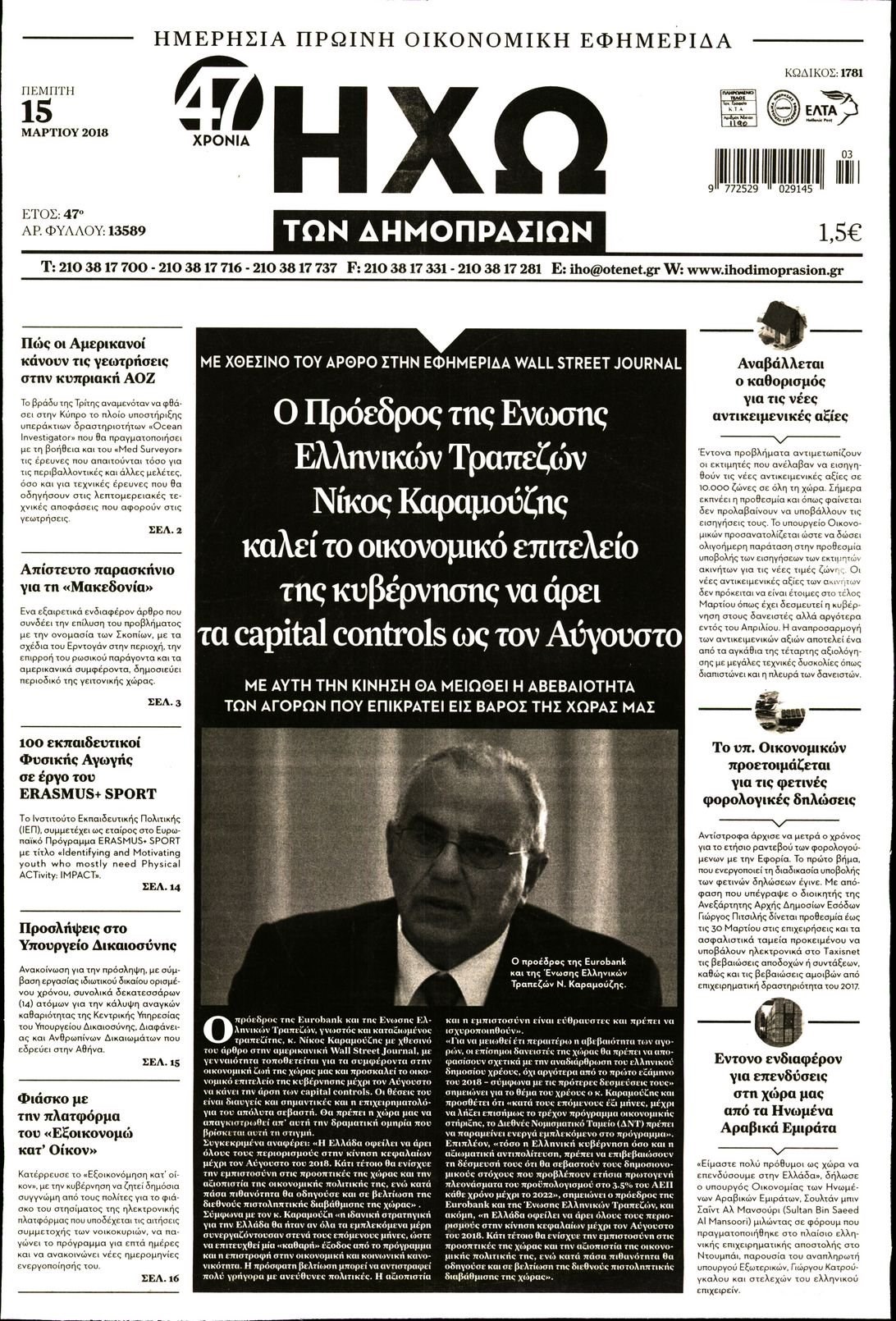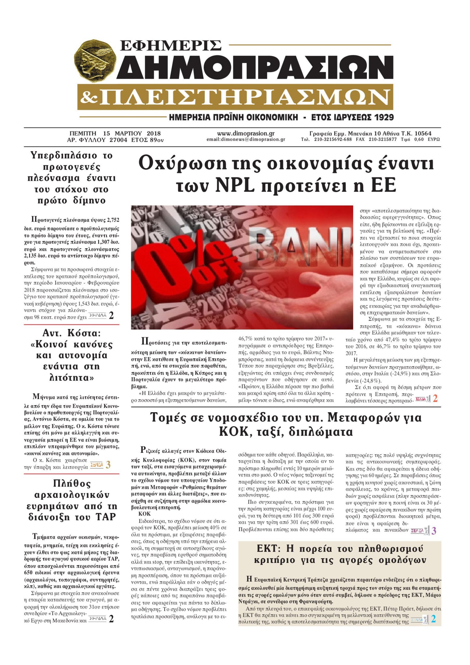 Οι οικονομικές εφημερίδες 15/3/2018 Enikos Newsroom 07:19, Πέμπτη 15 Μαρτίου 2018 Media Διαβάστε τα σημερινά πρωτοσέλιδα των οικονομικών εφημερίδων: ΟΙΚΟΝΟΜΙΚΕΣ ΕΦΗΜΕΡΙΔΕΣ ΠΡΩΤΟΣΕΛΙΔΑ Μοιράσου το: σχολίασε κι εσύ (0 σχόλια) Ακολουθήστε το enikos.gr στο Google News και μάθετε πρώτοι όλες τις ειδήσεις Δείτε όλες τις τελευταίες ειδήσεις από την Ελλάδα και τον Κόσμο στο enikos.gr Ειδήσεις Ροή Ειδήσεων 4 ώρες πριν Αγρότες: «Όχι στον διάλογο, μας εμπαίζει η κυβέρνηση» – Αποφάσισαν κλιμάκωση των κινητοποιήσεων, τι θα γίνει τα Χριστούγεννα 1 ώρα πριν Αθήνα: Εξαρθρώθηκε εγκληματική οργάνωση που διακινούσε ναρκωτικά σε μορφή σοκολάτας – Δύο τράπερ ανάμεσα στους 4 συλληφθέντες – ΒΙΝΤΕΟ 2 ώρες πριν Στη φυλακή ο «Έλληνας Εσκομπάρ» και τρεις συνεργοί του για το φορτίο με την κοκαΐνη – Τι υποστήριξε στην απολογία του 3 ώρες πριν Γιώργος Μαζωνάκης: «Έχει υποστεί ένα σωρό εκβιαστικές πρακτικές – Του είπαν ότι θα του βάλουν τον συγκεκριμένο άνθρωπο να τον καταγγείλει» 1 ώρα πριν Γεωργιάδης για Κωνσταντοπούλου: «Έχει καταφέρει να ξεπεράσει ακόμη και τον εαυτό της – Το ερώτημα είναι “γιατί τώρα;”» 5 ώρες πριν Τα 5 ζώδια που θα ευνοηθούν στα οικονομικά τους το 2026 – «Τραβούν το χρήμα σαν μαγνήτες» 2 ώρες πριν Γάμος: 11 ψυχρές αλλά ευγενικές φράσεις, που λέει ένας άνδρας όταν σκέφτεται τον χωρισμό 1 ώρα πριν Σφουγγάρισμα: Η συνήθεια που θα σας βοηθήσει να διατηρήσετε το σπίτι σας καθαρό και τακτοποιημένο 1 ημέρα πριν 20 χρόνια τα Χριστούγεννα ξεκινούν στα Public με μεγάλη ποικιλία σε δώρα! 6 λεπτά πριν Δημοσκόπηση Metron Analysis: Στις 10 μονάδες η διαφορά ΝΔ-ΠΑΣΟΚ, στην 3η θέση η Πλεύση Ελευθερίας – 8 στους 10 στηρίζουν τον αγώνα των αγροτών 12 λεπτά πριν Ολυμπιακός: Τι ζήτησε από τον Άγιο Βασίλη ο Χοσέ Λουίς Μεντιλίμπαρ 17 λεπτά πριν Manifesting: Πώς να συναντήσετε τον σύντροφο της ζωής σας, ανάλογα με τον μήνα γέννησής σας 26 λεπτά πριν Hellenic Train: Καθυστερήσεις στον Προαστιακό λόγω φωτιάς κοντά στη σιδηροδρομική γραμμή 38 λεπτά πριν ΗΠΑ: Νέες φωτογραφίες από τον φάκελο Επστάιν έδωσαν στην δημοσιότητα οι Δημοκρατικοί ENIKOS NETWORK Σε περίοδο αυξημένης δραστηριότητας η γρίπη στην Ελλάδα-Μέτρα προστασίας από τον ΕΟΔΥ Σκέφτεστε συνέχεια συζητήσεις που έχετε κάνει; Τι σημαίνει αυτό, σύμφωνα με ειδικό Servicers: Μικρή μείωση στα κόκκινα δάνεια που διαχειρίζονται – Αναλυτικά τα στοιχεία ΑΑΔΕ: “Αλλάζει πρόσωπο” το Φορολογικό Μητρώο για πολίτες και επιχειρήσεις – Όλες οι λεπτομέρειες Χαρτογραφώντας το «σημείο χωρίς επιστροφή»: Για πρώτη φορά αποκαλύπτεται με λεπτομέρεια το ακανθώδες όριο της ατμόσφαιρας τ... Η Google καταργεί τη λειτουργία «dark web report» – Πώς θα μπορούν οι χρήστες να διαγράφουν τα δεδομένα τους περισσότερα 17:45 , Πέμπτη 18 Δεκεμβρίου 2025 ROUK ZOUK: Εορταστικό επεισόδιο με καλεσμένους τους πρωταγωνιστές του «Γιατί ρε πατέρα» Το Σάββατο 20 Δεκεμβρίου στις 21:00, η Ζέτα Μακρυπούλια υποδέχεται εκλεκτούς ηθοποιούς που όλο... 17:20 , Πέμπτη 18 Δεκεμβρίου 2025 Άγιος έρωτας: Η Χριστίνα εξομολογείται στον πατέρα Νικόλαο, απόψε στις 21:00 στον Alpha Η Νότα αποφασίζει να εκδικηθεί τον Πέτρο και τον Στέφανο, για χάρη του Λούη, όμως τα πράγματα ... 16:50 , Πέμπτη 18 Δεκεμβρίου 2025 Να μ’ αγαπάς: Ζωή και Φωτεινή συμφιλιώνονται ως μάνα με κόρη, απόψε στις 20:00 Η ταυτότητα του Άγγελου αποκαλύπτεται στο νέο επεισόδιο της σειράς “Να μ’ αγαπάς... 15:52 , Πέμπτη 18 Δεκεμβρίου 2025 Το Σπίτι Δίπλα Στο Ποτάμι: Το καθηλωτικό τελευταίο επεισόδιο για το 2025 απόψε στις 22:30 Καθηλώνε