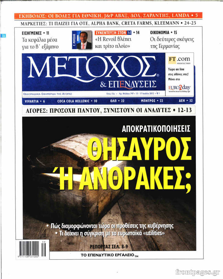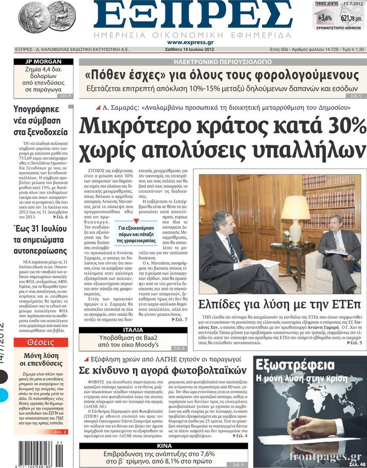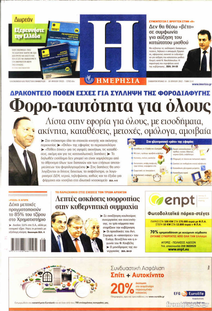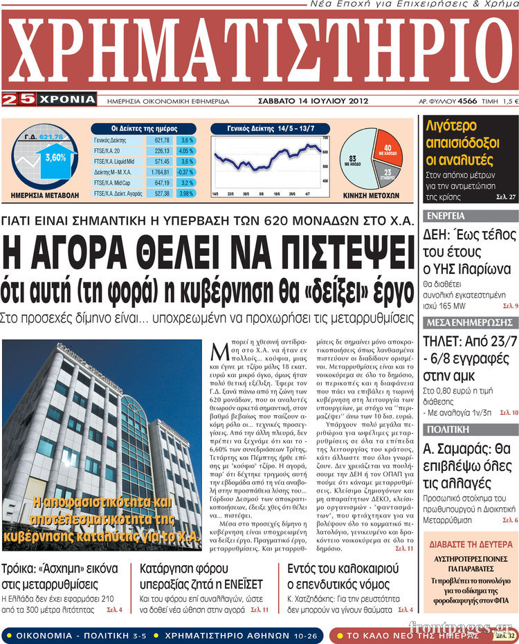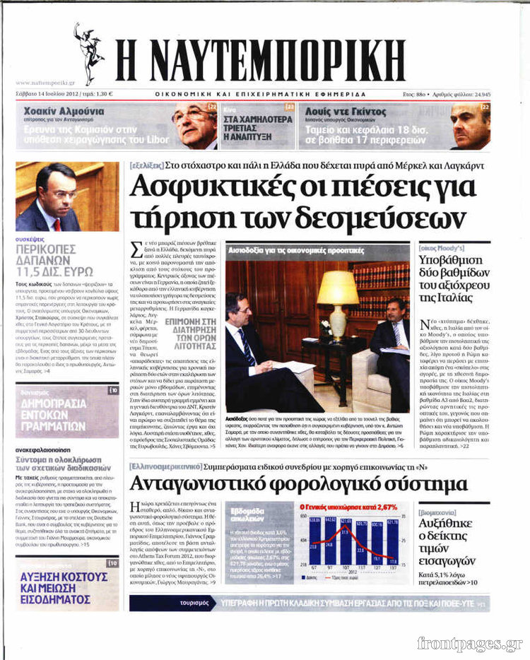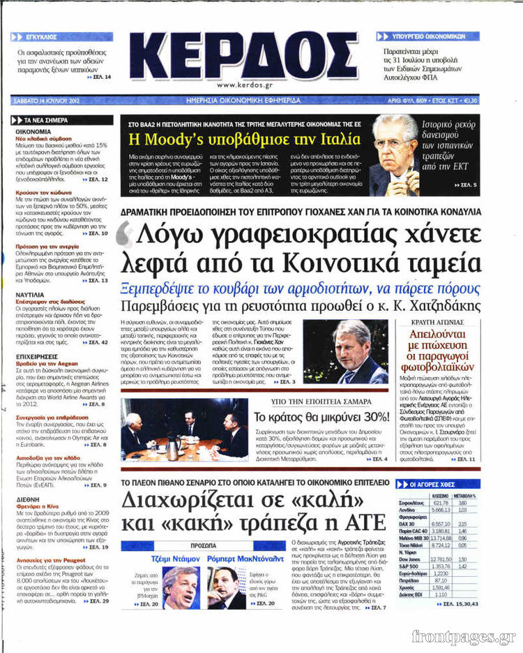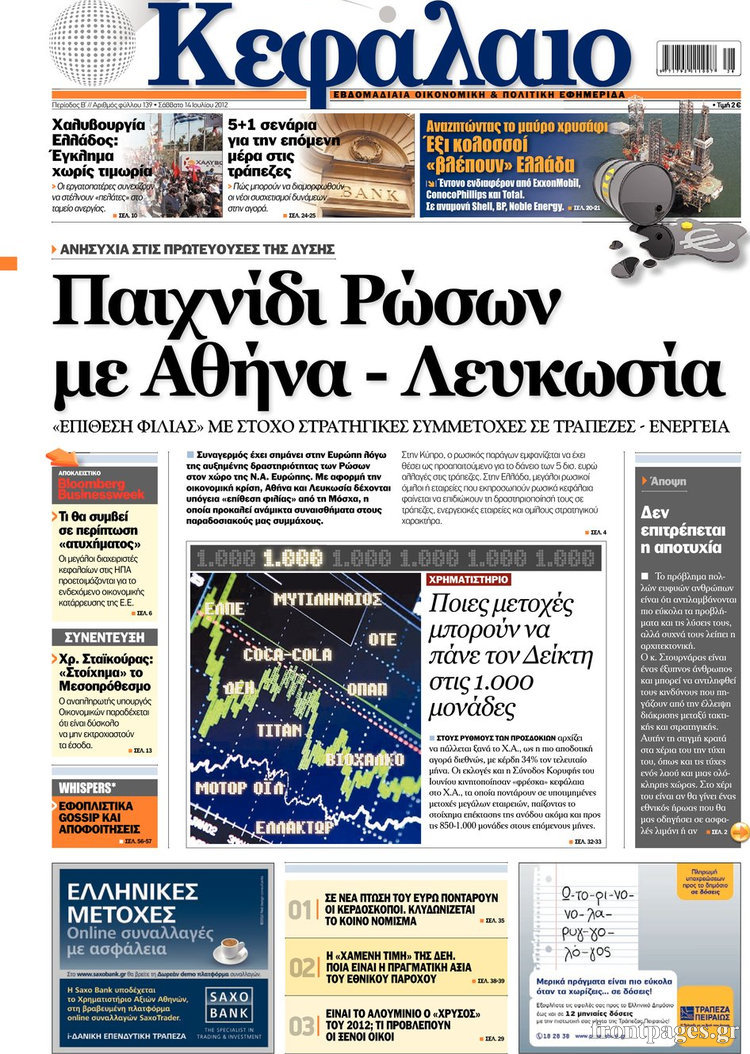 Οι οικονομικές εφημερίδες Enikos Newsroom 10:20, Σάββατο 14 Ιουλίου 2012 Media ΕΦΗΜΕΡΙΔΕΣ Μοιράσου το: σχολίασε κι εσύ (0 σχόλια) Ακολουθήστε το enikos.gr στο Google News και μάθετε πρώτοι όλες τις ειδήσεις Δείτε όλες τις τελευταίες ειδήσεις από την Ελλάδα και τον Κόσμο στο enikos.gr Ειδήσεις Ροή Ειδήσεων 5 ώρες πριν Χριστούγεννα στα μπλόκα: Επιμένουν στις κινητοποιήσεις τους οι αγρότες – Ανοίγουν τα διόδια το Σαββατοκύριακο 5 ώρες πριν Ουκρανία: Η άνευ προηγουμένου επίθεση σε ρωσικό τάνκερ στη Μεσόγειο και το μήνυμα προς στον Πούτιν – Το «μακρύ χέρι» του Κιέβου 4 ώρες πριν Πούτιν: Τα μηνύματα σε Ευρώπη και ΝΑΤΟ από το μαραθώνιο «σόου» του – Η απαίτηση για «σεβασμό» και η ειρήνη «με τους όρους» της Μόσχας 5 ώρες πριν Τραμπ: Δεν αποκλείει την πιθανότητα ενός πολέμου στη Βενεζουέλα – «Ο Μαδούρο ξέρει καλύτερα από τον καθένα τι ακριβώς θέλω» 6 ώρες πριν Συνεχίζει να προκαλεί ο Μίτσκοσκι: «Για μένα το όνομα Μακεδονία είναι ιερό» 5 ώρες πριν Ανακαλύφθηκαν αρχαία χρυσά νομίσματα 2.200 ετών που απεικονίζουν τον θεό Απόλλωνα – Η άγνωστη σύνδεση με τον Φίλιππο Β΄ της Μακεδονίας 6 ώρες πριν Ύπνος: Μια κρυφή κατάσταση του εγκεφάλου πριν από τον ύπνο μπορεί να είναι το “κλειδί” για υψηλή ευφυΐα και δημιουργικότητα 7 ώρες πριν Αριθμολογία: Οι άνθρωποι που έχουν γεννηθεί αυτές τις 4 ημερομηνίες, συχνά παρεξηγούνται – «Η καλοσύνη τους κρύβει τεράστια δύναμη» 8 ώρες πριν Ξεχάστε το καθάρισμα το Σαββατοκύριακο: Ο «κανόνας των 20 λεπτών» που θα σας λύσει τα χέρια 11 λεπτά πριν Ταμίλα Κουλίεβα: «Δεν θέλω να είμαι κάποια που πορεύεται συνεχώς με τις ίδιες αναφορές» 26 λεπτά πριν Η Ελλάδα προσχωρεί στη Διεθνή Επιτροπή Αποζημιώσεων για την Ουκρανία 40 λεπτά πριν GNTM: Η Ξένια Τσίρκοβα αναδείχθηκε μεγάλη νικήτρια και πήρε τις 50.000 ευρώ – Ποιος βρέθηκε σε απόσταση αναπνοής; 55 λεπτά πριν Θεσσαλονίκη: Εξαφανίστηκε 13χρονος από χώρο φιλοξενίας ασυνόδευτων ανηλίκων στο Ωραιόκαστρο 1 ώρα πριν Ντόναλντ Τραμπ: «Πολύ βαριά αντίποινα» στη Συρία – «Πλήττουμε πολύ δυνατά οχυρά του Ισλαμικού Κράτους» ENIKOS NETWORK Το ΕΚΑΒ τιμήθηκε από την Ακαδημία Αθηνών για τα 40 χρόνια προσφοράς του Έχετε πραγματικά μεγάλη καρδιά; 10 χαρακτηριστικά όσων έχουν καλοσύνη Αναστολή μέτρων αναγκαστικής εκτέλεσης για κτηνοτρόφους που πλήττονται από την ευλογιά των αιγοπροβάτων Πλήρης επάρκεια προϊόντων στις λαϊκές της Αττικής, παρά τις αγροτικές κινητοποιήσεις – Τι απαντούν οι πωλητές Χαρτογραφώντας το «σημείο χωρίς επιστροφή»: Για πρώτη φορά αποκαλύπτεται με λεπτομέρεια το ακανθώδες όριο της ατμόσφαιρας τ... Η Google καταργεί τη λειτουργία «dark web report» – Πώς θα μπορούν οι χρήστες να διαγράφουν τα δεδομένα τους περισσότερα 02:50 , Σάββατο 20 Δεκεμβρίου 2025 GNTM: Η Ξένια Τσίρκοβα αναδείχθηκε μεγάλη νικήτρια και πήρε τις 50.000 ευρώ – Ποιος βρέθηκε σε απόσταση αναπνοής; Με φαντασμαγορικό τρόπο ολοκληρώθηκε το βράδυ της Παρασκευής ο μεγάλος τελικός του GNTM, μέσα ... 22:42 , Παρασκευή 19 Δεκεμβρίου 2025 Γιώργος Γιαννόπουλος για “Το σόι σου”: “Είναι ευτυχία και ευλογία αυτή η σειρά” «Είναι ευτυχία και ευλογία η συγκυρία αυτής της σειράς», θα πει ο Γιώργος Γιαννόπουλος -ο αγαπ... 20:37 , Παρασκευή 19 Δεκεμβρίου 2025 Don’t Forget The Lyrics: Η Έλλη Κοκκίνου υποδέχεται 4 παίκτες που θα κάνουν τα πάντα για να μη χάσουν ούτε… μισή λέξη από τους στίχους Το «Don’t Forget The Lyrics» επιστρέφει απόψε, Παρασκευή 19 Δεκεμβρίου, στις 21:00 με νέο επει... 19:31 , Παρασκευή 19 Δεκεμβρίου 2025 GNTM: Απόψε ο μ