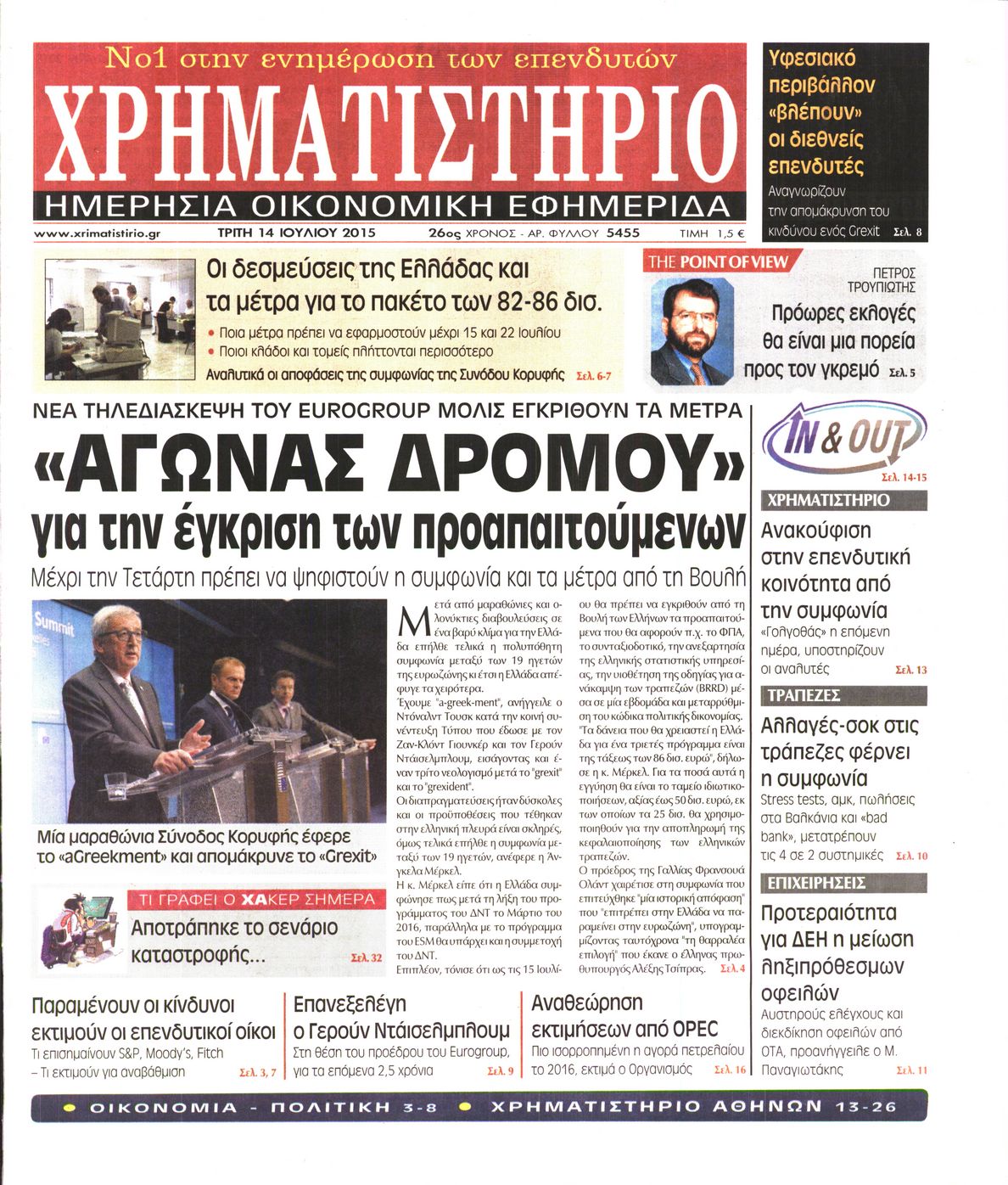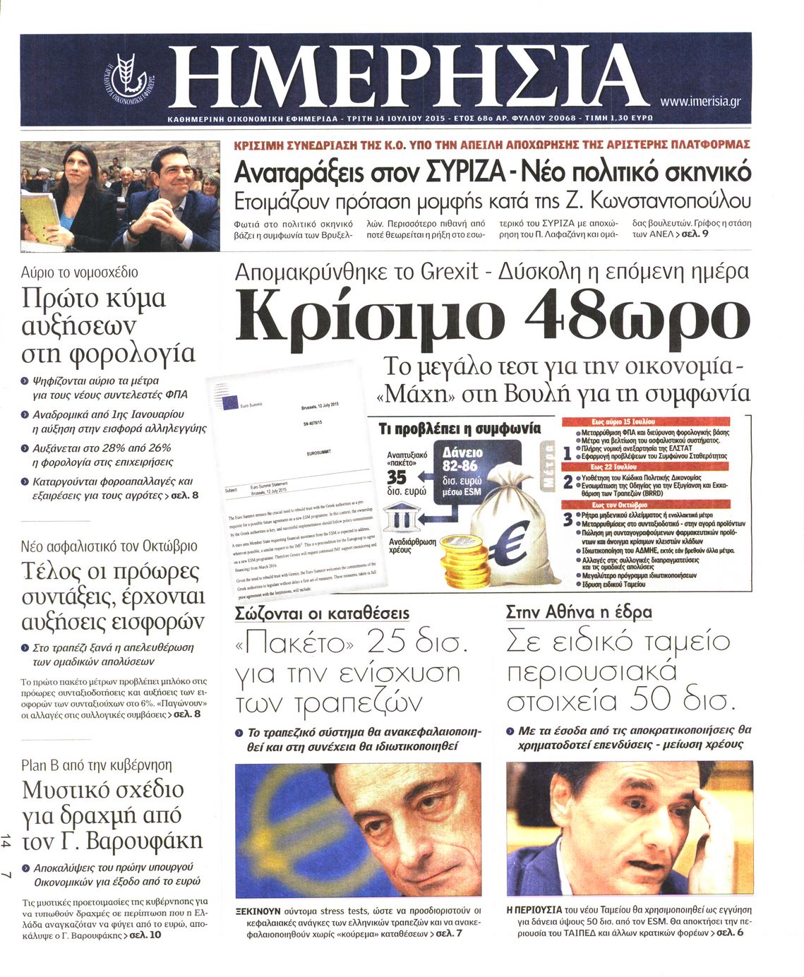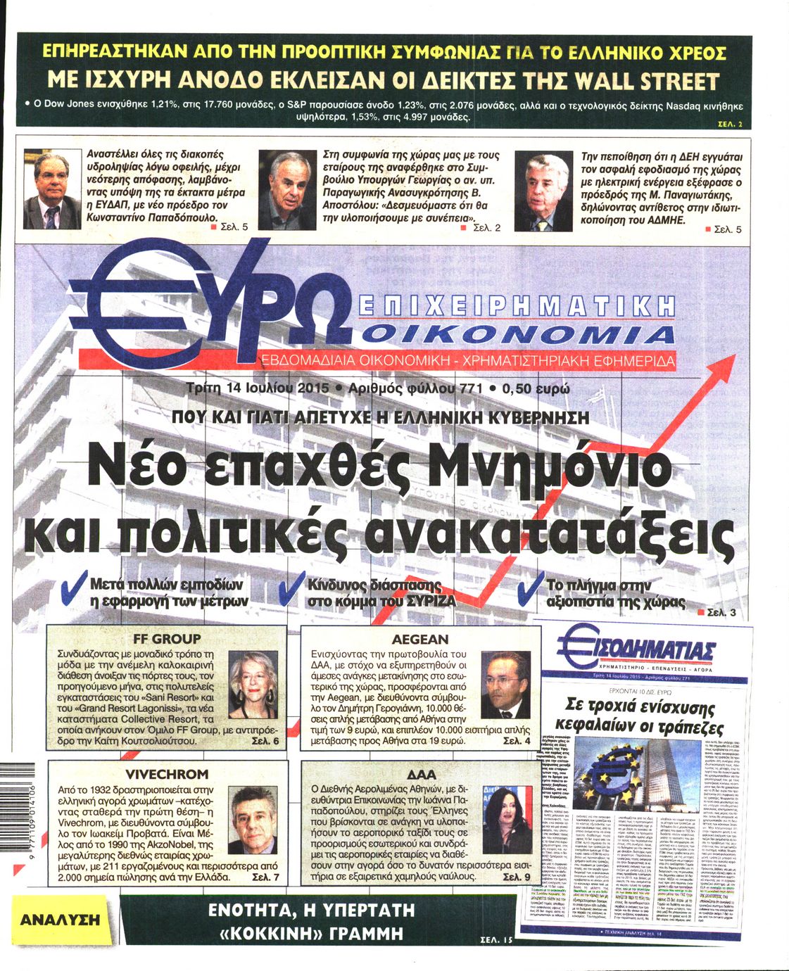 Οι οικονομικές εφημερίδες 14/7/2015 Enikos Newsroom 06:15, Τρίτη 14 Ιουλίου 2015 Media Διαβάστε τα σημερινά πρωτοσέλιδα των οικονομικών εφημερίδων: ΟΙΚΟΝΟΜΙΚΕΣ ΕΦΗΜΕΡΙΔΕΣ ΠΡΩΤΟΣΕΛΙΔΑ Μοιράσου το: σχολίασε κι εσύ (0 σχόλια) Ακολουθήστε το enikos.gr στο Google News και μάθετε πρώτοι όλες τις ειδήσεις Δείτε όλες τις τελευταίες ειδήσεις από την Ελλάδα και τον Κόσμο στο enikos.gr Ειδήσεις Ροή Ειδήσεων 6 ώρες πριν Μητσοτάκης: Αναγκαία η μεταρρύθμιση του πρωτογενούς τομέα – Τα 6 νέα μέτρα για το στεγαστικό και οι αναφορές σε «Ιθάκη» και «πολιτικούς του καναπέ» 5 ώρες πριν Δάνεια σε ελβετικό φράγκο: Τα βασικά σημεία της ρύθμισης – ανάσας για 40.000 δανειολήπτες – Αναλυτικός οδηγός με ερωτήσεις και απαντήσεις 4 ώρες πριν Κυψέλη: Εξιτήριο πήρε η 14χρονη μαθήτρια που μαχαιρώθηκε από την 16χρονη σε σχολείο – «Θέλω να βοηθήσω το παιδί, έχει μπλέξει με κακές παρέες» 4 ώρες πριν Τραμπ: Γιατί κατέθεσε τώρα την αγωγή κατά του BBC – Πώς η κίνησή του εξυπηρετεί το νέο δόγμα του για «αντίσταση» στην Ευρώπη, υπέρ των συντηρητικών 5 ώρες πριν ΟΠΕΚΕΠΕ – Παράνομες επιδοτήσεις: Ελεύθεροι με περιοριστικούς όρους και οι 7 κατηγορούμενοι που απολογήθηκαν σήμερα 4 ώρες πριν Ανακαλύφθηκε βυθισμένη πέτρινη κατασκευή ανοιχτά της Κριμαίας – Αποτελεί μέρος αρχαίας ελληνικής αποικίας 5 ώρες πριν Ύπνος: Αυτό μπορεί να είναι το χειρότερο λάθος για το βιολογικό ρολόι σας, σύμφωνα με ειδικό 6 ώρες πριν Αριθμολογία: Οι άνθρωποι που έχουν γεννηθεί αυτές τις 3 ημερομηνίες, προσελκύουν μεγάλη τύχη πριν από το τέλος του 2025 8 ώρες πριν Οι 7 συμπεριφορές που μαρτυρούν ότι ένας άνδρας επενδύει μακροπρόθεσμα σε μια σχέση 14 λεπτά πριν Νίκος Πλακιάς: Η Μαρία Καρυστιανού πλέον θα κρίνεται ως πολιτικός και όχι ως συγγενής 30 λεπτά πριν Ντόναλντ Τραμπ: Κάλυψε απόλυτα την προσωπάρχη του Λευκού Οίκου: «Ναι, έχω προσωπικότητα αλκοολικού» 44 λεπτά πριν ΗΠΑ: Στην αγορά δύο Boeing 747-8 προχωρά η Πολεμική Αεροπορία για την υποστήριξη του προεδρικού στόλου 59 λεπτά πριν Ιταλία: Λεωφορείο έπεσε πάνω σε βιτρίνα καταστήματος στο Τορίνο – Τρεις τραυματίες 1 ώρα πριν Χαλάνδρι: Καθηγητής έπιασε με κόφτη τα δάχτυλα μαθητή σε κατάληψη – «Μου έχεις πιάσει το χέρι» ENIKOS NETWORK Αίτημα ΙΣΑ για την εξαίρεση των προσωπικών γιατρών από τις κατ’ οίκον επισκέψεις Η σκανδιναβική μέθοδος στον ύπνο που μπορεί να σώσει έναν γάμο Πιερρακάκης: Ο προϋπολογισμός συμβάλλει ουσιαστικά στην ενίσχυση της αγοραστικής δύναμης της πλειονότητας των εργαζομένων e-ΕΦΚΑ: Παρατείνεται η προθεσμία για την υποβολή ΑΠΔ – Ποιους αφορά Σύγχρονος Νοστράδαμος: Προειδοποιεί για «μεγάλο γεγονός» τους επόμενους μήνες που θα συγκλονίσει τη Βρετανία και τον κόσμο Τεστ παρατηρητικότητας: Μπορείτε να βρείτε τις 3 διαφορές στις εικόνες με έναν πιγκουίνο σε 14 δευτερόλεπτα περισσότερα 20:06 , Τρίτη 16 Δεκεμβρίου 2025 Ο ΣΚΑΙ καταγγέλλει τον ΕΚΚΟΜΕΔ Επιστολή με την οποία καταγράφει την έντονη διαμαρτυρία του προς τον διευθύνοντα σύμβουλο του... 17:40 , Τρίτη 16 Δεκεμβρίου 2025 Eurovision: Στις 4 Ιανουαρίου αποκαλύπτονται τα 28 τραγούδια του ελληνικού τελικού Η αγωνία τελειώνει, η γιορτή της Eurovision αρχίζει στην ΕΡΤ από τις πρώτες ημέρες της νέας χρ... 17:09 , Τρίτη 16 Δεκεμβρίου 2025 Alter Ego Media: Βαθύτατη θλίψη και ειλικρινή συλλυπητήρια για την απώλεια της Ειρήνης Μαρινάκη Τη βαθύτατη θλίψη και τα ειλικρινή συλλυπητήριά της εκφράζει η Alter Ego Media για τον θάνατο ... 13:00 , Τρίτη 16 Δεκεμβρίου 2025 «Στο Παρά Πέντε – 20 Χρόνια Μετά»: 