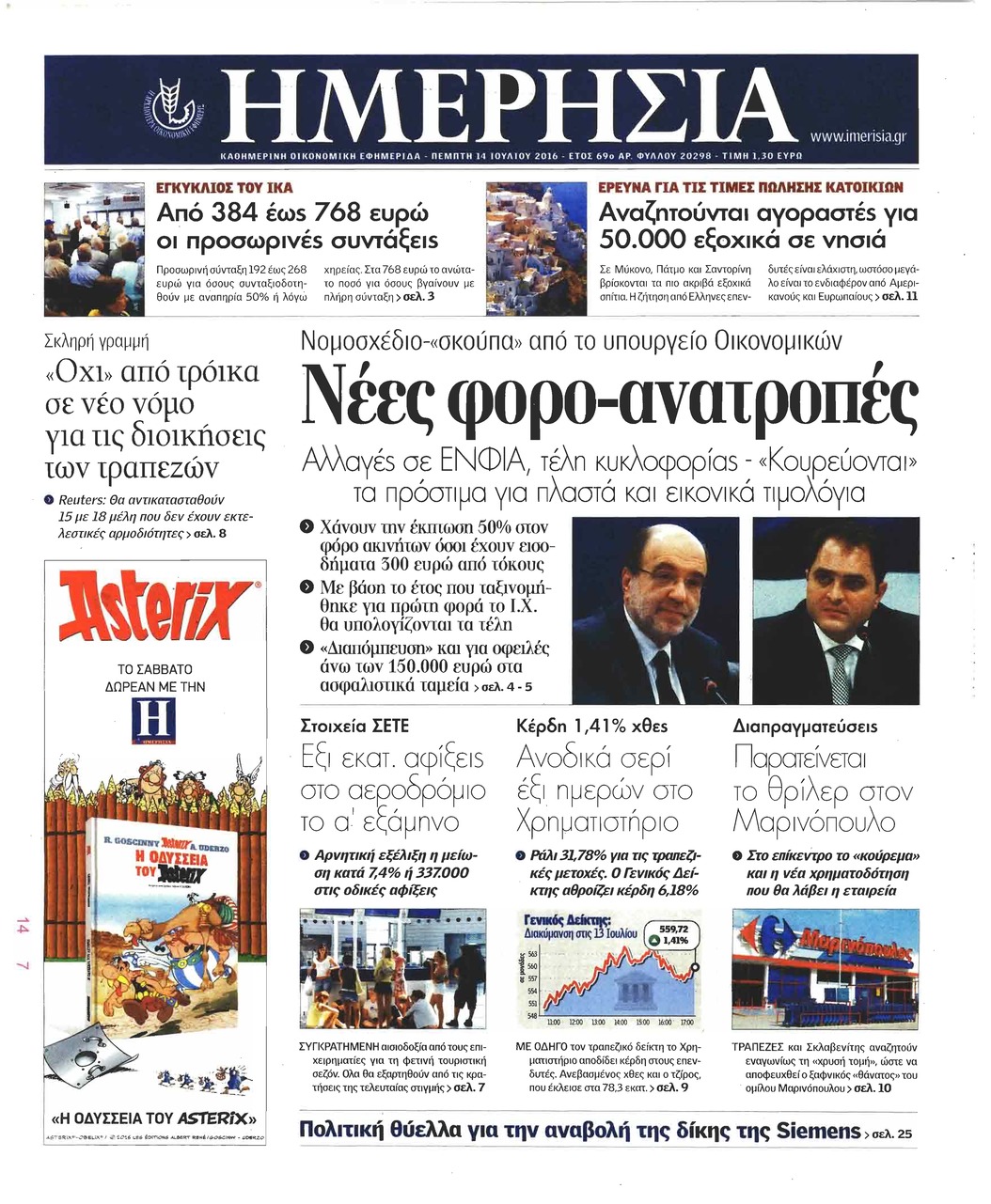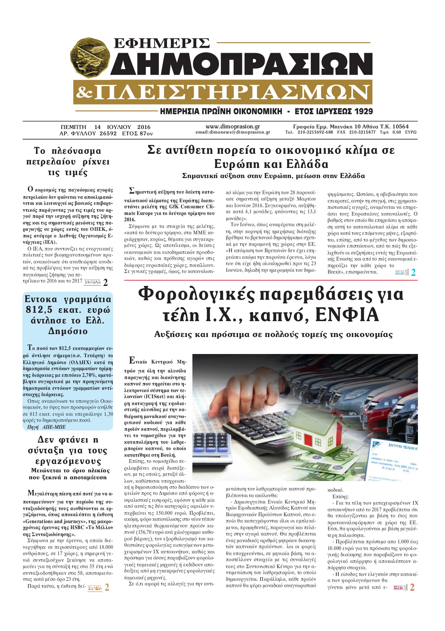Oι οικονομικές εφημερίδες 14/7/2016 Enikos Newsroom 06:06, Πέμπτη 14 Ιουλίου 2016 Media Διαβάστε τα σημερινά πρωτοσέλιδα των οικονομικών εφημερίδων: ΟΙΚΟΝΟΜΙΚΕΣ ΕΦΗΜΕΡΙΔΕΣ ΠΡΩΤΟΣΕΛΙΔΑ Μοιράσου το: σχολίασε κι εσύ (0 σχόλια) Ακολουθήστε το enikos.gr στο Google News και μάθετε πρώτοι όλες τις ειδήσεις Δείτε όλες τις τελευταίες ειδήσεις από την Ελλάδα και τον Κόσμο στο enikos.gr Ειδήσεις Ροή Ειδήσεων 2 ώρες πριν Κυριάκος Μητσοτάκης: «Κάποιοι αγρότες δεν αισθάνονται την ανάγκη να διαφωνήσουν με τις προτάσεις της κυβέρνησης, η Ευρώπη στέκεται στο πλευρό της Ουκρανίας» 7 ώρες πριν ΟΠΕΚΕΠΕ: Προφυλακιστέος ο φερόμενος αρχηγός και ο λογιστής της εγκληματικής οργάνωσης 8 ώρες πριν Αυξάνουν την πίεση προς την κυβέρνηση οι αγρότες: Κλείνουν παρακαμπτήριους και ανοίγουν διόδια – Τι θα γίνει τις γιορτές 8 ώρες πριν Φοινικούντα: Το Σάββατο απολογείται ο 30χρονος γιος γνωστού επιχειρηματία της Πλάκας που παραδόθηκε – Όσα είπε στους αστυνομικούς και ο ρόλος του στο έγκλημα 7 ώρες πριν ΑΕΚ – Κραϊόβα 3-2: Επική ανατροπή και πρόκριση στους «16» του Conference League η Ένωση 8 ώρες πριν Αρχαιολόγοι ανακάλυψαν ρωμαϊκά τεχνουργήματα από μια πόλη που δεν υπήρξε ποτέ – Τα τρία εντυπωσιακά κτίρια και ο αμφορέας με τις… σαρδέλες 9 ώρες πριν Ύπνος: Η απλή βραδινή ρουτίνα για να προστατεύσετε τα μαλλιά σας από το κρύο κατά τη διάρκεια του χειμώνα 10 ώρες πριν Manifesting: Πώς να συναντήσετε τον σύντροφο της ζωής σας, ανάλογα με τον μήνα γέννησής σας 2 ημέρες πριν 20 χρόνια τα Χριστούγεννα ξεκινούν στα Public με μεγάλη ποικιλία σε δώρα! 13 λεπτά πριν Απειλή για το Προϋπολογισμό τα ληξιπρόθεσμα χρέη των ιδιωτών προς την εφορία 13 λεπτά πριν Πέντε νεκροί σε πλήγματα των ΗΠΑ κατά δύο σκαφών που φέρεται να μετέφεραν ναρκωτικά στον Ανατολικό Ειρηνικό 22 λεπτά πριν ΕΥΔΑΠ: Αλλάζουν τα τιμολόγια του νερού 29 λεπτά πριν Οπτική ψευδαίσθηση: Μόνο αν έχεις αετίσια ματιά θα βρεις τον παπαγάλο σε 12 δευτερόλεπτα 36 λεπτά πριν Αθήνα: Βρέθηκε η 16χρονη που είχε εξαφανιστεί από τις 6 Δεκεμβρίου – Η ανακοίνωση από το «Χαμόγελο του Παιδιού» ENIKOS NETWORK Σε περίοδο αυξημένης δραστηριότητας η γρίπη στην Ελλάδα-Μέτρα προστασίας από τον ΕΟΔΥ Σκέφτεστε συνέχεια συζητήσεις που έχετε κάνει; Τι σημαίνει αυτό, σύμφωνα με ειδικό Στεγαστικό: Τι λέει η ΠΟΜΙΔΑ για τα νέα μέτρα που ανακοίνωσε ο Κυριάκος Μητσοτάκης Λαγκάρντ: Αισιόδοξη για την ανάπτυξη της Ευρωζώνης, αβέβαιη για τον πληθωρισμό Χαρτογραφώντας το «σημείο χωρίς επιστροφή»: Για πρώτη φορά αποκαλύπτεται με λεπτομέρεια το ακανθώδες όριο της ατμόσφαιρας τ... Η Google καταργεί τη λειτουργία «dark web report» – Πώς θα μπορούν οι χρήστες να διαγράφουν τα δεδομένα τους περισσότερα 05:48 , Παρασκευή 19 Δεκεμβρίου 2025 Οι οικονομικές εφημερίδες 19/12/2025 Διαβάστε τα πρωτοσέλιδα από τις οικονομικές εφημερίδες, σήμερα 19/12/2025. 05:43 , Παρασκευή 19 Δεκεμβρίου 2025 Οι αθλητικές εφημερίδες 19/12/2025 Διαβάστε τα πρωτοσέλιδα από τις αθλητικές εφημερίδες, σήμερα 19/12/2025. 05:38 , Παρασκευή 19 Δεκεμβρίου 2025 Οι πολιτικές εφημερίδες 19/12/2025 Διαβάστε τα πρωτοσέλιδα από τις πολιτικές εφημερίδες, σήμερα 19/12/2025. 02:50 , Παρασκευή 19 Δεκεμβρίου 2025 GNTM: «Κλείδωσαν» οι τέσσερις φιναλίστ – Μεγάλη ανατροπή στις τελευταίες αποχωρήσεις Για προτελευταία φορά εμφανίστηκαν στο πλατό του GNTM οι φιναλίστ του φετινού κύκλου, το βράδυ... ΤΕΛΕΥΤΑΙΕΣ ΕΙΔΗΣΕΙΣ 13 λεπτά πριν Απειλή για το Προϋπολογισμό τα ληξιπρόθεσμα χρέη των... 13 λεπτά πριν Πέντε νεκροί σε πλήγματα των ΗΠΑ κατά δ