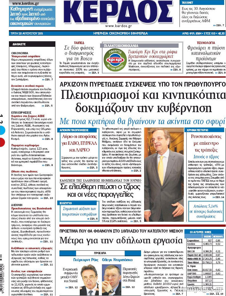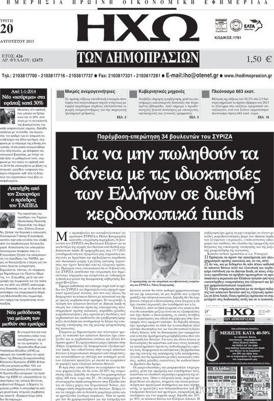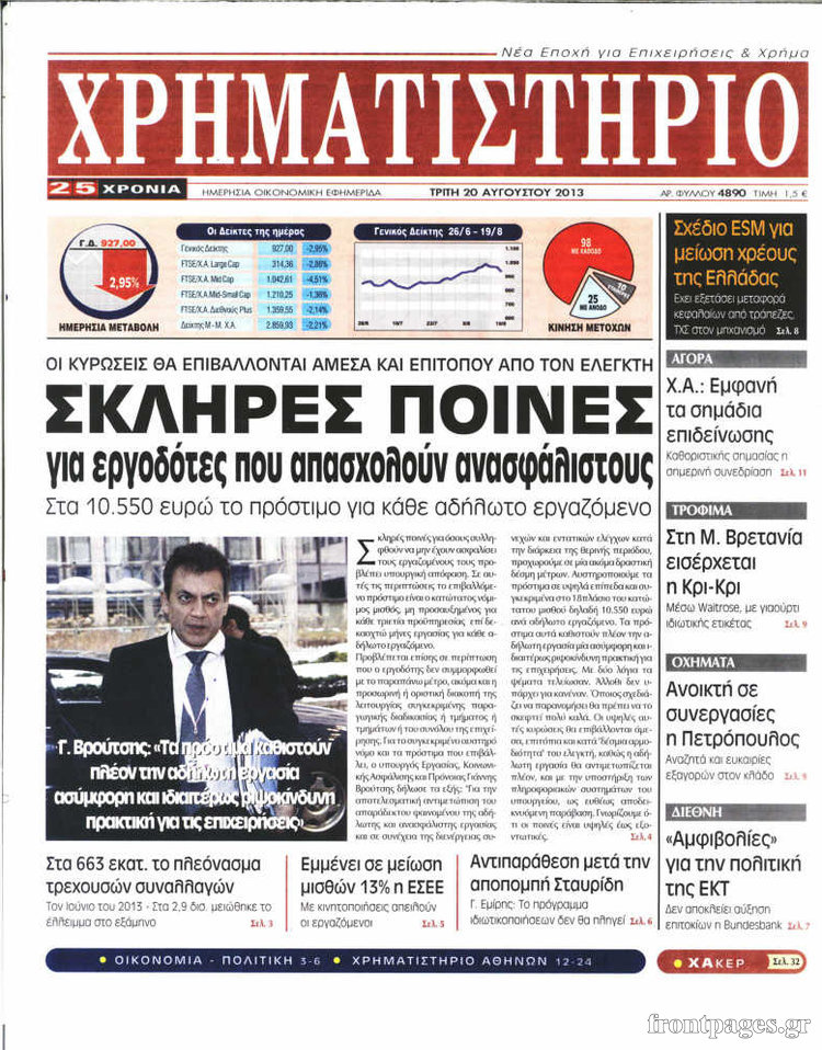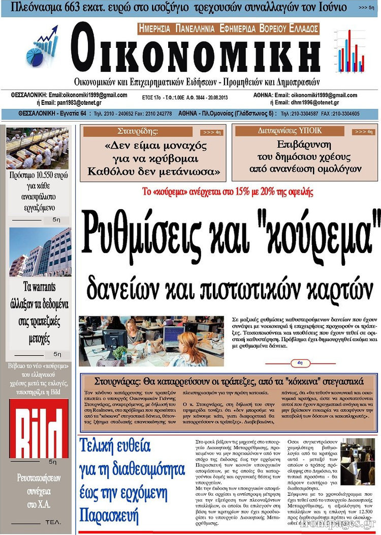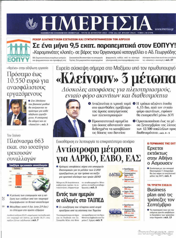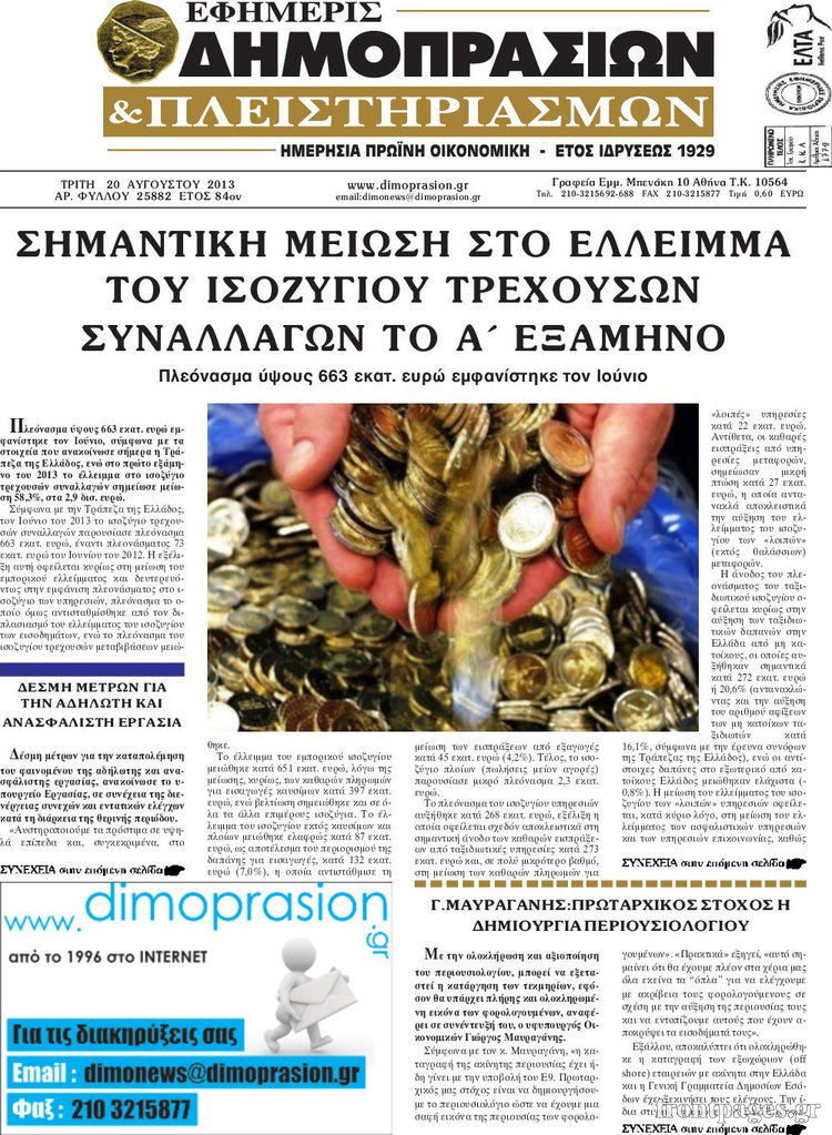 Οι oικονομικές εφημερίδες Enikos Newsroom 08:48, Τρίτη 20 Αυγούστου 2013 Media Οι oικονομικές εφημερίδες Διαβάστε τα πρωτοσέλιδα των οικονομικών εφημερίδων: ΕΦΗΜΕΡΙΔΕΣ ΟΙΚΟΝΟΜΙΚΕΣ ΕΦΗΜΕΡΙΔΕΣ ΠΡΩΤΟΣΕΛΙΔΑ Μοιράσου το: σχολίασε κι εσύ (0 σχόλια) Ακολουθήστε το enikos.gr στο Google News και μάθετε πρώτοι όλες τις ειδήσεις Δείτε όλες τις τελευταίες ειδήσεις από την Ελλάδα και τον Κόσμο στο enikos.gr Ειδήσεις Ροή Ειδήσεων 7 ώρες πριν Μητσοτάκης: Αναγκαία η μεταρρύθμιση του πρωτογενούς τομέα – Τα 6 νέα μέτρα για το στεγαστικό και οι αναφορές σε «Ιθάκη» και «πολιτικούς του καναπέ» 6 ώρες πριν Δάνεια σε ελβετικό φράγκο: Τα βασικά σημεία της ρύθμισης – ανάσας για 40.000 δανειολήπτες – Αναλυτικός οδηγός με ερωτήσεις και απαντήσεις 6 ώρες πριν Κυψέλη: Εξιτήριο πήρε η 14χρονη μαθήτρια που μαχαιρώθηκε από την 16χρονη σε σχολείο – «Θέλω να βοηθήσω το παιδί, έχει μπλέξει με κακές παρέες» 6 ώρες πριν Τραμπ: Γιατί κατέθεσε τώρα την αγωγή κατά του BBC – Πώς η κίνησή του εξυπηρετεί το νέο δόγμα του για «αντίσταση» στην Ευρώπη, υπέρ των συντηρητικών 7 ώρες πριν ΟΠΕΚΕΠΕ – Παράνομες επιδοτήσεις: Ελεύθεροι με περιοριστικούς όρους και οι 7 κατηγορούμενοι που απολογήθηκαν σήμερα 6 ώρες πριν Ανακαλύφθηκε βυθισμένη πέτρινη κατασκευή ανοιχτά της Κριμαίας – Αποτελεί μέρος αρχαίας ελληνικής αποικίας 7 ώρες πριν Ύπνος: Αυτό μπορεί να είναι το χειρότερο λάθος για το βιολογικό ρολόι σας, σύμφωνα με ειδικό 8 ώρες πριν Αριθμολογία: Οι άνθρωποι που έχουν γεννηθεί αυτές τις 3 ημερομηνίες, προσελκύουν μεγάλη τύχη πριν από το τέλος του 2025 10 ώρες πριν Οι 7 συμπεριφορές που μαρτυρούν ότι ένας άνδρας επενδύει μακροπρόθεσμα σε μια σχέση 9 λεπτά πριν Παλαιστινιακό: «Η λύση των δύο κρατών είναι ο μόνος βιώσιμος δρόμος», τόνισε η Ελλάδα στο Συμβούλιο Ασφαλείας του ΟΗΕ 17 λεπτά πριν Ελένη Καρακάση: «Ένιωθα πολύ αδικημένη, δεν μπορούσα να ελέγξω τον εαυτό μου σε δύσκολες στιγμές» 25 λεπτά πριν Κλαούδια Σέινμπαουμ προς Ντόναλντ Τραμπ για φαιντανύλη: Να επιτεθούμε στα αίτια κατανάλωσης αντί να την κατατάσσουμε στα «όπλα μαζικής καταστροφής» 33 λεπτά πριν Ρωσία: Ουκρανική επίθεση με drones στο Κρασνοντάρ – Δύο τραυματίες, ζημιές σε σπίτια και διακοπή ρεύματος 41 λεπτά πριν Αντόνιο Ταγιάνι: Νομικά εμπόδια για τη χρήση των ρωσικών κεφαλαίων υπέρ της Ουκρανίας ENIKOS NETWORK Αίτημα ΙΣΑ για την εξαίρεση των προσωπικών γιατρών από τις κατ’ οίκον επισκέψεις Η σκανδιναβική μέθοδος στον ύπνο που μπορεί να σώσει έναν γάμο Πιερρακάκης: Ο προϋπολογισμός συμβάλλει ουσιαστικά στην ενίσχυση της αγοραστικής δύναμης της πλειονότητας των εργαζομένων e-ΕΦΚΑ: Παρατείνεται η προθεσμία για την υποβολή ΑΠΔ – Ποιους αφορά Σύγχρονος Νοστράδαμος: Προειδοποιεί για «μεγάλο γεγονός» τους επόμενους μήνες που θα συγκλονίσει τη Βρετανία και τον κόσμο Τεστ παρατηρητικότητας: Μπορείτε να βρείτε τις 3 διαφορές στις εικόνες με έναν πιγκουίνο σε 14 δευτερόλεπτα περισσότερα 20:06 , Τρίτη 16 Δεκεμβρίου 2025 Ο ΣΚΑΙ καταγγέλλει τον ΕΚΚΟΜΕΔ Επιστολή με την οποία καταγράφει την έντονη διαμαρτυρία του προς τον διευθύνοντα σύμβουλο του... 17:40 , Τρίτη 16 Δεκεμβρίου 2025 Eurovision: Στις 4 Ιανουαρίου αποκαλύπτονται τα 28 τραγούδια του ελληνικού τελικού Η αγωνία τελειώνει, η γιορτή της Eurovision αρχίζει στην ΕΡΤ από τις πρώτες ημέρες της νέας χρ... 17:09 , Τρίτη 16 Δεκεμβρίου 2025 Alter Ego Media: Βαθύτατη θλίψη και ειλικρινή συλλυπητήρια για την απώλεια της Ειρήνης Μαρινάκη Τη βαθύτατη θλίψη και τα ειλι