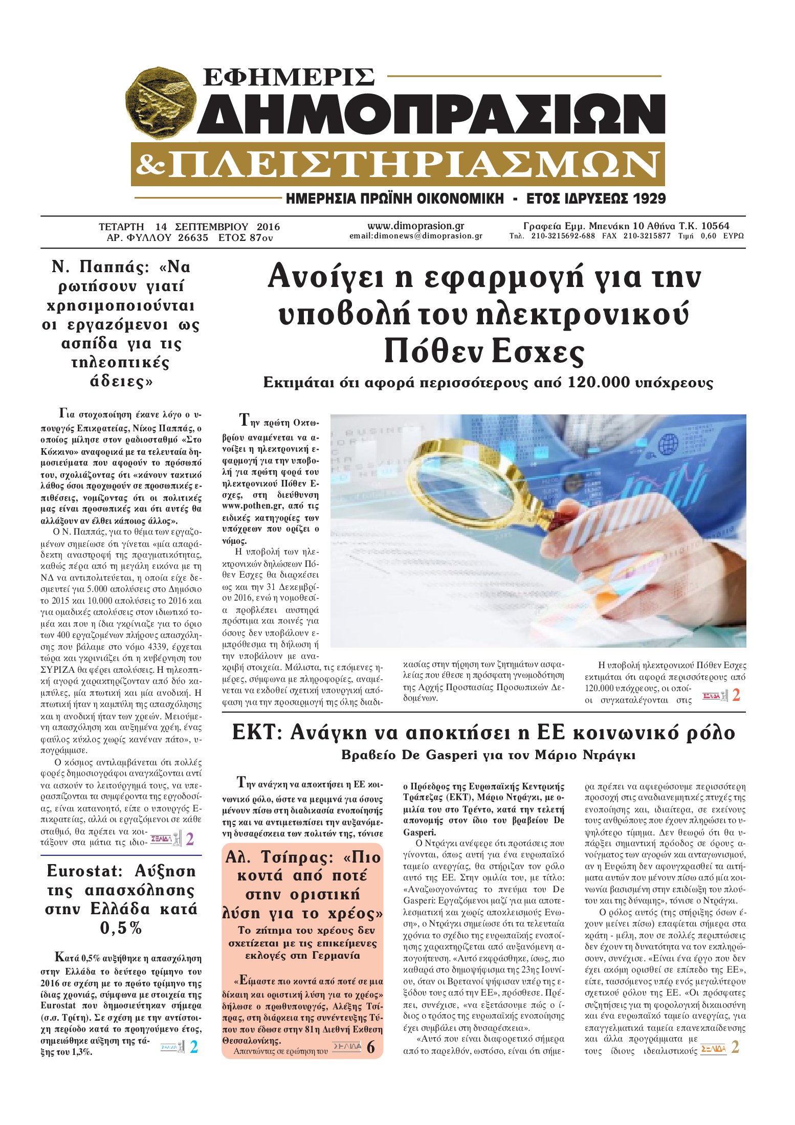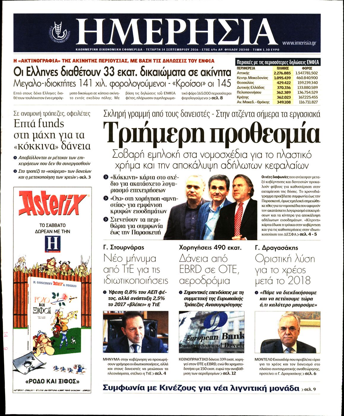Oι οικονομικές εφημερίδες 14/9/2016 Enikos Newsroom 05:13, Τετάρτη 14 Σεπτεμβρίου 2016 Media Διαβάστε τα σημερινά πρωτοσέλιδα των οικονομικών εφημερίδων: ΟΙΚΟΝΟΜΙΚΕΣ ΕΦΗΜΕΡΙΔΕΣ ΠΡΩΤΟΣΕΛΙΔΑ Μοιράσου το: σχολίασε κι εσύ (0 σχόλια) Ακολουθήστε το enikos.gr στο Google News και μάθετε πρώτοι όλες τις ειδήσεις Δείτε όλες τις τελευταίες ειδήσεις από την Ελλάδα και τον Κόσμο στο enikos.gr Ειδήσεις Ροή Ειδήσεων 2 ώρες πριν Μητσοτάκης για αγρότες: Ελπίζω πως θα απομακρυνθούν σύντομα από τα μπλόκα 3 ώρες πριν Έρευνα MRB: Η πρόθεση ψήφου και τα σημαντικότερα προβλήματα – Οι «λέξεις» που εκφράζουν τους πολίτες 15 λεπτά πριν Αμοργός: «Θα προσπαθήσω να το κάνω κάθε μέρα» – Ποιος είναι ο αγρότης που έστησε μόνος του το πρώτο μπλόκο στο νησί 50 λεπτά πριν Μισέλ Ομπάμα: Εμφανώς αδυνατισμένη στην εκπομπή του Τζίμι Κίμελ – Οι φήμες για τη χρήση Ozempic και η «φιλία» της με τον Ρομπ Ράινερ 45 λεπτά πριν Αγρότες: Επ’ αόριστον μπλόκο στον σταθμό στον Προμαχώνα για τα φορτηγά – Κλείνει το ρεύμα εισόδου στα Μάλγαρα 3 ώρες πριν Τα 4 ζώδια που ξαναβρίσκουν τον εαυτό τους – «Μπαίνετε επιτέλους στην ουσία των πραγμάτων» 4 ώρες πριν 20 χρόνια τα Χριστούγεννα ξεκινούν στα Public με μεγάλη ποικιλία σε δώρα! 3 ώρες πριν «Δεν είχα κλάψει από τότε που διαγνώστηκα με καρκίνο, ώσπου ένα τηλεφώνημα με έκανε να λυγίσω» – Η συγκλονιστική εξομολόγηση ενός άνδρα 2 ώρες πριν Τα 7 σπάνια χαρακτηριστικά που κάνουν κάποιους ανθρώπους ακαταμάχητους 2 λεπτά πριν Λάκης Γαβαλάς, Σουζάνα Κεγγίτση και Έλενα Γαλύφα μας περιμένουν σήμερα στο πιο stylish Χριστουγεννιάτικο ραντεβού στο Athens Metro Mall – Το Madwalk Gifting Lounge by ΣΚΡΑΤΣ επιστρέφει σήμερα από τις 14:00 έως τις 18:30 7 λεπτά πριν Αγρίνιο: Συνελήφθη μαθητής που απείλησε τον διευθυντή και εκπαιδευτικούς – Χειροπέδες και στη μητέρα του 12 λεπτά πριν Bloomberg: Οι ΗΠΑ ετοιμάζουν νέες κυρώσεις σε βάρος της Ρωσίας εάν ο Πούτιν απορρίψει μια ειρηνευτική συμφωνία 15 λεπτά πριν Αμοργός: «Θα προσπαθήσω να το κάνω κάθε μέρα» – Ποιος είναι ο αγρότης που έστησε μόνος του το πρώτο μπλόκο στο νησί 18 λεπτά πριν Βίντεο: Με γερανό απομακρύνθηκε αυτοκίνητο στο Μαρούσι – Η οδηγός… είχε αργήσει σε ραντεβού ENIKOS NETWORK Ανησυχητική αύξηση της υπέρτασης στα παιδιά – Πώς θα τα προστατέψουμε; Αδενώματα Υπόφυσης: Μια πάθηση καλοήθης, αλλά όχι αθώα Διεθνής Οργανισμός Ενέργειας (ΔΟΕ, IEA): Τι δείχνουν τα νέα στοιχεία για την παγκόσμια κατανάλωση άνθρακα Διευκρινίσεις από το ΥΠΑΑΤ και τον ΟΠΕΚΕΠΕ για την εξόφληση της βασικής ενίσχυσης στους αγρότες Σύγχρονος Νοστράδαμος: Προειδοποιεί για «μεγάλο γεγονός» τους επόμενους μήνες που θα συγκλονίσει τη Βρετανία και τον κόσμο Τεστ παρατηρητικότητας: Μπορείτε να βρείτε τις 3 διαφορές στις εικόνες με έναν πιγκουίνο σε 14 δευτερόλεπτα περισσότερα 12:35 , Τετάρτη 17 Δεκεμβρίου 2025 Μίρκα Παπακωνσταντίνου: «Δεν ήμουν αισιόδοξη για τα νούμερα – Είμαι ρεαλίστρια» Στα γυρίσματα του εορταστικού επεισοδίου της αγαπημένης σειράς “Το Σόι Σου”, βρέθηκε η κάμερα ... 12:12 , Τετάρτη 17 Δεκεμβρίου 2025 Ακούστε την εκπομπή του Νίκου Χατζηνικολάου 17/12/2025 Ακούστε την εκπομπή του Νίκου Χατζηνικολάου στον ραδιοφωνικό σταθμό RealFm 97,8, την Τετάρτη 1... 11:35 , Τετάρτη 17 Δεκεμβρίου 2025 Home Alone: Το σπίτι της ταινίας θα ανακαινιστεί – Επιστροφή στην αισθητική της δεκαετίας του ’90 Οι νέοι ιδιοκτήτες του πραγματικού σπιτιού που παρουσιάζεται στην κλασική ταινία του 1990 «Hom... 11:25 , Τετάρτη 17 Δεκεμβρίου 2025 Grand Hotel: Απόψε το τελευταίο επ