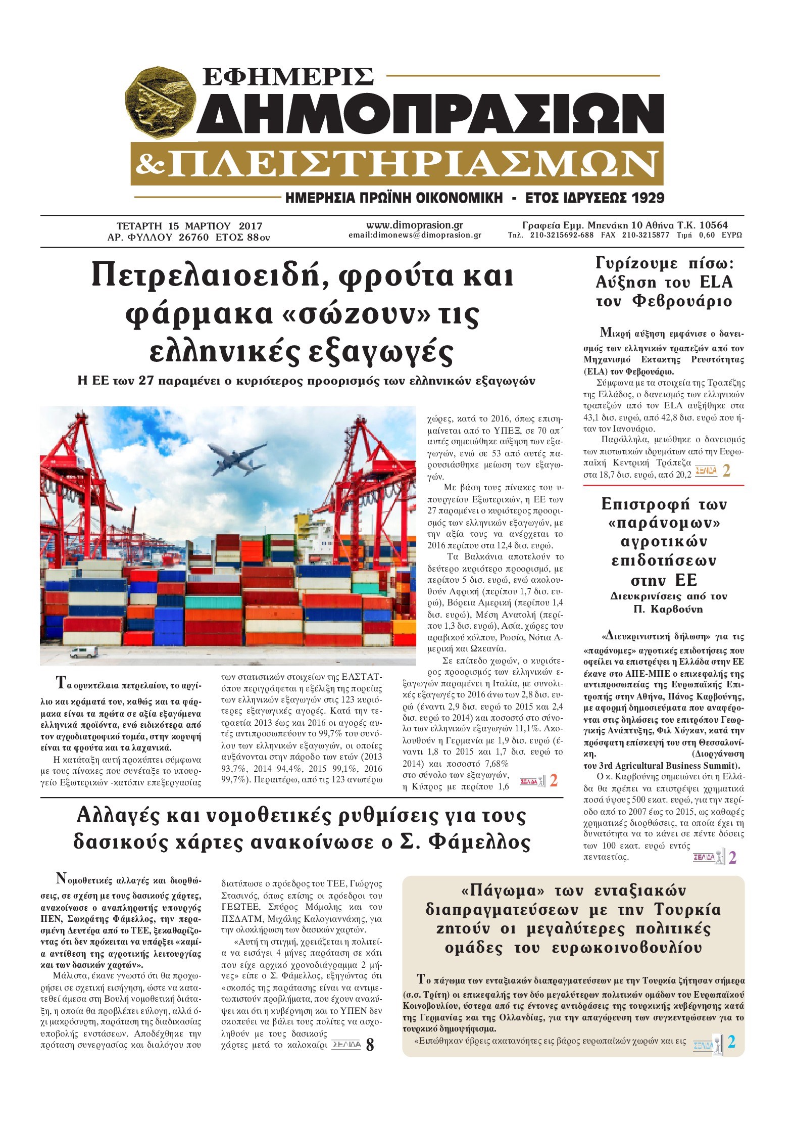 Οι οικονομικές εφημερίδες 15/3/2017 Enikos Newsroom 06:22, Τετάρτη 15 Μαρτίου 2017 Media Διαβάστε τα σημερινά πρωτοσέλιδα των οικονομικών εφημερίδων: ΟΙΚΟΝΟΜΙΚΕΣ ΕΦΗΜΕΡΙΔΕΣ ΠΡΩΤΟΣΕΛΙΔΑ Μοιράσου το: σχολίασε κι εσύ (0 σχόλια) Ακολουθήστε το enikos.gr στο Google News και μάθετε πρώτοι όλες τις ειδήσεις Δείτε όλες τις τελευταίες ειδήσεις από την Ελλάδα και τον Κόσμο στο enikos.gr Ειδήσεις Ροή Ειδήσεων 2 λεπτά πριν Φοροδιαφυγή: Ποιοι φορολογούμενοι κινδυνεύουν να πληρώσουν «τσουχτερά» πρόστιμα 8 ώρες πριν Εκτός ευρωομάδας ΣΥΡΙΖΑ ο Νίκος Παππάς μετά την επίθεση στον δημοσιογράφο Νίκο Γιαννόπουλο – Η μήνυση και οι νέες δηλώσεις 9 ώρες πριν «Αγριεύουν» οι αγρότες: «Δεν συντρέχει λόγος συνάντησης με τον πρωθυπουργό» – Ώρα αποφάσεων στη σύσκεψη της Πέμπτης 9 ώρες πριν Κυψέλη: Χωρίς την οικογένειά της δίπλα της απολογήθηκε η 16χρονη – «Της είχε επιτεθεί κάποιος για να την βιάσει, φοβήθηκε και κυκλοφορούσε με μαχαίρι» 8 ώρες πριν Politico: Το πρόβλημα της Ευρώπης δεν είναι το Βέλγιο αλλά ο Ντόναλντ Τραμπ 1 ώρα πριν Καούρα: Το μπαχαρικό που είναι «εξίσου αποτελεσματικό» με την ομεπραζόλη, σύμφωνα με ειδικούς 2 ώρες πριν Τα ζώδια σήμερα, Πέμπτη 18 Δεκεμβρίου: Λέοντες, η καρδιά σας θέλει να εκφραστεί 8 ώρες πριν Μυστήριο με τεράστιες κυκλικές πέτρες 200 κιλών – Ανακαλύφθηκαν τυχαία κατά τη διάρκεια οδικών έργων και κανείς δεν ξέρει από πού προέρχονται 22 ώρες πριν 20 χρόνια τα Χριστούγεννα ξεκινούν στα Public με μεγάλη ποικιλία σε δώρα! 2 λεπτά πριν Φοροδιαφυγή: Ποιοι φορολογούμενοι κινδυνεύουν να πληρώσουν «τσουχτερά» πρόστιμα 14 λεπτά πριν Εορτολόγιο: Ποιοι γιορτάζουν σήμερα 18 Δεκεμβρίου 25 λεπτά πριν Επιχειρήσεις: Έρχονται νέα μέτρα φορολογικών ελαφρύνσεων – Τα σχέδια για την προκαταβολή φόρου και το τέλος επιτηδεύματος 33 λεπτά πριν ΗΠΑ: Οριστική άρση κυρώσεων κατά της Συρίας – Ανοίγει ο δρόμος για επενδύσεις 41 λεπτά πριν Οι τελευταίες εξελίξεις στην εμπορική συμφωνία Ευρωπαϊκής Ένωσης – Mercosur ENIKOS NETWORK Μπορείτε να εντοπίσετε το ποντικάκι που κρύβεται πίσω από όλα τα μανιτάρια; Μόνο όσοι έχουν τα μάτια γερακιού μπορούν να λύ... Το «λουλούδι σκαντζόχοιρος» που μπορεί να ενισχύσει το ανοσοποιητικό, να μειώσει τη φλεγμονή και να ρυθμίσει το σάκχαρο Φοροδιαφυγή: Ποιοι φορολογούμενοι κινδυνεύουν να πληρώσουν «τσουχτερά» πρόστιμα ΕΛΣΤΑΤ: Τι δείχνουν τα νέα στοιχεία για τις ηλεκτρονικές παραγγελίες των επιχειρήσεων Χαρτογραφώντας το «σημείο χωρίς επιστροφή»: Για πρώτη φορά αποκαλύπτεται με λεπτομέρεια το ακανθώδες όριο της ατμόσφαιρας τ... Η Google καταργεί τη λειτουργία «dark web report» – Πώς θα μπορούν οι χρήστες να διαγράφουν τα δεδομένα τους περισσότερα 05:48 , Πέμπτη 18 Δεκεμβρίου 2025 Οι οικονομικές εφημερίδες 18/12/2025 Διαβάστε τα πρωτοσέλιδα από τις οικονομικές εφημερίδες, σήμερα 18/12/2025. 05:43 , Πέμπτη 18 Δεκεμβρίου 2025 Οι αθλητικές εφημερίδες 18/12/2025 Διαβάστε τα πρωτοσέλιδα από τις αθλητικές εφημερίδες, σήμερα 18/12/2025. 05:38 , Πέμπτη 18 Δεκεμβρίου 2025 Οι πολιτικές εφημερίδες 18/12/2025 Διαβάστε τα πρωτοσέλιδα από τις πολιτικές εφημερίδες, σήμερα 18/12/2025. 05:22 , Πέμπτη 18 Δεκεμβρίου 2025 Το Ποντίκι σήμερα Πέμπτη 18/12/2025 Διαβάστε το πρωτοσέλιδο της εφημερίδας «Το Ποντίκι» σήμερα 18/12/2025. ΤΕΛΕΥΤΑΙΕΣ ΕΙΔΗΣΕΙΣ 14 λεπτά πριν Εορτολόγιο: Ποιοι γιορτάζουν σήμερα 18 Δεκεμβρίου 25 λεπτά πριν Επιχειρήσεις: Έρχονται νέα μέτρα φορολογικών... 33 λεπτά πριν ΗΠΑ: Οριστική άρση κυρώσεων κατά της Συρίας – Ανοίγει... 41 λεπτά πριν Οι τελευταίες εξε