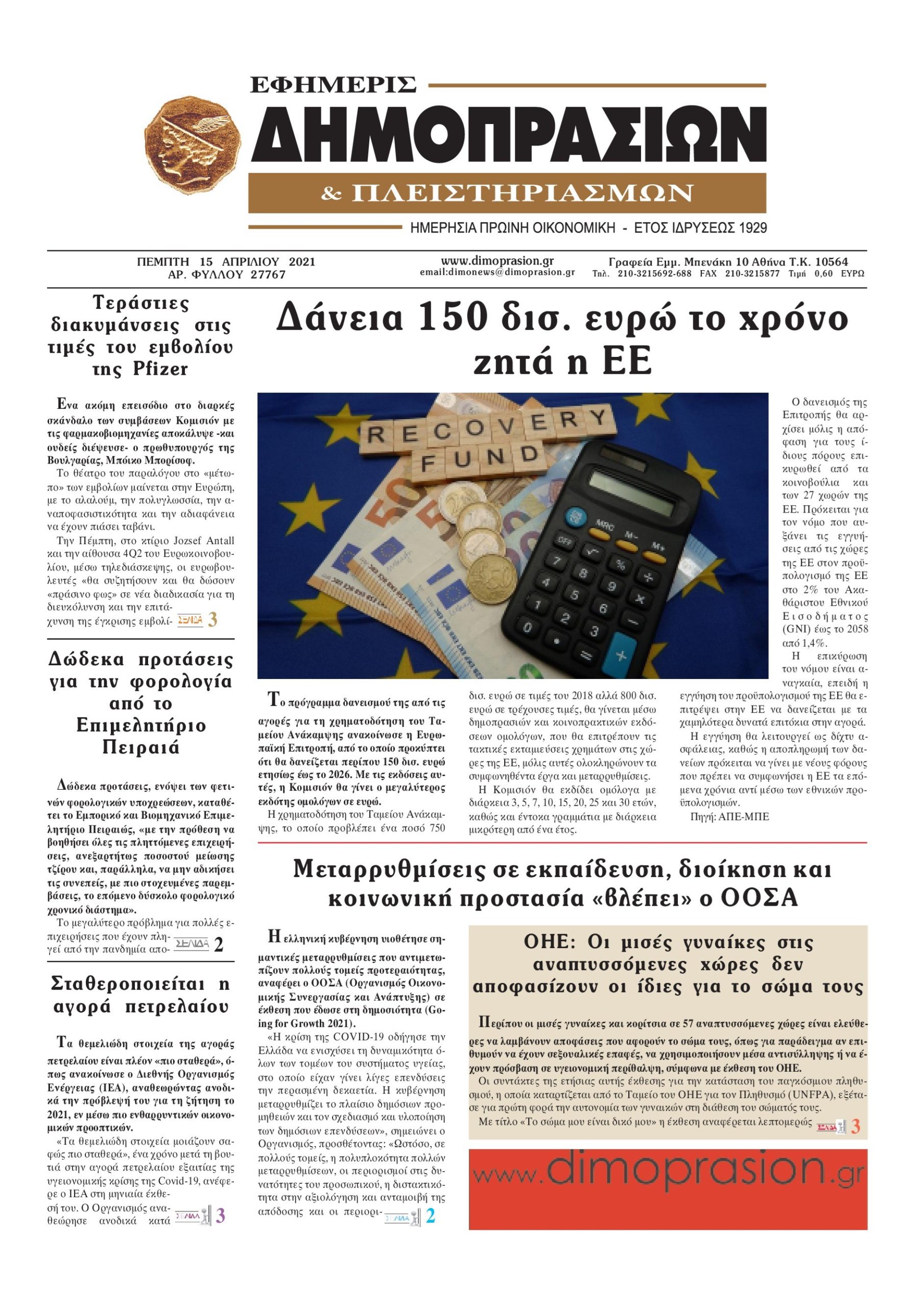 Οι οικονομικές εφημερίδες 15/4/2021 Διονύσης Νίκκας 06:35, Πέμπτη 15 Απριλίου 2021 Media Διαβάστε τα πρωτοσέλιδα των οικονομικών εφημερίδων… ΟΙΚΟΝΟΜΙΚΕΣ ΕΦΗΜΕΡΙΔΕΣ Μοιράσου το: σχολίασε κι εσύ (0 σχόλια) Ακολουθήστε το enikos.gr στο Google News και μάθετε πρώτοι όλες τις ειδήσεις Δείτε όλες τις τελευταίες ειδήσεις από την Ελλάδα και τον Κόσμο στο enikos.gr Ειδήσεις Ροή Ειδήσεων 1 ώρα πριν Δημοσκόπηση Metron Analysis: Στις 10 μονάδες η διαφορά ΝΔ-ΠΑΣΟΚ, στην 3η θέση η Πλεύση Ελευθερίας – 8 στους 10 στηρίζουν τον αγώνα των αγροτών 6 ώρες πριν Αγρότες: «Όχι στον διάλογο, μας εμπαίζει η κυβέρνηση» – Αποφάσισαν κλιμάκωση των κινητοποιήσεων, τι θα γίνει τα Χριστούγεννα 1 ώρα πριν Νίκος Παππάς στον ΑΝΤ1: «Δεν κρύβομαι – Μετά το συμβάν ακολούθησα κανονικά το πρόγραμμά μου» – ΒΙΝΤΕΟ 3 ώρες πριν Αθήνα: Εξαρθρώθηκε εγκληματική οργάνωση που διακινούσε ναρκωτικά σε μορφή σοκολάτας – Δύο τράπερ ανάμεσα στους 4 συλληφθέντες – ΒΙΝΤΕΟ 1 ώρα πριν Διαμαντής Καραναστάσης: Οδηγούσε υπό την επήρεια αλκοόλ – Του αφαιρέθηκε το δίπλωμα και του επιβλήθηκε πρόστιμο 350 ευρώ 2 ώρες πριν Manifesting: Πώς να συναντήσετε τον σύντροφο της ζωής σας, ανάλογα με τον μήνα γέννησής σας 4 ώρες πριν Γάμος: 11 ψυχρές αλλά ευγενικές φράσεις, που λέει ένας άνδρας όταν σκέφτεται τον χωρισμό 3 ώρες πριν Σφουγγάρισμα: Η συνήθεια που θα σας βοηθήσει να διατηρήσετε το σπίτι σας καθαρό και τακτοποιημένο 2 ημέρες πριν 20 χρόνια τα Χριστούγεννα ξεκινούν στα Public με μεγάλη ποικιλία σε δώρα! 4 λεπτά πριν Ελισάβετ Κωνσταντινίδου για τον Γεράσιμο Μιχελή και την Πόπη Χριστοδούλου: «Ξέρω ότι έχουν πάει απλώς κάπου αλλού, ότι δεν είναι ο θάνατος έτσι όπως τον έχουμε στο μυαλό μας» 8 λεπτά πριν Κρήτη: Νέες αποκαλύψεις για τον 54χρονο που κατηγορείται ότι εξαπάτησε τους γονείς του 33χρονου – Ζητούσε τρίχες αγνοουμένων 15 λεπτά πριν Τσιάρας: Δεν θα κινδυνέψουν οι πληρωμές των αγροτών – Χρειαζόμαστε μια νέα πολιτική, ένα restart 22 λεπτά πριν Δέσποινα Βανδή: Το βίντεο που δημοσίευσε με τον Γιώργο Νικολαΐδη – «Έχουμε καταστραφεί από τα μελομακάρονά σου» 27 λεπτά πριν Κλήρωση ΤΖΟΚΕΡ 18/12/2025: Αυτοί είναι οι τυχεροί αριθμοί ENIKOS NETWORK Σε περίοδο αυξημένης δραστηριότητας η γρίπη στην Ελλάδα-Μέτρα προστασίας από τον ΕΟΔΥ Σκέφτεστε συνέχεια συζητήσεις που έχετε κάνει; Τι σημαίνει αυτό, σύμφωνα με ειδικό ΑΣΕΠ 2ΓΒ/2025: Σήμερα αρχίζει η υποβολή ενστάσεων – Πότε θα βγουν τα οριστικά αποτελέσματα ΕΛΤΑ: Αυτό είναι το νέο σχέδιο μετασχηματισμού του Οργανισμού- Τι δήλωσαν Πιερρακάκης και Παπαστεργίου Χαρτογραφώντας το «σημείο χωρίς επιστροφή»: Για πρώτη φορά αποκαλύπτεται με λεπτομέρεια το ακανθώδες όριο της ατμόσφαιρας τ... Η Google καταργεί τη λειτουργία «dark web report» – Πώς θα μπορούν οι χρήστες να διαγράφουν τα δεδομένα τους περισσότερα 17:45 , Πέμπτη 18 Δεκεμβρίου 2025 ROUK ZOUK: Εορταστικό επεισόδιο με καλεσμένους τους πρωταγωνιστές του «Γιατί ρε πατέρα» Το Σάββατο 20 Δεκεμβρίου στις 21:00, η Ζέτα Μακρυπούλια υποδέχεται εκλεκτούς ηθοποιούς που όλο... 17:20 , Πέμπτη 18 Δεκεμβρίου 2025 Άγιος έρωτας: Η Χριστίνα εξομολογείται στον πατέρα Νικόλαο, απόψε στις 21:00 στον Alpha Η Νότα αποφασίζει να εκδικηθεί τον Πέτρο και τον Στέφανο, για χάρη του Λούη, όμως τα πράγματα ... 16:50 , Πέμπτη 18 Δεκεμβρίου 2025 Να μ’ αγαπάς: Ζωή και Φωτεινή συμφιλιώνονται ως μάνα με κόρη, απόψε στις 20:00 Η ταυτότητα του Άγγελου αποκαλύπτεται στο νέο επεισόδιο της σειράς “Να μ’ αγαπάς... 15:52 , Πέμπτη 18 Δεκεμβρίου 2025 Το Σπίτι Δίπλα 