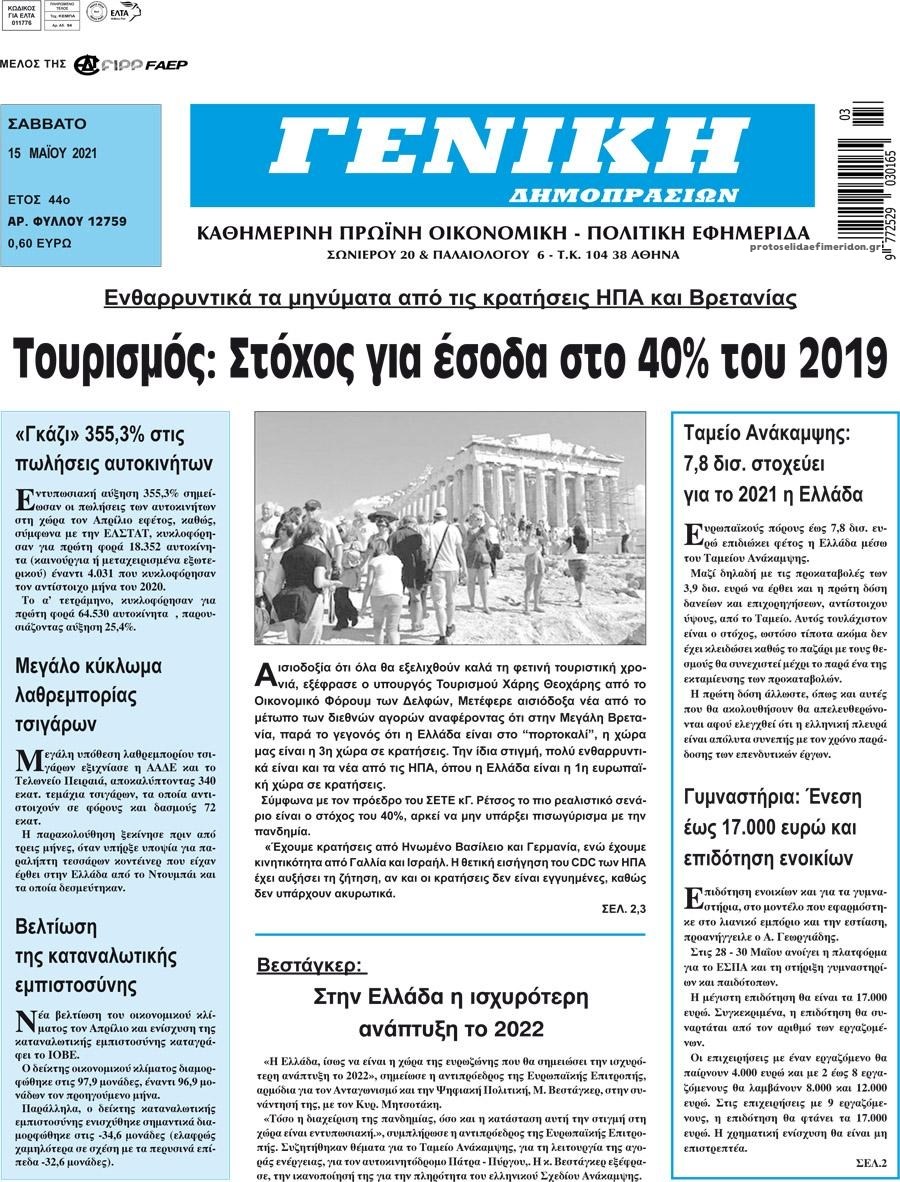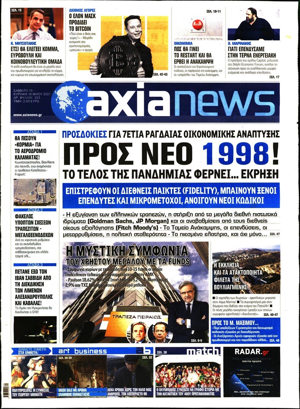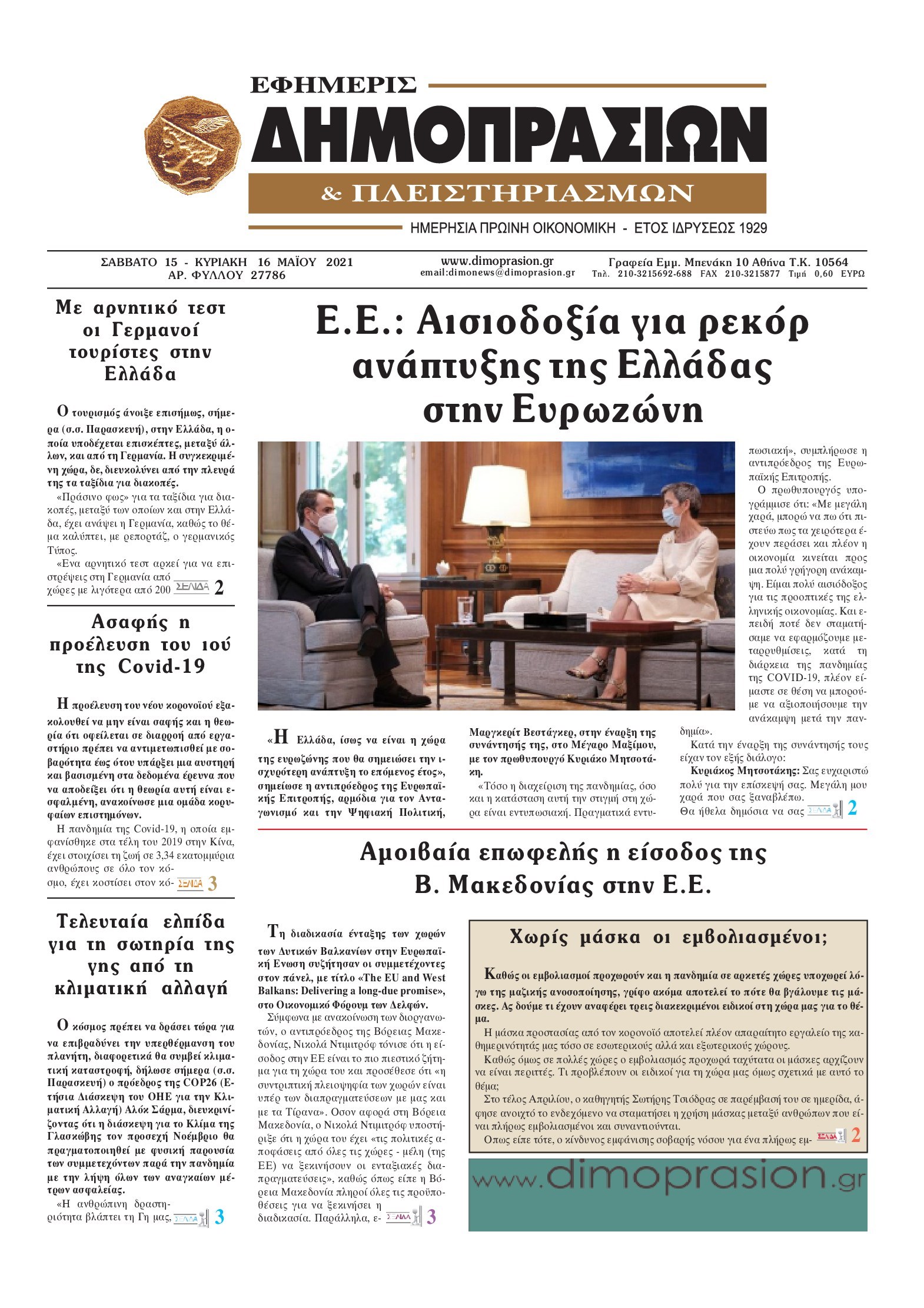 Οι οικονομικές εφημερίδες 15/5/2021 Διονύσης Νίκκας 07:38, Σάββατο 15 Μαΐου 2021 Media Διαβάστε τα πρωτοσέλιδα των οικονομικών εφημερίδων… ΟΙΚΟΝΟΜΙΚΕΣ ΕΦΗΜΕΡΙΔΕΣ Μοιράσου το: σχολίασε κι εσύ (0 σχόλια) Ακολουθήστε το enikos.gr στο Google News και μάθετε πρώτοι όλες τις ειδήσεις Δείτε όλες τις τελευταίες ειδήσεις από την Ελλάδα και τον Κόσμο στο enikos.gr Ειδήσεις Ροή Ειδήσεων 38 λεπτά πριν Ευρωπαϊκή Ένωση: Χωρίς συμφωνία, για την μακροπρόθεσμη χρηματοδότηση της Ουκρανίας, ολοκληρώθηκε η Σύνοδος Κορυφής στις Βρυξέλλες 4 ώρες πριν ΟΠΕΚΕΠΕ: Προφυλακιστέος ο φερόμενος αρχηγός και ο λογιστής της εγκληματικής οργάνωσης 5 ώρες πριν Αυξάνουν την πίεση προς την κυβέρνηση οι αγρότες: Κλείνουν παρακαμπτήριους και ανοίγουν διόδια – Τι θα γίνει τις γιορτές 5 ώρες πριν Φοινικούντα: Το Σάββατο απολογείται ο 30χρονος γιος γνωστού επιχειρηματία της Πλάκας που παραδόθηκε – Όσα είπε στους αστυνομικούς και ο ρόλος του στο έγκλημα 4 ώρες πριν ΑΕΚ – Κραϊόβα 3-2: Επική ανατροπή και πρόκριση στους «16» του Conference League η Ένωση 5 ώρες πριν Αρχαιολόγοι ανακάλυψαν ρωμαϊκά τεχνουργήματα από μια πόλη που δεν υπήρξε ποτέ – Τα τρία εντυπωσιακά κτίρια και ο αμφορέας με τις… σαρδέλες 6 ώρες πριν Ύπνος: Η απλή βραδινή ρουτίνα για να προστατεύσετε τα μαλλιά σας από το κρύο κατά τη διάρκεια του χειμώνα 7 ώρες πριν Manifesting: Πώς να συναντήσετε τον σύντροφο της ζωής σας, ανάλογα με τον μήνα γέννησής σας 2 ημέρες πριν 20 χρόνια τα Χριστούγεννα ξεκινούν στα Public με μεγάλη ποικιλία σε δώρα! 23 λεπτά πριν Ντόναλντ Τραμπ: Δεν χρειάζομαι την έγκριση του Κογκρέσου για να διατάξω στρατιωτικά πλήγματα στη Βενεζουέλα 38 λεπτά πριν Ευρωπαϊκή Ένωση: Χωρίς συμφωνία, για την μακροπρόθεσμη χρηματοδότηση της Ουκρανίας, ολοκληρώθηκε η Σύνοδος Κορυφής στις Βρυξέλλες 54 λεπτά πριν GNTM: «Κλείδωσαν» οι τέσσερις φιναλίστ – Μεγάλη ανατροπή στις τελευταίες αποχωρήσεις 1 ώρα πριν Γιώργος Μαζωνάκης: Αποθεώθηκε στην πρεμιέρα του στην «Ακτή Πειραιώς» λίγες ώρες μετά τις καταγγελίες – «Είμαι αληθινός», είπε με νόημα 1 ώρα πριν Πόλεμος στην Ουκρανία: Ρωσικά drones έπληξαν την Οδησσό – Μία νεκρή και ζημιές σε ενεργειακές υποδομές ENIKOS NETWORK Σε περίοδο αυξημένης δραστηριότητας η γρίπη στην Ελλάδα-Μέτρα προστασίας από τον ΕΟΔΥ Σκέφτεστε συνέχεια συζητήσεις που έχετε κάνει; Τι σημαίνει αυτό, σύμφωνα με ειδικό Στεγαστικό: Τι λέει η ΠΟΜΙΔΑ για τα νέα μέτρα που ανακοίνωσε ο Κυριάκος Μητσοτάκης Λαγκάρντ: Αισιόδοξη για την ανάπτυξη της Ευρωζώνης, αβέβαιη για τον πληθωρισμό Χαρτογραφώντας το «σημείο χωρίς επιστροφή»: Για πρώτη φορά αποκαλύπτεται με λεπτομέρεια το ακανθώδες όριο της ατμόσφαιρας τ... Η Google καταργεί τη λειτουργία «dark web report» – Πώς θα μπορούν οι χρήστες να διαγράφουν τα δεδομένα τους περισσότερα 02:50 , Παρασκευή 19 Δεκεμβρίου 2025 GNTM: «Κλείδωσαν» οι τέσσερις φιναλίστ – Μεγάλη ανατροπή στις τελευταίες αποχωρήσεις Για προτελευταία φορά εμφανίστηκαν στο πλατό του GNTM οι φιναλίστ του φετινού κύκλου, το βράδυ... 17:45 , Πέμπτη 18 Δεκεμβρίου 2025 ROUK ZOUK: Εορταστικό επεισόδιο με καλεσμένους τους πρωταγωνιστές του «Γιατί ρε πατέρα» Το Σάββατο 20 Δεκεμβρίου στις 21:00, η Ζέτα Μακρυπούλια υποδέχεται εκλεκτούς ηθοποιούς που όλο... 17:20 , Πέμπτη 18 Δεκεμβρίου 2025 Άγιος έρωτας: Η Χριστίνα εξομολογείται στον πατέρα Νικόλαο, απόψε στις 21:00 στον Alpha Η Νότα αποφασίζει να εκδικηθεί τον Πέτρο και τον Στέφανο, για χάρη του Λούη, όμως τα πράγματα ... 16:50 , Πέμπτη 18 Δεκεμβρίου 2025 Ν
