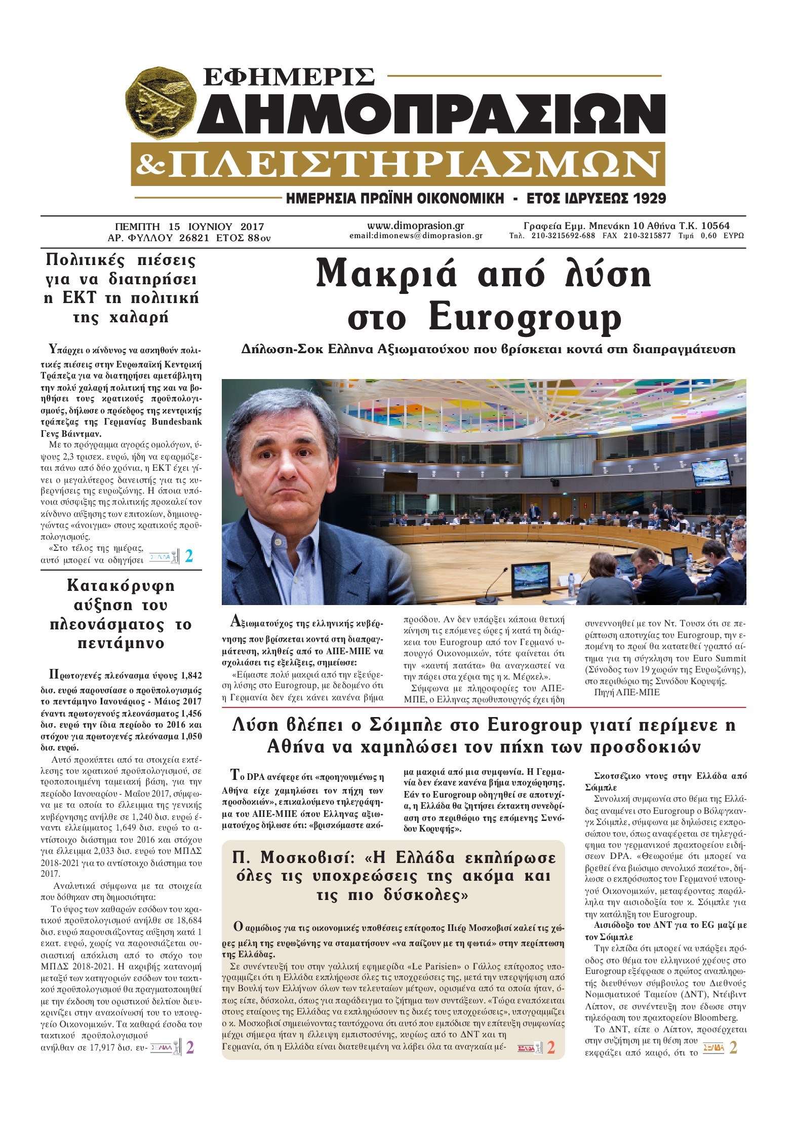 Οι οικονομικές εφημερίδες 15/6/2017 Enikos Newsroom 06:43, Πέμπτη 15 Ιουνίου 2017 Media Διαβάστε τα σημερινά πρωτοσέλιδα των οικονομικών εφημερίδων: ΟΙΚΟΝΟΜΙΚΕΣ ΕΦΗΜΕΡΙΔΕΣ ΠΡΩΤΟΣΕΛΙΔΑ Μοιράσου το: σχολίασε κι εσύ (0 σχόλια) Ακολουθήστε το enikos.gr στο Google News και μάθετε πρώτοι όλες τις ειδήσεις Δείτε όλες τις τελευταίες ειδήσεις από την Ελλάδα και τον Κόσμο στο enikos.gr Ειδήσεις Ροή Ειδήσεων 14 λεπτά πριν Χριστούγεννα στα μπλόκα: Επιμένουν στις κινητοποιήσεις τους οι αγρότες – Ανοίγουν τα διόδια το Σαββατοκύριακο 42 λεπτά πριν Τραμπ: Δεν αποκλείει την πιθανότητα ενός πολέμου στη Βενεζουέλα – «Ο Μαδούρο ξέρει καλύτερα από τον καθένα τι ακριβώς θέλω» 37 λεπτά πριν Ουκρανία: Η άνευ προηγουμένου επίθεση σε ρωσικό τάνκερ στη Μεσόγειο και το μήνυμα προς στον Πούτιν – Το «μακρύ χέρι» του Κιέβου 3 ώρες πριν Πούτιν: «Ναι, είμαι ερωτευμένος» – Βίντεο από τη σπάνια προσωπική παραδοχή του 1 ώρα πριν Συνεχίζει να προκαλεί ο Μίτσκοσκι: «Για μένα το όνομα Μακεδονία είναι ιερό» 2 ώρες πριν Αριθμολογία: Οι άνθρωποι που έχουν γεννηθεί αυτές τις 4 ημερομηνίες, συχνά παρεξηγούνται – «Η καλοσύνη τους κρύβει τεράστια δύναμη» 4 ώρες πριν Μήπως έχετε χάσει τον εαυτό σας στη σχέση σας; 7 «αθόρυβες» υποχωρήσεις που μάλλον κάνατε, χωρίς να το συνειδητοποιήσετε 3 ώρες πριν Ξεχάστε το καθάρισμα το Σαββατοκύριακο: Ο «κανόνας των 20 λεπτών» που θα σας λύσει τα χέρια 52 λεπτά πριν Ύπνος: Μια κρυφή κατάσταση του εγκεφάλου πριν από τον ύπνο μπορεί να είναι το “κλειδί” για υψηλή ευφυΐα και δημιουργικότητα 4 λεπτά πριν Παναθηναϊκός: «Μέσα» οι Σφιντέρσκι και Τουμπά για το ματς με τον ΠΑΟΚ – Τι έδειξε η μαγνητική του Πάντοβιτς 10 λεπτά πριν Γιώργος Γιαννόπουλος για “Το σόι σου”: “Είναι ευτυχία και ευλογία αυτή η σειρά” 14 λεπτά πριν Χριστούγεννα στα μπλόκα: Επιμένουν στις κινητοποιήσεις τους οι αγρότες – Ανοίγουν τα διόδια το Σαββατοκύριακο 25 λεπτά πριν Χάρι και Μέγκαν: Η σπάνια οικογενειακή φωτογραφία με τον Άρτσι και τη Λίλιμπετ – Τι σχεδιάζουν για τα Χριστούγεννα 32 λεπτά πριν Βασίλης Καρράς: «Είναι πάντα δίπλα μου, δεν έφυγε…», λέει ο αδελφός του ENIKOS NETWORK Το ΕΚΑΒ τιμήθηκε από την Ακαδημία Αθηνών για τα 40 χρόνια προσφοράς του Έχετε πραγματικά μεγάλη καρδιά; 10 χαρακτηριστικά όσων έχουν καλοσύνη Πλήρης επάρκεια προϊόντων στις λαϊκές της Αττικής, παρά τις αγροτικές κινητοποιήσεις – Τι απαντούν οι πωλητές ΑΑΔΕ: Νέες αναβαθμίσεις στο Ψηφιακό Πελατολόγιο και την εφαρμογή myDATAapp – Τι πρέπει να γνωρίζετε Χαρτογραφώντας το «σημείο χωρίς επιστροφή»: Για πρώτη φορά αποκαλύπτεται με λεπτομέρεια το ακανθώδες όριο της ατμόσφαιρας τ... Η Google καταργεί τη λειτουργία «dark web report» – Πώς θα μπορούν οι χρήστες να διαγράφουν τα δεδομένα τους περισσότερα 22:42 , Παρασκευή 19 Δεκεμβρίου 2025 Γιώργος Γιαννόπουλος για “Το σόι σου”: “Είναι ευτυχία και ευλογία αυτή η σειρά” «Είναι ευτυχία και ευλογία η συγκυρία αυτής της σειράς», θα πει ο Γιώργος Γιαννόπουλος -ο αγαπ... 20:37 , Παρασκευή 19 Δεκεμβρίου 2025 Don’t Forget The Lyrics: Η Έλλη Κοκκίνου υποδέχεται 4 παίκτες που θα κάνουν τα πάντα για να μη χάσουν ούτε… μισή λέξη από τους στίχους Το «Don’t Forget The Lyrics» επιστρέφει απόψε, Παρασκευή 19 Δεκεμβρίου, στις 21:00 με νέο επει... 19:31 , Παρασκευή 19 Δεκεμβρίου 2025 GNTM: Απόψε ο μεγάλος τελικός για τους 4 φιναλίστ Έπειτα από μήνες γεμάτους μόδα, δημιουργία και έντονες αναμετρήσεις, το GNTM 2025 κορυφώνεται,... 18:11 , Παρασκευή 19 Δεκεμβρίου 2025 Το σόι σου: Ο Άρης έρχεται στη