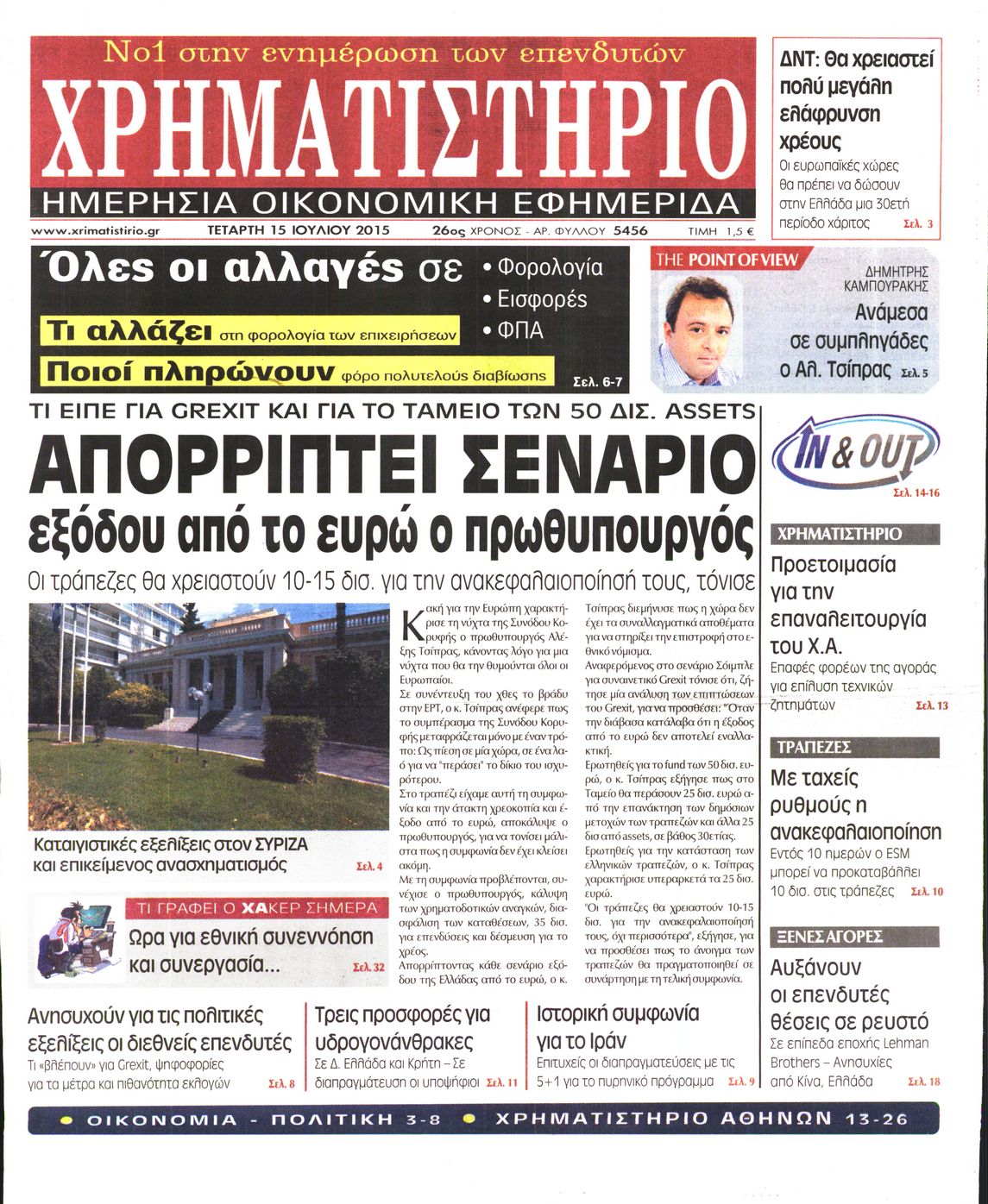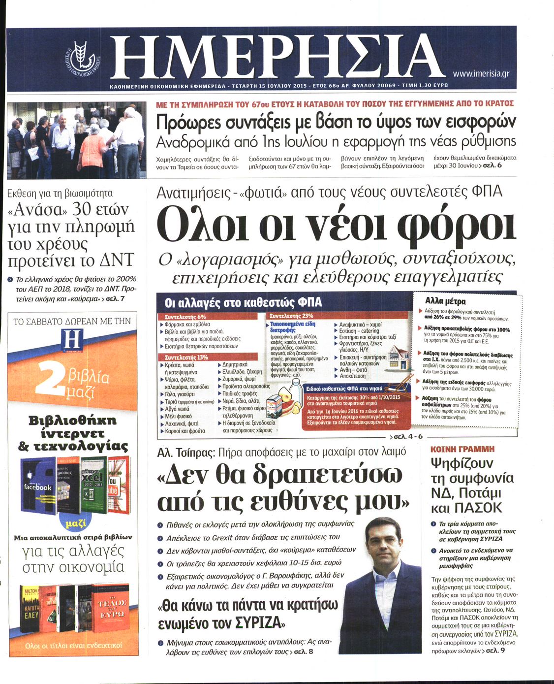 Οι οικονομικές εφημερίδες 15/7/2015 Enikos Newsroom 06:14, Τετάρτη 15 Ιουλίου 2015 Media Διαβάστε τα σημερινά πρωτοσέλιδα των οικονομικών εφημερίδων: ΟΙΚΟΝΟΜΙΚΕΣ ΕΦΗΜΕΡΙΔΕΣ ΠΡΩΤΟΣΕΛΙΔΑ Μοιράσου το: σχολίασε κι εσύ (0 σχόλια) Ακολουθήστε το enikos.gr στο Google News και μάθετε πρώτοι όλες τις ειδήσεις Δείτε όλες τις τελευταίες ειδήσεις από την Ελλάδα και τον Κόσμο στο enikos.gr Ειδήσεις Ροή Ειδήσεων 8 ώρες πριν Μητσοτάκης: Αναγκαία η μεταρρύθμιση του πρωτογενούς τομέα – Τα 6 νέα μέτρα για το στεγαστικό και οι αναφορές σε «Ιθάκη» και «πολιτικούς του καναπέ» 7 ώρες πριν Δάνεια σε ελβετικό φράγκο: Τα βασικά σημεία της ρύθμισης – ανάσας για 40.000 δανειολήπτες – Αναλυτικός οδηγός με ερωτήσεις και απαντήσεις 6 ώρες πριν Κυψέλη: Εξιτήριο πήρε η 14χρονη μαθήτρια που μαχαιρώθηκε από την 16χρονη σε σχολείο – «Θέλω να βοηθήσω το παιδί, έχει μπλέξει με κακές παρέες» 6 ώρες πριν Τραμπ: Γιατί κατέθεσε τώρα την αγωγή κατά του BBC – Πώς η κίνησή του εξυπηρετεί το νέο δόγμα του για «αντίσταση» στην Ευρώπη, υπέρ των συντηρητικών 7 ώρες πριν ΟΠΕΚΕΠΕ – Παράνομες επιδοτήσεις: Ελεύθεροι με περιοριστικούς όρους και οι 7 κατηγορούμενοι που απολογήθηκαν σήμερα 6 ώρες πριν Ανακαλύφθηκε βυθισμένη πέτρινη κατασκευή ανοιχτά της Κριμαίας – Αποτελεί μέρος αρχαίας ελληνικής αποικίας 7 ώρες πριν Ύπνος: Αυτό μπορεί να είναι το χειρότερο λάθος για το βιολογικό ρολόι σας, σύμφωνα με ειδικό 8 ώρες πριν Αριθμολογία: Οι άνθρωποι που έχουν γεννηθεί αυτές τις 3 ημερομηνίες, προσελκύουν μεγάλη τύχη πριν από το τέλος του 2025 10 ώρες πριν Οι 7 συμπεριφορές που μαρτυρούν ότι ένας άνδρας επενδύει μακροπρόθεσμα σε μια σχέση 6 λεπτά πριν Κολομβία: Νεκροί τέσσερις αστυνομικοί σε βομβιστικές επιθέσεις ανταρτών 14 λεπτά πριν Στάση εργασίας 11:00 – 17:00 σήμερα στα λεωφορεία του ΟΑΣΑ – Ποιες γραμμές θα λειτουργήσουν 30 λεπτά πριν Παλαιστινιακό: «Η λύση των δύο κρατών είναι ο μόνος βιώσιμος δρόμος», τόνισε η Ελλάδα στο Συμβούλιο Ασφαλείας του ΟΗΕ 37 λεπτά πριν Ελένη Καρακάση: «Ένιωθα πολύ αδικημένη, δεν μπορούσα να ελέγξω τον εαυτό μου σε δύσκολες στιγμές» 45 λεπτά πριν Κλαούδια Σέινμπαουμ προς Ντόναλντ Τραμπ για φαιντανύλη: Να επιτεθούμε στα αίτια κατανάλωσης αντί να την κατατάσσουμε στα «όπλα μαζικής καταστροφής» ENIKOS NETWORK Αίτημα ΙΣΑ για την εξαίρεση των προσωπικών γιατρών από τις κατ’ οίκον επισκέψεις Η σκανδιναβική μέθοδος στον ύπνο που μπορεί να σώσει έναν γάμο Πιερρακάκης: Ο προϋπολογισμός συμβάλλει ουσιαστικά στην ενίσχυση της αγοραστικής δύναμης της πλειονότητας των εργαζομένων e-ΕΦΚΑ: Παρατείνεται η προθεσμία για την υποβολή ΑΠΔ – Ποιους αφορά Σύγχρονος Νοστράδαμος: Προειδοποιεί για «μεγάλο γεγονός» τους επόμενους μήνες που θα συγκλονίσει τη Βρετανία και τον κόσμο Τεστ παρατηρητικότητας: Μπορείτε να βρείτε τις 3 διαφορές στις εικόνες με έναν πιγκουίνο σε 14 δευτερόλεπτα περισσότερα 20:06 , Τρίτη 16 Δεκεμβρίου 2025 Ο ΣΚΑΙ καταγγέλλει τον ΕΚΚΟΜΕΔ Επιστολή με την οποία καταγράφει την έντονη διαμαρτυρία του προς τον διευθύνοντα σύμβουλο του... 17:40 , Τρίτη 16 Δεκεμβρίου 2025 Eurovision: Στις 4 Ιανουαρίου αποκαλύπτονται τα 28 τραγούδια του ελληνικού τελικού Η αγωνία τελειώνει, η γιορτή της Eurovision αρχίζει στην ΕΡΤ από τις πρώτες ημέρες της νέας χρ... 17:09 , Τρίτη 16 Δεκεμβρίου 2025 Alter Ego Media: Βαθύτατη θλίψη και ειλικρινή συλλυπητήρια για την απώλεια της Ειρήνης Μαρινάκη Τη βαθύτατη θλίψη και τα ειλικρινή συλλυπητήριά της εκφράζει η Alter Ego Media για τον