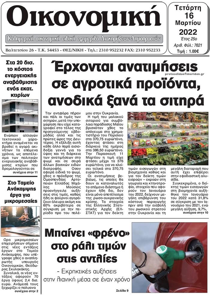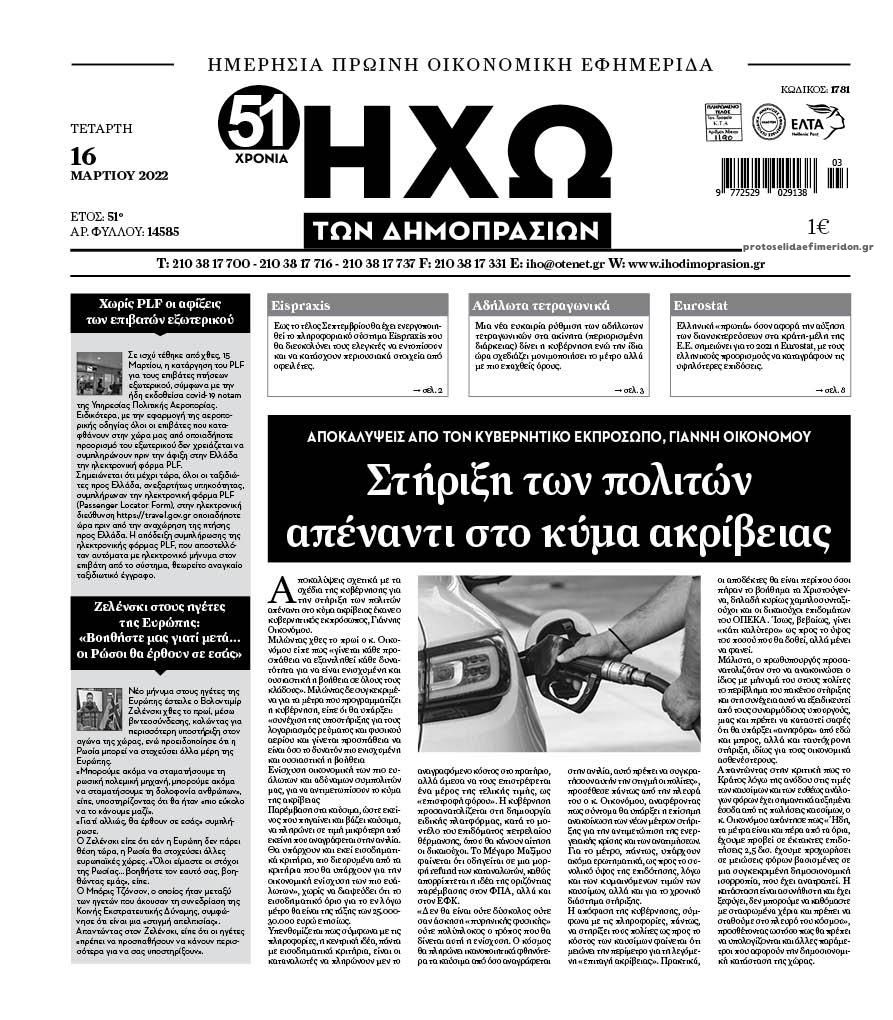 Οι οικονομικές εφημερίδες 16/3/2022 Διονύσης Νίκκας 06:50, Τετάρτη 16 Μαρτίου 2022 Media Διαβάστε τα πρωτοσέλιδα από τις οικονομικές εφημερίδες… ΟΙΚΟΝΟΜΙΚΕΣ ΕΦΗΜΕΡΙΔΕΣ Μοιράσου το: σχολίασε κι εσύ (0 σχόλια) Ακολουθήστε το enikos.gr στο Google News και μάθετε πρώτοι όλες τις ειδήσεις Δείτε όλες τις τελευταίες ειδήσεις από την Ελλάδα και τον Κόσμο στο enikos.gr Ειδήσεις Ροή Ειδήσεων 4 ώρες πριν Εκτός ευρωομάδας ΣΥΡΙΖΑ ο Νίκος Παππάς μετά την επίθεση στον δημοσιογράφο Νίκο Γιαννόπουλο – Η μήνυση και οι νέες δηλώσεις 4 ώρες πριν «Αγριεύουν» οι αγρότες: «Δεν συντρέχει λόγος συνάντησης με τον πρωθυπουργό» – Ώρα αποφάσεων στη σύσκεψη της Πέμπτης 4 ώρες πριν Κυψέλη: Χωρίς την οικογένειά της δίπλα της απολογήθηκε η 16χρονη – «Της είχε επιτεθεί κάποιος για να την βιάσει, φοβήθηκε και κυκλοφορούσε με μαχαίρι» 3 ώρες πριν Politico: Το πρόβλημα της Ευρώπης δεν είναι το Βέλγιο αλλά ο Ντόναλντ Τραμπ 5 ώρες πριν Αλεξανδρούπολη: Πολυοργανική ανεπάρκεια λόγω υποσιτισμού η αιτία θανάτου του 3χρονου αγοριού 4 ώρες πριν Μυστήριο με τεράστιες κυκλικές πέτρες 200 κιλών – Ανακαλύφθηκαν τυχαία κατά τη διάρκεια οδικών έργων και κανείς δεν ξέρει από πού προέρχονται 5 ώρες πριν Ύπνος: Ειδικός εξηγεί τον πραγματικό λόγο που ξυπνάτε στις 4 τα ξημερώματα – Ο ρόλος των ορμονών και του κιρκάδιου ρυθμού 6 ώρες πριν Αριθμολογία: Οι άνθρωποι που έχουν γεννηθεί αυτές τις 4 ημερομηνίες, είναι τρυφεροί και αγαπούν ανιδιοτελώς 17 ώρες πριν 20 χρόνια τα Χριστούγεννα ξεκινούν στα Public με μεγάλη ποικιλία σε δώρα! 3 λεπτά πριν Σουδάν: Επιδρομή drone σε χωριό του Νότιου Κορντοφάν – Οκτώ νεκροί 18 λεπτά πριν Αλ Τσαντίρι Νιουζ: Η κόρη της Πάολα στο κοινό – Η ατάκα Λαζόπουλου που την έκανε να «κοκκινήσει» 33 λεπτά πριν Ρωσία: Ουκρανικές δυνάμεις έπληξαν πλοίο στο λιμάνι του Ροστόφ – Αναφορές για θύματα 48 λεπτά πριν Βρυξέλλες: Νυχτερινό… μπλόκο αγροτών μπροστά από το κτίριο της Ευρωπαϊκής Επιτροπής – Πάνω από 100 τρακτέρ απέκλεισαν την λεωφόρο 1 ώρα πριν Euroleague: Απρόσμενη ήττα για την Μονακό του Βασίλη Σπανούλη – Η βαθμολογία μετά το τέλος της 16ης αγωνιστικής ENIKOS NETWORK Αϋπνία: Το κόλπο που θα σας βοηθήσει να κοιμηθείτε απόψε – Είναι απλό και έχει αποτέλεσμα 2,6 εκατομμύρια πολίτες έχουν ήδη εμβολιαστεί κατά της γρίπης ΕΛΣΤΑΤ: Τι δείχνουν τα νέα στοιχεία για τις ηλεκτρονικές παραγγελίες των επιχειρήσεων ΚΕΠΕ: Οι 3 διακριτές συμβολές των ΜμΕ και της μεταποίησης στην ελληνική οικονομία Χαρτογραφώντας το «σημείο χωρίς επιστροφή»: Για πρώτη φορά αποκαλύπτεται με λεπτομέρεια το ακανθώδες όριο της ατμόσφαιρας τ... Η Google καταργεί τη λειτουργία «dark web report» – Πώς θα μπορούν οι χρήστες να διαγράφουν τα δεδομένα τους περισσότερα 02:30 , Πέμπτη 18 Δεκεμβρίου 2025 Αλ Τσαντίρι Νιουζ: Η κόρη της Πάολα στο κοινό – Η ατάκα Λαζόπουλου που την έκανε να «κοκκινήσει» Γιορτινή διάθεση και ευχάριστες στιγμές γέμισε η αποψινή, τελευταία για το 2025, εκπομπή του «... 22:24 , Τετάρτη 17 Δεκεμβρίου 2025 Το Σπίτι Δίπλα Στο Ποτάμι: Σε κίνδυνο η υγεία του Απόστολου – Τι θα δούμε απόψε “Το Σπίτι Δίπλα στο Ποτάμι” ξετυλίγει το νήμα της ζωής των πέντε αδελφών με καταισ... 21:14 , Τετάρτη 17 Δεκεμβρίου 2025 Παιχνίδια Εκδίκησης: Θα καταφέρει ο Χρήστος να κλονίσει την εμπιστοσύνη της Μάγιας απέναντι στον Άγη; Τα «Παιχνίδια Εκδίκησης» έρχονται απόψε στις 22:30, στον Αντ1, με το τελευταίο επεισόδιο της χ... 20:57 , Τετάρτη 17 Δεκεμβρίου 2025 Άγιος Έρωτας: Η Χλόη καταθέτει εναντίον του πατέρα τ