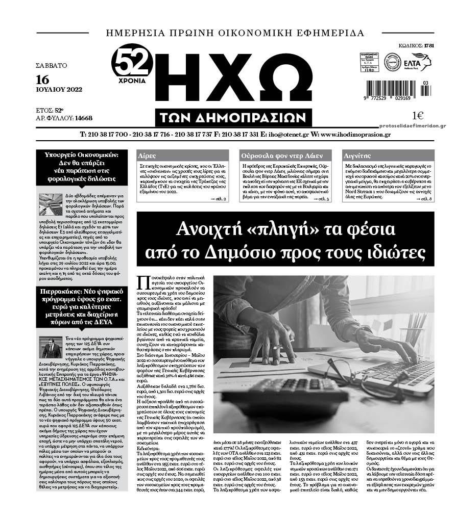 Οι οικονομικές εφημερίδες 16/7/2022 Σταύρος Ιωακείμ 07:42, Σάββατο 16 Ιουλίου 2022 Media Διαβάστε τα πρωτοσέλιδα από τις οικονομικές εφημερίδες, σήμερα 16/07/2022 ΕΦΗΜΕΡΙΔΕΣ ΟΙΚΟΝΟΜΙΚΕΣ ΕΦΗΜΕΡΙΔΕΣ ΠΡΩΤΟΣΕΛΙΔΑ Μοιράσου το: σχολίασε κι εσύ (0 σχόλια) Ακολουθήστε το enikos.gr στο Google News και μάθετε πρώτοι όλες τις ειδήσεις Δείτε όλες τις τελευταίες ειδήσεις από την Ελλάδα και τον Κόσμο στο enikos.gr Ειδήσεις Ροή Ειδήσεων 26 λεπτά πριν Έρευνα MRB: Η πρόθεση ψήφου και τα σημαντικότερα προβλήματα – Οι «λέξεις» που εκφράζουν τους πολίτες 18 λεπτά πριν Αλαλούμ με τις πληρωμές στους αγρότες: Δεν καταβλήθηκε η Βασική Ενίσχυση, αλλά έγινε παρακράτηση της εισφοράς στον ΕΛΓΑ – Τι απαντά η κυβέρνηση 1 ώρα πριν Αγρότες: Πολύωροι αποκλεισμοί και σήμερα στα τελωνεία Ευζώνων, Νίκης, Προμαχώνα και Εξοχής 2 ώρες πριν Ρομπ Ράινερ: Το δείπνο με τους Ομπάμα που δεν έγινε ποτέ και νέα στοιχεία για τον «καβγά» στο πάρτι – Βίντεο με τον γιο του να περιφέρεται κοντά στο σπίτι της τραγωδίας 1 ώρα πριν Κυψέλη: Μαθητές κλείδωσαν τους καθηγητές μέσα στο Γυμνάσιο μετά την επίθεση με μαχαίρι 11 λεπτά πριν Τα 4 ζώδια που ξαναβρίσκουν τον εαυτό τους – «Μπαίνετε επιτέλους στην ουσία των πραγμάτων» 4 ώρες πριν Οπτική ψευδαίσθηση: Μόνο αν είσαι ο Σέρλοκ Χολμς θα βρεις τον σκύλο σε 15 δευτερόλεπτα 3 ώρες πριν Νεολιθικός σκύλος βρέθηκε προσεκτικά θαμμένος στον βυθό λίμνης – Δίπλα του βρέθηκε ένα στιλέτο 2 ώρες πριν Έλαβε τελεσίγραφο από τη σύντροφό του – «Μου είπε πως ή θα της κάνω πρόταση στα δύο χρόνια σχέσης ή θα με χωρίσει» 5 δευτερόλεπτα πριν Λούκας Γιώρκας: «Έχω δεχθεί παρατραβηγμένες συμπεριφορές – Άφησα τον άνθρωπο να εκτονωθεί και συνέχισα» 5 λεπτά πριν Οι Νιου Γιορκ Νικς κατέκτησαν το NBA Cup – MVP ο Τζέιλεν Μπράνσον με 25 πόντους και 8 ασίστ 11 λεπτά πριν Τα 4 ζώδια που ξαναβρίσκουν τον εαυτό τους – «Μπαίνετε επιτέλους στην ουσία των πραγμάτων» 11 λεπτά πριν «Οδύσσεια»: Νέες εντυπωσιακές φωτογραφίες από το κινηματογραφικό έπος του Κρίστοφερ Νόλαν 16 λεπτά πριν Κλιμάκωση από την Παρασκευή προαναγγέλλουν οι αγρότες – «Ψίχουλα οι εξαγγελίες Χατζηδάκη» λέει ο Σωκράτης Αλειφτήρας ENIKOS NETWORK Αδενώματα Υπόφυσης: Μια πάθηση καλοήθης, αλλά όχι αθώα Χρόνια Αναπνευστικά Νοσήματα: 400.000 θάνατοι ετησίως στην Ευρώπη Ειδικό επιδοτούμενο πρόγραμμα κατάρτισης της ΔΥΠΑ για ανέργους: Αρχίζει σήμερα η υποβολή ενστάσεων-Ποιους αφορά Δώρο Χριστουγέννων και επιδόματα της ΔΥΠΑ: Σήμερα αρχίζει η προπληρωμή τους-Ποιους αφορά Σύγχρονος Νοστράδαμος: Προειδοποιεί για «μεγάλο γεγονός» τους επόμενους μήνες που θα συγκλονίσει τη Βρετανία και τον κόσμο Τεστ παρατηρητικότητας: Μπορείτε να βρείτε τις 3 διαφορές στις εικόνες με έναν πιγκουίνο σε 14 δευτερόλεπτα περισσότερα 09:08 , Τετάρτη 17 Δεκεμβρίου 2025 Τηλεθέαση (16/12): Ανακατατάξεις στην πρωινή ψυχαγωγική ζώνη Ξεκάθαρη πρωτιά στην τηλεθέαση για την «Super Κατερίνα» στο δυναμικό κοινό με ποσοστό 18,5%, α... 08:00 , Τετάρτη 17 Δεκεμβρίου 2025 Την Κυριακή με τη Realnews: Δωροεπιταγή 10€ Δωροεπιταγή αξίας 10€ για αγορές άνω των 60€ από τα πολυκαταστήματα FactoryOutlet H προσφορά ι... 07:00 , Τετάρτη 17 Δεκεμβρίου 2025 Την Κυριακή με τη Realnews: Ό,τι και αν αγοράσεις, σκανάρεις και κερδίζεις! Την Κυριακή με τη Realnews: Ό,τι και αν αγοράσεις, σκανάρεις και κερδίζεις! Με το PADU app, το... 05:48 , Τετάρτη 17 Δεκεμβρίου 2025 Οι οικονομικές εφημερίδες 17/12/2025 Διαβάστε τα πρωτοσέλιδα από τις οικονομικές εφημερίδες, σήμερα 17/12/2025. ΤΕΛΕΥΤΑΙΕΣ ΕΙΔΗΣΕΙΣ