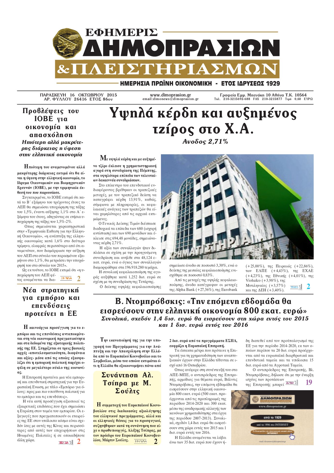 Οι οικονομικές εφημερίδες 16/10/2015 Enikos Newsroom 06:45, Παρασκευή 16 Οκτωβρίου 2015 Media Διαβάστε τα σημερινά πρωτοσέλιδα των οικονομικών εφημερίδων: ΟΙΚΟΝΟΜΙΚΕΣ ΕΦΗΜΕΡΙΔΕΣ ΠΡΩΤΟΣΕΛΙΔΑ Μοιράσου το: σχολίασε κι εσύ (0 σχόλια) Ακολουθήστε το enikos.gr στο Google News και μάθετε πρώτοι όλες τις ειδήσεις Δείτε όλες τις τελευταίες ειδήσεις από την Ελλάδα και τον Κόσμο στο enikos.gr Ειδήσεις Ροή Ειδήσεων 1 ώρα πριν Ευρωπαϊκή Ένωση: Συμφωνία για δάνειο 90 δισ. ευρώ στην Ουκρανία τη διετία 2026-2027 6 ώρες πριν ΟΠΕΚΕΠΕ: Προφυλακιστέος ο φερόμενος αρχηγός και ο λογιστής της εγκληματικής οργάνωσης 7 ώρες πριν Αυξάνουν την πίεση προς την κυβέρνηση οι αγρότες: Κλείνουν παρακαμπτήριους και ανοίγουν διόδια – Τι θα γίνει τις γιορτές 7 ώρες πριν Φοινικούντα: Το Σάββατο απολογείται ο 30χρονος γιος γνωστού επιχειρηματία της Πλάκας που παραδόθηκε – Όσα είπε στους αστυνομικούς και ο ρόλος του στο έγκλημα 5 ώρες πριν ΑΕΚ – Κραϊόβα 3-2: Επική ανατροπή και πρόκριση στους «16» του Conference League η Ένωση 6 ώρες πριν Αρχαιολόγοι ανακάλυψαν ρωμαϊκά τεχνουργήματα από μια πόλη που δεν υπήρξε ποτέ – Τα τρία εντυπωσιακά κτίρια και ο αμφορέας με τις… σαρδέλες 7 ώρες πριν Ύπνος: Η απλή βραδινή ρουτίνα για να προστατεύσετε τα μαλλιά σας από το κρύο κατά τη διάρκεια του χειμώνα 8 ώρες πριν Manifesting: Πώς να συναντήσετε τον σύντροφο της ζωής σας, ανάλογα με τον μήνα γέννησής σας 2 ημέρες πριν 20 χρόνια τα Χριστούγεννα ξεκινούν στα Public με μεγάλη ποικιλία σε δώρα! 7 λεπτά πριν Η TikTok στις ΗΠΑ πωλείται σε Oracle, Silver Lake και MGX – Οι λεπτομέρειες του «deal» 15 λεπτά πριν Αλεξάντερ Λουκασένκο: Η Λευκορωσία βρίσκεται κοντά στην αποκατάσταση των σχέσεών της με τις ΗΠΑ 30 λεπτά πριν Αυστραλία: Κήρυξε την Κυριακή (21/12) ημέρα εθνικού πένθους για τη φονική επίθεση στην παραλία Μπόνταϊ 40 λεπτά πριν Ρόδος: Δάσκαλος καράτε καταδικάστηκε για ασέλγεια σε ανήλικες αθλήτριες – Μαρτυρίες για αγγίγματα σε ευαίσθητα σημεία 55 λεπτά πριν Γουατεμάλα: Εξαρθρώθηκε κύκλωμα διακίνησης μεταναστών προς τις ΗΠΑ – Συνελήφθησαν 14 άτομα ENIKOS NETWORK Σε περίοδο αυξημένης δραστηριότητας η γρίπη στην Ελλάδα-Μέτρα προστασίας από τον ΕΟΔΥ Σκέφτεστε συνέχεια συζητήσεις που έχετε κάνει; Τι σημαίνει αυτό, σύμφωνα με ειδικό Στεγαστικό: Τι λέει η ΠΟΜΙΔΑ για τα νέα μέτρα που ανακοίνωσε ο Κυριάκος Μητσοτάκης Λαγκάρντ: Αισιόδοξη για την ανάπτυξη της Ευρωζώνης, αβέβαιη για τον πληθωρισμό Χαρτογραφώντας το «σημείο χωρίς επιστροφή»: Για πρώτη φορά αποκαλύπτεται με λεπτομέρεια το ακανθώδες όριο της ατμόσφαιρας τ... Η Google καταργεί τη λειτουργία «dark web report» – Πώς θα μπορούν οι χρήστες να διαγράφουν τα δεδομένα τους περισσότερα 02:50 , Παρασκευή 19 Δεκεμβρίου 2025 GNTM: «Κλείδωσαν» οι τέσσερις φιναλίστ – Μεγάλη ανατροπή στις τελευταίες αποχωρήσεις Για προτελευταία φορά εμφανίστηκαν στο πλατό του GNTM οι φιναλίστ του φετινού κύκλου, το βράδυ... 17:45 , Πέμπτη 18 Δεκεμβρίου 2025 ROUK ZOUK: Εορταστικό επεισόδιο με καλεσμένους τους πρωταγωνιστές του «Γιατί ρε πατέρα» Το Σάββατο 20 Δεκεμβρίου στις 21:00, η Ζέτα Μακρυπούλια υποδέχεται εκλεκτούς ηθοποιούς που όλο... 17:20 , Πέμπτη 18 Δεκεμβρίου 2025 Άγιος έρωτας: Η Χριστίνα εξομολογείται στον πατέρα Νικόλαο, απόψε στις 21:00 στον Alpha Η Νότα αποφασίζει να εκδικηθεί τον Πέτρο και τον Στέφανο, για χάρη του Λούη, όμως τα πράγματα ... 16:50 , Πέμπτη 18 Δεκεμβρίου 2025 Να μ’ αγαπάς: Ζωή και Φωτεινή συμφιλιώνονται ως μάνα με κόρη, απόψε στις 20:00 Η ταυτότητα του Άγγελου αποκαλύπτεται στ