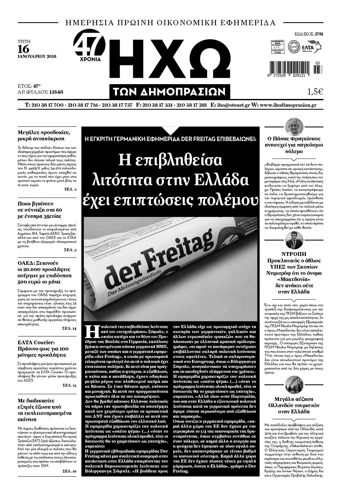 Οι οικονομικές εφημερίδες 16/1/2018 Κώστας Τεό 07:11, Τρίτη 16 Ιανουαρίου 2018 Media Διαβάστε τα σημερινά πρωτοσέλιδα των οικονομικών εφημερίδων: ΟΙΚΟΝΟΜΙΚΕΣ ΕΦΗΜΕΡΙΔΕΣ ΠΡΩΤΟΣΕΛΙΔΑ Μοιράσου το: σχολίασε κι εσύ (0 σχόλια) Ακολουθήστε το enikos.gr στο Google News και μάθετε πρώτοι όλες τις ειδήσεις Δείτε όλες τις τελευταίες ειδήσεις από την Ελλάδα και τον Κόσμο στο enikos.gr Ειδήσεις Ροή Ειδήσεων 2 ώρες πριν Δημοσκόπηση Metron Analysis: Στις 10 μονάδες η διαφορά ΝΔ-ΠΑΣΟΚ, στην 3η θέση η Πλεύση Ελευθερίας – 8 στους 10 στηρίζουν τον αγώνα των αγροτών 6 ώρες πριν Αγρότες: «Όχι στον διάλογο, μας εμπαίζει η κυβέρνηση» – Αποφάσισαν κλιμάκωση των κινητοποιήσεων, τι θα γίνει τα Χριστούγεννα 1 ώρα πριν Νίκος Παππάς στον ΑΝΤ1: «Δεν κρύβομαι – Μετά το συμβάν ακολούθησα κανονικά το πρόγραμμά μου» – ΒΙΝΤΕΟ 3 ώρες πριν Αθήνα: Εξαρθρώθηκε εγκληματική οργάνωση που διακινούσε ναρκωτικά σε μορφή σοκολάτας – Δύο τράπερ ανάμεσα στους 4 συλληφθέντες – ΒΙΝΤΕΟ 1 ώρα πριν Διαμαντής Καραναστάσης: Οδηγούσε υπό την επήρεια αλκοόλ – Του αφαιρέθηκε το δίπλωμα και του επιβλήθηκε πρόστιμο 350 ευρώ 2 ώρες πριν Manifesting: Πώς να συναντήσετε τον σύντροφο της ζωής σας, ανάλογα με τον μήνα γέννησής σας 4 ώρες πριν Γάμος: 11 ψυχρές αλλά ευγενικές φράσεις, που λέει ένας άνδρας όταν σκέφτεται τον χωρισμό 3 ώρες πριν Σφουγγάρισμα: Η συνήθεια που θα σας βοηθήσει να διατηρήσετε το σπίτι σας καθαρό και τακτοποιημένο 2 ημέρες πριν 20 χρόνια τα Χριστούγεννα ξεκινούν στα Public με μεγάλη ποικιλία σε δώρα! 6 λεπτά πριν Αυξάνουν την πίεση προς την κυβέρνηση οι αγρότες: Κλείνουν παρακαμπτήριους και ανοίγουν διόδια – Τι θα γίνει τις γιορτές 11 λεπτά πριν Ελισάβετ Κωνσταντινίδου για τον Γεράσιμο Μιχελή και την Πόπη Χριστοδούλου: «Ξέρω ότι έχουν πάει απλώς κάπου αλλού, ότι δεν είναι ο θάνατος έτσι όπως τον έχουμε στο μυαλό μας» 16 λεπτά πριν Κρήτη: Νέες αποκαλύψεις για τον 54χρονο που κατηγορείται ότι εξαπάτησε τους γονείς του 33χρονου – Ζητούσε τρίχες αγνοουμένων 23 λεπτά πριν Τσιάρας: Δεν θα κινδυνέψουν οι πληρωμές των αγροτών – Χρειαζόμαστε μια νέα πολιτική, ένα restart 29 λεπτά πριν Δέσποινα Βανδή: Το βίντεο που δημοσίευσε με τον Γιώργο Νικολαΐδη – «Έχουμε καταστραφεί από τα μελομακάρονά σου» ENIKOS NETWORK Σε περίοδο αυξημένης δραστηριότητας η γρίπη στην Ελλάδα-Μέτρα προστασίας από τον ΕΟΔΥ Σκέφτεστε συνέχεια συζητήσεις που έχετε κάνει; Τι σημαίνει αυτό, σύμφωνα με ειδικό Λαγκάρντ: Αισιόδοξη για την ανάπτυξη της Ευρωζώνης, αβέβαιη για τον πληθωρισμό ΑΣΕΠ 2ΓΒ/2025: Σήμερα αρχίζει η υποβολή ενστάσεων – Πότε θα βγουν τα οριστικά αποτελέσματα Χαρτογραφώντας το «σημείο χωρίς επιστροφή»: Για πρώτη φορά αποκαλύπτεται με λεπτομέρεια το ακανθώδες όριο της ατμόσφαιρας τ... Η Google καταργεί τη λειτουργία «dark web report» – Πώς θα μπορούν οι χρήστες να διαγράφουν τα δεδομένα τους περισσότερα 17:45 , Πέμπτη 18 Δεκεμβρίου 2025 ROUK ZOUK: Εορταστικό επεισόδιο με καλεσμένους τους πρωταγωνιστές του «Γιατί ρε πατέρα» Το Σάββατο 20 Δεκεμβρίου στις 21:00, η Ζέτα Μακρυπούλια υποδέχεται εκλεκτούς ηθοποιούς που όλο... 17:20 , Πέμπτη 18 Δεκεμβρίου 2025 Άγιος έρωτας: Η Χριστίνα εξομολογείται στον πατέρα Νικόλαο, απόψε στις 21:00 στον Alpha Η Νότα αποφασίζει να εκδικηθεί τον Πέτρο και τον Στέφανο, για χάρη του Λούη, όμως τα πράγματα ... 16:50 , Πέμπτη 18 Δεκεμβρίου 2025 Να μ’ αγαπάς: Ζωή και Φωτεινή συμφιλιώνονται ως μάνα με κόρη, απόψε στις 20:00 Η ταυτότητα του Άγγελου αποκαλύπτεται στο νέο επεισόδιο της σει
