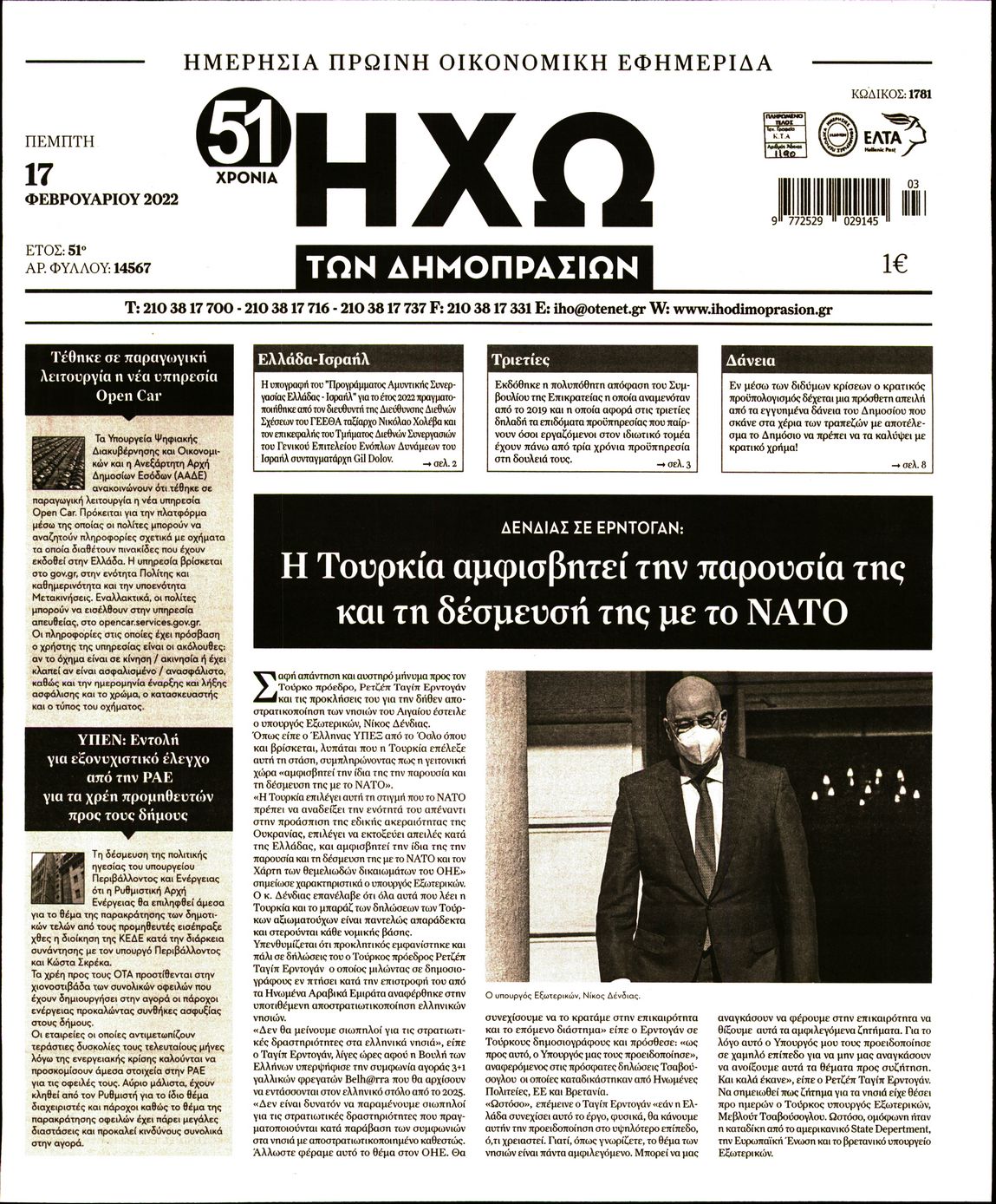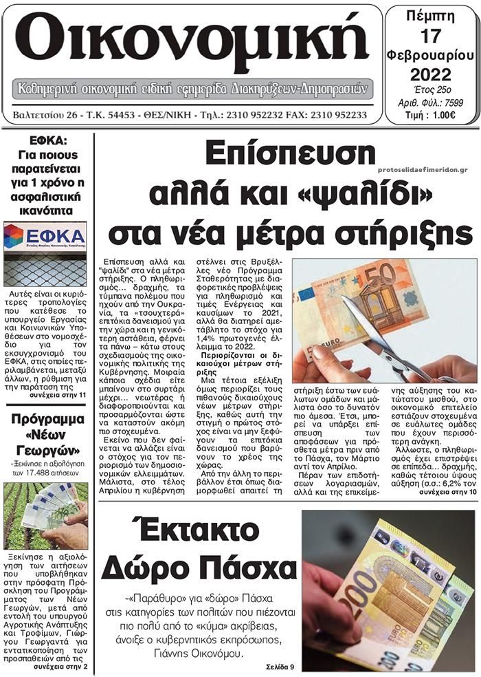 Οι οικονομικές εφημερίδες 17/2/2022 Διονύσης Νίκκας 06:50, Πέμπτη 17 Φεβρουαρίου 2022 Media Διαβάστε τα πρωτοσέλιδα από τις οικονομικές εφημερίδες… ΟΙΚΟΝΟΜΙΚΕΣ ΕΦΗΜΕΡΙΔΕΣ Μοιράσου το: Ουκρανία: Οι απειλές της Ρωσίας «καμπανάκι» για την ΕΕ, λένε οι ευρωβουλευτές Στο “χορό” των Ρίχτερ η Λευκάδα – Ανησυχία από τρεις σεισμούς μέσα σε 10 ώρες Στο “σφυρί” το μεγαλύτερο και πολυτιμότερο μπλε διαμάντι – Αναμένεται να ξεπεράσει τα 48 εκατ. δολάρια σχολίασε κι εσύ (0 σχόλια) Ακολουθήστε το enikos.gr στο Google News και μάθετε πρώτοι όλες τις ειδήσεις Δείτε όλες τις τελευταίες ειδήσεις από την Ελλάδα και τον Κόσμο στο enikos.gr Ειδήσεις Ροή Ειδήσεων 2 ώρες πριν Αυστραλία: Σχέσεις με το ISIS εκτιμάται πως είχαν οι δράστες της τρομοκρατικής επίθεσης στο Σίδνεϊ 2 ώρες πριν Αγρότες: Αμετακίνητοι από τα μπλόκα σε τελωνεία και εθνικές οδούς – Ο χάρτης των κινητοποιήσεων και τα αιτήματά τους 2 ώρες πριν Σοκ στο Χόλιγουντ: Νεκροί από μαχαιριές ο σκηνοθέτης Ρομπ Ράινερ και η σύζυγός του – Αναφορές ότι τους σκότωσε ο γιος τους 2 ώρες πριν Δολοφονία στη Φοινικούντα: Απολογούνται σήμερα οι δύο συλληφθέντες – Στο «κάδρο» και δύο γυναίκες 1 ώρα πριν Τρόμος στην Κηφισιά: Ανήλικος ληστής έκανε κεφαλοκλείδωμα σε γυναίκα υπάλληλο φούρνου και άρπαξε χρήματα – ΒΙΝΤΕΟ 56 λεπτά πριν Κληρονόμησε 2,8 εκατ. ευρώ και φοβάται ότι οι άνδρες θα την πλησιάζουν για τα λεφτά – «Μήπως καλύτερα να το κρατήσω μυστικό;» 2 ώρες πριν Κάτω από παλάτι κρυβόταν ένα άλλο μνημειώδες ανάκτορο: Οι ανασκαφές σε αρχαία πόλη αποκάλυψαν τα ερείπια και τα μυστικά του 4 ώρες πριν Τα ζώδια σήμερα, Δευτέρα 15 Δεκεμβρίου: Ιχθύες, ξεκινήστε από εκεί που η παρουσία σας έχει σημασία 4 ώρες πριν Διατροφή: Γιατρός προειδοποιεί για 2 απλά λάθη που αυξάνουν τον κίνδυνο χρόνιων παθήσεων 6 λεπτά πριν Αλλάζει το σκηνικό του καιρού την Παρασκευή: «Το ατμοσφαιρικό βουνό υποχωρεί και ανοίγει ο δρόμος για τις κακοκαιρίες» 11 λεπτά πριν Λίλα Μπακλέση – Νατάσα Εξηνταβελώνη: «Όταν πας μια Πατρινιά και μια Περιστεριώτισσα σε εστιατόριο με Michelin – Βίντεο από την έξοδό τους 16 λεπτά πριν Τσιάρας για αγροτικές κινητοποιήσεις: Μονόδρομος ο διάλογος – Διαφάνεια με τη μεταφορά του ΟΠΕΚΕΠΕ στην ΑΑΔΕ 21 λεπτά πριν Χάρης Δούκας: «Χρειάζονται υπερβάσεις τώρα για την ανατροπή» 27 λεπτά πριν Θεσσαλονίκη: Πατέρας έσπασε πόρτα παιδικού σταθμού και άρπαξε τα παιδιά του – Είναι σε διάσταση με τη σύζυγό του ENIKOS NETWORK Έλλειψη μαγνησίου: Ποια τα συμπτώματα που επηρεάζουν ύπνο, ενέργεια και διάθεση Έχετε καλή φυσική κατάσταση; Δείτε αν μπορείτε να κάνετε αυτές τις 5 κινήσεις Δάνεια σε ελβετικό φράγκο: Ανακοινώνεται η ρύθμιση- Ποιοι και πόσο θα έχουν όφελος – Όλες οι λεπτομέρειες Τέλος οι διώξεις για χρέη σε Εφορία και ΕΦΚΑ – Τι προβλέπει νέα διάταξη μετά την πτώχευση Σύγχρονος Νοστράδαμος: Προειδοποιεί για «μεγάλο γεγονός» τους επόμενους μήνες που θα συγκλονίσει τη Βρετανία και τον κόσμο Τεστ παρατηρητικότητας: Μπορείτε να βρείτε τις 3 διαφορές στις εικόνες με έναν πιγκουίνο σε 14 δευτερόλεπτα περισσότερα 09:15 , Δευτέρα 15 Δεκεμβρίου 2025 Την Κυριακή με τη Realnews: Ό,τι και αν αγοράσεις, σκανάρεις και κερδίζεις! Την Κυριακή με τη Realnews: Ό,τι και αν αγοράσεις, σκανάρεις και κερδίζεις! Με το PADU app, το... 07:42 , Δευτέρα 15 Δεκεμβρίου 2025 Την Κυριακή με τη Realnews: Δωροεπιταγή10€ Δωροεπιταγή αξίας 10€ για αγορές άνω των 60€ από τα πολυκαταστήματα FactoryOutlet H προσφορά ι... 07:17 , Δευτέρα 15 Δεκεμβρίου 2