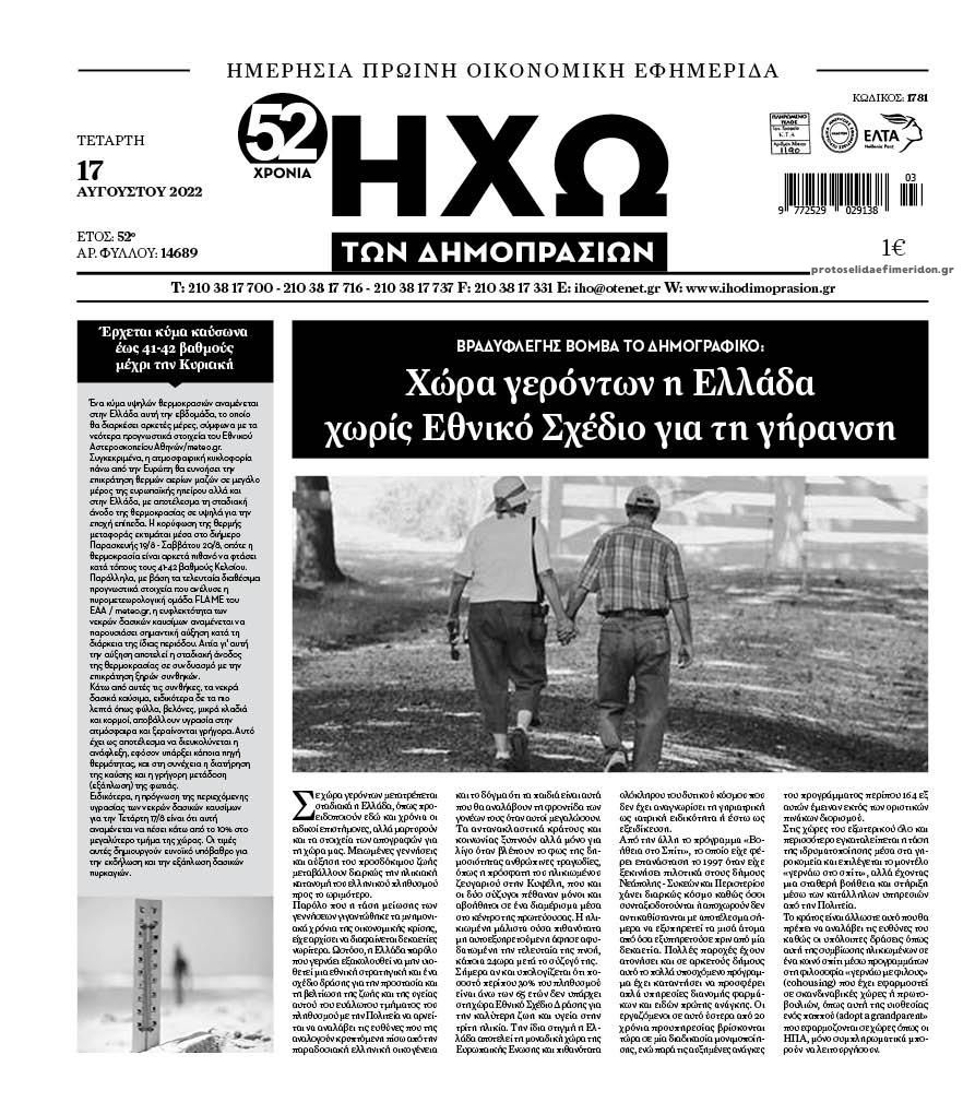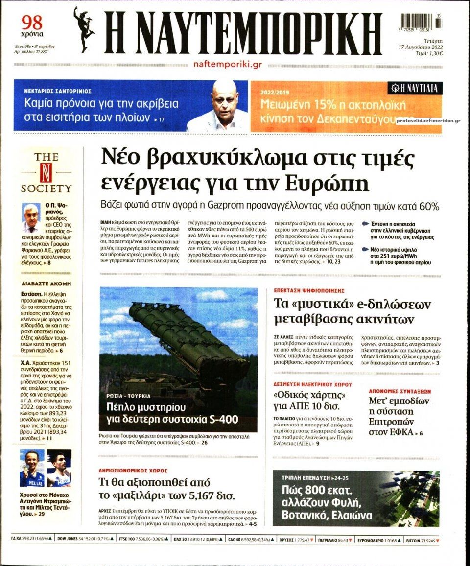 Οι οικονομικές εφημερίδες 17/8/2022 Σήφης Γαρυφαλάκης 06:19, Τετάρτη 17 Αυγούστου 2022 Media Διαβάστε τα πρωτοσέλιδα από τις οικονομικές εφημερίδες, σήμερα 17/08/2022. ΕΦΗΜΕΡΙΔΕΣ ΟΙΚΟΝΟΜΙΚΕΣ ΕΦΗΜΕΡΙΔΕΣ ΠΡΩΤΟΣΕΛΙΔΑ Μοιράσου το: Οι οικονομικές εφημερίδες 16/8/2022 Οι οικονομικές εφημερίδες 13/8/2022 Οι οικονομικές εφημερίδες 12/8/2022 σχολίασε κι εσύ (0 σχόλια) Ακολουθήστε το enikos.gr στο Google News και μάθετε πρώτοι όλες τις ειδήσεις Δείτε όλες τις τελευταίες ειδήσεις από την Ελλάδα και τον Κόσμο στο enikos.gr Ειδήσεις Ροή Ειδήσεων 6 ώρες πριν Μητσοτάκης: Αναγκαία η μεταρρύθμιση του πρωτογενούς τομέα – Τα 6 νέα μέτρα για το στεγαστικό και οι αναφορές σε «Ιθάκη» και «πολιτικούς του καναπέ» 5 ώρες πριν Δάνεια σε ελβετικό φράγκο: Τα βασικά σημεία της ρύθμισης – ανάσας για 40.000 δανειολήπτες – Αναλυτικός οδηγός με ερωτήσεις και απαντήσεις 5 ώρες πριν Κυψέλη: Εξιτήριο πήρε η 14χρονη μαθήτρια που μαχαιρώθηκε από την 16χρονη σε σχολείο – «Θέλω να βοηθήσω το παιδί, έχει μπλέξει με κακές παρέες» 4 ώρες πριν Τραμπ: Γιατί κατέθεσε τώρα την αγωγή κατά του BBC – Πώς η κίνησή του εξυπηρετεί το νέο δόγμα του για «αντίσταση» στην Ευρώπη, υπέρ των συντηρητικών 5 ώρες πριν ΟΠΕΚΕΠΕ – Παράνομες επιδοτήσεις: Ελεύθεροι με περιοριστικούς όρους και οι 7 κατηγορούμενοι που απολογήθηκαν σήμερα 5 ώρες πριν Ανακαλύφθηκε βυθισμένη πέτρινη κατασκευή ανοιχτά της Κριμαίας – Αποτελεί μέρος αρχαίας ελληνικής αποικίας 5 ώρες πριν Ύπνος: Αυτό μπορεί να είναι το χειρότερο λάθος για το βιολογικό ρολόι σας, σύμφωνα με ειδικό 7 ώρες πριν Αριθμολογία: Οι άνθρωποι που έχουν γεννηθεί αυτές τις 3 ημερομηνίες, προσελκύουν μεγάλη τύχη πριν από το τέλος του 2025 9 ώρες πριν Οι 7 συμπεριφορές που μαρτυρούν ότι ένας άνδρας επενδύει μακροπρόθεσμα σε μια σχέση 10 λεπτά πριν Παναγιώτης Μπουγιούρης: «Έχω μια αφέλεια σε σχέση με τη δουλειά μου» 25 λεπτά πριν Παναθηναϊκός: Η έντονη επιθυμία του Ματίας Λεσόρ να επιστρέψει στα γήπεδα – «Μου λείπει πολύ το γ@@@@». 40 λεπτά πριν Νίκος Πλακιάς: Η Μαρία Καρυστιανού πλέον θα κρίνεται ως πολιτικός και όχι ως συγγενής 56 λεπτά πριν Ντόναλντ Τραμπ: Κάλυψε απόλυτα την προσωπάρχη του Λευκού Οίκου: «Ναι, έχω προσωπικότητα αλκοολικού» 1 ώρα πριν ΗΠΑ: Στην αγορά δύο Boeing 747-8 προχωρά η Πολεμική Αεροπορία για την υποστήριξη του προεδρικού στόλου ENIKOS NETWORK Αίτημα ΙΣΑ για την εξαίρεση των προσωπικών γιατρών από τις κατ’ οίκον επισκέψεις Η σκανδιναβική μέθοδος στον ύπνο που μπορεί να σώσει έναν γάμο Πιερρακάκης: Ο προϋπολογισμός συμβάλλει ουσιαστικά στην ενίσχυση της αγοραστικής δύναμης της πλειονότητας των εργαζομένων e-ΕΦΚΑ: Παρατείνεται η προθεσμία για την υποβολή ΑΠΔ – Ποιους αφορά Σύγχρονος Νοστράδαμος: Προειδοποιεί για «μεγάλο γεγονός» τους επόμενους μήνες που θα συγκλονίσει τη Βρετανία και τον κόσμο Τεστ παρατηρητικότητας: Μπορείτε να βρείτε τις 3 διαφορές στις εικόνες με έναν πιγκουίνο σε 14 δευτερόλεπτα περισσότερα 20:06 , Τρίτη 16 Δεκεμβρίου 2025 Ο ΣΚΑΙ καταγγέλλει τον ΕΚΚΟΜΕΔ Επιστολή με την οποία καταγράφει την έντονη διαμαρτυρία του προς τον διευθύνοντα σύμβουλο του... 17:40 , Τρίτη 16 Δεκεμβρίου 2025 Eurovision: Στις 4 Ιανουαρίου αποκαλύπτονται τα 28 τραγούδια του ελληνικού τελικού Η αγωνία τελειώνει, η γιορτή της Eurovision αρχίζει στην ΕΡΤ από τις πρώτες ημέρες της νέας χρ... 17:09 , Τρίτη 16 Δεκεμβρίου 2025 Alter Ego Media: Βαθύτατη θλίψη και ειλικρινή συλλυπητήρια για την απώλεια της Ειρήνης Μαρινάκη Τη βαθύτατη θλίψη και τα ει