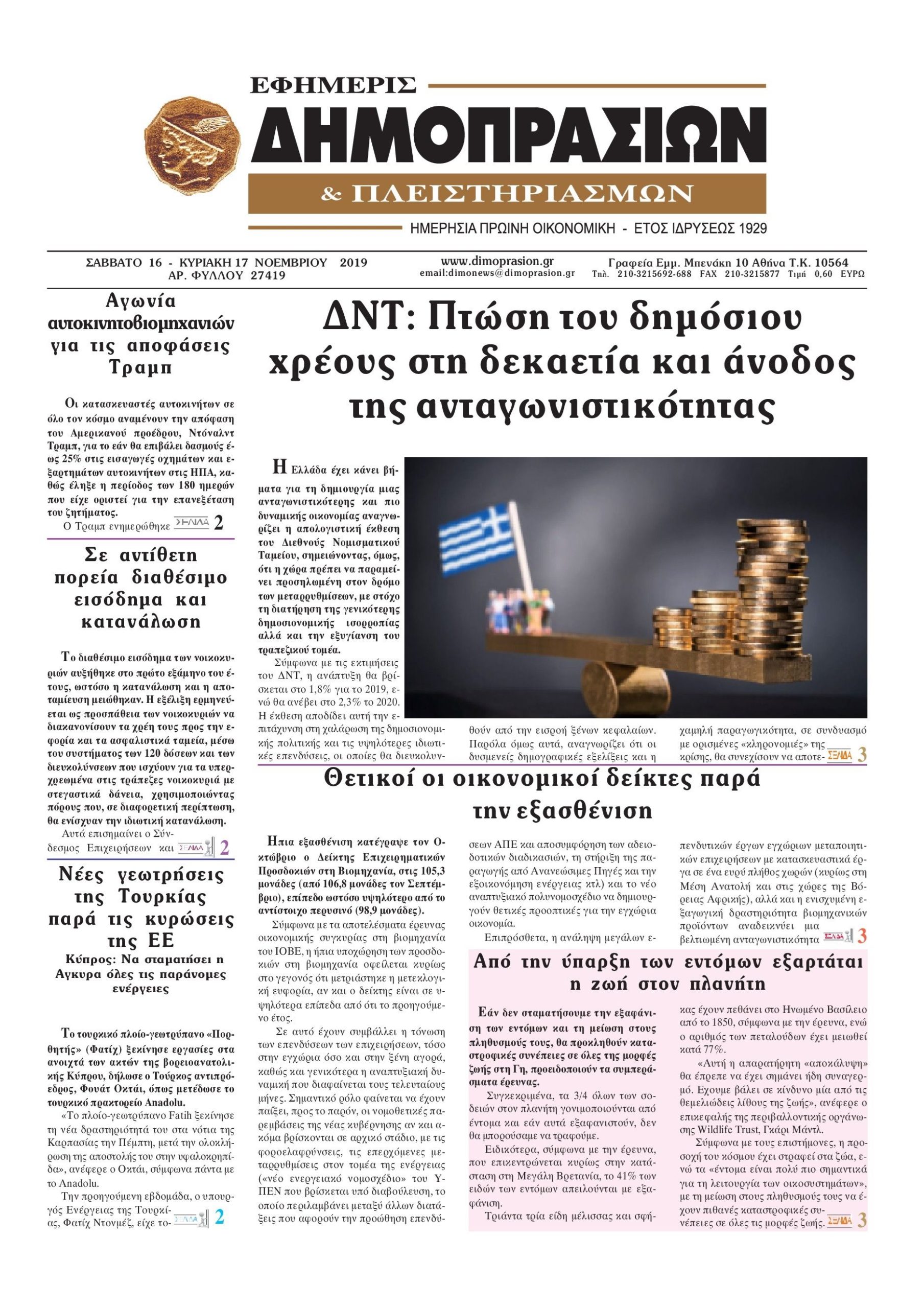 Οι οικονομικές εφημερίδες 17/11/19 Διονύσης Νίκκας 07:36, Κυριακή 17 Νοεμβρίου 2019 Media Διαβάστε τα πρωτοσέλιδα των οικονομικών εφημερίδων… ΕΦΗΜΕΡΙΔΕΣ ΟΙΚΟΝΟΜΙΚΕΣ Μοιράσου το: σχολίασε κι εσύ (0 σχόλια) Ακολουθήστε το enikos.gr στο Google News και μάθετε πρώτοι όλες τις ειδήσεις Δείτε όλες τις τελευταίες ειδήσεις από την Ελλάδα και τον Κόσμο στο enikos.gr Ειδήσεις Ροή Ειδήσεων 3 ώρες πριν ΣΥΡΙΖΑ: Διαγράφεται ο ευρωβουλευτής Νίκος Παππάς μετά την μήνυση δημοσιογράφου για ξυλοδαρμό 1 ώρα πριν Τουρκία: Επιδιώκει την επιστροφή των S-400 στη Ρωσία – Οι αμερικανικές πιέσεις 2 ώρες πριν ΟΠΕΚΕΠΕ: Ελεύθερες με όρους η σύζυγος και η αδελφή του φερόμενου αρχηγού – Τι υποστήριξαν 4 ώρες πριν Πώς στήθηκε η επιχείρηση «Ίπαλλος» που οδήγησε στη σύλληψη του «Έλληνα Εσκομπάρ» – «Ο πόλεμος ενάντια στους εμπόρους ναρκωτικών θα συνεχιστεί» 4 ώρες πριν Κυψέλη: Στη φυλακή η 16χρονη που μαχαίρωσε συμμαθήτριά της 4 ώρες πριν Τα 3 ζώδια που θα δουν τη ζωή τους να αλλάζει ριζικά το 2026 – «Όλα γίνονται καλύτερα σταδιακά» 9 ώρες πριν «Δεν είχα κλάψει από τότε που διαγνώστηκα με καρκίνο, ώσπου ένα τηλεφώνημα με έκανε να λυγίσω» – Η συγκλονιστική εξομολόγηση ενός άνδρα 5 ώρες πριν Ο σπάνιος σεισμός που έλυσε τα χέρια των επιστημόνων – Αποκάλυψε ακριβώς όσα αναζητούσαν 10 ώρες πριν 20 χρόνια τα Χριστούγεννα ξεκινούν στα Public με μεγάλη ποικιλία σε δώρα! 7 λεπτά πριν Εξεταστική για ΟΠΕΚΕΠΕ – Σκέρτσος: Διαχρονικά τα θέματα του οργανισμού – Δεν έγινε καμία αναφορά μου σε ποινικές διαδικασίες 13 λεπτά πριν Συγκλονιστικό βίντεο: Τρόμος για τουρίστες που σώθηκαν την τελευταία στιγμή από λεωφορείο που κατρακυλούσε σε φαράγγι 18 λεπτά πριν Χριστίνα Μπόμπα: Η αποκάλυψη για το περιστατικό με την κόρη της – «Σκαρφάλωνε και μίλαγε μόνη της…» 23 λεπτά πριν Εξεταστική για ΟΠΕΚΕΠΕ: Μεγάλη ένταση μεταξύ Κωνσταντοπούλου και Λαζαρίδη – ΒΙΝΤΕΟ 27 λεπτά πριν Νίκος Γιαννόπουλος: «Τα γεγονότα μιλούν από μόνα τους» – Η ανάρτηση του δημοσιογράφου που μήνυσε τον Νίκο Παππά για ξυλοδαρμό ENIKOS NETWORK 2,6 εκατομμύρια πολίτες έχουν ήδη εμβολιαστεί κατά της γρίπης Σοβαροί κίνδυνοι από τη λάθος χορήγηση φαρμάκου για τις αιμορραγίες-Συστάσεις προς τους γιατρούς Προκήρυξη ΑΣΕΠ για 4.276 μόνιμες προσλήψεις στο Δημόσιο: Βγήκαν τα προσωρινά αποτελέσματα – Ποιοι μπορούν να υποβάλουν ένσ... Υπουργείο Εργασίας: Ο οδικός χάρτης για την ενίσχυση του πλαισίου των Συλλογικών Διαπραγματεύσεων – Οι 5 άξονες του σχεδίου... Χαρτογραφώντας το «σημείο χωρίς επιστροφή»: Για πρώτη φορά αποκαλύπτεται με λεπτομέρεια το ακανθώδες όριο της ατμόσφαιρας τ... Η Google καταργεί τη λειτουργία «dark web report» – Πώς θα μπορούν οι χρήστες να διαγράφουν τα δεδομένα τους περισσότερα 12:35 , Τετάρτη 17 Δεκεμβρίου 2025 Μίρκα Παπακωνσταντίνου: «Δεν ήμουν αισιόδοξη για τα νούμερα – Είμαι ρεαλίστρια» Στα γυρίσματα του εορταστικού επεισοδίου της αγαπημένης σειράς “Το Σόι Σου”, βρέθηκε η κάμερα ... 12:12 , Τετάρτη 17 Δεκεμβρίου 2025 Ακούστε την εκπομπή του Νίκου Χατζηνικολάου 17/12/2025 Ακούστε την εκπομπή του Νίκου Χατζηνικολάου στον ραδιοφωνικό σταθμό RealFm 97,8, την Τετάρτη 1... 11:35 , Τετάρτη 17 Δεκεμβρίου 2025 Home Alone: Το σπίτι της ταινίας θα ανακαινιστεί – Επιστροφή στην αισθητική της δεκαετίας του ’90 Οι νέοι ιδιοκτήτες του πραγματικού σπιτιού που παρουσιάζεται στην κλασική ταινία του 1990 «Hom... 11:25 , Τετάρτη 17 Δεκεμβρίου 2025 Grand Hotel: Απόψε το τελευταίο επεισόδιο της χρονιάς – Όλα τα μυστικά μένου
