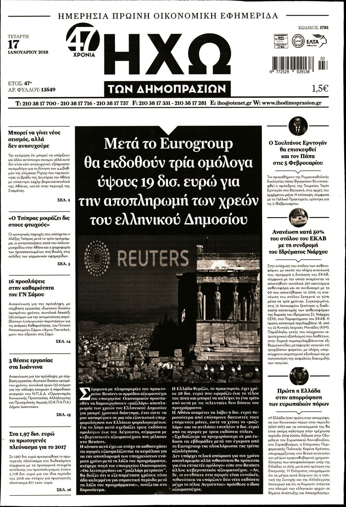 Οι οικονομικές εφημερίδες 17/1/2018 Enikos Newsroom 07:20, Τετάρτη 17 Ιανουαρίου 2018 Media Διαβάστε τα σημερινά πρωτοσέλιδα των οικονομικών εφημερίδων: ΟΙΚΟΝΟΜΙΚΕΣ ΕΦΗΜΕΡΙΔΕΣ ΠΡΩΤΟΣΕΛΙΔΑ Μοιράσου το: σχολίασε κι εσύ (0 σχόλια) Ακολουθήστε το enikos.gr στο Google News και μάθετε πρώτοι όλες τις ειδήσεις Δείτε όλες τις τελευταίες ειδήσεις από την Ελλάδα και τον Κόσμο στο enikos.gr Ειδήσεις Ροή Ειδήσεων 3 ώρες πριν Αγρότες: «Όχι στον διάλογο, μας εμπαίζει η κυβέρνηση» – Αποφάσισαν κλιμάκωση των κινητοποιήσεων, τι θα γίνει τα Χριστούγεννα 3 ώρες πριν Την πρώτη Belharra παρέλαβε η χώρα μας, υψώθηκε η ελληνική σημαία στη φρεγάτα «Κίμων» – Δένδιας: «Το ισχυρότερο Πολεμικό Ναυτικό που είχε ποτέ ο ελληνισμός» 1 ώρα πριν Γιώργος Μαζωνάκης: «Έχει υποστεί ένα σωρό εκβιαστικές πρακτικές – Του είπαν ότι θα του βάλουν τον συγκεκριμένο άνθρωπο να τον καταγγείλει» 3 ώρες πριν Μιχάλης Χουρδάκης: «Είμαι διαθέσιμος να συμβάλω στην προσωρινή κάλυψη του ιατρείου της Ψερίμου» – Η επιστολή στον Άδωνι Γεωργιάδη 3 ώρες πριν Εξώδικο Γεωργιάδη στην Κωνσταντοπούλου – «Με κατηγόρησε ότι έχω καταδικαστεί για παιδεραστία» 43 λεπτά πριν Γάμος: 11 ψυχρές αλλά ευγενικές φράσεις, που λέει ένας άνδρας όταν σκέφτεται τον χωρισμό 4 ώρες πριν Τα 5 ζώδια που θα ευνοηθούν στα οικονομικά τους το 2026 – «Τραβούν το χρήμα σαν μαγνήτες» 5 ώρες πριν Αυτό που κρύβεται κάτω από τη Γροιλανδία θα μπορούσε να ανατρέψει όσα γνωρίζουμε για την άνοδο της στάθμης των θαλασσών 1 ημέρα πριν 20 χρόνια τα Χριστούγεννα ξεκινούν στα Public με μεγάλη ποικιλία σε δώρα! 3 λεπτά πριν ΕΕ: Καλεί τα Σκόπια να σέβονται τις δεσμεύσεις από τη διαδικασία ένταξης και το Διεθνές Δίκαιο – Η χρηματοδότηση του Διαδρόμου Χ 9 λεπτά πριν Σοκ στη Σουηδία: 12χρονος πληρωμένος δολοφόνος σκότωσε λάθος άτομο 13 λεπτά πριν FIFA: Έτοιμη να… επανεντάξει τη Ρωσία από το 2026 18 λεπτά πριν Live η κίνηση: Στο «κόκκινο» Κηφισός, Κηφισίας και οι δρόμοι στο κέντρο – Καθυστερήσεις και στην Αττική Οδό 22 λεπτά πριν Εξεταστική για ΟΠΕΚΕΠΕ: Νέο επεισόδιο Κωνσταντοπούλου με Λαζαρίδη και Συρεγγέλα – ΒΙΝΤΕΟ ENIKOS NETWORK Ξεκίνησε η «επέλαση» της γρίπης στην Ελλάδα-Ποιοι κινδυνεύουν ΕΟΔΥ: Δωρεάν τεστ για HIV, Ηπατίτιδες, Σύφιλη, Χλαμύδια, Γονόρροια Κλιμάκωση των κινητοποιήσεων αποφάσισαν οι αγρότες, κλείνουν παρακαμπτήριους την Παρασκευή – Τι απαντά η κυβέρνηση Ευλογιά αιγοπροβάτων: Νέες αποζημιώσεις ύψους 26,02 εκατ. ευρώ σε κτηνοτρόφους – Η κατανομή ανά Περιφέρεια Χαρτογραφώντας το «σημείο χωρίς επιστροφή»: Για πρώτη φορά αποκαλύπτεται με λεπτομέρεια το ακανθώδες όριο της ατμόσφαιρας τ... Η Google καταργεί τη λειτουργία «dark web report» – Πώς θα μπορούν οι χρήστες να διαγράφουν τα δεδομένα τους περισσότερα 17:45 , Πέμπτη 18 Δεκεμβρίου 2025 ROUK ZOUK: Εορταστικό επεισόδιο με καλεσμένους τους πρωταγωνιστές του «Γιατί ρε πατέρα» Το Σάββατο 20 Δεκεμβρίου στις 21:00, η Ζέτα Μακρυπούλια υποδέχεται εκλεκτούς ηθοποιούς που όλο... 17:20 , Πέμπτη 18 Δεκεμβρίου 2025 Άγιος έρωτας: Η Χριστίνα εξομολογείται στον πατέρα Νικόλαο, απόψε στις 21:00 στον Alpha Η Νότα αποφασίζει να εκδικηθεί τον Πέτρο και τον Στέφανο, για χάρη του Λούη, όμως τα πράγματα ... 16:50 , Πέμπτη 18 Δεκεμβρίου 2025 Να μ’ αγαπάς: Ζωή και Φωτεινή συμφιλιώνονται ως μάνα με κόρη, απόψε στις 20:00 Η ταυτότητα του Άγγελου αποκαλύπτεται στο νέο επεισόδιο της σειράς “Να μ’ αγαπάς... 15:52 , Πέμπτη 18 Δεκεμβρίου 2025 Το Σπίτι Δίπλα Στο Ποτάμι: Το καθηλωτικό τελευταίο επεισόδιο για το 2025 απόψε