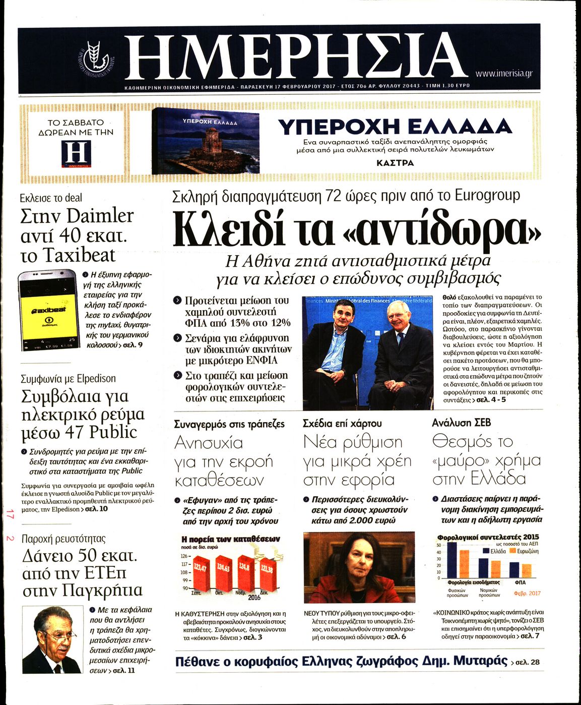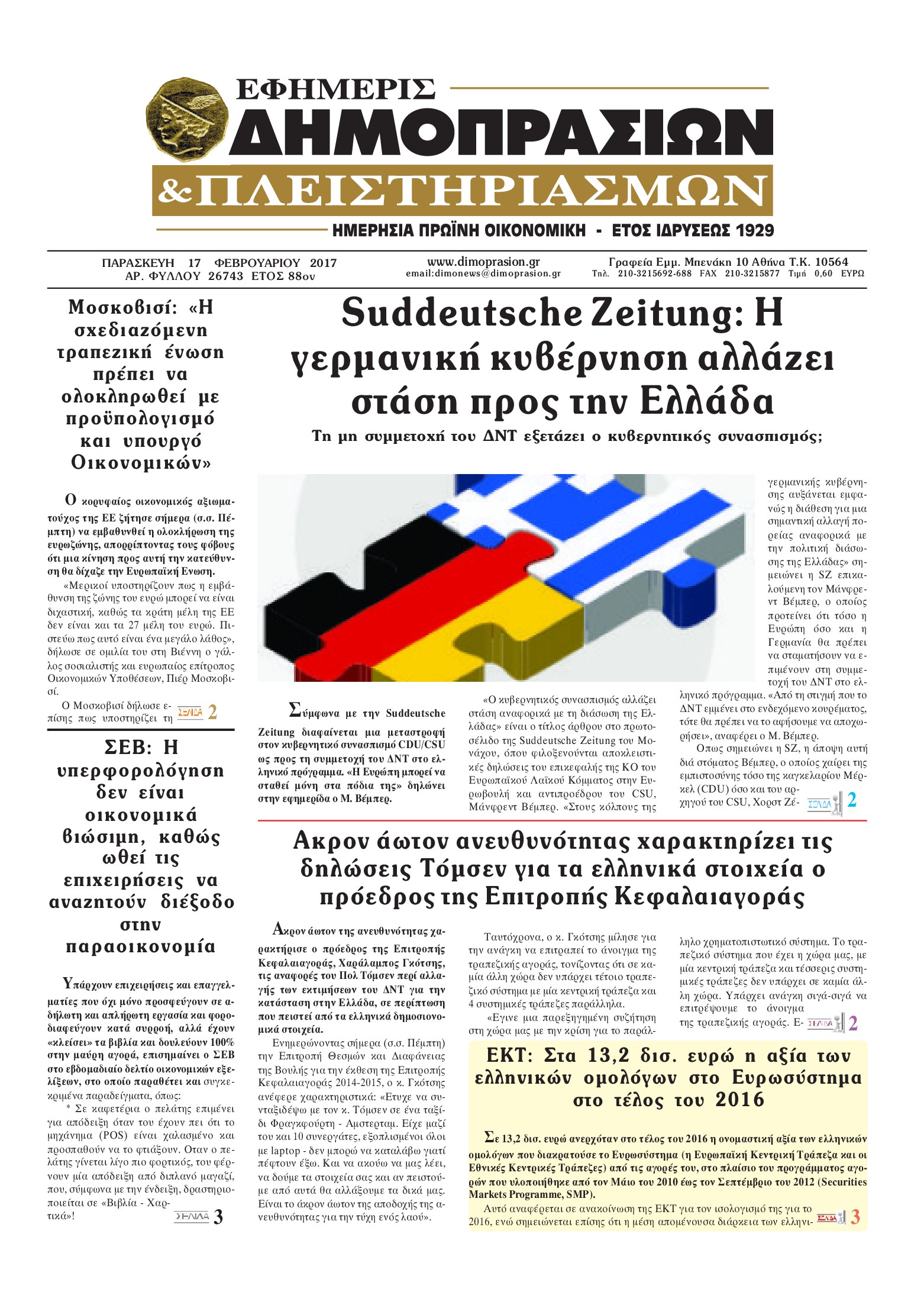Οι οικονομικές εφημερίδες 17/2/2017 Enikos Newsroom 06:33, Παρασκευή 17 Φεβρουαρίου 2017 Media Διαβάστε τα σημερινά πρωτοσέλιδα των οικονομικών εφημερίδων: ΟΙΚΟΝΟΜΙΚΕΣ ΕΦΗΜΕΡΙΔΕΣ ΠΡΩΤΟΣΕΛΙΔΑ Μοιράσου το: σχολίασε κι εσύ (0 σχόλια) Ακολουθήστε το enikos.gr στο Google News και μάθετε πρώτοι όλες τις ειδήσεις Δείτε όλες τις τελευταίες ειδήσεις από την Ελλάδα και τον Κόσμο στο enikos.gr Ειδήσεις Ροή Ειδήσεων 2 ώρες πριν Αυξάνουν την πίεση προς την κυβέρνηση οι αγρότες: Κλείνουν παρακαμπτήριους και ανοίγουν διόδια – Τι θα γίνει τις γιορτές 1 ώρα πριν ΟΠΕΚΕΠΕ: Προφυλακιστέος ο φερόμενος αρχηγός και ο λογιστής της εγκληματικής οργάνωσης 2 ώρες πριν Φοινικούντα: Το Σάββατο απολογείται ο 30χρονος γιος γνωστού επιχειρηματία της Πλάκας που παραδόθηκε – Όσα είπε στους αστυνομικούς και ο ρόλος του στο έγκλημα 2 ώρες πριν Μπορεί ο Μαδούρο να αντέξει τον αποκλεισμό του Τραμπ; Τι θα χρειαστεί η Ουάσινγκτον για να τον ανατρέψει 3 ώρες πριν Πρίγκιπας Ουίλιαμ – Κέιτ: Η νέα οικογενειακή φωτογραφία για τις Χριστουγεννιάτικες κάρτες του 2025 3 ώρες πριν Ύπνος: Η απλή βραδινή ρουτίνα για να προστατεύσετε τα μαλλιά σας από το κρύο κατά τη διάρκεια του χειμώνα 4 ώρες πριν Manifesting: Πώς να συναντήσετε τον σύντροφο της ζωής σας, ανάλογα με τον μήνα γέννησής σας 2 ημέρες πριν 20 χρόνια τα Χριστούγεννα ξεκινούν στα Public με μεγάλη ποικιλία σε δώρα! 2 ώρες πριν Αρχαιολόγοι ανακάλυψαν ρωμαϊκά τεχνουργήματα από μια πόλη που δεν υπήρξε ποτέ – Τα τρία εντυπωσιακά κτίρια και ο αμφορέας με τις… σαρδέλες 51 δευτερόλεπτα πριν Conference League: Με Νόα, Ντρίτα, Άλκμααρ ή Τσέλιε στους «16» η ΑΕΚ 9 λεπτά πριν Conference League: Απευθείας στους «16» η ΑΕΚ Λάρνακας και η Ρακόβ των Σβάρνα και Κωνσταντόπουλου – Τα αποτελέσματα και η βαθμολογία, 3η η ΑΕΚ 19 λεπτά πριν Σε ομάδες που συνδέονται με το ρωσικό κράτος αποδίδει η Δανία δύο κυβερνοεπιθέσεις που δέχθηκε 34 λεπτά πριν Βαθμολογία UEFA: Η Πολωνία προσπέρασε την Ελλάδα 50 λεπτά πριν Conference League: Οι ομάδες που προκρίθηκαν στους «16» και τα «ζευγαρώματα» στα νοκ άουτ ENIKOS NETWORK Σε περίοδο αυξημένης δραστηριότητας η γρίπη στην Ελλάδα-Μέτρα προστασίας από τον ΕΟΔΥ Σκέφτεστε συνέχεια συζητήσεις που έχετε κάνει; Τι σημαίνει αυτό, σύμφωνα με ειδικό Στεγαστικό: Τι λέει η ΠΟΜΙΔΑ για τα νέα μέτρα που ανακοίνωσε ο Κυριάκος Μητσοτάκης Λαγκάρντ: Αισιόδοξη για την ανάπτυξη της Ευρωζώνης, αβέβαιη για τον πληθωρισμό Χαρτογραφώντας το «σημείο χωρίς επιστροφή»: Για πρώτη φορά αποκαλύπτεται με λεπτομέρεια το ακανθώδες όριο της ατμόσφαιρας τ... Η Google καταργεί τη λειτουργία «dark web report» – Πώς θα μπορούν οι χρήστες να διαγράφουν τα δεδομένα τους περισσότερα 17:45 , Πέμπτη 18 Δεκεμβρίου 2025 ROUK ZOUK: Εορταστικό επεισόδιο με καλεσμένους τους πρωταγωνιστές του «Γιατί ρε πατέρα» Το Σάββατο 20 Δεκεμβρίου στις 21:00, η Ζέτα Μακρυπούλια υποδέχεται εκλεκτούς ηθοποιούς που όλο... 17:20 , Πέμπτη 18 Δεκεμβρίου 2025 Άγιος έρωτας: Η Χριστίνα εξομολογείται στον πατέρα Νικόλαο, απόψε στις 21:00 στον Alpha Η Νότα αποφασίζει να εκδικηθεί τον Πέτρο και τον Στέφανο, για χάρη του Λούη, όμως τα πράγματα ... 16:50 , Πέμπτη 18 Δεκεμβρίου 2025 Να μ’ αγαπάς: Ζωή και Φωτεινή συμφιλιώνονται ως μάνα με κόρη, απόψε στις 20:00 Η ταυτότητα του Άγγελου αποκαλύπτεται στο νέο επεισόδιο της σειράς “Να μ’ αγαπάς... 15:52 , Πέμπτη 18 Δεκεμβρίου 2025 Το Σπίτι Δίπλα Στο Ποτάμι: Το καθηλωτικό τελευταίο επεισόδιο για το 2025 απόψε στις 22:30 Καθηλώνει το σημερινό επεισόδιο της σειράς “Το Σπίτι Δίπλα Στο