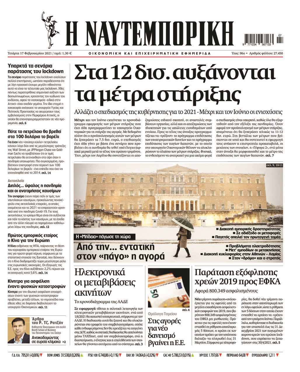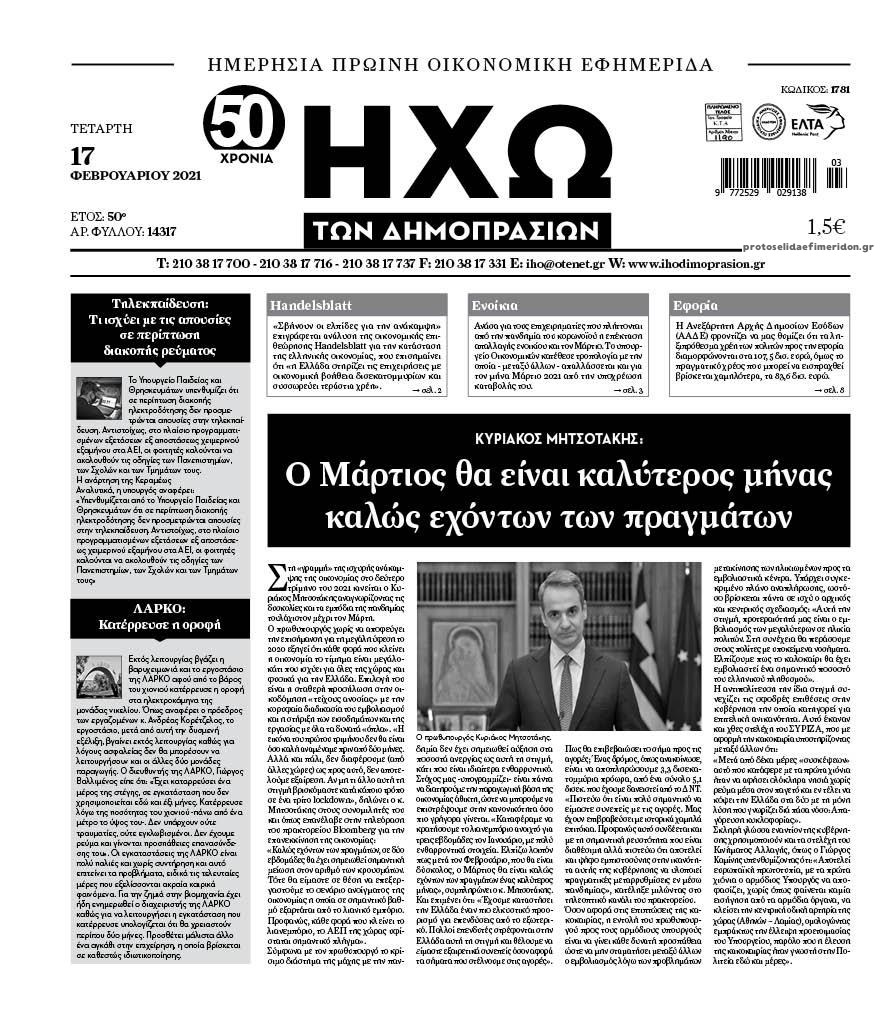 Οι οικονομικές εφημερίδες 17/2/2021 Σήφης Γαρυφαλάκης 06:03, Τετάρτη 17 Φεβρουαρίου 2021 Media Διαβάστε τα πρωτοσέλιδα των οικονομικών εφημερίδων… ΕΦΗΜΕΡΙΔΕΣ ΟΙΚΟΝΟΜΙΚΕΣ ΕΦΗΜΕΡΙΔΕΣ ΠΡΩΤΟΣΕΛΙΔΑ ΠΡΩΤΟΣΕΛΙΔΑ ΕΦΗΜΕΡΙΔΩΝ Μοιράσου το: σχολίασε κι εσύ (0 σχόλια) Ακολουθήστε το enikos.gr στο Google News και μάθετε πρώτοι όλες τις ειδήσεις Δείτε όλες τις τελευταίες ειδήσεις από την Ελλάδα και τον Κόσμο στο enikos.gr Ειδήσεις Ροή Ειδήσεων 2 ώρες πριν Πούτιν: «Ανοησίες» και «υστερίες» οι ισχυρισμοί της Ευρώπης για πιθανή σύγκρουση με τη Ρωσία – «Κάνουν πλύση εγκεφάλου» 6 ώρες πριν Έρευνα MRB: Η πρόθεση ψήφου και τα σημαντικότερα προβλήματα – Οι «λέξεις» που εκφράζουν τους πολίτες 3 ώρες πριν Αμοργός: «Θα προσπαθήσω να το κάνω κάθε μέρα» – Ποιος είναι ο αγρότης που έστησε μόνος του το πρώτο μπλόκο στο νησί 52 λεπτά πριν Τραγωδία στην Αλεξανδρούπολη: Παιδάκι 3 ετών μεταφέρθηκε νεκρό από τη μητέρα του στο νοσοκομείο 2 ώρες πριν Συνάντηση Μητσοτάκη με την Κ.Ο. της ΝΔ: Οι αφίξεις των βουλευτών, τα γλυκά και τα «πηγαδάκια» 6 ώρες πριν Τα 4 ζώδια που ξαναβρίσκουν τον εαυτό τους – «Μπαίνετε επιτέλους στην ουσία των πραγμάτων» 7 ώρες πριν 20 χρόνια τα Χριστούγεννα ξεκινούν στα Public με μεγάλη ποικιλία σε δώρα! 5 ώρες πριν «Δεν είχα κλάψει από τότε που διαγνώστηκα με καρκίνο, ώσπου ένα τηλεφώνημα με έκανε να λυγίσω» – Η συγκλονιστική εξομολόγηση ενός άνδρα 4 ώρες πριν Τα 7 σπάνια χαρακτηριστικά που κάνουν κάποιους ανθρώπους ακαταμάχητους 7 λεπτά πριν Νέο επεισόδιο στην Εξεταστική ανάμεσα σε Κωνσταντοπούλου και Συρεγγέλα – Διακόπηκε προσωρινά η συνεδρίαση 13 λεπτά πριν Εξαφάνιση 33χρονου γιατρού στην Κρήτη: Για απάτη κατηγορείται ο ιδιωτικός ερευνητής που συνελήφθη 19 λεπτά πριν Εξεταστική για ΟΠΕΚΕΠΕ-Μυλωνάκης: Διαχρονικές, διακομματικές οι παθογένειες – Τι είπε για Μπουκώρο και Βάρρα 25 λεπτά πριν Παναθηναϊκός: Θέλει τον Κέπα της Άρσεναλ δανεικό για 6 μήνες 30 λεπτά πριν Το Λαϊκό Λαχείο στον ρυθμό των Χριστουγέννων: Μοιράζει μέχρι και 1.000.000 ευρώ στην ειδική κλήρωση της Παρασκευής 19 Δεκεμβρίου ENIKOS NETWORK 5 πράγματα που αποφεύγει γαστρεντερολόγος για να μειώσει τον κίνδυνο καρκίνου του εντέρου Ανησυχητική αύξηση της υπέρτασης στα παιδιά – Πώς θα τα προστατέψουμε; Συντάξεις Ιανουαρίου 2026: Σε ποιους θα πιστωθούν την Πέμπτη τα χρήματα και τι αυξήσεις θα δοθούν – Δείτε αναλυτικά παραδεί... ΕΛΕΤΑΕΝ: Πόσα χρήματα θα δοθούν σε δήμους και νοικοκυριά από τις ΑΠΕ Σύγχρονος Νοστράδαμος: Προειδοποιεί για «μεγάλο γεγονός» τους επόμενους μήνες που θα συγκλονίσει τη Βρετανία και τον κόσμο Τεστ παρατηρητικότητας: Μπορείτε να βρείτε τις 3 διαφορές στις εικόνες με έναν πιγκουίνο σε 14 δευτερόλεπτα περισσότερα 12:35 , Τετάρτη 17 Δεκεμβρίου 2025 Μίρκα Παπακωνσταντίνου: «Δεν ήμουν αισιόδοξη για τα νούμερα – Είμαι ρεαλίστρια» Στα γυρίσματα του εορταστικού επεισοδίου της αγαπημένης σειράς “Το Σόι Σου”, βρέθηκε η κάμερα ... 12:12 , Τετάρτη 17 Δεκεμβρίου 2025 Ακούστε την εκπομπή του Νίκου Χατζηνικολάου 17/12/2025 Ακούστε την εκπομπή του Νίκου Χατζηνικολάου στον ραδιοφωνικό σταθμό RealFm 97,8, την Τετάρτη 1... 11:35 , Τετάρτη 17 Δεκεμβρίου 2025 Home Alone: Το σπίτι της ταινίας θα ανακαινιστεί – Επιστροφή στην αισθητική της δεκαετίας του ’90 Οι νέοι ιδιοκτήτες του πραγματικού σπιτιού που παρουσιάζεται στην κλασική ταινία του 1990 «Hom... 11:25 , Τετάρτη 17 Δεκεμβρίου 2025 Grand Hotel: Απόψε το τελευταίο επεισόδιο της χρονιάς – Όλα τα μυστικά μένουν εδώ Το τελ