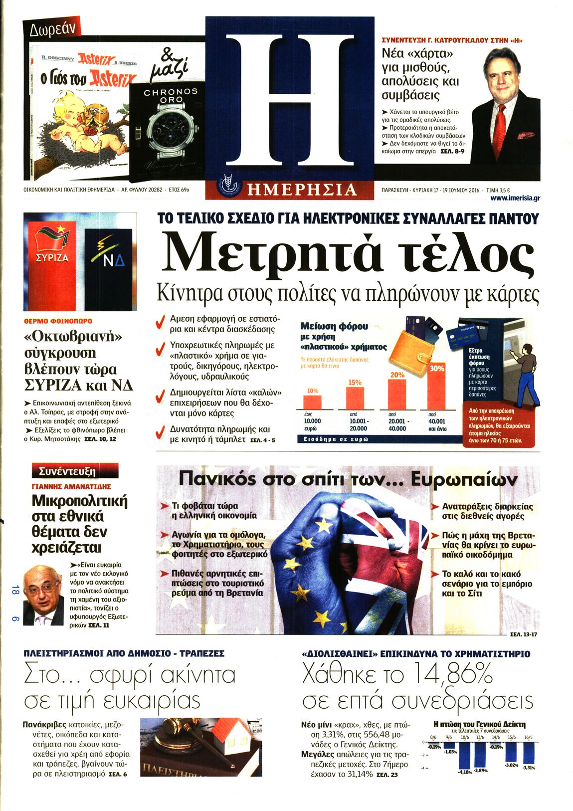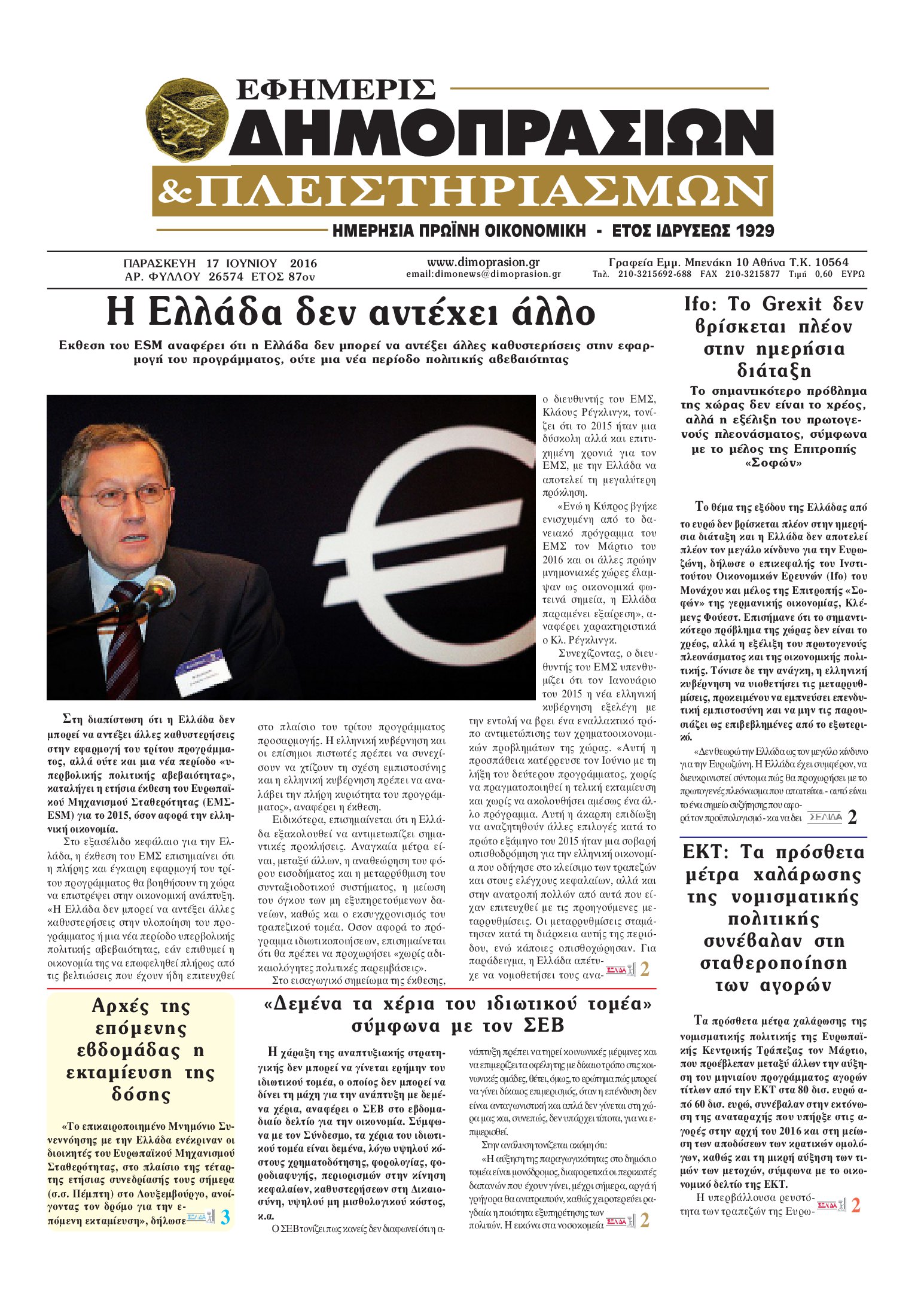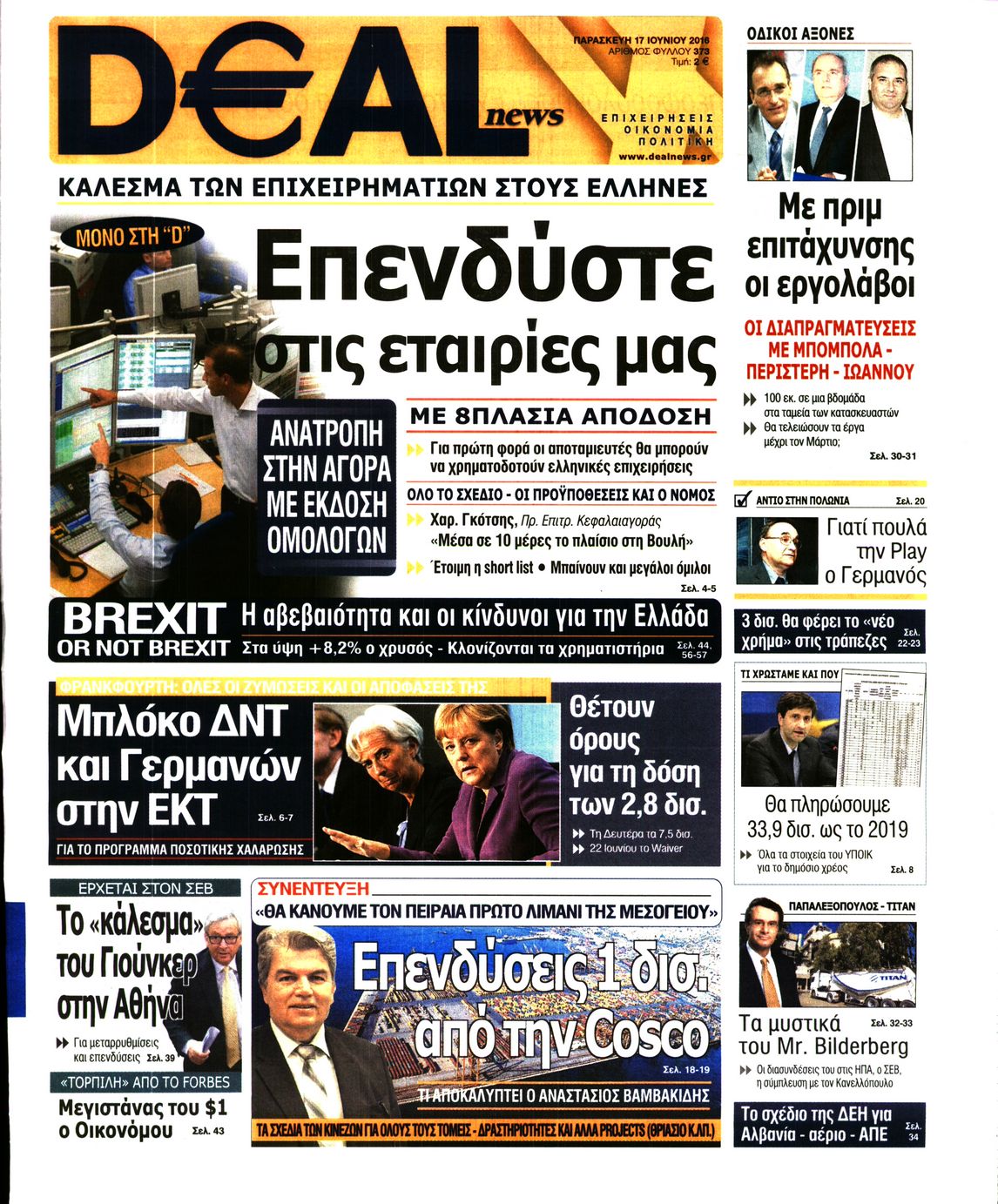 Oι οικονομικές εφημερίδες 17/6/2016 Enikos Newsroom 06:26, Παρασκευή 17 Ιουνίου 2016 Media Διαβάστε τα σημερινά πρωτοσέλιδα των οικονομικών εφημερίδων: ΟΙΚΟΝΟΜΙΚΕΣ ΕΦΗΜΕΡΙΔΕΣ ΠΡΩΤΟΣΕΛΙΔΑ Μοιράσου το: σχολίασε κι εσύ (0 σχόλια) Ακολουθήστε το enikos.gr στο Google News και μάθετε πρώτοι όλες τις ειδήσεις Δείτε όλες τις τελευταίες ειδήσεις από την Ελλάδα και τον Κόσμο στο enikos.gr Ειδήσεις Ροή Ειδήσεων 2 ώρες πριν Αυξάνουν την πίεση προς την κυβέρνηση οι αγρότες: Κλείνουν παρακαμπτήριους και ανοίγουν διόδια – Τι θα γίνει τις γιορτές 1 ώρα πριν ΟΠΕΚΕΠΕ: Προφυλακιστέος ο φερόμενος αρχηγός και ο λογιστής της εγκληματικής οργάνωσης 2 ώρες πριν Φοινικούντα: Το Σάββατο απολογείται ο 30χρονος γιος γνωστού επιχειρηματία της Πλάκας που παραδόθηκε – Όσα είπε στους αστυνομικούς και ο ρόλος του στο έγκλημα 2 ώρες πριν Μπορεί ο Μαδούρο να αντέξει τον αποκλεισμό του Τραμπ; Τι θα χρειαστεί η Ουάσινγκτον για να τον ανατρέψει 3 ώρες πριν Πρίγκιπας Ουίλιαμ – Κέιτ: Η νέα οικογενειακή φωτογραφία για τις Χριστουγεννιάτικες κάρτες του 2025 3 ώρες πριν Ύπνος: Η απλή βραδινή ρουτίνα για να προστατεύσετε τα μαλλιά σας από το κρύο κατά τη διάρκεια του χειμώνα 4 ώρες πριν Manifesting: Πώς να συναντήσετε τον σύντροφο της ζωής σας, ανάλογα με τον μήνα γέννησής σας 2 ημέρες πριν 20 χρόνια τα Χριστούγεννα ξεκινούν στα Public με μεγάλη ποικιλία σε δώρα! 2 ώρες πριν Αρχαιολόγοι ανακάλυψαν ρωμαϊκά τεχνουργήματα από μια πόλη που δεν υπήρξε ποτέ – Τα τρία εντυπωσιακά κτίρια και ο αμφορέας με τις… σαρδέλες 8 λεπτά πριν Conference League: Απευθείας στους «16» η ΑΕΚ Λάρνακας και η Ρακόβ των Σβάρνα και Κωνσταντόπουλου – Τα αποτελέσματα και η βαθμολογία, 3η η ΑΕΚ 18 λεπτά πριν Σε ομάδες που συνδέονται με το ρωσικό κράτος αποδίδει η Δανία δύο κυβερνοεπιθέσεις που δέχθηκε 33 λεπτά πριν Βαθμολογία UEFA: Η Πολωνία προσπέρασε την Ελλάδα 49 λεπτά πριν Conference League: Οι ομάδες που προκρίθηκαν στους «16» και τα «ζευγαρώματα» στα νοκ άουτ 58 λεπτά πριν ΑΕΚ – Κραϊόβα 3-2: Επική ανατροπή και πρόκριση στους «16» του Conference League η Ένωση ENIKOS NETWORK Σε περίοδο αυξημένης δραστηριότητας η γρίπη στην Ελλάδα-Μέτρα προστασίας από τον ΕΟΔΥ Σκέφτεστε συνέχεια συζητήσεις που έχετε κάνει; Τι σημαίνει αυτό, σύμφωνα με ειδικό Στεγαστικό: Τι λέει η ΠΟΜΙΔΑ για τα νέα μέτρα που ανακοίνωσε ο Κυριάκος Μητσοτάκης Λαγκάρντ: Αισιόδοξη για την ανάπτυξη της Ευρωζώνης, αβέβαιη για τον πληθωρισμό Χαρτογραφώντας το «σημείο χωρίς επιστροφή»: Για πρώτη φορά αποκαλύπτεται με λεπτομέρεια το ακανθώδες όριο της ατμόσφαιρας τ... Η Google καταργεί τη λειτουργία «dark web report» – Πώς θα μπορούν οι χρήστες να διαγράφουν τα δεδομένα τους περισσότερα 17:45 , Πέμπτη 18 Δεκεμβρίου 2025 ROUK ZOUK: Εορταστικό επεισόδιο με καλεσμένους τους πρωταγωνιστές του «Γιατί ρε πατέρα» Το Σάββατο 20 Δεκεμβρίου στις 21:00, η Ζέτα Μακρυπούλια υποδέχεται εκλεκτούς ηθοποιούς που όλο... 17:20 , Πέμπτη 18 Δεκεμβρίου 2025 Άγιος έρωτας: Η Χριστίνα εξομολογείται στον πατέρα Νικόλαο, απόψε στις 21:00 στον Alpha Η Νότα αποφασίζει να εκδικηθεί τον Πέτρο και τον Στέφανο, για χάρη του Λούη, όμως τα πράγματα ... 16:50 , Πέμπτη 18 Δεκεμβρίου 2025 Να μ’ αγαπάς: Ζωή και Φωτεινή συμφιλιώνονται ως μάνα με κόρη, απόψε στις 20:00 Η ταυτότητα του Άγγελου αποκαλύπτεται στο νέο επεισόδιο της σειράς “Να μ’ αγαπάς... 15:52 , Πέμπτη 18 Δεκεμβρίου 2025 Το Σπίτι Δίπλα Στο Ποτάμι: Το καθηλωτικό τελευταίο επεισόδιο για το 2025 απόψε στις 22:30 Καθηλώνει το σημερινό επεισόδιο της σειράς “Το Σπίτι Δί