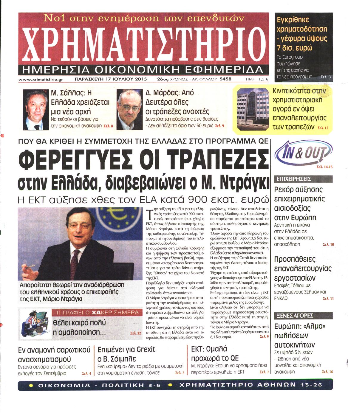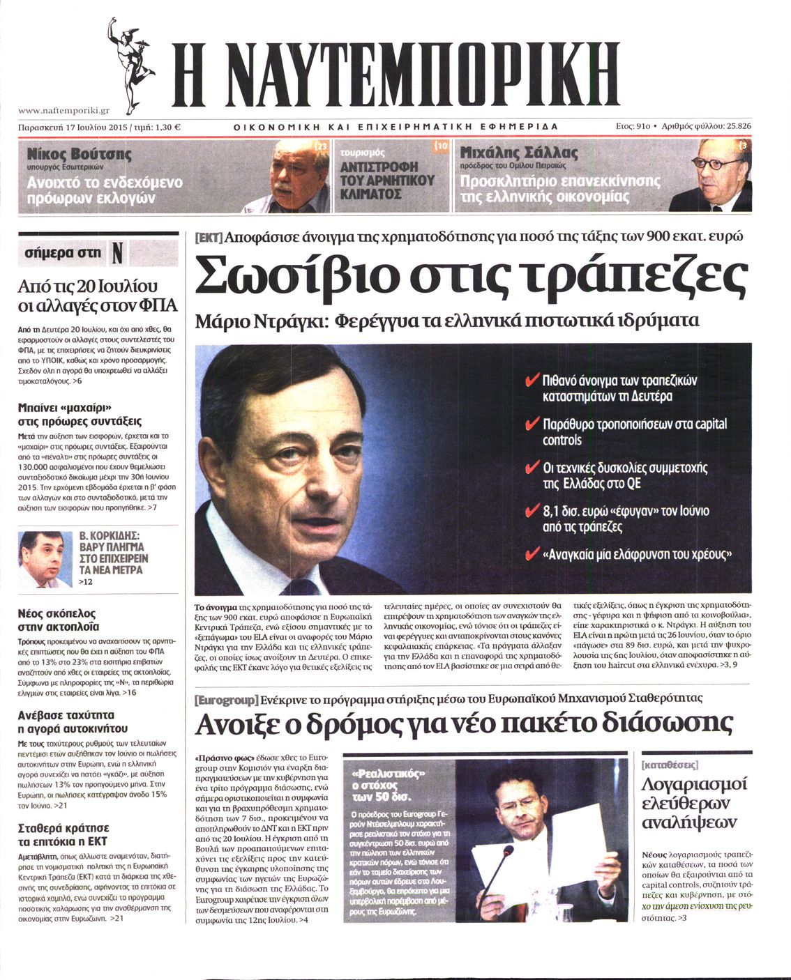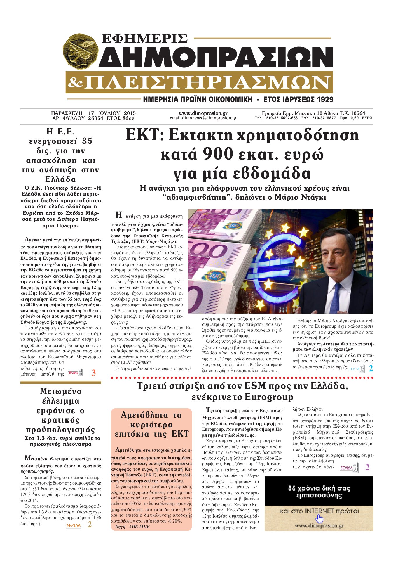 Oι οικονομικές εφημερίδες 17/7/2015 Enikos Newsroom 06:19, Παρασκευή 17 Ιουλίου 2015 Media Διαβάστε τα σημερινά πρωτοσέλιδα των οικονομικών εφημερίδων: ΟΙΚΟΝΟΜΙΚΕΣ ΕΦΗΜΕΡΙΔΕΣ ΠΡΩΤΟΣΕΛΙΔΑ Μοιράσου το: σχολίασε κι εσύ (0 σχόλια) Ακολουθήστε το enikos.gr στο Google News και μάθετε πρώτοι όλες τις ειδήσεις Δείτε όλες τις τελευταίες ειδήσεις από την Ελλάδα και τον Κόσμο στο enikos.gr Ειδήσεις Ροή Ειδήσεων 20 λεπτά πριν Έρευνα MRB: Η πρόθεση ψήφου και τα σημαντικότερα προβλήματα – Οι «λέξεις» που εκφράζουν τους πολίτες 13 λεπτά πριν Αλαλούμ με τις πληρωμές στους αγρότες: Δεν καταβλήθηκε η Βασική Ενίσχυση, αλλά έγινε παρακράτηση της εισφοράς στον ΕΛΓΑ – Τι απαντά η κυβέρνηση 59 λεπτά πριν Αγρότες: Πολύωροι αποκλεισμοί και σήμερα στα τελωνεία Ευζώνων, Νίκης, Προμαχώνα και Εξοχής 2 ώρες πριν Ρομπ Ράινερ: Το δείπνο με τους Ομπάμα που δεν έγινε ποτέ και νέα στοιχεία για τον «καβγά» στο πάρτι – Βίντεο με τον γιο του να περιφέρεται κοντά στο σπίτι της τραγωδίας 1 ώρα πριν Κυψέλη: Μαθητές κλείδωσαν τους καθηγητές μέσα στο Γυμνάσιο μετά την επίθεση με μαχαίρι 5 λεπτά πριν Τα 4 ζώδια που ξαναβρίσκουν τον εαυτό τους – «Μπαίνετε επιτέλους στην ουσία των πραγμάτων» 4 ώρες πριν Οπτική ψευδαίσθηση: Μόνο αν είσαι ο Σέρλοκ Χολμς θα βρεις τον σκύλο σε 15 δευτερόλεπτα 2 ώρες πριν Νεολιθικός σκύλος βρέθηκε προσεκτικά θαμμένος στον βυθό λίμνης – Δίπλα του βρέθηκε ένα στιλέτο 2 ώρες πριν Έλαβε τελεσίγραφο από τη σύντροφό του – «Μου είπε πως ή θα της κάνω πρόταση στα δύο χρόνια σχέσης ή θα με χωρίσει» 5 λεπτά πριν Τα 4 ζώδια που ξαναβρίσκουν τον εαυτό τους – «Μπαίνετε επιτέλους στην ουσία των πραγμάτων» 6 λεπτά πριν «Οδύσσεια»: Νέες εντυπωσιακές φωτογραφίες από το κινηματογραφικό έπος του Κρίστοφερ Νόλαν 11 λεπτά πριν Κλιμάκωση από την Παρασκευή προαναγγέλλουν οι αγρότες – «Ψίχουλα οι εξαγγελίες Χατζηδάκη» λέει ο Σωκράτης Αλειφτήρας 13 λεπτά πριν Αλαλούμ με τις πληρωμές στους αγρότες: Δεν καταβλήθηκε η Βασική Ενίσχυση, αλλά έγινε παρακράτηση της εισφοράς στον ΕΛΓΑ – Τι απαντά η κυβέρνηση 17 λεπτά πριν Σίδνεϊ: 59 κατηγορίες σε βάρος του δράστη του μακελειού στην παραλία Μπόνταϊ – Φιλιππίνες: «Δεν υπάρχουν στρατόπεδα τζιχαντιστών στη χώρα» ENIKOS NETWORK Αδενώματα Υπόφυσης: Μια πάθηση καλοήθης, αλλά όχι αθώα Χρόνια Αναπνευστικά Νοσήματα: 400.000 θάνατοι ετησίως στην Ευρώπη Ειδικό επιδοτούμενο πρόγραμμα κατάρτισης της ΔΥΠΑ για ανέργους: Αρχίζει σήμερα η υποβολή ενστάσεων-Ποιους αφορά Δώρο Χριστουγέννων και επιδόματα της ΔΥΠΑ: Σήμερα αρχίζει η προπληρωμή τους-Ποιους αφορά Σύγχρονος Νοστράδαμος: Προειδοποιεί για «μεγάλο γεγονός» τους επόμενους μήνες που θα συγκλονίσει τη Βρετανία και τον κόσμο Τεστ παρατηρητικότητας: Μπορείτε να βρείτε τις 3 διαφορές στις εικόνες με έναν πιγκουίνο σε 14 δευτερόλεπτα περισσότερα 09:08 , Τετάρτη 17 Δεκεμβρίου 2025 Τηλεθέαση (16/12): Ανακατατάξεις στην πρωινή ψυχαγωγική ζώνη Ξεκάθαρη πρωτιά στην τηλεθέαση για την «Super Κατερίνα» στο δυναμικό κοινό με ποσοστό 18,5%, α... 08:00 , Τετάρτη 17 Δεκεμβρίου 2025 Την Κυριακή με τη Realnews: Δωροεπιταγή 10€ Δωροεπιταγή αξίας 10€ για αγορές άνω των 60€ από τα πολυκαταστήματα FactoryOutlet H προσφορά ι... 07:00 , Τετάρτη 17 Δεκεμβρίου 2025 Την Κυριακή με τη Realnews: Ό,τι και αν αγοράσεις, σκανάρεις και κερδίζεις! Την Κυριακή με τη Realnews: Ό,τι και αν αγοράσεις, σκανάρεις και κερδίζεις! Με το PADU app, το... 05:48 , Τετάρτη 17 Δεκεμβρίου 2025 Οι οικονομικές εφημερίδες 17/12/2025 Διαβάστε τα πρωτοσέλιδα από