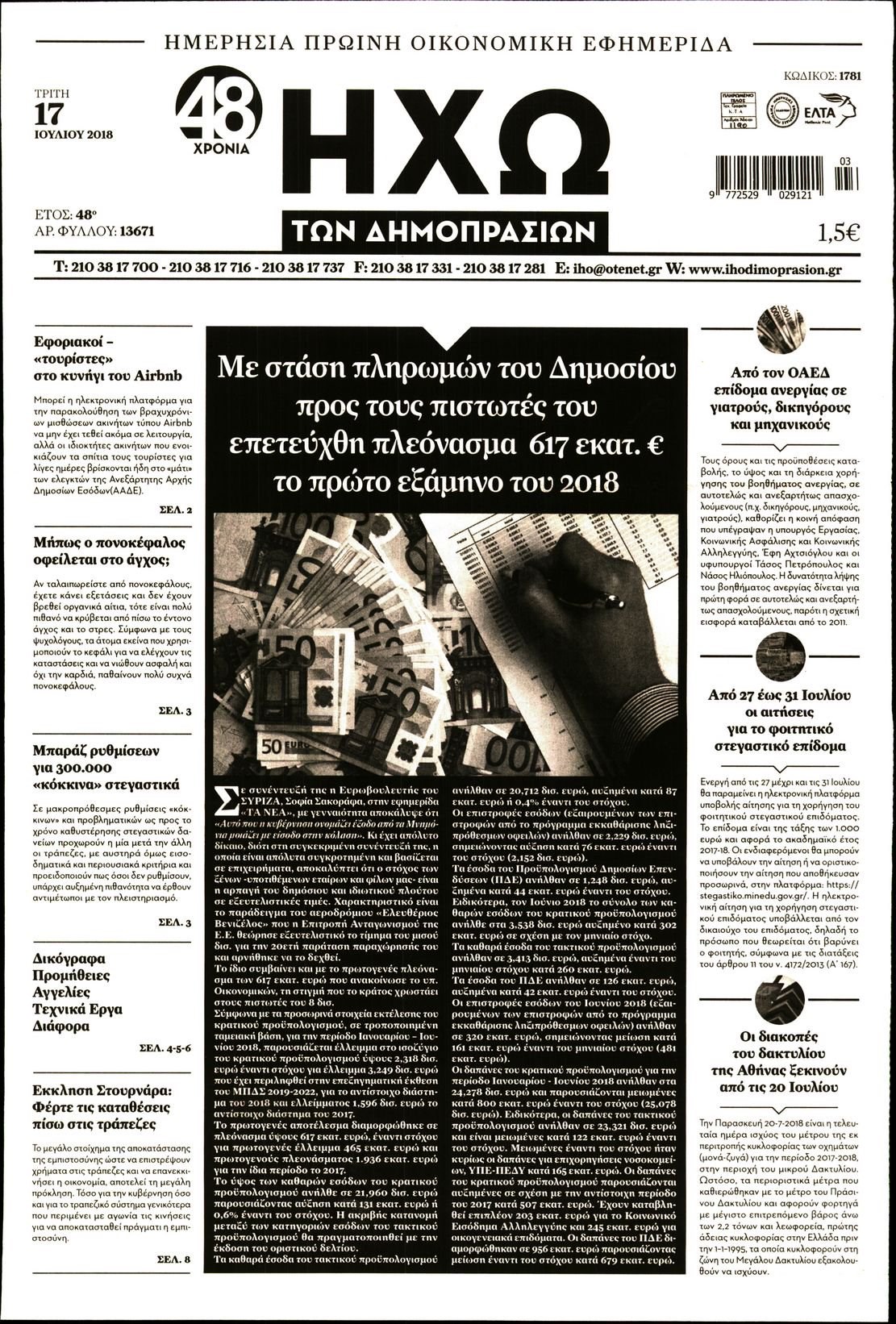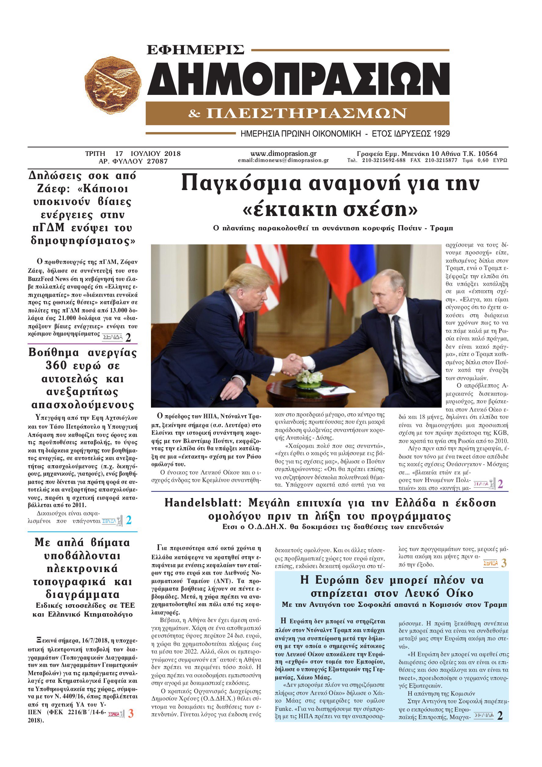 Οι οικονομικές εφημερίδες 17/7/2018 Enikos Newsroom 06:48, Τρίτη 17 Ιουλίου 2018 Media Διαβάστε τα σημερινά πρωτοσέλιδα των οικονομικών εφημερίδων. ΟΙΚΟΝΟΜΙΚΕΣ ΕΦΗΜΕΡΙΔΕΣ ΠΡΩΤΟΣΕΛΙΔΑ Μοιράσου το: σχολίασε κι εσύ (0 σχόλια) Ακολουθήστε το enikos.gr στο Google News και μάθετε πρώτοι όλες τις ειδήσεις Δείτε όλες τις τελευταίες ειδήσεις από την Ελλάδα και τον Κόσμο στο enikos.gr Ειδήσεις Ροή Ειδήσεων 3 ώρες πριν Αυξάνουν την πίεση προς την κυβέρνηση οι αγρότες: Κλείνουν παρακαμπτήριους και ανοίγουν διόδια – Τι θα γίνει τις γιορτές 2 ώρες πριν ΟΠΕΚΕΠΕ: Προφυλακιστέος ο φερόμενος αρχηγός και ο λογιστής της εγκληματικής οργάνωσης 3 ώρες πριν Φοινικούντα: Το Σάββατο απολογείται ο 30χρονος γιος γνωστού επιχειρηματία της Πλάκας που παραδόθηκε – Όσα είπε στους αστυνομικούς και ο ρόλος του στο έγκλημα 3 ώρες πριν Μπορεί ο Μαδούρο να αντέξει τον αποκλεισμό του Τραμπ; Τι θα χρειαστεί η Ουάσινγκτον για να τον ανατρέψει 4 ώρες πριν Πρίγκιπας Ουίλιαμ – Κέιτ: Η νέα οικογενειακή φωτογραφία για τις Χριστουγεννιάτικες κάρτες του 2025 4 ώρες πριν Ύπνος: Η απλή βραδινή ρουτίνα για να προστατεύσετε τα μαλλιά σας από το κρύο κατά τη διάρκεια του χειμώνα 5 ώρες πριν Manifesting: Πώς να συναντήσετε τον σύντροφο της ζωής σας, ανάλογα με τον μήνα γέννησής σας 2 ημέρες πριν 20 χρόνια τα Χριστούγεννα ξεκινούν στα Public με μεγάλη ποικιλία σε δώρα! 3 ώρες πριν Αρχαιολόγοι ανακάλυψαν ρωμαϊκά τεχνουργήματα από μια πόλη που δεν υπήρξε ποτέ – Τα τρία εντυπωσιακά κτίρια και ο αμφορέας με τις… σαρδέλες 6 λεπτά πριν Μιχάλης Χρυσοχοΐδης από την Κωνσταντινούπολη: Κοινές επιχειρήσεις Ελλάδας – Τουρκίας ενάντια στο οργανωμένο έγκλημα 28 λεπτά πριν Μάρκο Νίκολιτς: «Είμαι περήφανος για τους παίκτες μου, όποιος αντίπαλος και να έρθει θα προετοιμαστούμε» 37 λεπτά πριν ΟΗΕ: Την εκλογή του νέου ύπατου αρμοστή για τους Πρόσφυγες Μπαρχάμ Άχμεντ Σαλίχ χαιρέτησε ο Αντόνιο Γκουτέρες 42 λεπτά πριν Σύνοδος Κορυφής στις Βρυξέλλες: Ακόμη πιο κοντά σε διέξοδο για τη χρηματοδότηση της Ουκρανίας 50 λεπτά πριν ΟΗΕ: Iστορική επίσκεψη του Συμβουλίου Ασφαλείας στη Δαμασκό – Mήνυμα Ελλάδας για συμπερίληψη και λογοδοσία ENIKOS NETWORK Σε περίοδο αυξημένης δραστηριότητας η γρίπη στην Ελλάδα-Μέτρα προστασίας από τον ΕΟΔΥ Σκέφτεστε συνέχεια συζητήσεις που έχετε κάνει; Τι σημαίνει αυτό, σύμφωνα με ειδικό Στεγαστικό: Τι λέει η ΠΟΜΙΔΑ για τα νέα μέτρα που ανακοίνωσε ο Κυριάκος Μητσοτάκης Λαγκάρντ: Αισιόδοξη για την ανάπτυξη της Ευρωζώνης, αβέβαιη για τον πληθωρισμό Χαρτογραφώντας το «σημείο χωρίς επιστροφή»: Για πρώτη φορά αποκαλύπτεται με λεπτομέρεια το ακανθώδες όριο της ατμόσφαιρας τ... Η Google καταργεί τη λειτουργία «dark web report» – Πώς θα μπορούν οι χρήστες να διαγράφουν τα δεδομένα τους περισσότερα 17:45 , Πέμπτη 18 Δεκεμβρίου 2025 ROUK ZOUK: Εορταστικό επεισόδιο με καλεσμένους τους πρωταγωνιστές του «Γιατί ρε πατέρα» Το Σάββατο 20 Δεκεμβρίου στις 21:00, η Ζέτα Μακρυπούλια υποδέχεται εκλεκτούς ηθοποιούς που όλο... 17:20 , Πέμπτη 18 Δεκεμβρίου 2025 Άγιος έρωτας: Η Χριστίνα εξομολογείται στον πατέρα Νικόλαο, απόψε στις 21:00 στον Alpha Η Νότα αποφασίζει να εκδικηθεί τον Πέτρο και τον Στέφανο, για χάρη του Λούη, όμως τα πράγματα ... 16:50 , Πέμπτη 18 Δεκεμβρίου 2025 Να μ’ αγαπάς: Ζωή και Φωτεινή συμφιλιώνονται ως μάνα με κόρη, απόψε στις 20:00 Η ταυτότητα του Άγγελου αποκαλύπτεται στο νέο επεισόδιο της σειράς “Να μ’ αγαπάς... 15:52 , Πέμπτη 18 Δεκεμβρίου 2025 Το Σπίτι Δίπλα Στο Ποτάμι: Το καθηλωτικ