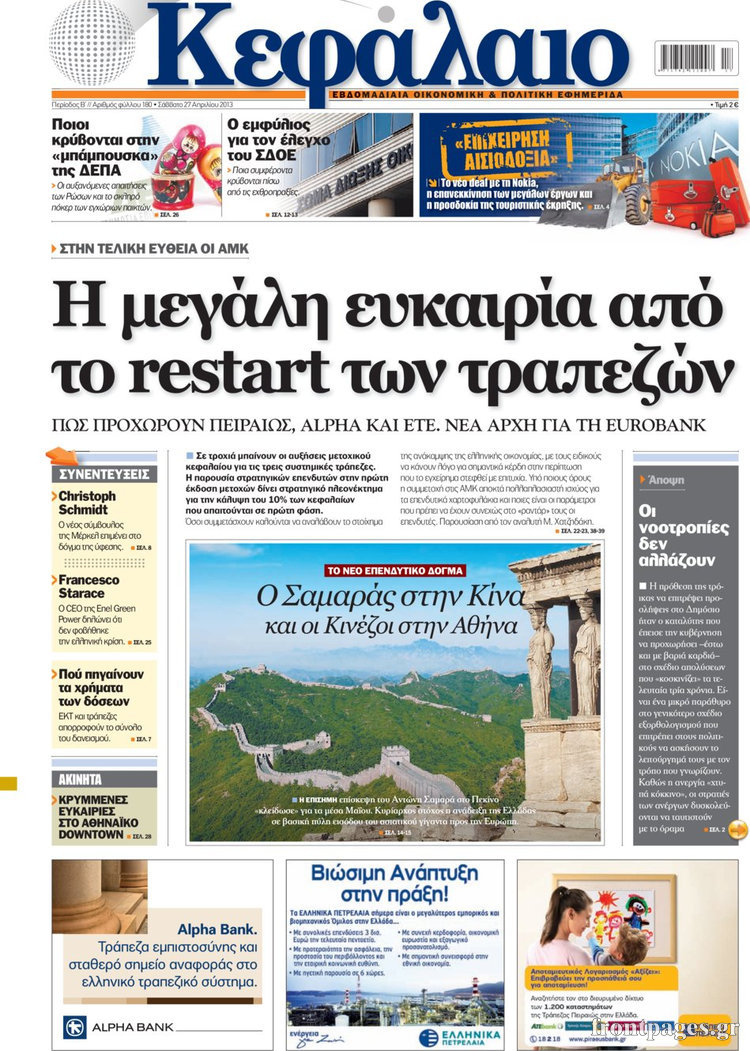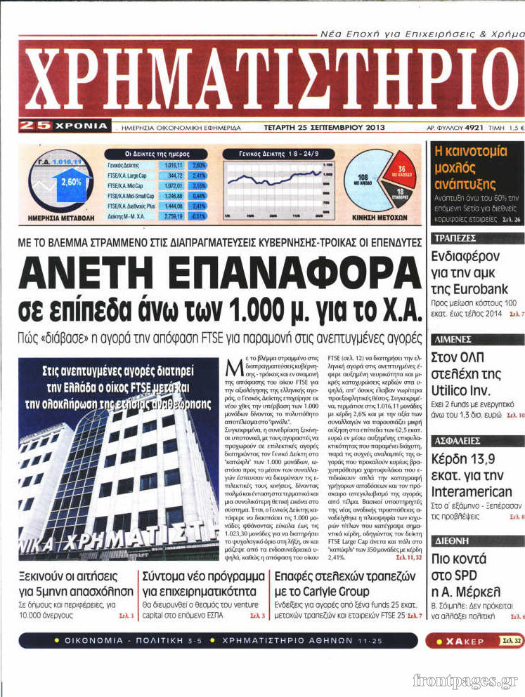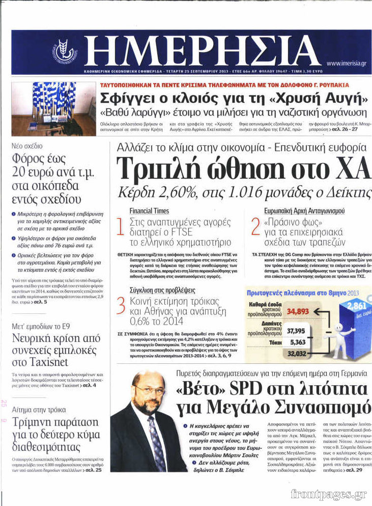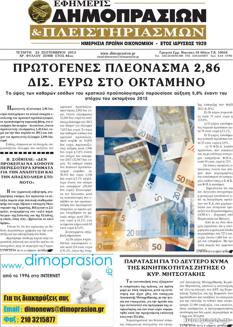 Οι oικονομικές εφημερίδες Enikos Newsroom 09:44, Τετάρτη 25 Σεπτεμβρίου 2013 Media Οι oικονομικές εφημερίδες Διαβάστε τα πρωτοσέλιδα των οικονομικών εφημερίδων: ΕΦΗΜΕΡΙΔΕΣ ΟΙΚΟΝΟΜΙΚΕΣ ΕΦΗΜΕΡΙΔΕΣ ΠΡΩΤΟΣΕΛΙΔΑ Μοιράσου το: σχολίασε κι εσύ (0 σχόλια) Ακολουθήστε το enikos.gr στο Google News και μάθετε πρώτοι όλες τις ειδήσεις Δείτε όλες τις τελευταίες ειδήσεις από την Ελλάδα και τον Κόσμο στο enikos.gr Ειδήσεις Ροή Ειδήσεων 30 λεπτά πριν «Έλληνας Εσκομπάρ»: Φωτογραφίες με τους 4 τόνους κοκαΐνης που κατασχέθηκαν από το σκάφος «Ουρανία» 4 ώρες πριν Η Ουκρανία χτύπησε τάνκερ του σκιώδους στόλου της Ρωσίας στη Μεσόγειο – Έπλεε νότια της Κρήτης 2 ώρες πριν Πούτιν: Σαρκαστικά μηνύματα, παράπονα και απρόοπτα στη συνέντευξη Τύπου – Η πρόταση γάμου on air και οι ερωτήσεις για τα αγγούρια και τους… εξωγήινους 2 ώρες πριν Η απάντηση της κυβέρνησης στα αιτήματα των αγροτών: 16+4 υλοποιούνται ή βρίσκονται υπό επεξεργασία για να βρεθεί λύση – 7 δεν μπορούν να επιλυθούν 3 ώρες πριν Εξώδικο επιχειρηματία στον Γιώργο Μαζωνάκη – Τι απαντά στις καταγγελίες του τραγουδιστή 2 ώρες πριν Τα 5 ζώδια που ευνοούνται στην ερωτική ζωή τους την επόμενη εβδομάδα – «Η ενέργεια του Αιγόκερου φέρνει αγάπη και σταθερότητα» 7 ώρες πριν Γεμάτος νεροχύτης; 5 σοβαρές ευθύνες που «φοβίζουν» όσους αφήνουν άπλυτα πιάτα 6 ώρες πριν Ειδικός μοιράζεται 6 κόλπα για να διατηρείστε σε φόρμα με πάνω από 40 ώρες εργασίας την εβδομάδα: «Προπονηθείτε πριν από τη δουλειά, όχι μετά» 2 ημέρες πριν 20 χρόνια τα Χριστούγεννα ξεκινούν στα Public με μεγάλη ποικιλία σε δώρα! 6 λεπτά πριν ΥΠΑΑΤ: Αναστολή μέτρων αναγκαστικής εκτέλεσης για κτηνοτρόφους που πλήττονται από την ευλογιά των αιγοπροβάτων 10 λεπτά πριν Γαλλία: Ξαφνική «επίσκεψη» των αγροτών στο σπίτι του Μακρόν – Πέταξαν κοπριά, λάχανα, λάστιχα και άφησαν ένα φέρετρο – ΒΙΝΤΕΟ 16 λεπτά πριν Από το Ορμένιο ως τα Μάλγαρα κι από τη Σιάτιστα μέχρι τη Νίκαια: Μπλόκα σε όλη την Ελλάδα – Το Σάββατο ανοίγουν τα διόδια οι αγρότες 17 λεπτά πριν Ταϊβάν: 3 νεκροί έπειτα από επίθεση άνδρα με μαχαίρι – Ο δράστης σκοτώθηκε σε αστυνομική καταδίωξη – ΒΙΝΤΕΟ 21 λεπτά πριν Άρης Μουγκοπέτρος για τα προσθετικά μέλη: «Οι κόρες μου ήρθαν, μου χαϊδέψαν το χέρι και μου είπαν “μπαμπά το μιμί πέρασε”» ENIKOS NETWORK ΕΛΣΤΑΤ: Αύξηση κατά 1,7% των επαγγελματιών υγείας το 2024 Τάξη στις ιατρικές διαφημίσεις για την προστασία των πολιτών βάζει ο ΙΣΑ Μετρό: Ενισχύονται τα δρομολόγια – Δείτε ποιες ημέρες Παπαθανάσης για νέο Εθνικό Πρόγραμμα Ανάπτυξης 2026-2030: Είναι υπερδιπλάσιο από αυτό της προηγούμενης προγραμματικής περιό... Χαρτογραφώντας το «σημείο χωρίς επιστροφή»: Για πρώτη φορά αποκαλύπτεται με λεπτομέρεια το ακανθώδες όριο της ατμόσφαιρας τ... Η Google καταργεί τη λειτουργία «dark web report» – Πώς θα μπορούν οι χρήστες να διαγράφουν τα δεδομένα τους περισσότερα 15:15 , Παρασκευή 19 Δεκεμβρίου 2025 Την Κυριακή με τη Realnews: Ό,τι και αν αγοράσεις, σκανάρεις και κερδίζεις! Την Κυριακή με τη Realnews: Ό,τι και αν αγοράσεις, σκανάρεις και κερδίζεις! Με το PADU app, το... 08:00 , Παρασκευή 19 Δεκεμβρίου 2025 Την Κυριακή με τη Realnews: Δωροεπιταγή 10€ Δωροεπιταγή αξίας 10€ για αγορές άνω των 60€ από τα πολυκαταστήματα FactoryOutlet H προσφορά ι... 05:48 , Παρασκευή 19 Δεκεμβρίου 2025 Οι οικονομικές εφημερίδες 19/12/2025 Διαβάστε τα πρωτοσέλιδα από τις οικονομικές εφημερίδες, σήμερα 19/12/2025. 05:43 , Παρασκευή 19 Δεκεμβρίου 2025 Οι αθλητικές εφημερίδες 19/12/2025 Διαβάστε τα πρωτοσέλιδα από τι