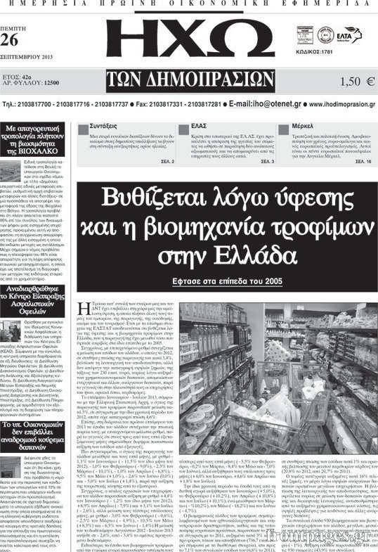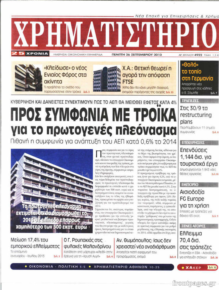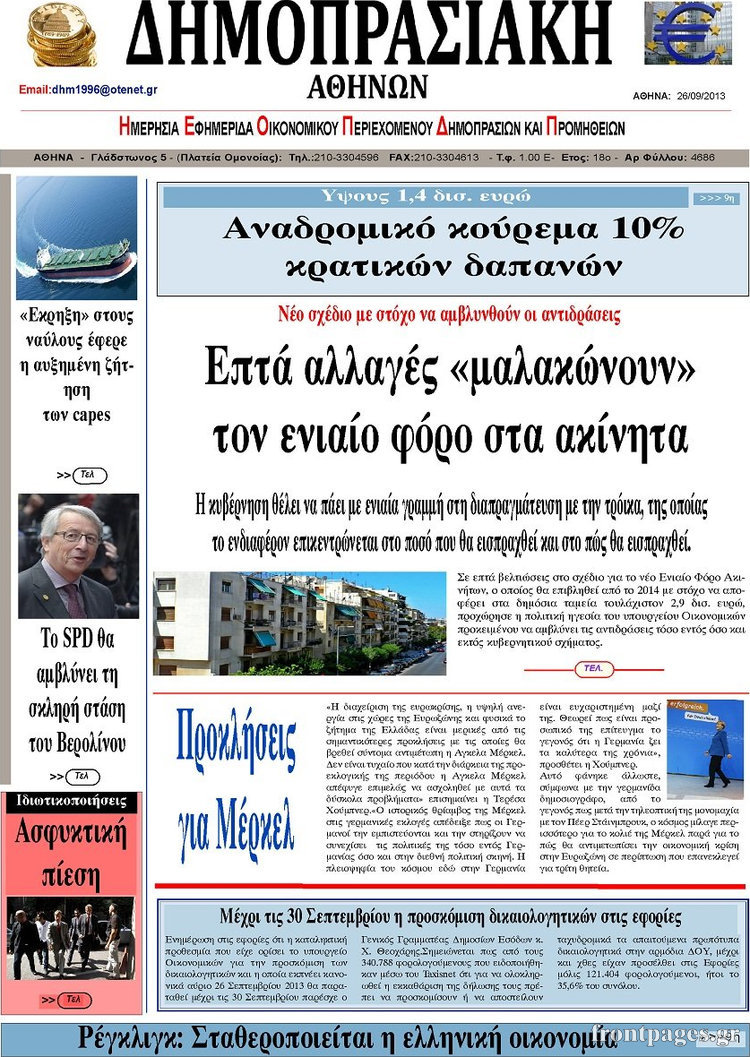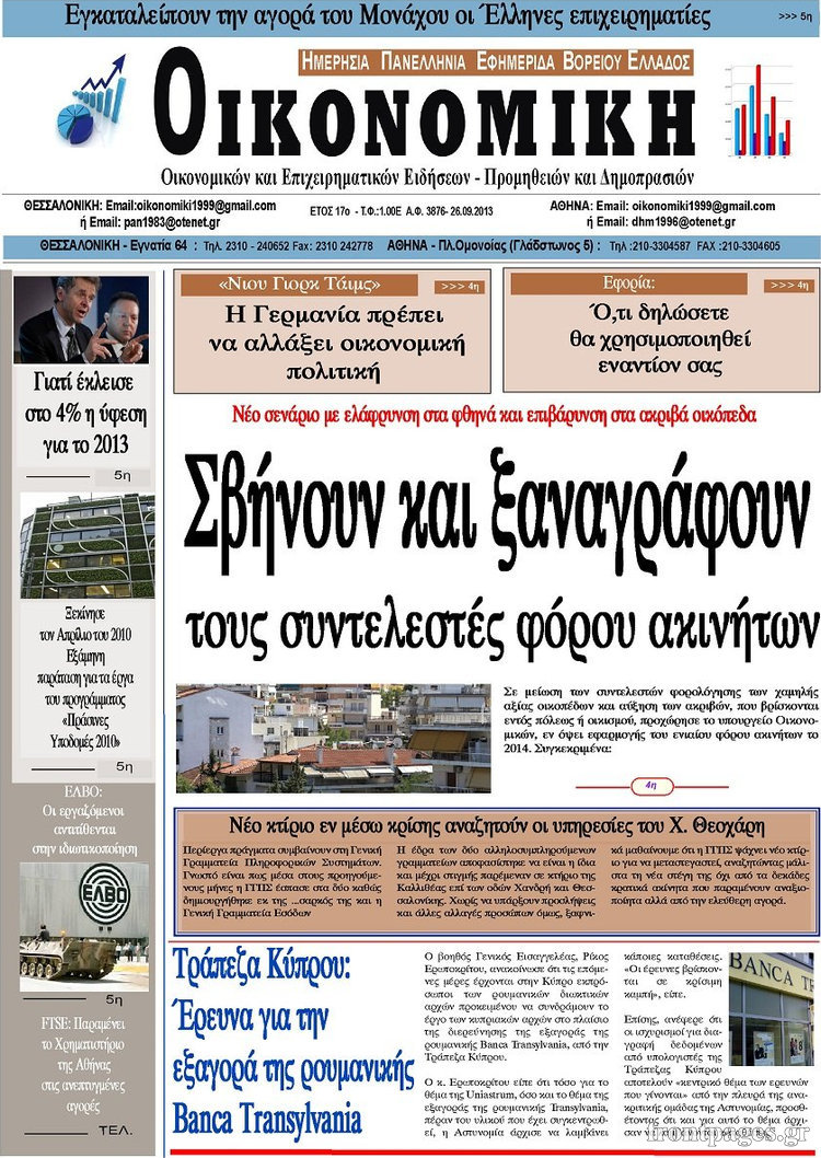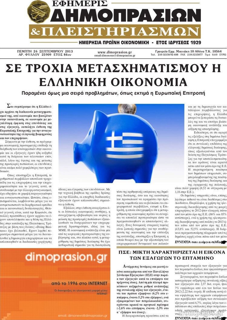 Οι oικονομικές εφημερίδες Enikos Newsroom 08:58, Πέμπτη 26 Σεπτεμβρίου 2013 Media Οι oικονομικές εφημερίδες Διαβάστε τα πρωτοσέλιδα των οικονομικών εφημερίδων: ΕΦΗΜΕΡΙΔΕΣ ΟΙΚΟΝΟΜΙΚΕΣ ΕΦΗΜΕΡΙΔΕΣ ΠΡΩΤΟΣΕΛΙΔΑ Μοιράσου το: σχολίασε κι εσύ (0 σχόλια) Ακολουθήστε το enikos.gr στο Google News και μάθετε πρώτοι όλες τις ειδήσεις Δείτε όλες τις τελευταίες ειδήσεις από την Ελλάδα και τον Κόσμο στο enikos.gr Ειδήσεις Ροή Ειδήσεων 1 ώρα πριν Υπόθεση Έπσταϊν: Το Υπουργείο Δικαιοσύνης δημοσιοποίησε μια σειρά από εξαιρετικά επεξεργασμένα αρχεία – «Λείπουν τα πιο σημαντικά έγγραφα», λένε οι Δημοκρατικοί 3 ώρες πριν Σαρωτικοί οι έλεγχοι στους δρόμους ενόψει εορτών – Μπλόκα της τροχαίας σε κεντρικές αρτηρίες της Αττικής 1 ώρα πριν ΟΝΕΧ – MEGATUGS: Ξεκίνησε η ναυπήγηση ρυμουλκών στην Ελλάδα – Προθάλαμος πολεμικών πλοίων – Δείτε φωτογραφίες και βίντεο 1 ώρα πριν Καιρός: Αλλαγή σκηνικού σήμερα με βροχές και πτώση της θερμοκρασίας – Οι προβλέψεις των μετεωρολόγων για τα Χριστούγεννα 10 ώρες πριν Χριστούγεννα στα μπλόκα: Επιμένουν στις κινητοποιήσεις τους οι αγρότες – Ανοίγουν τα διόδια το Σαββατοκύριακο 3 ώρες πριν Αυγά: Πόσα μπορείτε να τρώτε την ημέρα με ασφάλεια για μέγιστη πρόσληψη πρωτεΐνης 3 ώρες πριν Τα ζώδια σήμερα, Σάββατο 20 Δεκεμβρίου: Παρθένοι, το σύμπαν σας δίνει το κλειδί 3 ώρες πριν Οπτική ψευδαίσθηση: Μόνο αν είσαι ο Σέρλοκ Χολμς θα βρεις τον αριθμό «87» σε 7 δευτερόλεπτα 45 λεπτά πριν Αρχαιολόγοι ανακάλυψαν σε χωράφι απεικόνιση 600 ετών ενός Αγίου – Τα στοιχεία που δείχνουν ότι μαρτύρησε 7 λεπτά πριν Αμαλία Κωστοπούλου: Το μήνυμα για το χειρουργείο στο γόνατο – «Αυτός ο τραυματισμός μού στέρησε πολλά…» 14 λεπτά πριν Ο «χάρτης» με τις αυξήσεις και τις φοροελαφρύνσεις του 2026 – Ποιοι και πόσα κερδίζουν 21 λεπτά πριν Η τέλεια συνταγή για cookies με κομμάτια σοκολάτας 30 λεπτά πριν MyHealth App: Τα στοιχεία για τον Προσωπικό Βοηθό Υγείας Πολίτη – Τι ερωτήματα έγιναν μέσα σε 7 ημέρες 37 λεπτά πριν Τρομεροί γονείς: Η Μαρία Καβογιάννη εισβάλλει στο σπίτι της οικογένειας Στεφανίδη ENIKOS NETWORK Το τεστ των 10 δευτερολέπτων που μπορεί να προβλέψει το προσδόκιμο ζωής σας – Τι λέει ειδικός του Cleveland Επιλέξτε καρέκλα για να μάθετε ποια είναι τα κρυφά χαρακτηριστικά σας – Τι αποκάλυψε για εσάς αυτό το τεστ προσωπικότητας; Mega χριστουγεννιάτικη φορολοταρία: «Κλείδωσε» η ημερομηνία για την κλήρωση – Ερωτήσεις και απαντήσεις Αναστολή μέτρων αναγκαστικής εκτέλεσης για κτηνοτρόφους που πλήττονται από την ευλογιά των αιγοπροβάτων Χαρτογραφώντας το «σημείο χωρίς επιστροφή»: Για πρώτη φορά αποκαλύπτεται με λεπτομέρεια το ακανθώδες όριο της ατμόσφαιρας τ... Η Google καταργεί τη λειτουργία «dark web report» – Πώς θα μπορούν οι χρήστες να διαγράφουν τα δεδομένα τους περισσότερα 08:14 , Σάββατο 20 Δεκεμβρίου 2025 Τρομεροί γονείς: Η Μαρία Καβογιάννη εισβάλλει στο σπίτι της οικογένειας Στεφανίδη Όσα θα δούμε στο νέο διπλό επεισόδιο της σειράς «Τρομεροί γονείς», σήμερα Σάββατο 20 Δεκεμβρίο... 05:48 , Σάββατο 20 Δεκεμβρίου 2025 Οι οικονομικές εφημερίδες 20/12/2025 Διαβάστε τα πρωτοσέλιδα από τις οικονομικές εφημερίδες, σήμερα 20/12/2025. 05:43 , Σάββατο 20 Δεκεμβρίου 2025 Οι αθλητικές εφημερίδες 20/12/2025 Διαβάστε τα πρωτοσέλιδα από τις αθλητικές εφημερίδες, σήμερα 20/12/2025. 05:38 , Σάββατο 20 Δεκεμβρίου 2025 Οι πολιτικές εφημερίδες 20/12/2025 Διαβάστε τα πρωτοσέλιδα από τις πολιτικές εφημερίδες, σήμερα 20/12/2025. ΤΕΛΕΥΤΑΙΕΣ ΕΙΔΗΣΕΙΣ 7 λεπτά πριν Αμαλία Κωστοπούλου: 