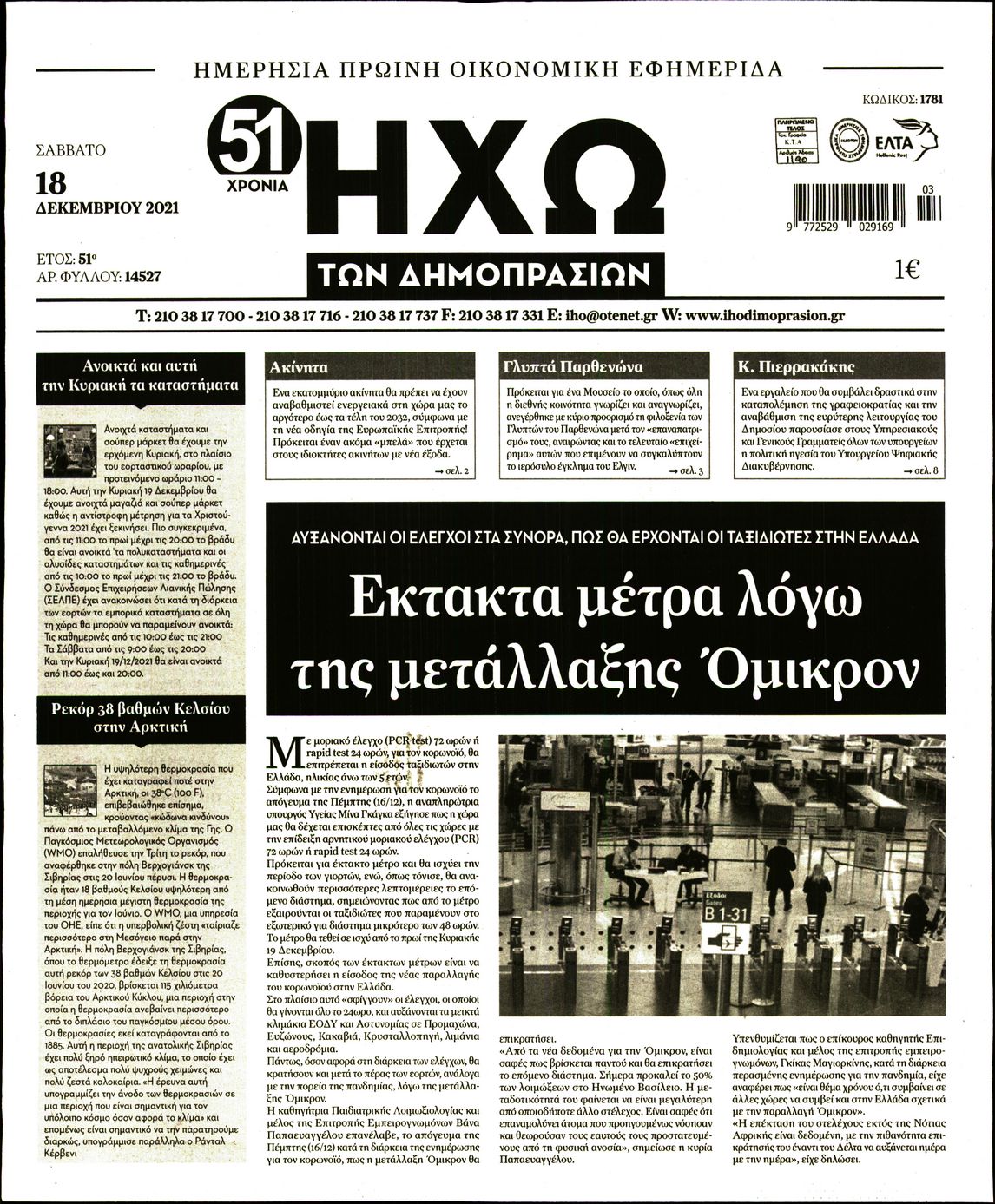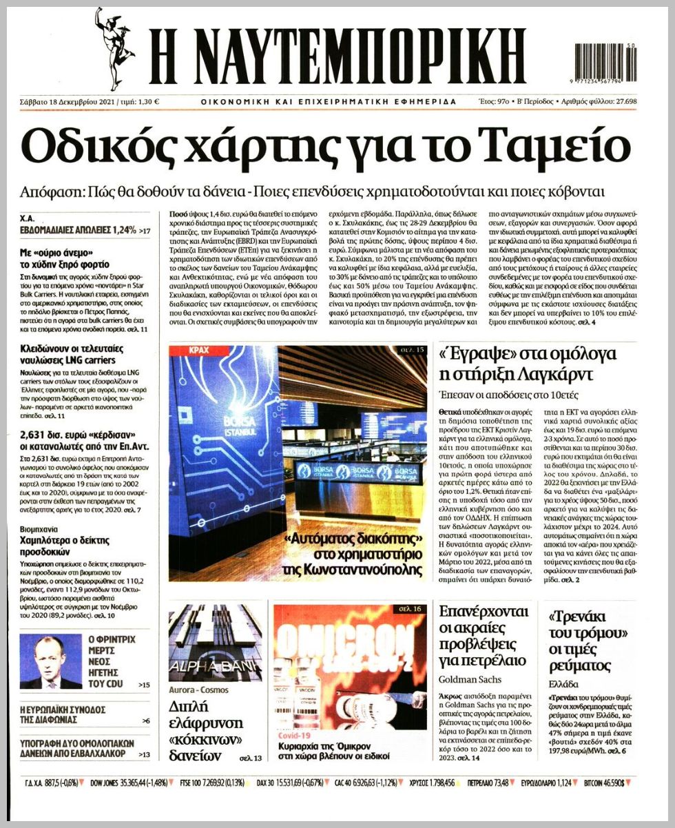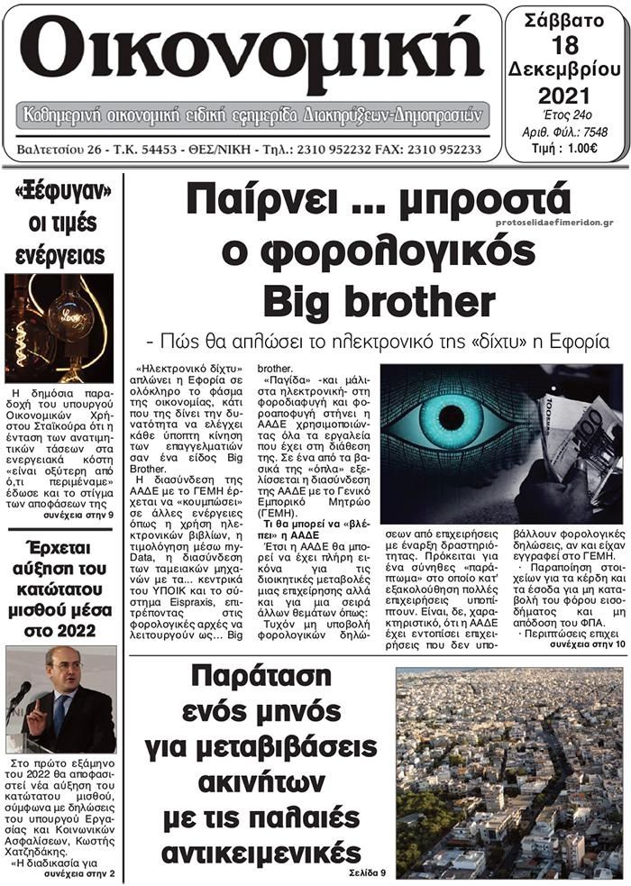Οι οικονομικές εφημερίδες 18/12/2021 Διονύσης Νίκκας 07:20, Σάββατο 18 Δεκεμβρίου 2021 Media Διαβάστε τα πρωτοσέλιδα από τις οικονομικές εφημερίδες… ΟΙΚΟΝΟΜΙΚΕΣ ΕΦΗΜΕΡΙΔΕΣ Μοιράσου το: σχολίασε κι εσύ (0 σχόλια) Ακολουθήστε το enikos.gr στο Google News και μάθετε πρώτοι όλες τις ειδήσεις Δείτε όλες τις τελευταίες ειδήσεις από την Ελλάδα και τον Κόσμο στο enikos.gr Ειδήσεις Ροή Ειδήσεων 37 λεπτά πριν Αγρότες: Έδωσαν στη δημοσιότητα τη λίστα με τα αιτήματά τους – Δείτε αναλυτικά τι ζητούν 28 λεπτά πριν Σίδνεϊ: Οι φωτογραφίες των δύο δραστών της τρομοκρατικής επίθεσης – Έφοδος της αστυνομίας στο σπίτι του ενός 2 ώρες πριν ΟΠΕΚΕΠΕ-Κρήτη: Προθεσμία να απολογηθούν από την Τρίτη έως την Πέμπτη έλαβαν οι 16 συλληφθέντες 58 λεπτά πριν Αργυρούπολη: Στον εισαγγελέα ο 59χρονος που απείλησε με τσεκούρι άλλον οδηγό – Φωτογραφία με το «μίνι» οπλοστάσιο που είχε στην κατοχή του 1 ώρα πριν Guardian: «Μύρισαν χρήμα και έσπευσαν» – Ο ανταγωνισμός αμερικανικών εταιρειών για να πλουτίσουν από την κατεστραμμένη Γάζα 2 ώρες πριν Τα 5 ζώδια που ευνοούνται στα ερωτικά τους έως τις 21 Δεκεμβρίου – «Η επόμενη σχέση σας θα είναι καθοριστική» 3 ώρες πριν Γεωλογική αποκάλυψη: Επιστήμονες εξηγούν πώς η Ιβηρική Χερσόνησος περιστρέφεται σαν… ρολόι 6 ώρες πριν Προπονήτρια ευεξίας που έχασε 24 κιλά αποκαλύπτει: «Αυτά είναι τα 6 ανησυχητικά σημάδια της υψηλής κορτιζόλης» 7 ώρες πριν Τα 8 πράγματα που τα ευτυχισμένα ζευγάρια δεν κάνουν ποτέ μπροστά στα παιδιά τους 4 λεπτά πριν Χρυσοχοΐδης: Η ΕΛΑΣ δεν διαθέτει πλαστικές σφαίρες – Υπάρχει κάποιος τραυματίας αγρότης εδώ και 16 ημέρες; 12 λεπτά πριν Μαίρη Συνατσάκη: Η εξομολόγηση για την κόρη της – «Αυτή είναι το φως, ο ήλιος – Ορίζει την πορεία και ακολουθούμε» 20 λεπτά πριν Παπασταύρου – Τσάφος: Στις Βρυξέλλες για το Συμβούλιο των Υπουργών Ενέργειας της Ευρωπαϊκής Ένωσης 28 λεπτά πριν Σίδνεϊ: Οι φωτογραφίες των δύο δραστών της τρομοκρατικής επίθεσης – Έφοδος της αστυνομίας στο σπίτι του ενός 37 λεπτά πριν Αγρότες: Έδωσαν στη δημοσιότητα τη λίστα με τα αιτήματά τους – Δείτε αναλυτικά τι ζητούν ENIKOS NETWORK Όσοι λένε αυτή τη λέξη είναι κατά πάσα πιθανότητα ψεύτες Πρωτοβουλία της Ελλάδας για ενιαίο ευρωπαϊκό πλαίσιο στη δωρεά σπέρματος και ωαρίων Μετρό: Ποιες περιοχές μπαίνουν πρώτες στον χάρτη των νέων επεκτάσεων – Νέοι σταθμοί σε Γλυφάδα, Ίλιον και Μαρούσι ΟΠΕΚΑ: Ποια επιδόματα καταβάλλονται πριν από τα Χριστούγεννα – Τι αλλάζει μόνιμα από το 2026 Σύγχρονος Νοστράδαμος: Προειδοποιεί για «μεγάλο γεγονός» τους επόμενους μήνες που θα συγκλονίσει τη Βρετανία και τον κόσμο Τεστ παρατηρητικότητας: Μπορείτε να βρείτε τις 3 διαφορές στις εικόνες με έναν πιγκουίνο σε 14 δευτερόλεπτα περισσότερα 17:38 , Κυριακή 14 Δεκεμβρίου 2025 Τηλεθέαση (13/12): Τα ποσοστά για το βράδυ του Σαββάτου Η «μάχη» της prime time για την τηλεθέαση, συνεχίστηκε δυναμικά το βράδυ του Σαββάτου (13/12).... 16:32 , Κυριακή 14 Δεκεμβρίου 2025 Τηλεθέαση (13/12): Πώς κινήθηκαν οι εκπομπές στην πρωινή ζώνη το Σάββατο Με αμείωτη ένταση συνεχίστηκε η μάχη για την τηλεθέαση στην πρωινή ζώνη των τηλεοπτικών καναλι... 15:07 , Κυριακή 14 Δεκεμβρίου 2025 IQ160: Η Μαρίνα στέλνει το φούτερ του Τηλέμαχου για το τεστ πατρότητας Η Πηνελόπη αποφασίζει να κάνει αμνιοπαρακέντηση, για να βεβαιωθεί για την υγεία του μωρού της ... 12:46 , Κυριακή 14 Δεκεμβρίου 2025 Η Realnews στο www.pressreader.com Διαβάστε την ψηφιακή έκδοση της εφημερίδας στην οθόνη του κινητού, του tablet και 