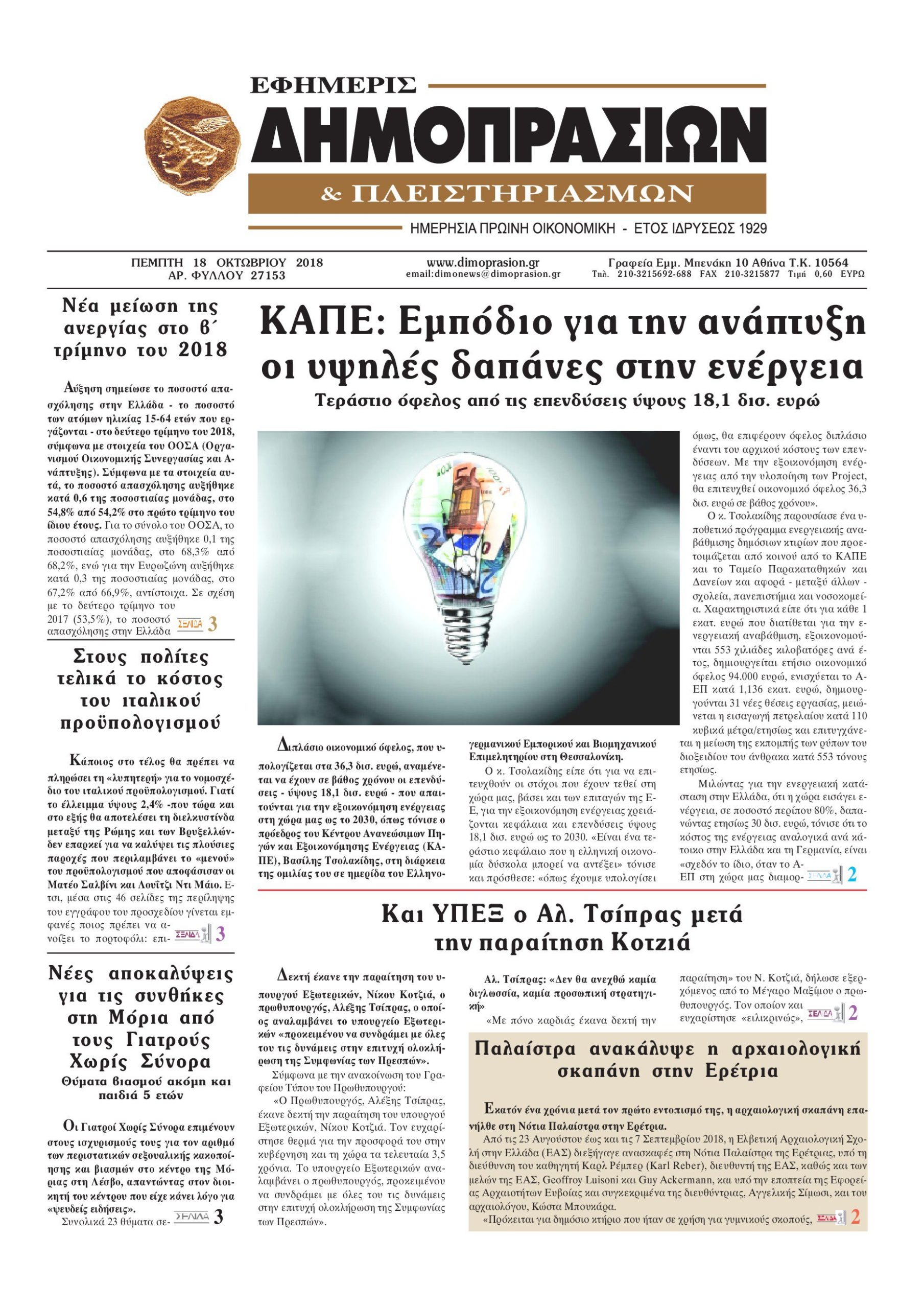 Οι οικονομικές εφημερίδες 18/10/18 Enikos Newsroom 06:45, Πέμπτη 18 Οκτωβρίου 2018 Media Διαβάστε τα πρωτοσέλιδα: ΟΙΚΟΝΟΜΙΚΕΣ ΕΦΗΜΕΡΙΔΕΣ ΠΡΩΤΟΣΕΛΙΔΑ Μοιράσου το: σχολίασε κι εσύ (0 σχόλια) Ακολουθήστε το enikos.gr στο Google News και μάθετε πρώτοι όλες τις ειδήσεις Δείτε όλες τις τελευταίες ειδήσεις από την Ελλάδα και τον Κόσμο στο enikos.gr Ειδήσεις Ροή Ειδήσεων 3 ώρες πριν Τραγωδία στη Χίο: Αρνείται τα πάντα ο φερόμενος διακινητής, τον «καίνε» οι διασωθέντες μετανάστες – Τι ανέφεραν στις πρώτες καταθέσεις τους για το ναυάγιο 4 ώρες πριν Πώς θα γίνει η νέα «κάθοδος» των αγροτών με τρακτέρ στην Αθήνα – «Αν χαθεί ο πρωτογενής τομέας, να μου πει το κράτος πού να μεταναστεύσουμε» 3 ώρες πριν ΗΠΑ – Ιράν: Το θρίλερ των συνομιλιών για τα πυρηνικά και οι μεταβλητές που εξετάζει ο Τραμπ 4 ώρες πριν Μητσοτάκης: «Η δέσμευσή μας για περισσότερες και καλύτερα αμειβόμενες δουλειές γίνεται πράξη» – Άφησε «παράθυρο» για ένταξη υγειονομικών στα βαρέα και ανθυγιεινά 3 ώρες πριν Παναθηναϊκός – ΠΑΟΚ 0-1: Προβάδισμα πρόκρισης από την άσπρη βούλα 4 ώρες πριν Ύπνος: 4 παράγοντες που διαταράσσουν το πιο κρίσιμο στάδιο της ξεκούρασής σας 5 ώρες πριν Αριθμολογία: Το τυχερό σας χρώμα, ανάλογα με το έτος γέννησής σας 3 ώρες πριν Λύθηκε το μυστήριο του Πράσινου Ποταμού που ρέει «ανηφορικά» και διασχίζει μια οροσειρά – Τι είναι η Λιθοσφαιρική Στάλαξη 10 ώρες πριν Νέα εποχή στα καταστήματα Allwyn με Instant Win και κέρδη στη στιγμή – Χιλιάδες τυχεροί διεκδικούν κέρδη έως 500 ευρώ εντελώς δωρεάν 1 ημέρα πριν Οπτική ψευδαίσθηση: Μόνο το 1% των ανθρώπων θα βρει το ελάφι σε 17 δευτερόλεπτα 5 λεπτά πριν Παγκράτι: Λήξη συναγερμού για σακούλα έξω από τράπεζα – Είχε σκουπίδια κι όχι εκρηκτικό μηχανισμό 25 λεπτά πριν Κακοκαιρία: Πτώσεις δέντρων και προβλήματα στην ηλεκτροδότηση στην Κέρκυρα – Ανεμοστρόβιλος προκάλεσε ζημιές σε στέγες σπιτιών 42 λεπτά πριν Κέιτ Μίντλετον: Το βιωματικό της βίντεο – μήνυμά για την Παγκόσμια Ημέρα κατά του Καρκίνου 56 λεπτά πριν K. Χατζηδάκης:« Να μην αδικούμε τους άνδρες και τις γυναίκες του Λιμενικού» – «Η χώρα δεν μπορεί να είναι ξέφραγο αμπέλι» ENIKOS NETWORK Το λάθος που κάνουμε με το μαξιλάρι στον ύπνο και αυξάνει τον κίνδυνο για γλαύκωμα και τύφλωση ΕΟΠΕ: Ολιστική στρατηγική απέναντι στον καρκίνο με επίκεντρο τον άνθρωπο Συμφωνία συνεργασίας για τα κρίσιμα ορυκτά υπέγραψαν ΕΕ, ΗΠΑ και Ιαπωνία – Στόχος η μείωση της εξάρτησης από την Κίνα Πιστοποιητικά: Πώς θα αντικατασταθούν για να μειωθεί η γραφειοκρατία Ευπάθεια στο moltbook ai αποκαλύπτει email, tokens σύνδεσης και api keys Αυτός είναι ο ρόλος της μικρής τρύπας στους νυχοκόπτες – «Είμαι ο μόνος που δεν το ήξερε;»» περισσότερα 20:19 , Τετάρτη 04 Φεβρουαρίου 2026 Eurovision 2026: Θα το… φέρει το «Ferto» του Akyla; Δείτε ποια θέση κατέχει στα ευρωπαϊκά προγνωστικά Πριν καλά-καλά ανακοινωθούν όλα τα κομμάτια του διαγωνισμού της φετινής Eurovision και πριν ακ... 19:50 , Τετάρτη 04 Φεβρουαρίου 2026 Να μ’ αγαπάς: Ο Άγγελος τινάζει στον αέρα τη συμφωνία πώλησης των επιχειρήσεων Η Άννα φεύγει οριστικά από το σπίτι των Καλλιγάδων στο νέο επεισόδιο της σειράς “Να μ΄αγ... 18:22 , Τετάρτη 04 Φεβρουαρίου 2026 Ο Όμιλος Antenna υπέγραψε Μνημόνιο Συνεργασίας με το Junior Achievement Greece και επενδύει στη νέα γενιά Ο Όμιλος Antenna υπέγραψε Μνημόνιο Συνεργασίας με τον μη κερδοσκοπικό οργανισμό Junior Achieve... 16:20 , Τετάρτη 04 Φεβρουαρίου 2026 Μπαμπά, σ’αγαπώ: Έτσι ξεκινά η περιπέτεια της πατρότητας για τα «3 μπαμπαδάκια» Η νέα οικ
