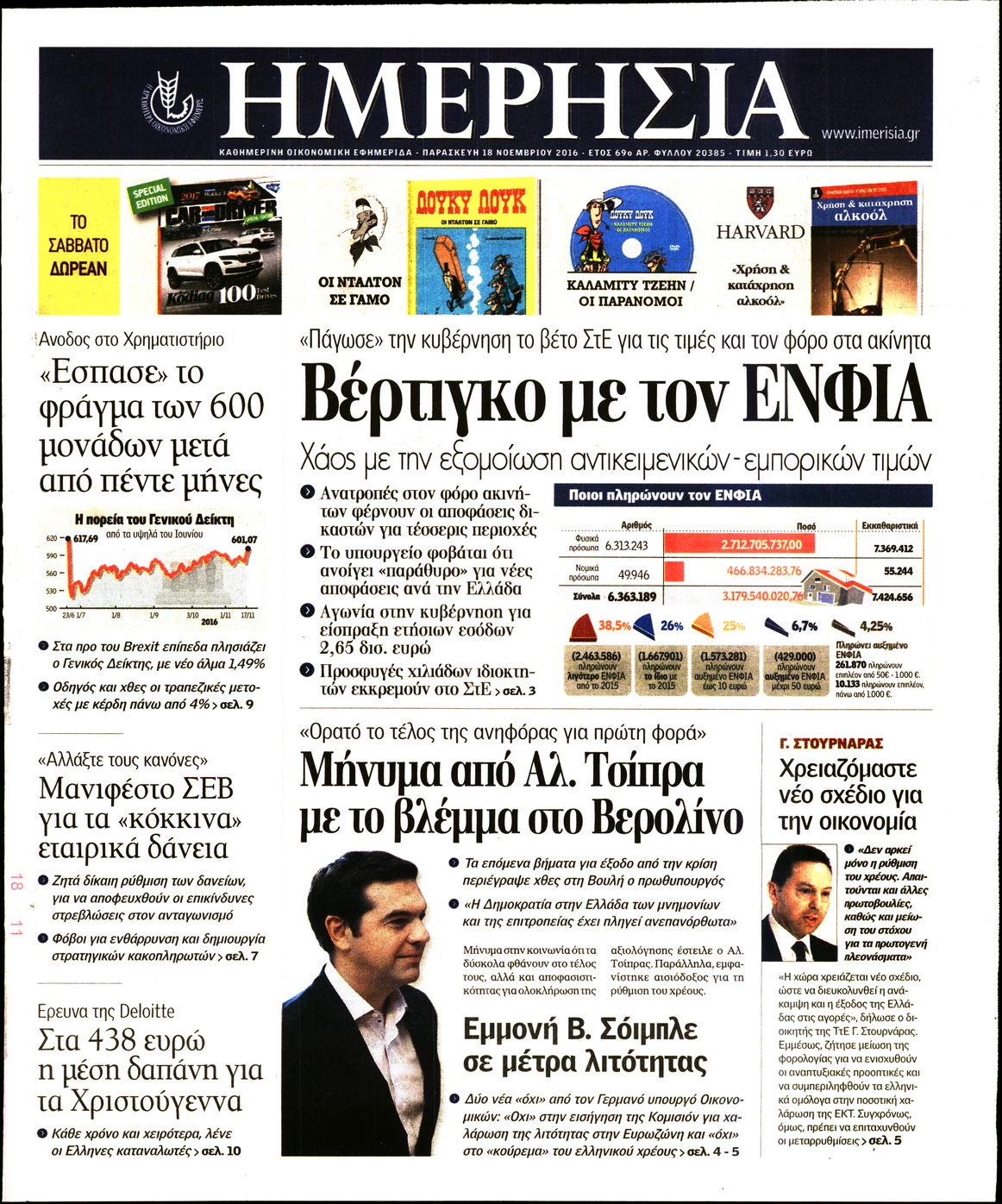 Οι οικονομικές εφημερίδες 18/11/2016 Enikos Newsroom 06:08, Παρασκευή 18 Νοεμβρίου 2016 Media Διαβάστε τα σημερινά πρωτοσέλιδα των οικονομικών εφημερίδων: ΟΙΚΟΝΟΜΙΚΕΣ ΕΦΗΜΕΡΙΔΕΣ ΠΡΩΤΟΣΕΛΙΔΑ Μοιράσου το: σχολίασε κι εσύ (0 σχόλια) Ακολουθήστε το enikos.gr στο Google News και μάθετε πρώτοι όλες τις ειδήσεις Δείτε όλες τις τελευταίες ειδήσεις από την Ελλάδα και τον Κόσμο στο enikos.gr Ειδήσεις Ροή Ειδήσεων 3 ώρες πριν Εκτός ευρωομάδας ΣΥΡΙΖΑ ο Νίκος Παππάς μετά την επίθεση στον δημοσιογράφο Νίκο Γιαννόπουλο – Η μήνυση και οι νέες δηλώσεις 4 ώρες πριν «Αγριεύουν» οι αγρότες: «Δεν συντρέχει λόγος συνάντησης με τον πρωθυπουργό» – Ώρα αποφάσεων στη σύσκεψη της Πέμπτης 4 ώρες πριν Κυψέλη: Χωρίς την οικογένειά της δίπλα της απολογήθηκε η 16χρονη – «Της είχε επιτεθεί κάποιος για να την βιάσει, φοβήθηκε και κυκλοφορούσε με μαχαίρι» 3 ώρες πριν Politico: Το πρόβλημα της Ευρώπης δεν είναι το Βέλγιο αλλά ο Ντόναλντ Τραμπ 5 ώρες πριν Αλεξανδρούπολη: Πολυοργανική ανεπάρκεια λόγω υποσιτισμού η αιτία θανάτου του 3χρονου αγοριού 3 ώρες πριν Μυστήριο με τεράστιες κυκλικές πέτρες 200 κιλών – Ανακαλύφθηκαν τυχαία κατά τη διάρκεια οδικών έργων και κανείς δεν ξέρει από πού προέρχονται 4 ώρες πριν Ύπνος: Ειδικός εξηγεί τον πραγματικό λόγο που ξυπνάτε στις 4 τα ξημερώματα – Ο ρόλος των ορμονών και του κιρκάδιου ρυθμού 5 ώρες πριν Αριθμολογία: Οι άνθρωποι που έχουν γεννηθεί αυτές τις 4 ημερομηνίες, είναι τρυφεροί και αγαπούν ανιδιοτελώς 17 ώρες πριν 20 χρόνια τα Χριστούγεννα ξεκινούν στα Public με μεγάλη ποικιλία σε δώρα! 10 λεπτά πριν Ρωσία: Ουκρανικές δυνάμεις έπληξαν πλοίο στο λιμάνι του Ροστόφ – Αναφορές για θύματα 25 λεπτά πριν Βρυξέλλες: Νυχτερινό… μπλόκο αγροτών μπροστά από το κτίριο της Ευρωπαϊκής Επιτροπής – Πάνω από 100 τρακτέρ απέκλεισαν την λεωφόρο 41 λεπτά πριν Euroleague: Απρόσμενη ήττα για την Μονακό του Βασίλη Σπανούλη – Η βαθμολογία μετά το τέλος της 16ης αγωνιστικής 56 λεπτά πριν Μουντιάλ 2026: Η νέα ταξιδιωτική απαγόρευση του Ντόναλντ Τραμπ πλήττει (και) τους οπαδούς Σενεγάλης – Ακτής Ελεφαντοστού 1 ώρα πριν Κυριάκος Μητσοτάκης: Στις Βρυξέλλες για την Σύνοδο Κορυφής ΕΕ και Δυτικών Βαλκανίων – Δείτε φωτογραφίες ENIKOS NETWORK Αϋπνία: Το κόλπο που θα σας βοηθήσει να κοιμηθείτε απόψε – Είναι απλό και έχει αποτέλεσμα 2,6 εκατομμύρια πολίτες έχουν ήδη εμβολιαστεί κατά της γρίπης ΕΛΣΤΑΤ: Τι δείχνουν τα νέα στοιχεία για τις ηλεκτρονικές παραγγελίες των επιχειρήσεων ΚΕΠΕ: Οι 3 διακριτές συμβολές των ΜμΕ και της μεταποίησης στην ελληνική οικονομία Χαρτογραφώντας το «σημείο χωρίς επιστροφή»: Για πρώτη φορά αποκαλύπτεται με λεπτομέρεια το ακανθώδες όριο της ατμόσφαιρας τ... Η Google καταργεί τη λειτουργία «dark web report» – Πώς θα μπορούν οι χρήστες να διαγράφουν τα δεδομένα τους περισσότερα 22:24 , Τετάρτη 17 Δεκεμβρίου 2025 Το Σπίτι Δίπλα Στο Ποτάμι: Σε κίνδυνο η υγεία του Απόστολου – Τι θα δούμε απόψε “Το Σπίτι Δίπλα στο Ποτάμι” ξετυλίγει το νήμα της ζωής των πέντε αδελφών με καταισ... 21:14 , Τετάρτη 17 Δεκεμβρίου 2025 Παιχνίδια Εκδίκησης: Θα καταφέρει ο Χρήστος να κλονίσει την εμπιστοσύνη της Μάγιας απέναντι στον Άγη; Τα «Παιχνίδια Εκδίκησης» έρχονται απόψε στις 22:30, στον Αντ1, με το τελευταίο επεισόδιο της χ... 20:57 , Τετάρτη 17 Δεκεμβρίου 2025 Άγιος Έρωτας: Η Χλόη καταθέτει εναντίον του πατέρα της και ο Χάρης αποκαλύπτει στον Κλεάνθη ότι δεν είναι ο βιολογικός του πατέρας. Γεμάτο αποκαλύψεις είναι το νέο επεισόδιο της σειράς “Άγι