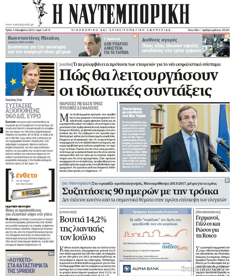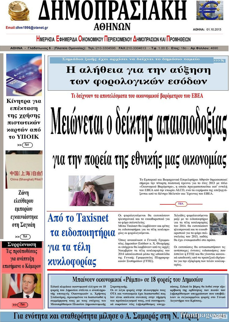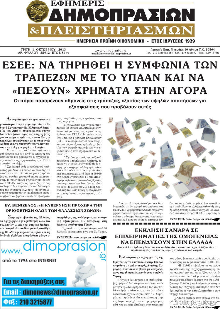 Οι οικονομικές εφημερίδες Enikos Newsroom 08:18, Τρίτη 01 Οκτωβρίου 2013 Media Οι οικονομικές εφημερίδες ΟΙΚΟΝΟΜΙΚΕΣ ΕΦΗΜΕΡΙΔΕΣ ΠΡΩΤΟΣΕΛΙΔΑ Μοιράσου το: σχολίασε κι εσύ (0 σχόλια) Ακολουθήστε το enikos.gr στο Google News και μάθετε πρώτοι όλες τις ειδήσεις Δείτε όλες τις τελευταίες ειδήσεις από την Ελλάδα και τον Κόσμο στο enikos.gr Ειδήσεις Ροή Ειδήσεων 8 ώρες πριν Μητσοτάκης: Αναγκαία η μεταρρύθμιση του πρωτογενούς τομέα – Τα 6 νέα μέτρα για το στεγαστικό και οι αναφορές σε «Ιθάκη» και «πολιτικούς του καναπέ» 7 ώρες πριν Δάνεια σε ελβετικό φράγκο: Τα βασικά σημεία της ρύθμισης – ανάσας για 40.000 δανειολήπτες – Αναλυτικός οδηγός με ερωτήσεις και απαντήσεις 7 ώρες πριν Κυψέλη: Εξιτήριο πήρε η 14χρονη μαθήτρια που μαχαιρώθηκε από την 16χρονη σε σχολείο – «Θέλω να βοηθήσω το παιδί, έχει μπλέξει με κακές παρέες» 6 ώρες πριν Τραμπ: Γιατί κατέθεσε τώρα την αγωγή κατά του BBC – Πώς η κίνησή του εξυπηρετεί το νέο δόγμα του για «αντίσταση» στην Ευρώπη, υπέρ των συντηρητικών 7 ώρες πριν ΟΠΕΚΕΠΕ – Παράνομες επιδοτήσεις: Ελεύθεροι με περιοριστικούς όρους και οι 7 κατηγορούμενοι που απολογήθηκαν σήμερα 6 ώρες πριν Ανακαλύφθηκε βυθισμένη πέτρινη κατασκευή ανοιχτά της Κριμαίας – Αποτελεί μέρος αρχαίας ελληνικής αποικίας 7 ώρες πριν Ύπνος: Αυτό μπορεί να είναι το χειρότερο λάθος για το βιολογικό ρολόι σας, σύμφωνα με ειδικό 8 ώρες πριν Αριθμολογία: Οι άνθρωποι που έχουν γεννηθεί αυτές τις 3 ημερομηνίες, προσελκύουν μεγάλη τύχη πριν από το τέλος του 2025 10 ώρες πριν Οι 7 συμπεριφορές που μαρτυρούν ότι ένας άνδρας επενδύει μακροπρόθεσμα σε μια σχέση 1 λεπτό πριν Εφημερεύοντα φαρμακεία σε Αθήνα και Θεσσαλονίκη (17/12) 7 λεπτά πριν Κόστα Ρίκα: Το Κογκρέσο απέρριψε το αίτημα για άρση της ασυλίας του προέδρου Τσάβες 15 λεπτά πριν Κολομβία: Νεκροί τέσσερις αστυνομικοί σε βομβιστικές επιθέσεις ανταρτών 23 λεπτά πριν Στάση εργασίας 11:00 – 17:00 σήμερα στα λεωφορεία του ΟΑΣΑ – Ποιες γραμμές θα λειτουργήσουν 39 λεπτά πριν Παλαιστινιακό: «Η λύση των δύο κρατών είναι ο μόνος βιώσιμος δρόμος», τόνισε η Ελλάδα στο Συμβούλιο Ασφαλείας του ΟΗΕ ENIKOS NETWORK Αίτημα ΙΣΑ για την εξαίρεση των προσωπικών γιατρών από τις κατ’ οίκον επισκέψεις Η σκανδιναβική μέθοδος στον ύπνο που μπορεί να σώσει έναν γάμο Πιερρακάκης: Ο προϋπολογισμός συμβάλλει ουσιαστικά στην ενίσχυση της αγοραστικής δύναμης της πλειονότητας των εργαζομένων e-ΕΦΚΑ: Παρατείνεται η προθεσμία για την υποβολή ΑΠΔ – Ποιους αφορά Σύγχρονος Νοστράδαμος: Προειδοποιεί για «μεγάλο γεγονός» τους επόμενους μήνες που θα συγκλονίσει τη Βρετανία και τον κόσμο Τεστ παρατηρητικότητας: Μπορείτε να βρείτε τις 3 διαφορές στις εικόνες με έναν πιγκουίνο σε 14 δευτερόλεπτα περισσότερα 20:06 , Τρίτη 16 Δεκεμβρίου 2025 Ο ΣΚΑΙ καταγγέλλει τον ΕΚΚΟΜΕΔ Επιστολή με την οποία καταγράφει την έντονη διαμαρτυρία του προς τον διευθύνοντα σύμβουλο του... 17:40 , Τρίτη 16 Δεκεμβρίου 2025 Eurovision: Στις 4 Ιανουαρίου αποκαλύπτονται τα 28 τραγούδια του ελληνικού τελικού Η αγωνία τελειώνει, η γιορτή της Eurovision αρχίζει στην ΕΡΤ από τις πρώτες ημέρες της νέας χρ... 17:09 , Τρίτη 16 Δεκεμβρίου 2025 Alter Ego Media: Βαθύτατη θλίψη και ειλικρινή συλλυπητήρια για την απώλεια της Ειρήνης Μαρινάκη Τη βαθύτατη θλίψη και τα ειλικρινή συλλυπητήριά της εκφράζει η Alter Ego Media για τον θάνατο ... 13:00 , Τρίτη 16 Δεκεμβρίου 2025 «Στο Παρά Πέντε – 20 Χρόνια Μετά»: Κυκλοφόρησε το τρέιλερ του επετειακού επεισοδίου της θρυλικής σειράς – Πότε θα πρ