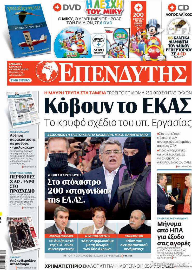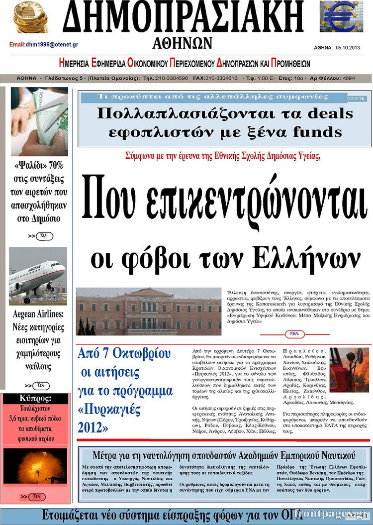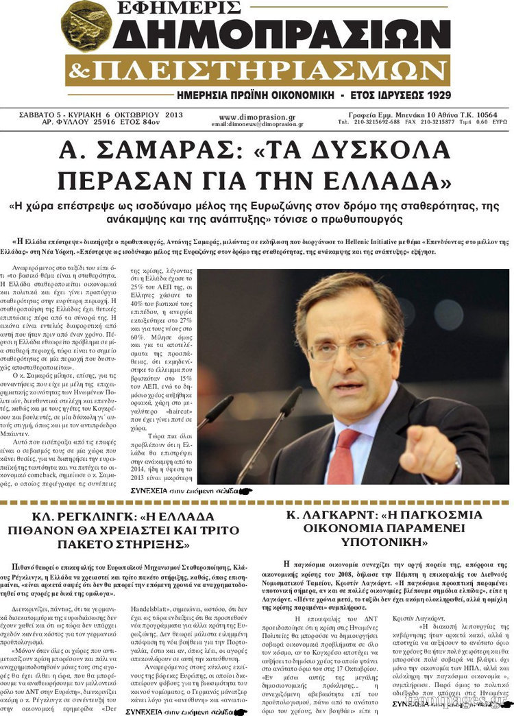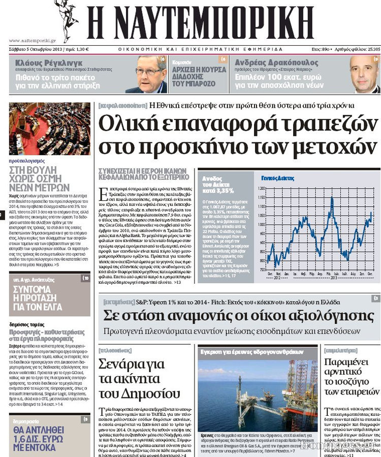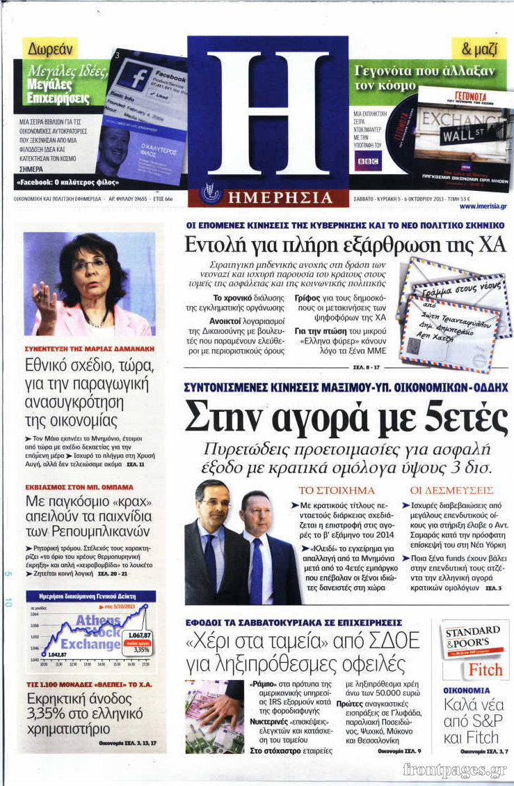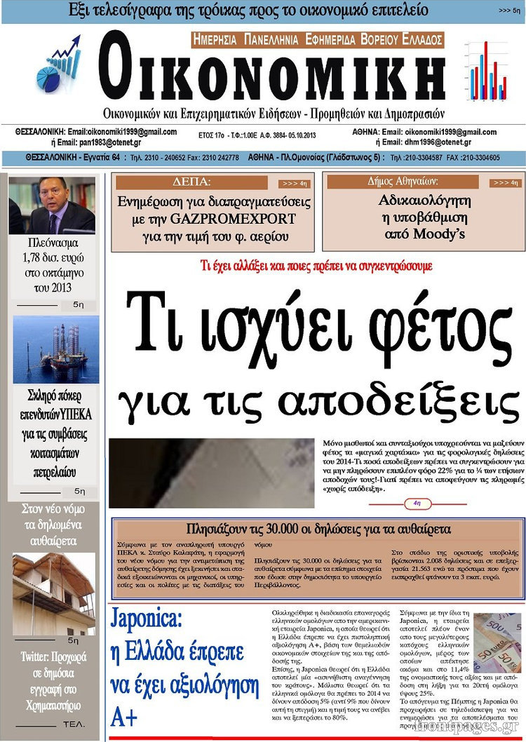 Οι οικονομικές εφημερίδες Enikos Newsroom 08:42, Σάββατο 05 Οκτωβρίου 2013 Media Οι οικονομικές εφημερίδες Διαβάστε τα πρωτοσέλιδα των οικονομικών εφημερίδων. ΕΦΗΜΕΡΙΔΕΣ ΟΙΚΟΝΟΜΙΚΕΣ ΕΦΗΜΕΡΙΔΕΣ ΠΡΩΤΟΣΕΛΙΔΑ Μοιράσου το: σχολίασε κι εσύ (0 σχόλια) Ακολουθήστε το enikos.gr στο Google News και μάθετε πρώτοι όλες τις ειδήσεις Δείτε όλες τις τελευταίες ειδήσεις από την Ελλάδα και τον Κόσμο στο enikos.gr Ειδήσεις Ροή Ειδήσεων 32 λεπτά πριν Πώς στήθηκε η επιχείρηση «Ίπαλλος» που οδήγησε στη σύλληψη του «Έλληνα Εσκομπάρ» – «Ο πόλεμος ενάντια στους εμπόρους ναρκωτικών θα συνεχιστεί» 17 λεπτά πριν Δίκη Χρυσής Αυγής: Την ενοχή και των 42 κατηγορουμένων ζητά η εισαγγελέας 37 λεπτά πριν Κυψέλη: Στη φυλακή η 16χρονη που μαχαίρωσε συμμαθήτριά της 3 ώρες πριν Αμοργός: «Θα προσπαθήσω να το κάνω κάθε μέρα» – Ποιος είναι ο αγρότης που έστησε μόνος του το πρώτο μπλόκο στο νησί 2 ώρες πριν Τραγωδία στην Αλεξανδρούπολη: Παιδάκι 3 ετών μεταφέρθηκε νεκρό από τη μητέρα του στο νοσοκομείο 42 λεπτά πριν Τα 3 ζώδια που θα δουν τη ζωή τους να αλλάζει ριζικά το 2026 – «Όλα γίνονται καλύτερα σταδιακά» 6 ώρες πριν «Δεν είχα κλάψει από τότε που διαγνώστηκα με καρκίνο, ώσπου ένα τηλεφώνημα με έκανε να λυγίσω» – Η συγκλονιστική εξομολόγηση ενός άνδρα 2 ώρες πριν Ο σπάνιος σεισμός που έλυσε τα χέρια των επιστημόνων – Αποκάλυψε ακριβώς όσα αναζητούσαν 7 ώρες πριν 20 χρόνια τα Χριστούγεννα ξεκινούν στα Public με μεγάλη ποικιλία σε δώρα! 4 λεπτά πριν Θεσσαλονίκη: Ακυρώνονται τρεις παραστάσεις του ΚΘΒΕ λόγω στάσης εργασίας των εργαζομένων 10 λεπτά πριν Τραγωδία στην Αχαΐα: 48χρονος κατέρρευσε στο κυνήγι μπροστά στα μάτια του πατέρα του 17 λεπτά πριν Δίκη Χρυσής Αυγής: Την ενοχή και των 42 κατηγορουμένων ζητά η εισαγγελέας 18 λεπτά πριν Μαρκέλλα Γιαννάτου: «Είμαι κοντά στα 14 χρόνια σε ψυχανάλυση – Είχα αρχίσει να έχω κρίσεις άγχους, νόμιζα ότι θα πεθάνω» 25 λεπτά πριν Υπουργείο Αγροτικής Ανάπτυξης: Πώς θα γίνει η πληρωμή αγροτεμαχίων έως 20 στρέμματα παρά τα ζητήματα ΚΑΕΚ ENIKOS NETWORK Σοβαροί κίνδυνοι από τη λάθος χορήγηση φαρμάκου για τις αιμορραγίες-Συστάσεις προς τους γιατρούς 5 πράγματα που αποφεύγει γαστρεντερολόγος για να μειώσει τον κίνδυνο καρκίνου του εντέρου Eurostat: Κάτω από την αρχική εκτίμηση της Υπηρεσίας ο πληθωρισμός στην Ελλάδα τον Νοέμβριο του 2025 – Tα στοιχεία για την ... Συντάξεις Ιανουαρίου 2026: Σε ποιους θα πιστωθούν την Πέμπτη τα χρήματα και τι αυξήσεις θα δοθούν – Δείτε αναλυτικά παραδεί... Χαρτογραφώντας το «σημείο χωρίς επιστροφή»: Για πρώτη φορά αποκαλύπτεται με λεπτομέρεια το ακανθώδες όριο της ατμόσφαιρας τ... Η Google καταργεί τη λειτουργία «dark web report» – Πώς θα μπορούν οι χρήστες να διαγράφουν τα δεδομένα τους περισσότερα 12:35 , Τετάρτη 17 Δεκεμβρίου 2025 Μίρκα Παπακωνσταντίνου: «Δεν ήμουν αισιόδοξη για τα νούμερα – Είμαι ρεαλίστρια» Στα γυρίσματα του εορταστικού επεισοδίου της αγαπημένης σειράς “Το Σόι Σου”, βρέθηκε η κάμερα ... 12:12 , Τετάρτη 17 Δεκεμβρίου 2025 Ακούστε την εκπομπή του Νίκου Χατζηνικολάου 17/12/2025 Ακούστε την εκπομπή του Νίκου Χατζηνικολάου στον ραδιοφωνικό σταθμό RealFm 97,8, την Τετάρτη 1... 11:35 , Τετάρτη 17 Δεκεμβρίου 2025 Home Alone: Το σπίτι της ταινίας θα ανακαινιστεί – Επιστροφή στην αισθητική της δεκαετίας του ’90 Οι νέοι ιδιοκτήτες του πραγματικού σπιτιού που παρουσιάζεται στην κλασική ταινία του 1990 «Hom... 11:25 , Τετάρτη 17 Δεκεμβρίου 2025 Grand Hotel: Απόψε το τελευταίο επεισόδιο της χρονιάς – Όλα τα μυστικά μέν