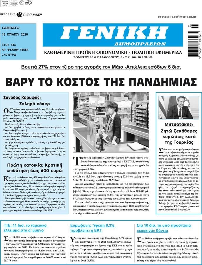 Οι οικονομικές εφημερίδες 18/7/2020 Διονύσης Νίκκας 08:01, Σάββατο 18 Ιουλίου 2020 Media Διαβάστε τα πρωτοσέλιδα των οικονομικών εφημερίδων… ΟΙΚΟΝΟΜΙΚΕΣ ΕΦΗΜΕΡΙΔΕΣ Μοιράσου το: σχολίασε κι εσύ (0 σχόλια) Ακολουθήστε το enikos.gr στο Google News και μάθετε πρώτοι όλες τις ειδήσεις Δείτε όλες τις τελευταίες ειδήσεις από την Ελλάδα και τον Κόσμο στο enikos.gr Ειδήσεις Ροή Ειδήσεων 2 ώρες πριν Χριστούγεννα στα μπλόκα οι αγρότες: Άνοιξαν στα διόδια και μοίρασαν προϊόντα στους πολίτες – Νέα σύσκεψη την Κυριακή στη Νίκαια 2 ώρες πριν Κύκλωμα διακίνησης ναρκωτικών σε σχολεία: Τηλεφωνούσαν στους ανηλίκους την ώρα του μαθήματος – Οι διάλογοι-σοκ, τα «ψευδώνυμα» και τα βασανιστήρια 2 ώρες πριν Αρχεία Επστάιν: Οι 500 σελίδες που λείπουν, τα αναπάντητα ερωτήματα και οι επώνυμοι – Τι έπεται 3 ώρες πριν Ζελένσκι: Μόνο οι ΗΠΑ και ο Τραμπ μπορούν να πιέσουν τη Ρωσία να βάλει τέλος στον πόλεμο 4 ώρες πριν Φοινικούντα: Προφυλακιστέος ο 30χρονος για συνέργεια στη διπλή δολοφονία – Και άλλα πρόσωπα στο «μικροσκόπιο» 2 ώρες πριν Αποκαλύφθηκε το άγνωστο «GPS» της αρχαιότητας – Πώς οι ναοί «φώτιζαν» τον δρόμο των ναυτικών πριν από την εφεύρεση των φάρων 3 ώρες πριν Ύπνος: Η διατροφή που μπορεί να σας βοηθήσει να κοιμάστε καλύτερα και να ζήσετε περισσότερο 4 ώρες πριν Αριθμολογία: Ο αριθμός του φύλακα αγγέλου σας, με βάση τον μήνα γέννησής σας – «Έτσι σας στέλνει σημάδια το σύμπαν» 16 ώρες πριν Enerwave: Το νέο «ρεύμα» στη λιανική ενέργειας που αλλάζει την εμπειρία του καταναλωτή 5 λεπτά πριν Ρετζέπ Ταγίπ Ερντογάν: Δεν έχουμε καμία βλέψη στα εδάφη ή την κυριαρχία κανενός – Δεν θα επιτρέψουμε να παραβιαστούν τα δικαιώματά μας 19 λεπτά πριν Γερμανία: Εκδήλωση μνήμης για τα θύματα της επίθεσης στη χριστουγεννιάτικη αγορά του Μαγδεμβούργου 34 λεπτά πριν The Voice: Η επιστροφή της Έλενας Παπαρίζου και η ατάκα του Γιώργου Μαζωνάκη μετά τις καταγγελίες 49 λεπτά πριν Άδωνις Γεωργιάδης: «Η υγεία είναι κοινωνικό αγαθό, δεν μπορείς να αποκλείσεις κανέναν επειδή δεν έχει χρήματα» 1 ώρα πριν Ανηλίκιο Μετσόβου: Δύο σπίτια παραδόθηκαν στις φλόγες – Επί ποδός η Πυροσβεστική ENIKOS NETWORK Οι γυναίκες αποκαλύπτουν το πιο ελκυστικό πράγμα που μπορεί να κάνει ένας άνδρας Ομορφιά και αντιγήρανση: Ειδικοί μιλούν για συσκευές περιποίησης του δέρματος «Πολεμική» προετοιμασία από την ευρωπαϊκή βιομηχανία ενέργειας – Η Eurelectric ζητεί «ομπρέλα» προστασίας για τις υποδομές Ακύρωση ΑΦΜ για απάτες – Ποιους βάζει στο στόχαστρο η ΑΑΔΕ Χαρτογραφώντας το «σημείο χωρίς επιστροφή»: Για πρώτη φορά αποκαλύπτεται με λεπτομέρεια το ακανθώδες όριο της ατμόσφαιρας τ... Η Google καταργεί τη λειτουργία «dark web report» – Πώς θα μπορούν οι χρήστες να διαγράφουν τα δεδομένα τους περισσότερα 00:00 , Κυριακή 21 Δεκεμβρίου 2025 The Voice: Η επιστροφή της Έλενας Παπαρίζου και η ατάκα του Γιώργου Μαζωνάκη μετά τις καταγγελίες Στη φάση των Cross Battles Live μπήκε το The Voice, με την Έλενα Παπαρίζου να επιστρέφει στο π... 20:30 , Σάββατο 20 Δεκεμβρίου 2025 Αυτή την Κυριακή με τη Realnews: Instyle, μαζί Drive και Realnews Geopolitics Αυτή την Κυριακή με τη Realnews: Instyle, μαζί Drive και Realnews Geopolitics Instyle Η Άννα Ρ... 20:28 , Σάββατο 20 Δεκεμβρίου 2025 Ο ΑΝΤ1 γεμίζει τις γιορτές με μουσική – Ποιους καλλιτέχνες θα απολαύσουμε Φέτος στον ΑΝΤ1 γιορτάζουμε τις νύχτες μας παρέα με αγαπημένους καλλιτέχνες και μεγάλες μουσι... 18:19 , Σάββατο 20 Δεκεμβρίου 2025 HOTΕΛ ΕΛVIRA: Η Ελβίρα μαθαίνει πως ο Χάρι μένει κρυφά στο ξενοδοχείο του Παντελή Συνεχί