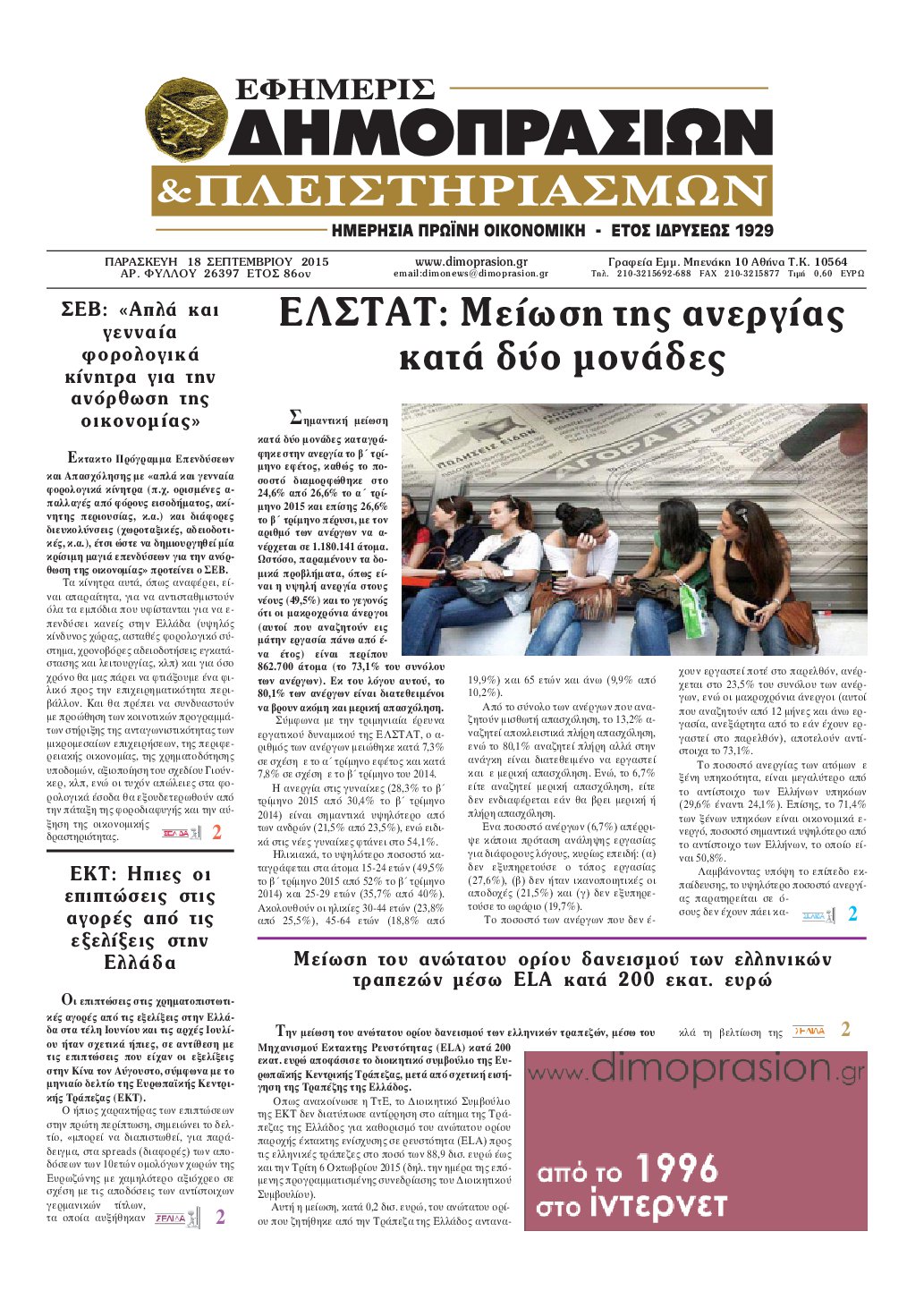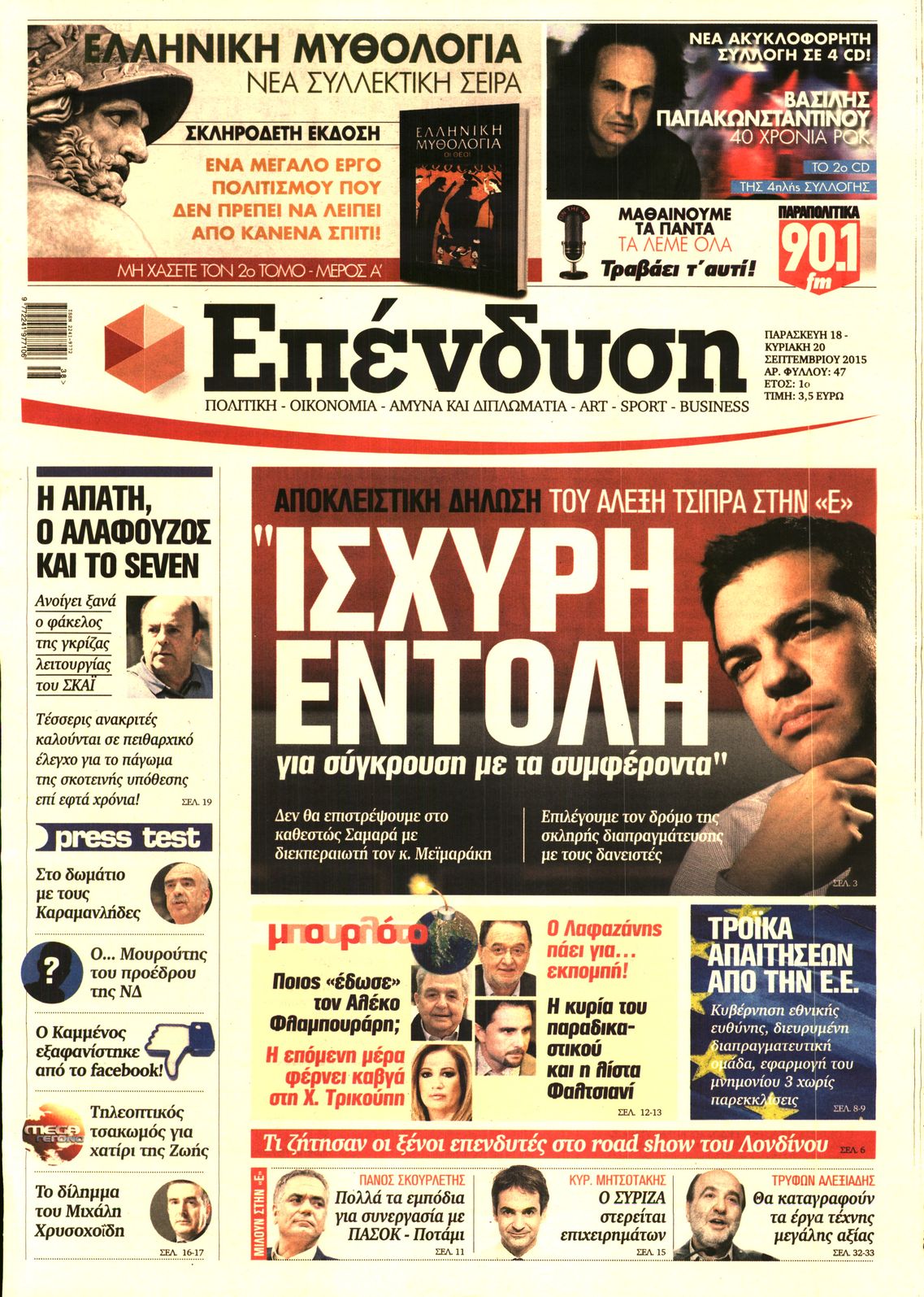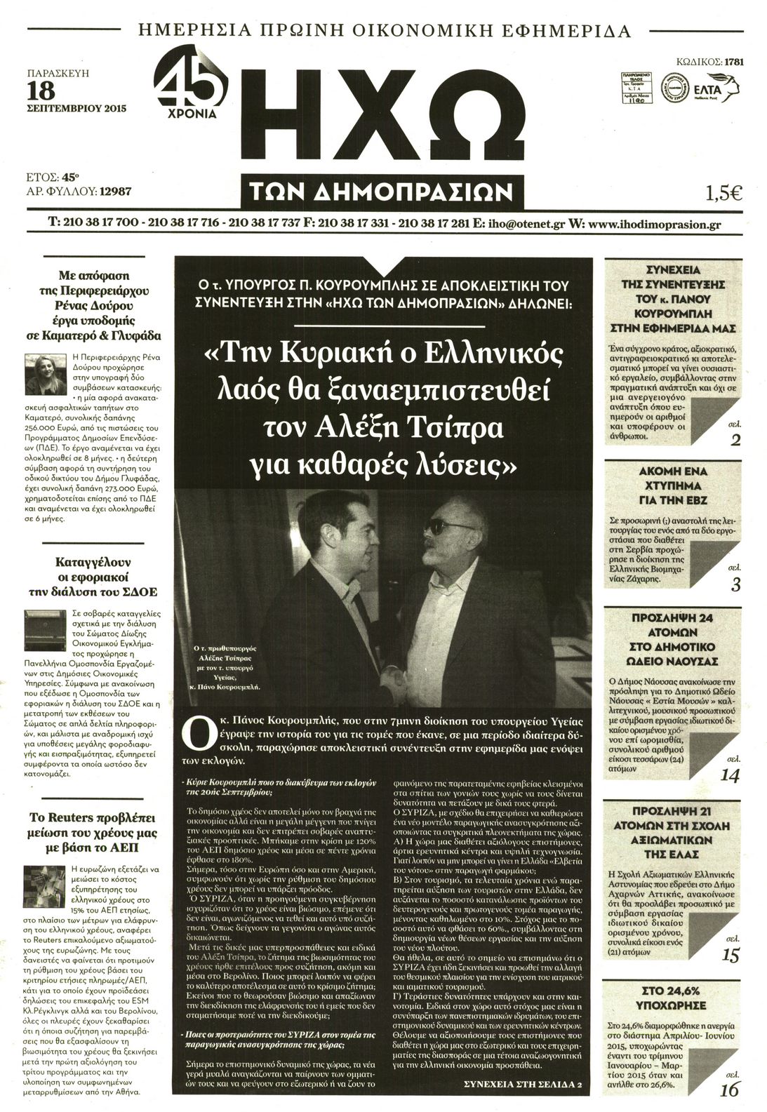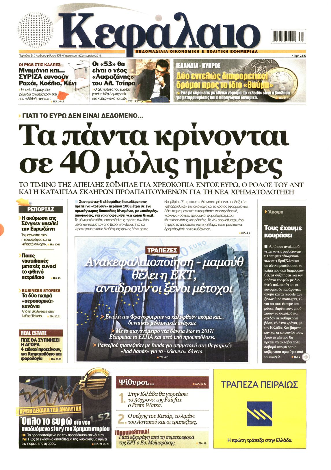 Οι οικονομικές εφημερίδες 18/9/2015 Enikos Newsroom 07:50, Παρασκευή 18 Σεπτεμβρίου 2015 Media Διαβάστε τα σημερινά πρωτοσέλιδα των οικονομικών εφημερίδων: ΟΙΚΟΝΟΜΙΚΕΣ ΕΦΗΜΕΡΙΔΕΣ ΠΡΩΤΟΣΕΛΙΔΑ Μοιράσου το: σχολίασε κι εσύ (0 σχόλια) Ακολουθήστε το enikos.gr στο Google News και μάθετε πρώτοι όλες τις ειδήσεις Δείτε όλες τις τελευταίες ειδήσεις από την Ελλάδα και τον Κόσμο στο enikos.gr Ειδήσεις Ροή Ειδήσεων 14 λεπτά πριν LIVE από Λοριάν: Η ύψωση της ελληνικής σημαίας στην πρώτη φρεγάτα FDI Belharra ΚΙΜΩΝ 26 λεπτά πριν Στην Ευελπίδων ο 22χρονος που καταγγέλλει τον Γιώργο Μαζωνάκη για ασελγείς πράξεις – «Έχουμε εμπιστοσύνη στη Δικαιοσύνη, καμία εκβίαση» λέει ο δικηγόρος του 2 ώρες πριν Νίκος Παππάς: Άφαντος παραμένει ο ευρωβουλευτής μετά την επίθεση στον Νίκο Γιαννόπουλο 1 ώρα πριν Βρυξέλλες: Ένταση με τους αγρότες – Πέταξαν πατάτες και κροτίδες 3 ώρες πριν Συναγερμός και στην Ελλάδα για τη «σούπερ γρίπη»: Πόσο σοβαρή είναι και ποιοι θεωρούνται πιο ευάλωτοι – 3 ειδικοί μιλούν στο enikos.gr 3 ώρες πριν Τα 4 ζώδια που λαμβάνουν ένα ισχυρό σημάδι από το σύμπαν – «Αποκαλύπτεται κάτι που μπορεί να αλλάξει τη ζωή μας» 4 ώρες πριν Η σύζυγός του παραπονιέται για τα χρήματα που της δίνει για ψώνια κάθε μήνα – «Λέει ότι νιώθει φτωχή και της είπα να βρει δουλειά» 2 ώρες πριν Αν κάνετε συνεχώς αυτά τα 8 πράγματα με τα κατοικίδιά σας, σας λείπει η ανθρώπινη επαφή 1 ημέρα πριν 20 χρόνια τα Χριστούγεννα ξεκινούν στα Public με μεγάλη ποικιλία σε δώρα! 4 λεπτά πριν Κατερίνα Καινούργιου για Γιώργο Μαζωνάκη: «Θεωρώ φρικτό αυτό το τσίρκο που έχει συμβεί τις τελευταίες μέρες στα Μέσα» 10 λεπτά πριν Μαρινάκης για Νίκο Παππά: Να δώσει απαντήσεις ο άνθρωπος που τον έβαλε στην πολιτική – Ήταν προσωπική επιλογή Τσίπρα 14 λεπτά πριν LIVE από Λοριάν: Η ύψωση της ελληνικής σημαίας στην πρώτη φρεγάτα FDI Belharra ΚΙΜΩΝ 16 λεπτά πριν Θεσσαλονίκη: Υπό κράτηση ο 48χρονος που κατηγορείται για φοροδιαφυγή ύψους 29,6 εκατ. ευρώ στη Γερμανία 21 λεπτά πριν Φίλης στον Realfm 97,8: «Δεν πρέπει να είμαστε τόσο γενναιόδωροι στην εξωτερική μας πολιτική» ENIKOS NETWORK Όμιλος ΙΑΤΡΟΠΟΛΙΣ: Πρωτοπόροι στη μοριακή απεικόνιση και στην πυρηνική ιατρική Τι περιλαμβάνει το σχέδιο της ΕΕ για την καρδιαγγειακή υγεία-Οι προτάσεις της Ελληνικής Καρδιολογικής Εταιρείας Ενοίκια: Τι αλλάζει με τη νέα τροπολογία στην πληρωμή Ειδικό επιδοτούμενο πρόγραμμα κατάρτισης από ΔΥΠΑ και ΕΛΓΟ – ΔΗΜΗΤΡΑ: Έως αύριο οι ενστάσεις – Όσα πρέπει να γνωρίζετε Χαρτογραφώντας το «σημείο χωρίς επιστροφή»: Για πρώτη φορά αποκαλύπτεται με λεπτομέρεια το ακανθώδες όριο της ατμόσφαιρας τ... Η Google καταργεί τη λειτουργία «dark web report» – Πώς θα μπορούν οι χρήστες να διαγράφουν τα δεδομένα τους περισσότερα 08:00 , Πέμπτη 18 Δεκεμβρίου 2025 Την Κυριακή με τη Realnews: Δωροεπιταγή 10€ Δωροεπιταγή αξίας 10€ για αγορές άνω των 60€ από τα πολυκαταστήματα FactoryOutlet H προσφορά ι... 07:50 , Πέμπτη 18 Δεκεμβρίου 2025 «Το σόι σου»: Backstage στα γυρίσματα για το εορταστικό επεισόδιο «Το σόι σου» φορά τα γιορτινά του για τα Χριστούγεννα και η Όλγα Λαφαζάνη, με την κάμερα του «... 07:36 , Πέμπτη 18 Δεκεμβρίου 2025 Οι αθλητικές μεταδόσεις 18/12/2025 – Πού θα δείτε τον αγώνα της ΑΕΚ με την Κραϊόβα για το Conference League Τα ματς ΑΕΚ – Ουνιβερσιτάτεα Κραϊόβα για το Conference League και Παναθηναϊκός – Χάποελ Τελ Αβ... 05:48 , Πέμπτη 18 Δεκεμβρίου 2025 Οι οικονομικές εφημερίδες 18/12/2025 Διαβάστε τα πρωτοσέλιδα από τις οικονομικές εφημερίδες, σήμερα 18/12/2025. ΤΕΛΕΥΤΑΙΕΣ ΕΙΔΗΣΕΙΣ 4 λεπτά 