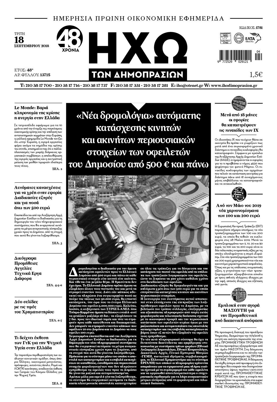 Οι οικονομικές εφημερίδες 18/9/2018 Enikos Newsroom 06:55, Τρίτη 18 Σεπτεμβρίου 2018 Media Διαβάστε τα πρωτοσέλιδα 09 ΟΙΚΟΝΟΜΙΚΕΣ ΕΦΗΜΕΡΙΔΕΣ Μοιράσου το: σχολίασε κι εσύ (0 σχόλια) Ακολουθήστε το enikos.gr στο Google News και μάθετε πρώτοι όλες τις ειδήσεις Δείτε όλες τις τελευταίες ειδήσεις από την Ελλάδα και τον Κόσμο στο enikos.gr Ειδήσεις Ροή Ειδήσεων 53 λεπτά πριν Αγρότες: Πολύωροι αποκλεισμοί στα τελωνεία Προμαχώνα, Εξοχής, Ευζώνων και Νίκης – Κλείνουν τον κόμβο Φιλώτα οι παραγωγοί στη Δυτική Μακεδονία 24 λεπτά πριν Νίκος Παππάς: Ζητώ συγγνώμη για αυτό το επεισόδιο – Δεν τον γρονθοκόπησα 3 ώρες πριν Ευρωπαϊκό Συμβούλιο: Όλες οι λεπτομέρειες για το δάνειο των 90 δισ. ευρώ στην Ουκρανία – Τα συμπεράσματα της Συνόδου Κορυφής 2 ώρες πριν Αίγιο: 22χρονη κατήγγειλε ότι έπεσε θύμα βιασμού και ληστείας από συγγενικά της πρόσωπα 2 ώρες πριν Σφοδρές βροχές και καταιγίδες πλήττουν τα Ηνωμένα Αραβικά Εμιράτα: Ακυρώσεις πτήσεων, προβλήματα στην κυκλοφορία 1 ώρα πριν Αλλαγή σελίδας για 3 ζώδια – «Μία δύσκολη περίοδος φτάνει στο τέλος της» 3 ώρες πριν Πώς το αρχαίο DNA του κυνηγού – συλλέκτη ξεκλείδωσε τα μυστικά της μακροζωίας 2 ημέρες πριν 20 χρόνια τα Χριστούγεννα ξεκινούν στα Public με μεγάλη ποικιλία σε δώρα! 2 ώρες πριν Ο σύζυγός της συμπεριφέρεται όπως το παιδί τους – «Χρησιμοποιεί αστείες δικαιολογίες για να μην κάνει δουλειές και να ξοδεύει λεφτά» 40 δευτερόλεπτα πριν TikTok: Ο ιδιοκτήτης του υπέγραψε συμφωνία για να αποφύγει την απαγόρευση στις ΗΠΑ 6 λεπτά πριν Τομ Κρουζ: Χορεύει με ένα φτυάρι στη νέα ταινία του Αλεχάντρο Γκονζάλες Ινιάριτου, «Digger» 11 λεπτά πριν Γεμάτος νεροχύτης; 5 σοβαρές ευθύνες που «φοβίζουν» όσους αφήνουν άπλυτα πιάτα 15 λεπτά πριν Ρόδος: Επεισόδιο μεταξύ ανηλίκων έξω από σχολείο – Απείλησαν με σουγιά 12χρονο 20 λεπτά πριν Γιώργος Μαζωνάκης: Η πρώτη αντίδραση της οικογένειάς του μετά τη μήνυση του Στέφανου Παπαδόπουλου ENIKOS NETWORK Καρκίνος του πνεύμονα: Έως 8.000 ζωές μπορούν να σωθούν με την έγκαιρη διάγνωση Καρδιοπαθείς: Οι νέες συστάσεις για τα εμβόλια που πρέπει να κάνουν τον χειμώνα Απειλή για τον Προϋπολογισμό τα ληξιπρόθεσμα χρέη των ιδιωτών προς την εφορία – Τι δείχνουν τα στοιχεία Συντάξεις: Οι κερδισμένοι και οι χαμένοι από τις αυξήσεις – Αναλυτικός οδηγός Χαρτογραφώντας το «σημείο χωρίς επιστροφή»: Για πρώτη φορά αποκαλύπτεται με λεπτομέρεια το ακανθώδες όριο της ατμόσφαιρας τ... Η Google καταργεί τη λειτουργία «dark web report» – Πώς θα μπορούν οι χρήστες να διαγράφουν τα δεδομένα τους περισσότερα 08:00 , Παρασκευή 19 Δεκεμβρίου 2025 Την Κυριακή με τη Realnews: Δωροεπιταγή 10€ Δωροεπιταγή αξίας 10€ για αγορές άνω των 60€ από τα πολυκαταστήματα FactoryOutlet H προσφορά ι... 05:48 , Παρασκευή 19 Δεκεμβρίου 2025 Οι οικονομικές εφημερίδες 19/12/2025 Διαβάστε τα πρωτοσέλιδα από τις οικονομικές εφημερίδες, σήμερα 19/12/2025. 05:43 , Παρασκευή 19 Δεκεμβρίου 2025 Οι αθλητικές εφημερίδες 19/12/2025 Διαβάστε τα πρωτοσέλιδα από τις αθλητικές εφημερίδες, σήμερα 19/12/2025. 05:38 , Παρασκευή 19 Δεκεμβρίου 2025 Οι πολιτικές εφημερίδες 19/12/2025 Διαβάστε τα πρωτοσέλιδα από τις πολιτικές εφημερίδες, σήμερα 19/12/2025. ΤΕΛΕΥΤΑΙΕΣ ΕΙΔΗΣΕΙΣ 6 λεπτά πριν Τομ Κρουζ: Χορεύει με ένα φτυάρι στη νέα ταινία του... 11 λεπτά πριν Γεμάτος νεροχύτης; 5 σοβαρές ευθύνες που «φοβίζουν»... 15 λεπτά πριν Ρόδος: Επεισόδιο μεταξύ ανηλίκων έξω από σχολείο –... 20 λεπτά πριν Γιώργος Μαζωνάκης: Η πρώτη αντίδραση της οικογένειάς... 24 λεπτά πριν Νίκος Παππάς: Ζητώ συγγνώμη