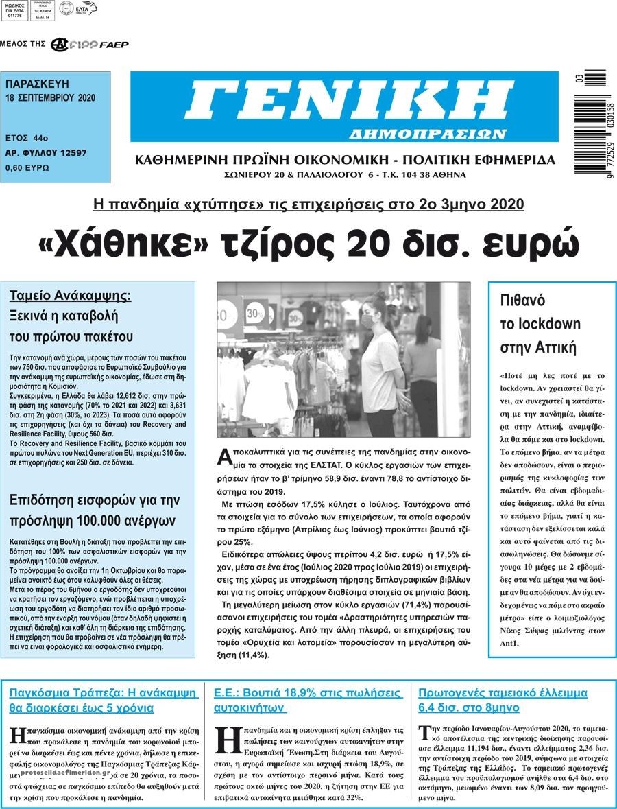 Οι οικονομικές εφημερίδες 18/9/2020 Διονύσης Νίκκας 06:40, Παρασκευή 18 Σεπτεμβρίου 2020 Media Διαβάστε τα πρωτοσέλιδα των οικονομικών εφημερίδων… ΟΙΚΟΝΟΜΙΚΕΣ ΕΦΗΜΕΡΙΔΕΣ Μοιράσου το: σχολίασε κι εσύ (0 σχόλια) Ακολουθήστε το enikos.gr στο Google News και μάθετε πρώτοι όλες τις ειδήσεις Δείτε όλες τις τελευταίες ειδήσεις από την Ελλάδα και τον Κόσμο στο enikos.gr Ειδήσεις Ροή Ειδήσεων 34 λεπτά πριν Χριστούγεννα στα μπλόκα: Επιμένουν στις κινητοποιήσεις τους οι αγρότες – Ανοίγουν τα διόδια το Σαββατοκύριακο 57 λεπτά πριν Ουκρανία: Η άνευ προηγουμένου επίθεση σε ρωσικό τάνκερ στη Μεσόγειο και το μήνυμα προς στον Πούτιν – Το «μακρύ χέρι» του Κιέβου 12 λεπτά πριν Πούτιν: Τα μηνύματα σε Ευρώπη και ΝΑΤΟ από το μαραθώνιο «σόου» του – Η απαίτηση για «σεβασμό» και η ειρήνη «με τους όρους» της Μόσχας 1 ώρα πριν Τραμπ: Δεν αποκλείει την πιθανότητα ενός πολέμου στη Βενεζουέλα – «Ο Μαδούρο ξέρει καλύτερα από τον καθένα τι ακριβώς θέλω» 2 ώρες πριν Συνεχίζει να προκαλεί ο Μίτσκοσκι: «Για μένα το όνομα Μακεδονία είναι ιερό» 3 ώρες πριν Πούτιν: «Ναι, είμαι ερωτευμένος» – Βίντεο από τη σπάνια προσωπική παραδοχή του 2 ώρες πριν Αριθμολογία: Οι άνθρωποι που έχουν γεννηθεί αυτές τις 4 ημερομηνίες, συχνά παρεξηγούνται – «Η καλοσύνη τους κρύβει τεράστια δύναμη» 1 ώρα πριν Ύπνος: Μια κρυφή κατάσταση του εγκεφάλου πριν από τον ύπνο μπορεί να είναι το “κλειδί” για υψηλή ευφυΐα και δημιουργικότητα 3 ώρες πριν Ξεχάστε το καθάρισμα το Σαββατοκύριακο: Ο «κανόνας των 20 λεπτών» που θα σας λύσει τα χέρια 13 λεπτά πριν Ανακαλύφθηκαν αρχαία χρυσά νομίσματα 2.200 ετών που απεικονίζουν τον θεό Απόλλωνα – Η άγνωστη σύνδεση με τον Φίλιππο Β΄ της Μακεδονίας 12 λεπτά πριν Πούτιν: Τα μηνύματα σε Ευρώπη και ΝΑΤΟ από το μαραθώνιο «σόου» του – Η απαίτηση για «σεβασμό» και η ειρήνη «με τους όρους» της Μόσχας 13 λεπτά πριν Ανακαλύφθηκαν αρχαία χρυσά νομίσματα 2.200 ετών που απεικονίζουν τον θεό Απόλλωνα – Η άγνωστη σύνδεση με τον Φίλιππο Β΄ της Μακεδονίας 18 λεπτά πριν Νίκος Ξυλούρης: Συγκινεί η χήρα του σπουδαίου καλλιτέχνη – «Ευχαριστώ όλο τον κόσμο που τον κρατάει ζωντανό 45 χρόνια» 24 λεπτά πριν Παναθηναϊκός: «Μέσα» οι Σφιντέρσκι και Τουμπά για το ματς με τον ΠΑΟΚ – Τι έδειξε η μαγνητική του Πάντοβιτς 30 λεπτά πριν Γιώργος Γιαννόπουλος για “Το σόι σου”: “Είναι ευτυχία και ευλογία αυτή η σειρά” ENIKOS NETWORK Το ΕΚΑΒ τιμήθηκε από την Ακαδημία Αθηνών για τα 40 χρόνια προσφοράς του Έχετε πραγματικά μεγάλη καρδιά; 10 χαρακτηριστικά όσων έχουν καλοσύνη Πλήρης επάρκεια προϊόντων στις λαϊκές της Αττικής, παρά τις αγροτικές κινητοποιήσεις – Τι απαντούν οι πωλητές ΑΑΔΕ: Νέες αναβαθμίσεις στο Ψηφιακό Πελατολόγιο και την εφαρμογή myDATAapp – Τι πρέπει να γνωρίζετε Χαρτογραφώντας το «σημείο χωρίς επιστροφή»: Για πρώτη φορά αποκαλύπτεται με λεπτομέρεια το ακανθώδες όριο της ατμόσφαιρας τ... Η Google καταργεί τη λειτουργία «dark web report» – Πώς θα μπορούν οι χρήστες να διαγράφουν τα δεδομένα τους περισσότερα 22:42 , Παρασκευή 19 Δεκεμβρίου 2025 Γιώργος Γιαννόπουλος για “Το σόι σου”: “Είναι ευτυχία και ευλογία αυτή η σειρά” «Είναι ευτυχία και ευλογία η συγκυρία αυτής της σειράς», θα πει ο Γιώργος Γιαννόπουλος -ο αγαπ... 20:37 , Παρασκευή 19 Δεκεμβρίου 2025 Don’t Forget The Lyrics: Η Έλλη Κοκκίνου υποδέχεται 4 παίκτες που θα κάνουν τα πάντα για να μη χάσουν ούτε… μισή λέξη από τους στίχους Το «Don’t Forget The Lyrics» επιστρέφει απόψε, Παρασκευή 19 Δεκεμβρίου, στις 21:00 με ν