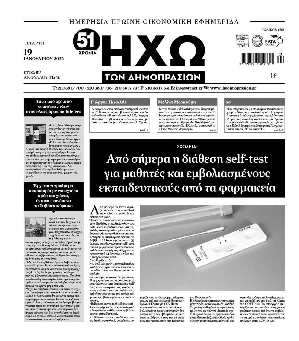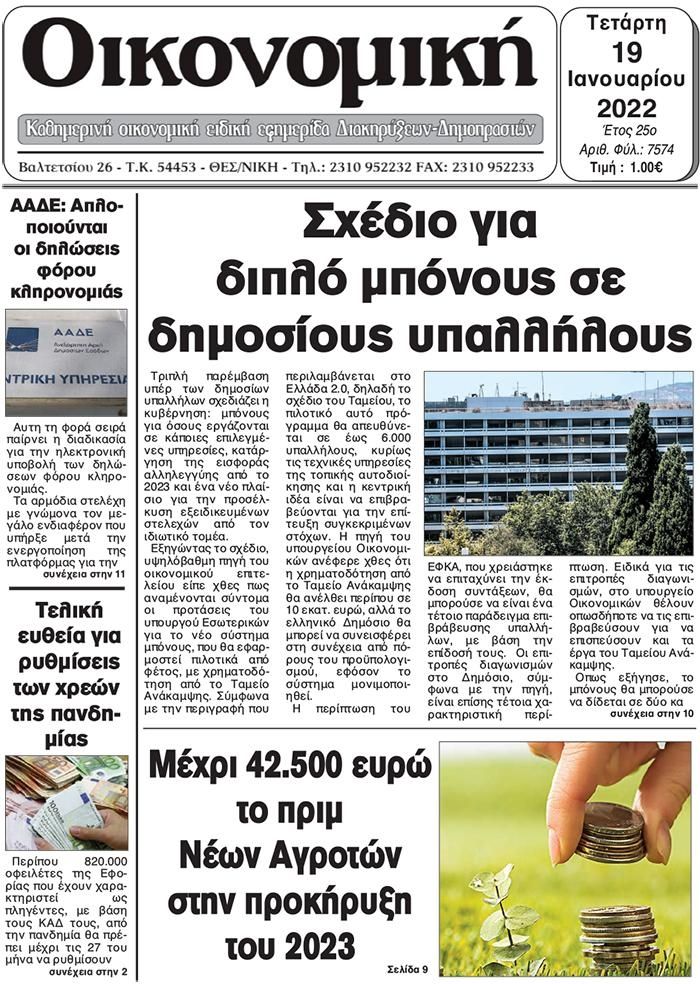 Οι οικονομικές εφημερίδες 19/1/2022 Διονύσης Νίκκας 06:42, Τετάρτη 19 Ιανουαρίου 2022 Media Διαβάστε τα πρωτοσέλιδα από τις οικονομικές εφημερίδες… ΟΙΚΟΝΟΜΙΚΕΣ ΕΦΗΜΕΡΙΔΕΣ Μοιράσου το: Λιβύη: Σχεδόν τριπλασιάστηκε ο αριθμός των μεταναστών που προσπάθησαν να περάσουν τη Μεσόγειο Αλμυρός: Πήγε για κυνήγι και πυροβολήθηκε στο πόδι ΚΚΕ για την υπόθεση του βιασμού της 24χρονης: Οργή και θυμός – “Όχι” στην επιλεκτική “ευαισθησία” των influencers σχολίασε κι εσύ (0 σχόλια) Ακολουθήστε το enikos.gr στο Google News και μάθετε πρώτοι όλες τις ειδήσεις Δείτε όλες τις τελευταίες ειδήσεις από την Ελλάδα και τον Κόσμο στο enikos.gr Ειδήσεις Ροή Ειδήσεων 26 λεπτά πριν Νίκος Παππάς: Άφαντος παραμένει ο ευρωβουλευτής μετά την επίθεση στον Νίκο Γιαννόπουλο 1 ώρα πριν Οι αγρότες δεν φεύγουν από τα μπλόκα: Πολύωροι αποκλεισμοί στα τελωνεία Ευζώνων, Νίκης, Προμαχώνα και Εξοχής 42 λεπτά πριν Συναγερμός και στην Ελλάδα για τη «σούπερ γρίπη»: Πόσο σοβαρή είναι και ποιοι θεωρούνται πιο ευάλωτοι – 3 ειδικοί μιλούν στο enikos.gr 2 ώρες πριν Ντόναλντ Τραμπ: Το διάγγελμα, η πτώση στις δημοσκοπήσεις και το… χάος που κληρονόμησε από τον Μπάιντεν 2 ώρες πριν Μάριο Πινέιδα: Ο αμυντικός του Ισημερινού σκοτώθηκε σε ένοπλη επίθεση στη Γκουαγιακίλ 1 ώρα πριν Τα 4 ζώδια που λαμβάνουν ένα ισχυρό σημάδι από το σύμπαν – «Αποκαλύπτεται κάτι που μπορεί να αλλάξει τη ζωή μας» 5 ώρες πριν Καούρα: Το μπαχαρικό που είναι «εξίσου αποτελεσματικό» με την ομεπραζόλη, σύμφωνα με ειδικούς 2 ώρες πριν Η σύζυγός του παραπονιέται για τα χρήματα που της δίνει για ψώνια κάθε μήνα – «Λέει ότι νιώθει φτωχή και της είπα να βρει δουλειά» 1 ημέρα πριν 20 χρόνια τα Χριστούγεννα ξεκινούν στα Public με μεγάλη ποικιλία σε δώρα! 2 λεπτά πριν Ο ASAP Rocky αποκάλυψε το εξώφυλλο του άλμπουμ του που δημιούργησε ο Τιμ Μπάρτον 7 λεπτά πριν Εξεταστική ΟΠΕΚΕΠΕ – Παπασταύρου: Δώσαμε κατεύθυνση στον Σημανδράκο για τήρηση της νομιμότητας – Τι είπε για τη σχέση με τον Αυγενάκη 13 λεπτά πριν Βορίδης για ΟΠΕΚΕΠΕ: Η αντιπολίτευση υπονομεύει την Εξεταστική – Αντί να είναι σοβαρή διαδικασία, γίνεται μια επικοινωνιακή φούσκα 17 λεπτά πριν Μαρία Τζομπανάκη για τον σύζυγό της: Έχουμε να βρεθούμε 2 μήνες – Αν δεν τον βρω, ανησυχώ 22 λεπτά πριν Αν κάνετε συνεχώς αυτά τα 8 πράγματα με τα κατοικίδιά σας, σας λείπει η ανθρώπινη επαφή ENIKOS NETWORK Επαναστατική ανακάλυψη από το MIT: Νανοσωματίδια καταπολεμούν τον καρκίνο των ωοθηκών με τη βοήθεια του ανοσοποιητικού Τα παράδοξα της φαρμακευτικής δαπάνης και οι προβλέψεις για το μέλλον Δάνεια σε ελβετικό φράγκο: Οι 3 κατηγορίες ρύθμισης – Όσα προβλέπει η τροπολογία που κατατέθηκε στη Βουλή Δώρο Χριστουγέννων: Έως αύριο η καταβολή του – Τι πρέπει να κάνουν όσοι δεν το λάβουν Χαρτογραφώντας το «σημείο χωρίς επιστροφή»: Για πρώτη φορά αποκαλύπτεται με λεπτομέρεια το ακανθώδες όριο της ατμόσφαιρας τ... Η Google καταργεί τη λειτουργία «dark web report» – Πώς θα μπορούν οι χρήστες να διαγράφουν τα δεδομένα τους περισσότερα 08:00 , Πέμπτη 18 Δεκεμβρίου 2025 Την Κυριακή με τη Realnews: Δωροεπιταγή 10€ Δωροεπιταγή αξίας 10€ για αγορές άνω των 60€ από τα πολυκαταστήματα FactoryOutlet H προσφορά ι... 07:50 , Πέμπτη 18 Δεκεμβρίου 2025 «Το σόι σου»: Backstage στα γυρίσματα για το εορταστικό επεισόδιο «Το σόι σου» φορά τα γιορτινά του για τα Χριστούγεννα και η Όλγα Λαφαζάνη, με την κάμερα του «... 07:36 , Πέμπτη 18 Δεκεμβρίου 2025 Οι αθλητικές μεταδόσεις 18/12/2025 – Πού θα δείτε τον αγώνα της ΑΕΚ μ