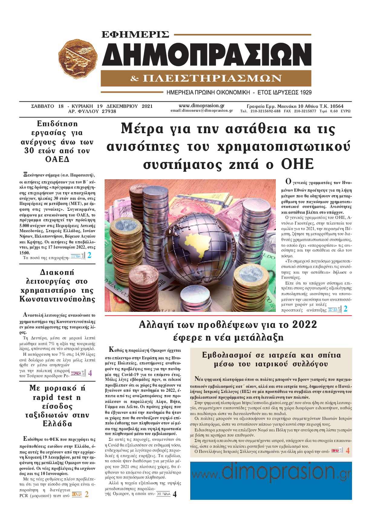 Οι οικονομικές εφημερίδες 19/12/2021 Διονύσης Νίκκας 07:45, Κυριακή 19 Δεκεμβρίου 2021 Media Διαβάστε τα πρωτοσέλιδα από τις οικονομικές εφημερίδες… ΟΙΚΟΝΟΜΙΚΕΣ ΕΦΗΜΕΡΙΔΕΣ Μοιράσου το: σχολίασε κι εσύ (0 σχόλια) Ακολουθήστε το enikos.gr στο Google News και μάθετε πρώτοι όλες τις ειδήσεις Δείτε όλες τις τελευταίες ειδήσεις από την Ελλάδα και τον Κόσμο στο enikos.gr Ειδήσεις Ροή Ειδήσεων 2 ώρες πριν ΟΠΕΚΕΠΕ – Κρήτη: Στην Ευρωπαϊκή Εισαγγελία οι 15 από τους 16 συλληφθέντες για τις παράνομες επιδοτήσεις 1 ώρα πριν Μακελειό στο Πανεπιστήμιο Μπράουν: Ένοπλος σκότωσε 2 άτομα και τραυμάτισε 9 – Το χρονικό των «ματωμένων» εξετάσεων και το βίντεο με τον ύποπτο δράστη 10 ώρες πριν Ανυποχώρητοι οι αγρότες: Δεν πάνε στο Μαξίμου, κλιμακώνουν τις κινητοποιήσεις – Ποια είναι τα αιτήματά τους 1 ώρα πριν Κυριακή με ανοιχτά καταστήματα σήμερα: Το ωράριο λειτουργίας – Τι ισχύει για τα σούπερ μάρκετ 2 ώρες πριν Εθνικό Μητρώο Παροχών και Ενισχύσεων: Ποιες αλλαγές έρχονται και πώς θα λειτουργεί 1 ώρα πριν Στο φως απομεινάρια μιας ξεχασμένης πόλης που «σημαδεύτηκε από συγκρούσεις» – Είναι θαμμένη κάτω από σύγχρονη μεγαλούπολη 3 ώρες πριν Οπτική ψευδαίσθηση: Μόνο αν έχετε παρατηρητικότητα ντετέκτιβ, θα βρείτε τον αριθμό «6» σε 5 δευτερόλεπτα 3 ώρες πριν Σπλαχνικό λίπος: Γιατρός του Χάρβαρντ αποκαλύπτει 7 τροφές που βοηθούν στη μείωσή του με φυσικό τρόπο 4 ώρες πριν Τα ζώδια σήμερα, Κυριακή 14 Δεκεμβρίου: Παρθένοι, αφιερώστε χρόνο για να καταλάβετε καλύτερα τα συναισθήματα 9 λεπτά πριν Μετρό: Προτεραιότητα η επέκταση προς Γλυφάδα λόγω της ανάπλασης του Ελληνικού – Το σχέδιο για τα Βόρεια Προάστια 16 λεπτά πριν Γιάννης Τσιμιτσέλης: Η φωτογραφία με ξανθά μαλλιά – «Να κρατήσω το χρώμα;» 16 λεπτά πριν ΑΠΕΥΘΕΙΑΣ – Η συζήτηση στη Βουλή για την ψήφιση του Κρατικού Προϋπολογισμού 2026 23 λεπτά πριν Ξέσπασε σε κλάματα με το χριστουγεννιάτικο δώρο του άνδρα της – «Μου είπε ότι είμαι το πιο αχάριστο άτομο που έχει γνωρίσει» 32 λεπτά πριν Ένοπλες Δυνάμεις: Σημαντικές οι αυξήσεις για όλα τα στελέχη με το νέο μισθολόγιο – Τι λένε πηγές του υπουργείου Εθνικής Άμυνας ENIKOS NETWORK Η Samantha του Sex & The City αποκαλύπτει την εμπειρία της με την εμμηνόπαυση: «Έμαθα καλύτερα τον εαυτό μου» Γιατί ξυπνάμε λίγα λεπτά πριν χτυπήσει το ξυπνητήρι; Οι επιστήμονες έδωσαν απάντηση Εθνικό Μητρώο Παροχών και Ενισχύσεων: Ποιες αλλαγές έρχονται και πώς θα λειτουργεί Νέα εποχή για την Εγνατία Οδό – Τι αλλάζει με επενδύσεις 1,8 δισ. ευρώ Σύγχρονος Νοστράδαμος: Προειδοποιεί για «μεγάλο γεγονός» τους επόμενους μήνες που θα συγκλονίσει τη Βρετανία και τον κόσμο Τεστ παρατηρητικότητας: Μπορείτε να βρείτε τις 3 διαφορές στις εικόνες με έναν πιγκουίνο σε 14 δευτερόλεπτα περισσότερα 08:46 , Κυριακή 14 Δεκεμβρίου 2025 Η Realnews στο www.pressreader.com Διαβάστε την ψηφιακή έκδοση της εφημερίδας στην οθόνη του κινητού, του tablet και του υπολογισ... 08:15 , Κυριακή 14 Δεκεμβρίου 2025 Σήμερα με τη Realnews: Food & Travel μαζί Beaute και Μαστορέματα Σήμερα με τη Realnews: Food & Travel μαζί Beaute και Μαστορέματα Food & Travel Ετοιμάζ... 07:46 , Κυριακή 14 Δεκεμβρίου 2025 Σήμερα με τη Realnews: Σκάναρε & κέρδισε με το PaduApp Τo κορυφαίο app επιβράβευσης στην Ελλάδα που σε ανταμείβει για κάθε αγορά! Κέρδισε με 3 μόνο β... 06:05 , Κυριακή 14 Δεκεμβρίου 2025 Σήμερα με τη Realnews: Δωροεπιταγή 10€ Δωροεπιταγή αξίας 10€ για αγορές άνω των 60€ από τα πολυκαταστήματα Factory Outlet. H προσφορά... ΤΕΛΕΥΤΑΙΕΣ ΕΙΔΗΣΕΙΣ 9 λεπτά πριν Μετρό: Προτεραιότητα η επέκτασ