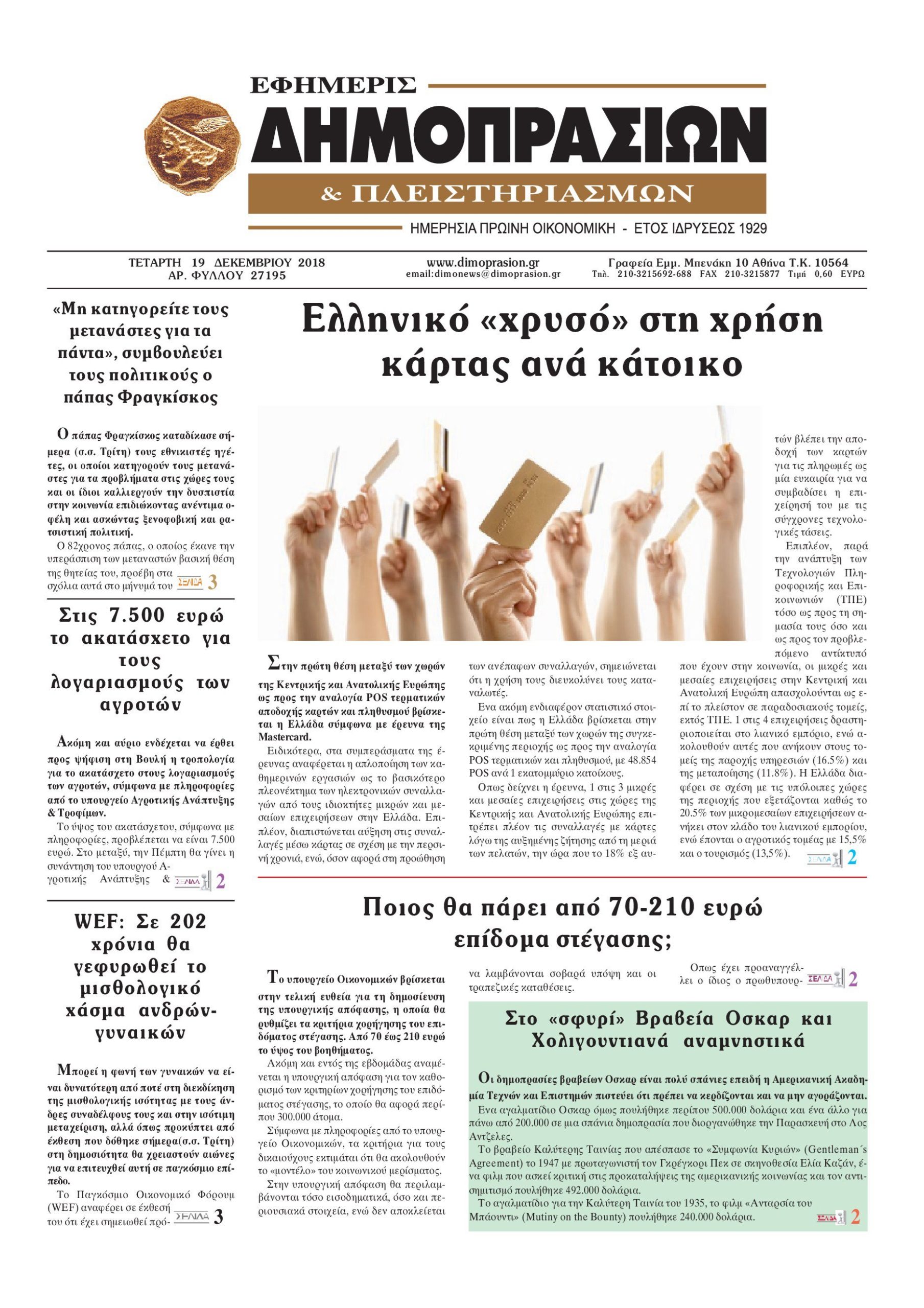 Οι οικονομικές εφημερίδες 19/12/18 Enikos Newsroom 06:24, Τετάρτη 19 Δεκεμβρίου 2018 Media Διαβάστε τα πρωτοσέλιδα: ΟΙΚΟΝΟΜΙΚΕΣ ΕΦΗΜΕΡΙΔΕΣ ΠΡΩΤΟΣΕΛΙΔΑ Μοιράσου το: σχολίασε κι εσύ (0 σχόλια) Ακολουθήστε το enikos.gr στο Google News και μάθετε πρώτοι όλες τις ειδήσεις Δείτε όλες τις τελευταίες ειδήσεις από την Ελλάδα και τον Κόσμο στο enikos.gr Ειδήσεις Ροή Ειδήσεων 3 ώρες πριν Πέθανε η Ελένη Γλύκατζη-Αρβελέρ 2 ώρες πριν Ελένη Γλύκατζη-Αρβελέρ: Όσα είχε πει στο Ενώπιος Ενωπίω και τον Νίκο Χατζηνικολάου το 2020 – «Γεννήθηκα και θα πεθάνω Αριστερή» 6 ώρες πριν Υπουργείο Πολιτισμού: Στο Βέλγιο τις επόμενες ημέρες εμπειρογνώμονες για τις φωτογραφίες των 200 εκτελεσθέντων της Καισαριανής 2 ώρες πριν ΠΑΣΟΚ: Εκτός της Κοινοβουλευτικής Ομάδας του κόμματος ο Παναγιώτης Παρασκευαΐδης 2 ώρες πριν Ρόμπερτ Ντιβάλ: Πέθανε σε ηλικία 95 ετών ο βραβευμένος με Όσκαρ ηθοποιός 6 ώρες πριν Τα 4 ζώδια που θα έχουν την απόλυτη τύχη για το υπόλοιπο του Φεβρουαρίου – «Θα είναι σαν να βρίσκεστε στην κορυφή του κόσμου» 11 ώρες πριν «Έχασα 15 κιλά σε δύο μήνες λόγω προβλήματος υγείας» – Γυναίκα μιλάει για την απώλεια βάρους έπειτα από την γέννηση της κόρης της 7 ώρες πριν Ξεκίνησε η ζωή ως «γλίτσα»; Επιστήμονες προτείνουν μια νέα θεωρία που ανατρέπει την «αρχέγονη σούπα» 3 ώρες πριν Πώς να εξαφανίσετε τη μυρωδιά του κρεμμυδιού από τα χέρια σας, χωρίς να χρησιμοποιήσετε γάντια 2 λεπτά πριν «Porto Leone: Στη γειτονιά με τα κόκκινα φανάρια»: Η οικογένεια Βούλγαρη βυθίζεται στο πένθος 7 λεπτά πριν Κυριάκος Μητσοτάκης για τον θάνατο της Ελένης Γλύκατζη-Αρβελέρ: «Προσωπικά χάνω μία ξεχωριστή φίλη και πολύτιμη σύμβουλο» 12 λεπτά πριν Instant Win: Η νέα εμπειρία διασκέδασης βρίσκεται στα καταστήματα Allwyn – Κέρδη έως 500 ευρώ στη στιγμή σε χιλιάδες τυχερούς με δωρεάν συμμετοχή 18 λεπτά πριν Ύπνος: Τα δύο προειδοποιητικά σημάδια της άνοιας που μπορεί να εμφανιστούν τη νύχτα, σύμφωνα με ειδικούς 21 λεπτά πριν Καισαριανή: «Του είπαν να υπογράψει για να αρνηθεί τα καθήκοντά του – Δεν το έκανε» λέει στον ΑΝΤ1 εγγονός εκτελεσθέντος – ΒΙΝΤΕΟ ENIKOS NETWORK Αϋπνία: Το κόλπο με τη βραστή μπανάνα που θα σας βοηθήσει να κοιμηθείτε μέσα σε 30 λεπτά ΙΣΑ: Επιστολή στον υπουργό Άμυνας για αναβολή στράτευσης νέων γιατρών λόγω ειδικότητας Καλαφάτης: «Θέλουμε η έρευνα να απαντά σε πραγματικά προβλήματα της κοινωνίας και των επιχειρήσεων» Τσάφος: Η Αθήνα έχει τη χαμηλότερη τιμή στο νερό σε σχέση με όλες τις άλλες πρωτεύουσες της ΕΕ Ευπάθεια στο moltbook ai αποκαλύπτει email, tokens σύνδεσης και api keys Αυτός είναι ο ρόλος της μικρής τρύπας στους νυχοκόπτες – «Είμαι ο μόνος που δεν το ήξερε;»» περισσότερα 22:16 , Δευτέρα 16 Φεβρουαρίου 2026 «Porto Leone: Στη γειτονιά με τα κόκκινα φανάρια»: Η οικογένεια Βούλγαρη βυθίζεται στο πένθος Ο κύκλος του αίματος για τις οικογένειες Καπετανάκου και Βούλγαρη δεν έχει κλείσει ακόμη και ο... 20:35 , Δευτέρα 16 Φεβρουαρίου 2026 MasterChef 10: Ποιοι θα είναι οι δύο υποψήφιοι προς αποχώρηση στο τέλος της βραδιάς; Στο επεισόδιο της Πέμπτης ο Παναγιώτης Καλημέρης ήταν αυτός που αποχώρησε από το MasterChef 10... 20:15 , Δευτέρα 16 Φεβρουαρίου 2026 Ελένη Γλύκατζη-Αρβελέρ: Όσα είχε πει στο Ενώπιος Ενωπίω και τον Νίκο Χατζηνικολάου το 2020 – «Γεννήθηκα και θα πεθάνω Αριστερή» Για τα παιδικά της χρόνια, την ένταξή της στην Αντίσταση καθώς και τα δύσκολα χρόνια της κατοχ... 20:15 , Δευτέρα 16 Φεβρουαρίου 2026 Άγιος έρωτας – Η Δώρα χάνει τον κόσμο κάτω απ’ τα πόδια της αντικρίζοντας ζων