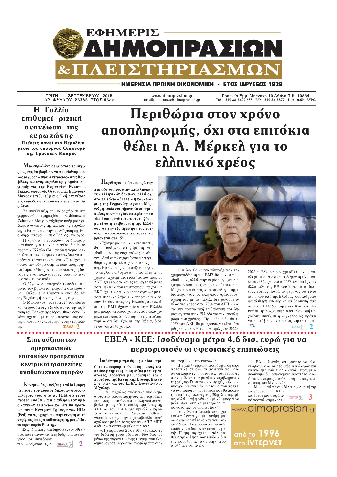 Οι οικονομικές εφημερίδες 1/9/2015 Enikos Newsroom 06:31, Τρίτη 01 Σεπτεμβρίου 2015 Media Διαβάστε τα σημερινά πρωτοσέλιδα των οικονομικών εφημερίδων: ΟΙΚΟΝΟΜΙΚΕΣ ΕΦΗΜΕΡΙΔΕΣ ΠΡΩΤΟΣΕΛΙΔΑ Μοιράσου το: σχολίασε κι εσύ (0 σχόλια) Ακολουθήστε το enikos.gr στο Google News και μάθετε πρώτοι όλες τις ειδήσεις Δείτε όλες τις τελευταίες ειδήσεις από την Ελλάδα και τον Κόσμο στο enikos.gr Ειδήσεις Ροή Ειδήσεων 2 ώρες πριν LIVE από Λοριάν: Η ύψωση της ελληνικής σημαίας στην πρώτη φρεγάτα FDI Belharra ΚΙΜΩΝ 2 ώρες πριν Στην Ευελπίδων ο 22χρονος που καταγγέλλει τον Γιώργο Μαζωνάκη για ασελγείς πράξεις – «Έχουμε εμπιστοσύνη στη Δικαιοσύνη, καμία εκβίαση» λέει ο δικηγόρος του 1 ώρα πριν Γαλλία: Η οργή των αγροτών – Αναμένεται η ομιλία του Μακρόν, τα τρακτέρ συγκεντρώνονται μαζικά στις Βρυξέλλες 5 ώρες πριν Συναγερμός και στην Ελλάδα για τη «σούπερ γρίπη»: Πόσο σοβαρή είναι και ποιοι θεωρούνται πιο ευάλωτοι – 3 ειδικοί μιλούν στο enikos.gr 2 ώρες πριν Χριστουγεννιάτικο τραπέζι: Πόσο θα κοστίσει φέτος – Σε ποια είδη τραβούν… την ανηφόρα οι τιμές 5 ώρες πριν Τα 4 ζώδια που λαμβάνουν ένα ισχυρό σημάδι από το σύμπαν – «Αποκαλύπτεται κάτι που μπορεί να αλλάξει τη ζωή μας» 6 ώρες πριν Η σύζυγός του παραπονιέται για τα χρήματα που της δίνει για ψώνια κάθε μήνα – «Λέει ότι νιώθει φτωχή και της είπα να βρει δουλειά» 4 ώρες πριν Αν κάνετε συνεχώς αυτά τα 8 πράγματα με τα κατοικίδιά σας, σας λείπει η ανθρώπινη επαφή 1 ημέρα πριν 20 χρόνια τα Χριστούγεννα ξεκινούν στα Public με μεγάλη ποικιλία σε δώρα! 4 λεπτά πριν Αλβανία: Συγκρούσεις μέσα στο κοινοβούλιο – Bουλευτές άναψαν φωτοβολίδες και πέταξαν νερό στον πρόεδρο της Βουλής – Δείτε βίντεο 8 λεπτά πριν Δίκη Βαλυράκη: Καταθέτει ο βασικός αυτόπτης μάρτυρας – «Δέχτηκα πιέσεις να μη μιλήσω, πήγα να ψωνίσω και αυτοκίνητο με χτύπησε στο πόδι» 14 λεπτά πριν Αυτό που κρύβεται κάτω από τη Γροιλανδία θα μπορούσε να ανατρέψει όσα γνωρίζουμε για την άνοδο της στάθμης των θαλασσών 19 λεπτά πριν Parthenis x Papazó & Akylas powered by ΣΚΡΑΤΣ: Το πιο καλαίσθητο act του MadWalk 2025 24 λεπτά πριν Πηγές ΣΥΡΙΖΑ: Η ΝΔ απαξιώνει την Εξεταστική και επιμένει στη συγκάλυψη – Ο επικαιροποιημένος κατάλογος προτεινόμενων μαρτύρων ENIKOS NETWORK 100 χρόνια ΠΙΣ: Ένας αιώνας προσφοράς στην Ιατρική και την κοινωνία Ένα ποτήρι την ημέρα από αυτόν τον χυμό μειώνει τη χοληστερίνη, τη φλεγμονή και την πίεση ΑΑΔΕ: Έρχεται το… ΔΕΟΣ – Όλες οι λεπτομέρειες για τον ενιαίο ελεγκτικό μηχανισμό για το οικονομικό έγκλημα e-ΕΦΚΑ: Μέχρι πότε πρέπει να γίνει επιλογή ασφαλιστικής κατηγορίας για το 2026 – Τι πρέπει να γνωρίζετε Χαρτογραφώντας το «σημείο χωρίς επιστροφή»: Για πρώτη φορά αποκαλύπτεται με λεπτομέρεια το ακανθώδες όριο της ατμόσφαιρας τ... Η Google καταργεί τη λειτουργία «dark web report» – Πώς θα μπορούν οι χρήστες να διαγράφουν τα δεδομένα τους περισσότερα 08:00 , Πέμπτη 18 Δεκεμβρίου 2025 Την Κυριακή με τη Realnews: Δωροεπιταγή 10€ Δωροεπιταγή αξίας 10€ για αγορές άνω των 60€ από τα πολυκαταστήματα FactoryOutlet H προσφορά ι... 07:50 , Πέμπτη 18 Δεκεμβρίου 2025 «Το σόι σου»: Backstage στα γυρίσματα για το εορταστικό επεισόδιο «Το σόι σου» φορά τα γιορτινά του για τα Χριστούγεννα και η Όλγα Λαφαζάνη, με την κάμερα του «... 07:36 , Πέμπτη 18 Δεκεμβρίου 2025 Οι αθλητικές μεταδόσεις 18/12/2025 – Πού θα δείτε τον αγώνα της ΑΕΚ με την Κραϊόβα για το Conference League Τα ματς ΑΕΚ – Ουνιβερσιτάτεα Κραϊόβα για το Conference League και Παναθηναϊκός – Χάποελ Τελ Αβ... 05:48 , Πέμπτη 18 Δεκεμβρίου 2025 Οι οικονομικές 